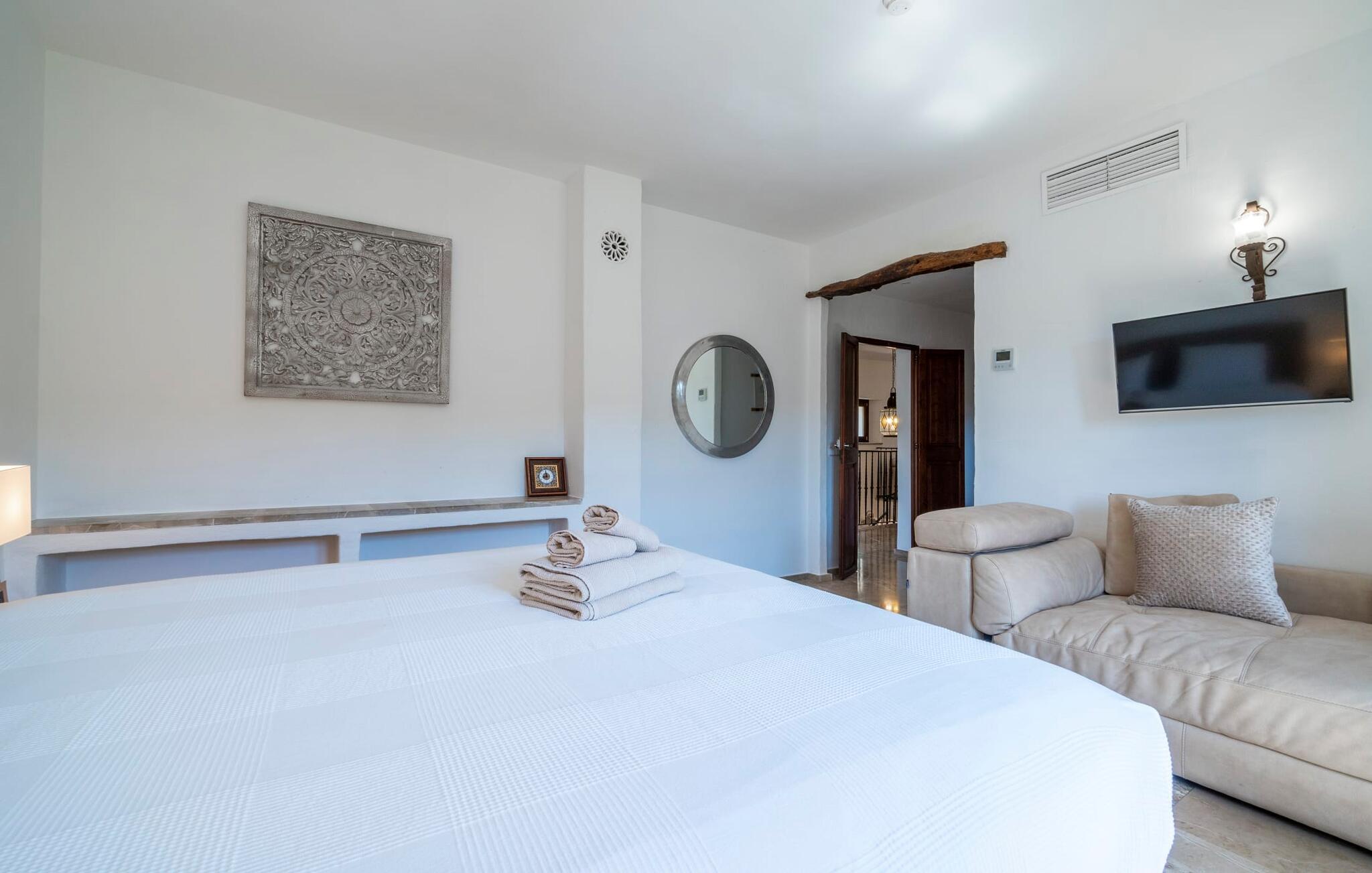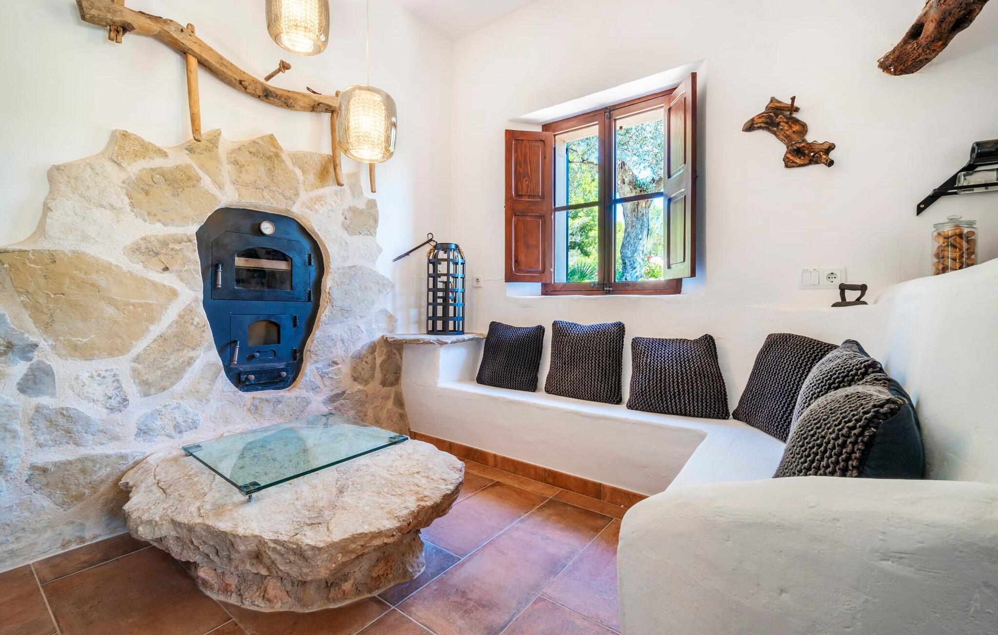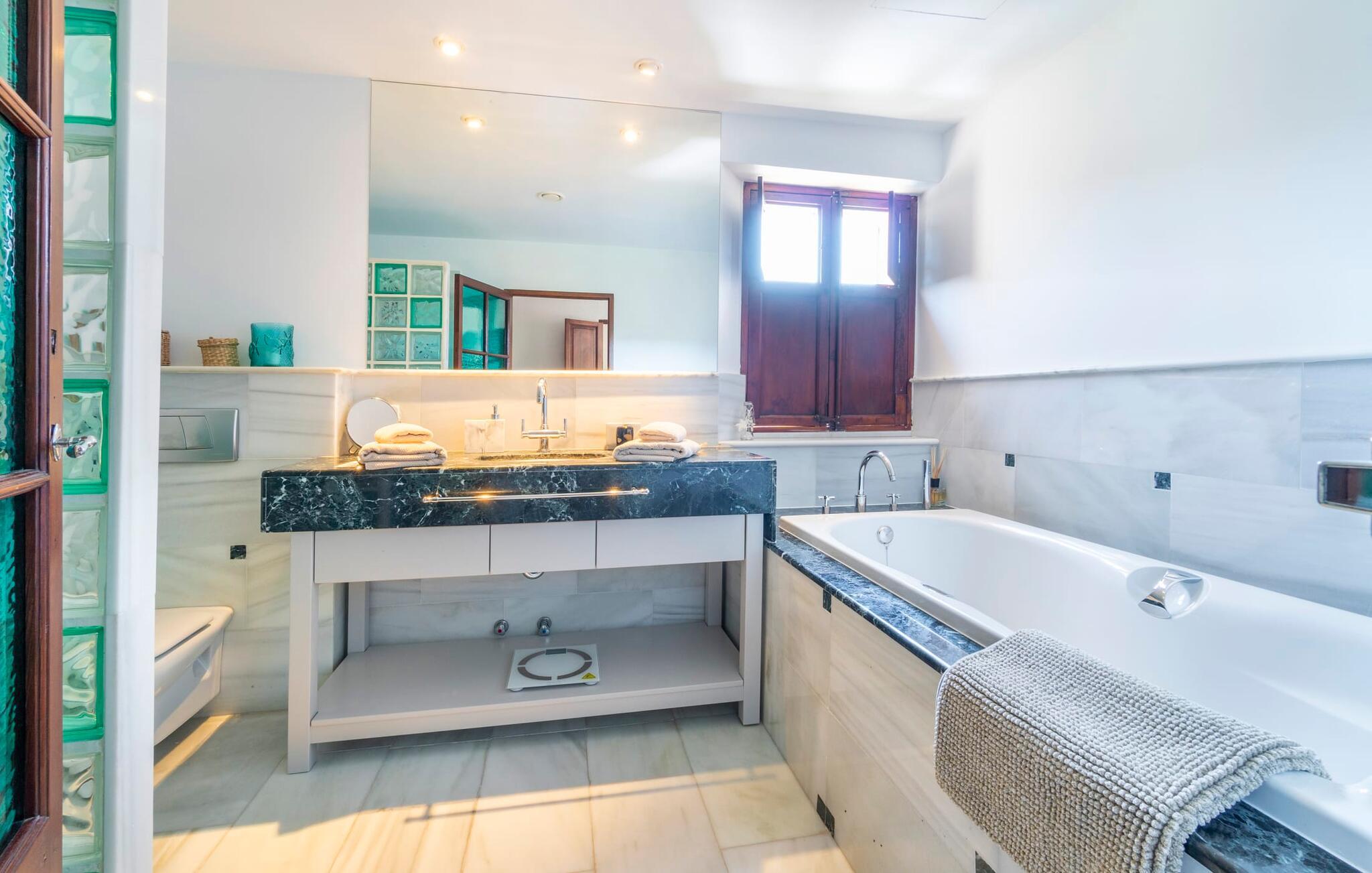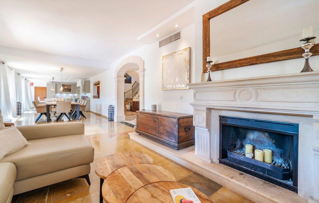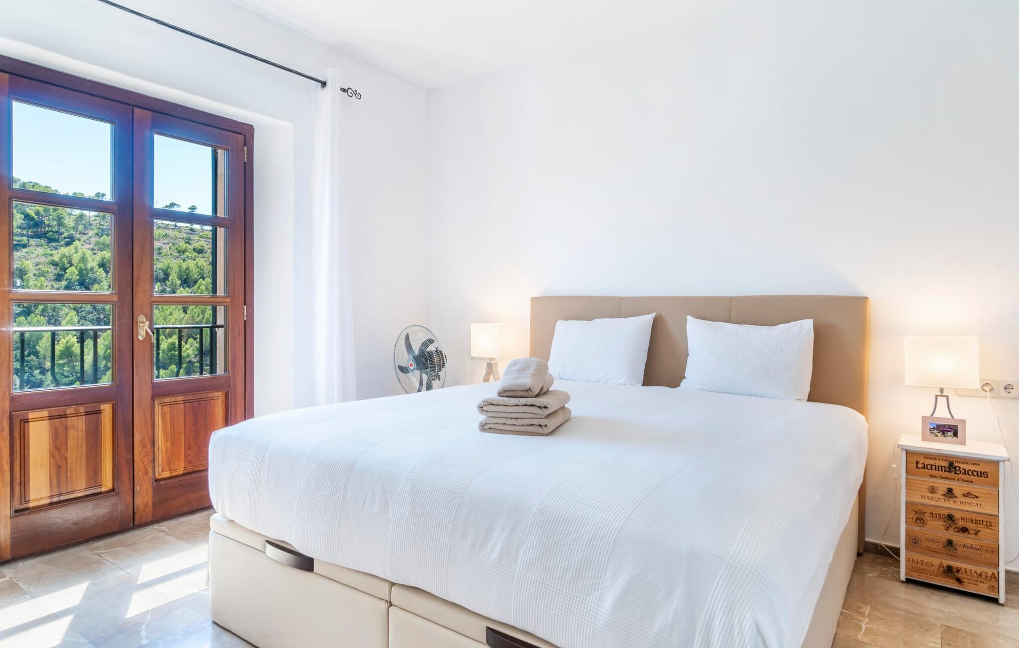 Ankom, sluk, nyd: Dette fristende feriemantra byder jer velkommen til den imponerende villa "Son Pujol de Andratx". Det smukke naturstenshus i to rummelige etager ligger ikke kun på en charmerende bjergskråning, men er også sydvendt og nyder godt af masser af sol og en behagelig ugenert beliggenhed. Det er ikke kun omgivet af forskellige overdækkede og udækkede indbydende terrassearealer, men tiltrækker også med endnu en terrasse på øverste etage og en kæmpe, alsidigt anlagt ejendom. En del af terrassearealet er udstyret med et spraykølesystem, som køler omgivelsestemperaturen med omkring 10 grader og holder hvepse væk. I kan gå rundt blandt velduftende rosmarin- og lavendelbuske, små oliventræer og palmer, men der er også plads til, at børn kan lege på plænerne. For sportsentusiaster er der et udendørs bordtennisbord, en pull-up bar og en boulebane i strandsandet. Hist og her er der skabt smukke hjørner til afslapning, for eksempel stilfulde liggestole eller en daybed med gardiner, der svajer romantisk i vinden - simpelthen fantastisk! Det gælder også infinity-poolen lige ved siden af huset, hvorfra man kan tage et kig på den omkringliggende natur. I kan nyde en lignende udsigt fra det ekstra lange spisebord på den overdækkede terrasse, som byder på plads nok til alle rejsende. Silbermühlen-grillen i det fuldt udstyrede udendørs stenkøkken tilbyder de bedste betingelser for kulinariske aftener af høj kvalitet i det fri. Storslåede stengulve, hvide vægge, flotte detaljer som gamle bjælker, glitrende lysekroner og elegante søjler – indretningen af jeres sommerhus er et sandt blikfang. "Son Pujol de Andratx" er blevet møbleret og dekoreret med stor smag, men også en god følelse af komfort. Værelserne er rummelige og lyse, det imponerende indgangsparti byder jer velkommen i stueetagen. Lad os derefter gå videre til et enkelt åbent rum, der rummer opholds- og spiseområderne samt køkkenet. Mens en stor sofa med afslapningsfunktion i stuen indbyder til at putte sig foran pejsen, er der et langt træbord i spisestuen til en overdådig middag. I kan tilberede de lækkerier, I vil servere, i køkkenet lige ved siden af. Hobbykokke vil blive begejstrede for pladsen og de absolut højkvalitets apparater. Når det er tid til søde drømme, kan I trække jer tilbage til et af de fem stilfulde soveværelser, hver med et smart en-suite badeværelse, pengeskab og aircondition. Det bakkede og skovklædte landskab omkring jeres ejendom er særdeles velegnet til lange gå- eller vandreture, da det er et af de smukkeste områder i den sydvestlige del af øen. Andratx er ca. 3,9 km væk med udlejningsbil. Den traditionelle by, populær som eksklusivt boligområde, ligger i Tramuntana-bjergenes dal og er bestemt et besøg værd. Med sine smalle gader og autentiske mallorcanske bybilleder giver Andratx ikke kun inspiration til mange kunstnere og forfattere, men tiltrækker også et internationalt publikum. Ud over de smukke kirker Santa Maria de Andratx og s'Arracó og Castel de Son Mas, som nu bruges som rådhus, bør I også kigge forbi kulturcentret CCA Andratx, hvor moderne kunst er udstillet. For en dag på stranden kan I for eksempel tage til Platja de Sant Elm, kun 10 km væk. Takket være dets fine sand og let skrånende kyst er den særlig populær blandt familier med små børn. Stranden byder også på god infrastruktur og en promenade til slentreture. "Son Pujol de Andratx" er en villadrøm, der går i opfyldelse: et betagende, stort naturstenshus, bygget i en fantastisk sydvendt beliggenhed, afsondret beliggenhed på en skråning, på en kæmpe ejendom med en fortryllende have, kun 3,9 km fra Andratx . Bag huset kan I forvente ikke kun overdækkede og solrige terrasseområder, men også en fantastisk infinity-pool, hvorfra I kan nyde en imponerende udsigt over den omkringliggende natur. Stranden i Platja de Sant Elm ligger kun 10 km væk i bil. Bemærk venligst, at denne ejendom ikke accepterer ungdomsgrupper eller polterabender. En ungdomsgruppe på denne ejendom består af personer under 30 år. Book ikke denne ejendom, hvis I er en ungdomsgruppe eller en polterabendgruppe, da jeres reservation vil blive afvist, når den er booket, hvilket også kan være tilfældet ved ankomst til ejendommen eller under jeres ophold, og I vil ikke modtage en refusion.