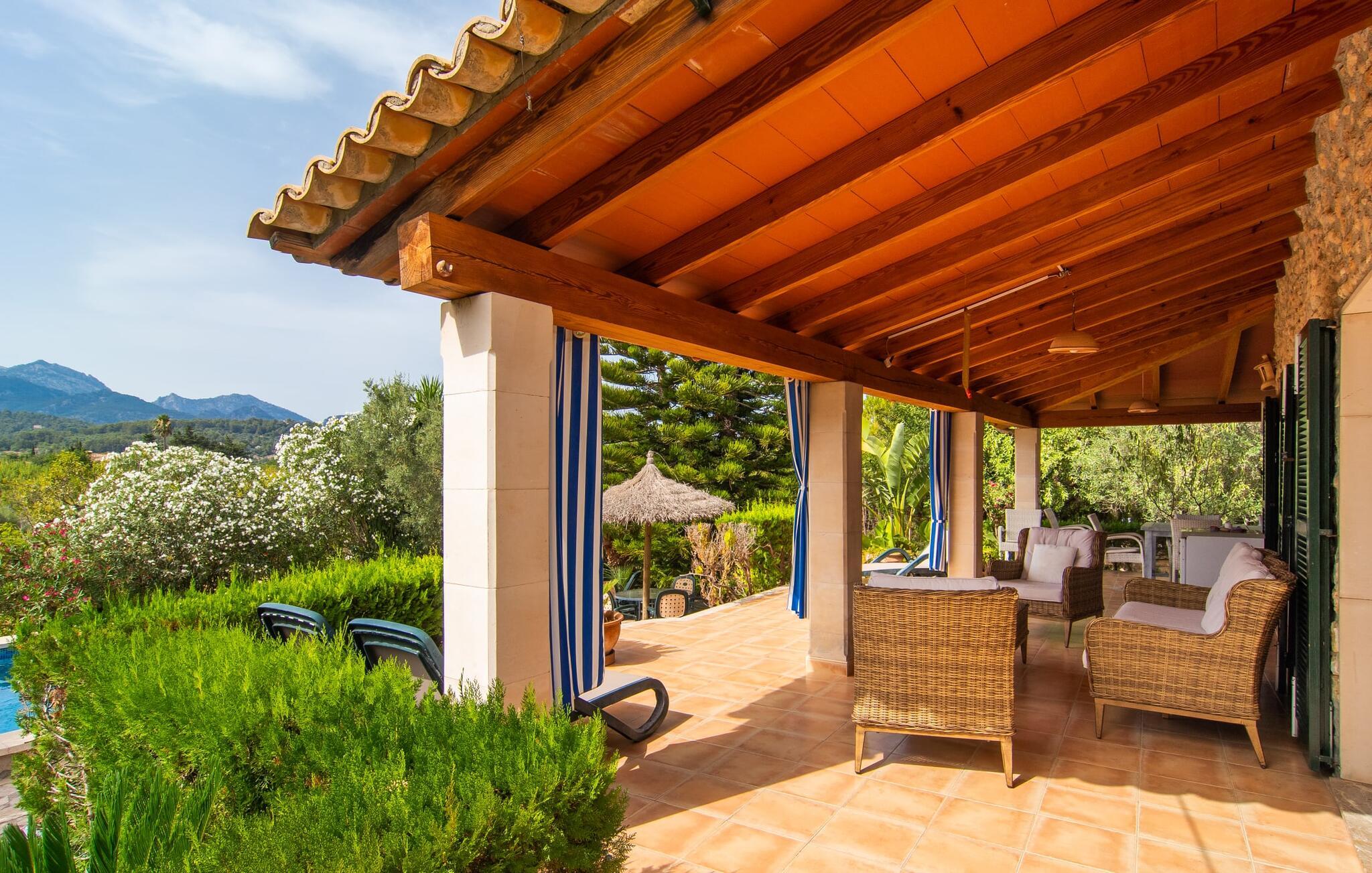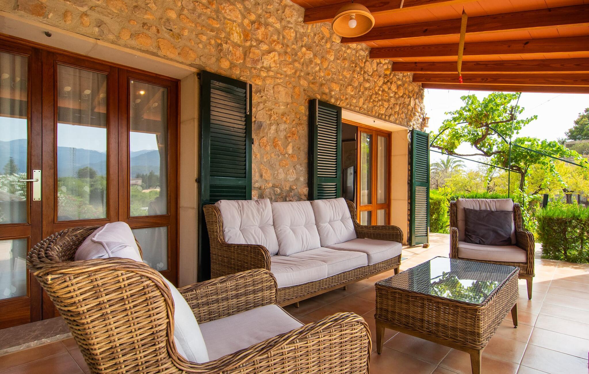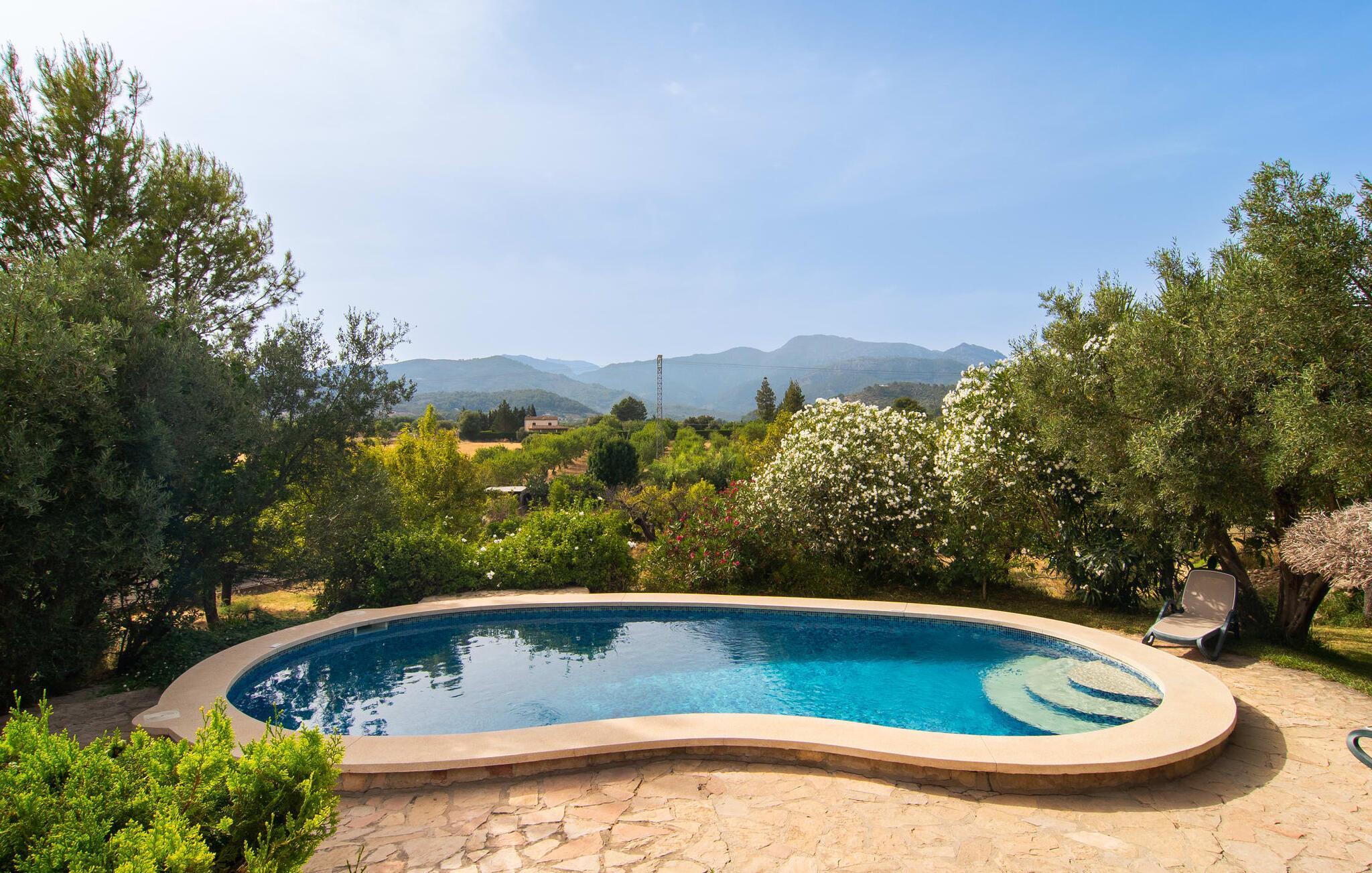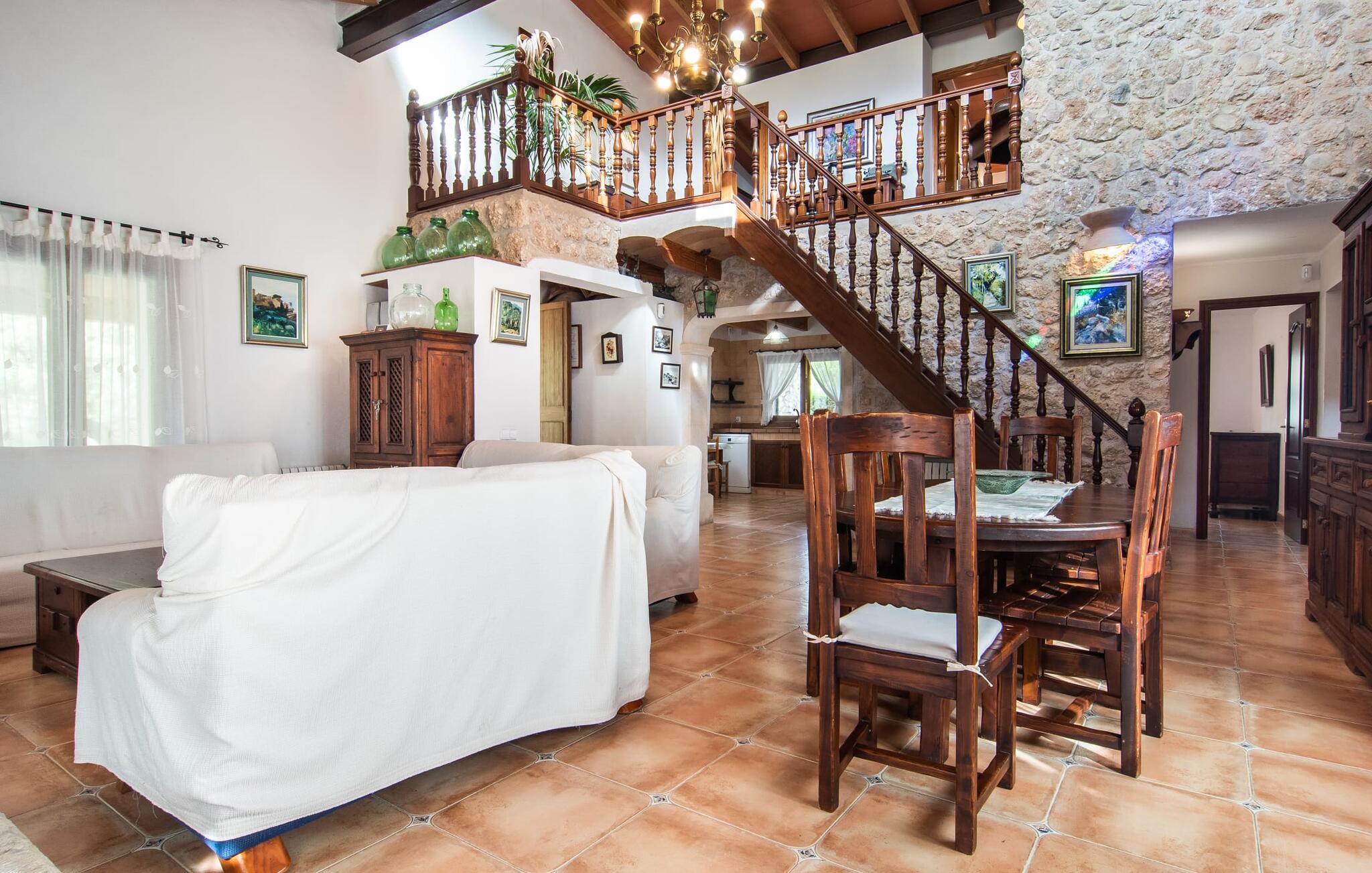 Den karismatiske villa "Son Roura" er en meget idyllisk, stor naturstensbygning, der omslutter sine besøgende med autentisk charme. Rejsen dertil er afslappet, da den attraktive feriebolig ligger i en landlig, men alligevel central beliggenhed og godt forbundet med transportnettet. Køretøjer kan parkeres på privat grund i skyggen. Et første kig på den anlagte have med dens mange grønne træer og middelhavsplanter vil helt sikkert imponere jer. Det står hurtigt klart, at I kan nyde en skøn pause her. Hjertet i komplekset er den store poolterrasse, som tilbyder alle feriegæster masser af plads til at slappe af og solbade under den blå middelhavshimmel. Hvis det bliver for varmt, er der masser af dejlige retreater med naturlig skygge, eller I kan bare hoppe i den smarte pool! Den mosaikbelagte pool varierer i dybden mellem 1 og 2 m og er desuden let tilgængelig via trapper. Det kølige vand giver en forfriskende forfriskning, og I kan finde beroligende afslapning på en af de otte liggestole. Den fantastiske udsigt, som denne ejendom tilbyder, har en særlig behagelig effekt på sjælen: bjergkæderne i Tramuntana-bjergene. Denne fest for øjet kan også beundres fra villaens smukke, overdækkede udendørs terrasse. Udover de flotte loungemøbler er der også et stort spisebord, der inviterer til afslapning og der er også et ekstra køleskab. Så kolde drikke serveres hurtigt, og I kan slappe grundigt af. Grillmesteren blandt jer vil nyde den enorme stengrill ved siden af den L-formede terrasse, mens børnene, der rejser med jer, kan spille bordtennis eller basketball. Inde i villaen vil I blive budt velkommen af en meget komfortabel stue/spisestue, designet og dekoreret med stor sans for detaljer og for det meste møbleret med traditionelle mallorcanske møbler. Pejsen udstråler varme og hygge og små elementer som det farverige halvcirkelformede glasvindue giver rummet en særlig charme. Komfortable sofaer inviterer jer til at slappe af eller læse en god bog. Et fladskærms-tv og en dvd-afspiller sørger også for underholdning. I tilknytning til opholdsområdet er et fuldt udstyret køkken, som er smukt lyst takket være to vinduer og er meget indbydende med sit hvælvede loft og subtile farvespil. En smukt designet trappe i mørkt træ fører op til et lysfyldt galleri, bag hvilket de øvrige rum på første sal er placeret. De tre soveværelser i hovedhuset er meget komfortabelt indrettede og tilbyder nok opbevaringsplads til jeres feriegarderobe. På badeværelserne er nogle af de originale fliser og nostalgisk tilbehør bevaret og kombineret med moderne elementer, så I ikke skal undvære faciliteter som regnbruser og badekar. Et af badeværelserne ligger i stueetagen og kan bruges som gæstetoilet, da det er placeret separat. Det andet badeværelse er ovenpå og er tilgængeligt fra soveværelset. I kan roligt lade pladskrævende ting som hårtørrere eller strygejern blive hjemme, da der er nok af dem i sommerhuset. I villaen "Son Roura" kan I slappe af i en typisk mallorcansk atmosfære og nyde jeres ferie på øen i fulde drag. jeres naturstensvilla er et glimrende udgangspunkt for at lære Mallorca at kende fra forskellige retninger. Den pulserende by Inca og den rolige bjerglandsby Mancor de la Vall kan nås på 5 minutter i bil. "Son Roura" ligger tæt på en tydeligt hørbar landevej, mellem disse to steder, som lover en masse variation takket være deres forskellige karakterer. Fra Mancor de la Vall, der ligger i udkanten af Tramuntana-bjergene, har I adgang til smukke vandrestier og Inca tiltrækker mange besøgende om torsdagen med sit store marked. Den livlige hovedstad Palma og lufthavnen ligger også kun 30 minutter væk. Sandstrandene i den nordøstlige kystregion er også nemme at nå takket være forbindelsen til god infrastruktur. En svømmetur til den smukke bugt Alcúdia bør absolut være en del af jeres ferieprogram! Denne smukke naturstensvilla ligger i landlige omgivelser på en grund beskyttet mod udsigt. Mallorcas tredjestørste by, Inca, ligger kun 3 km væk og byder på adskillige muligheder for hverdagsindkøb samt et fint udvalg af restauranter og barer og en meget attraktiv gågade, der indbyder til at slentre og shoppe. Blot 5 minutters kørsel væk ligger den skjulte bjerglandsby Mancor de la Vall, som er meget stille og rolig. De smukke sandstrande på den nordøstlige kyst, herunder Alcúdia-bugten, ligger omkring 30 km væk.