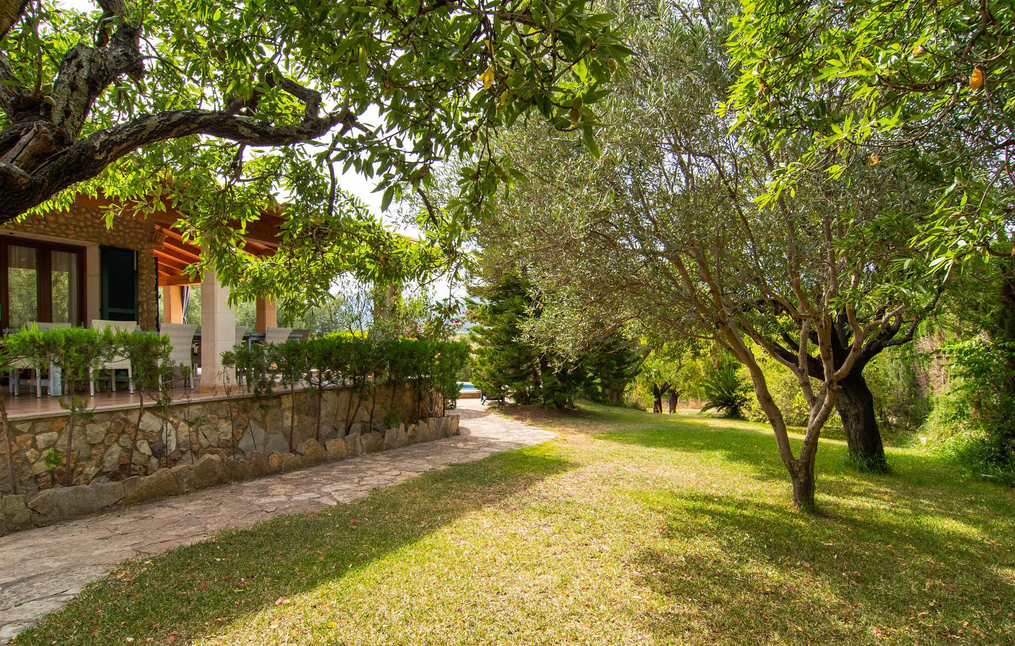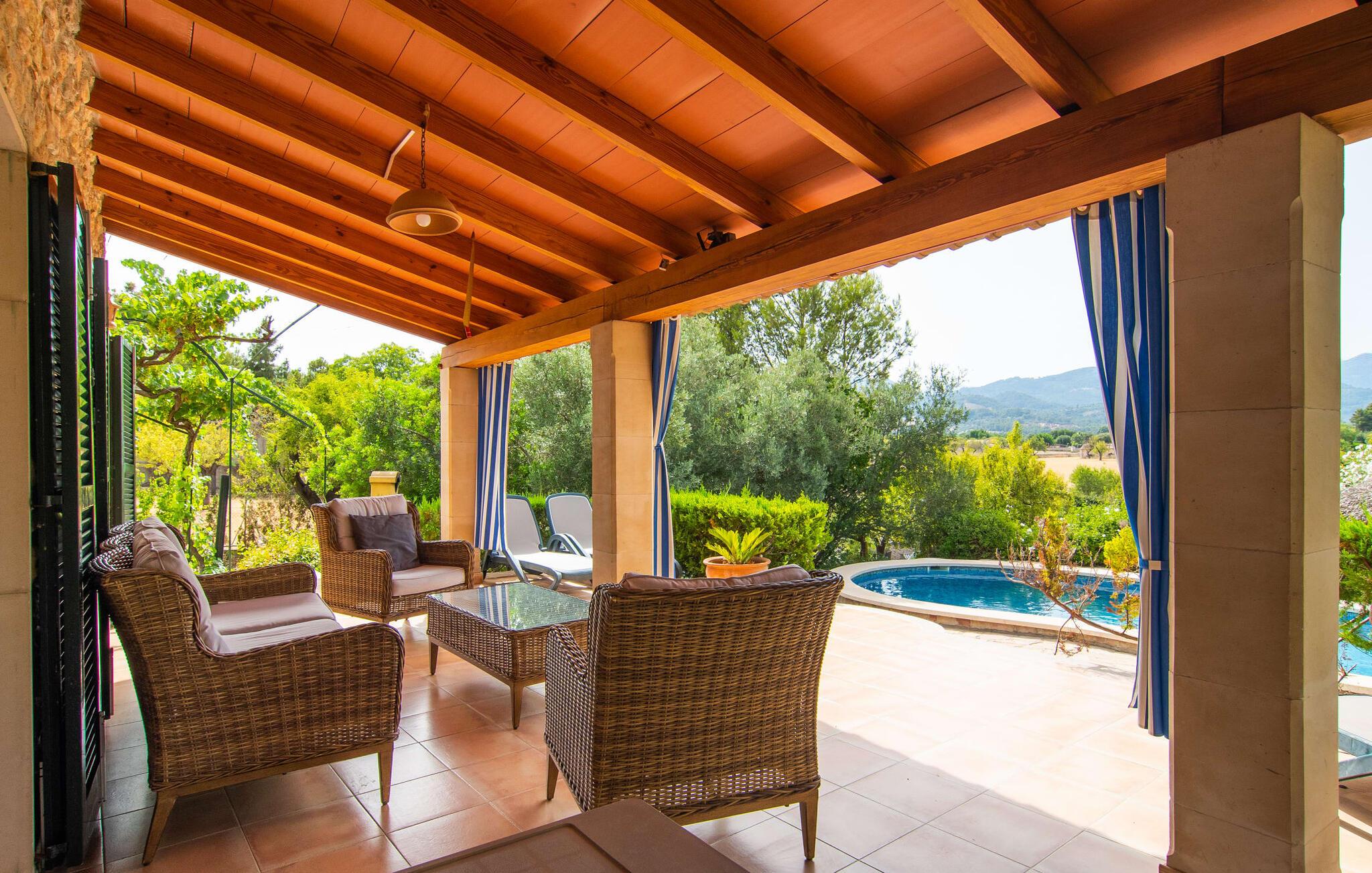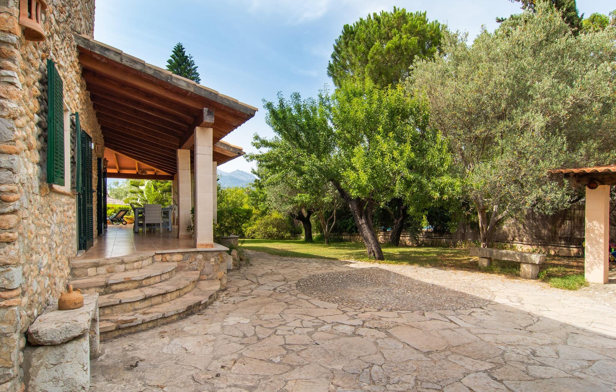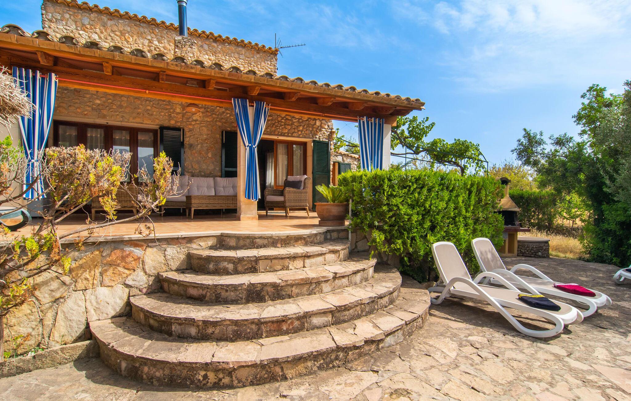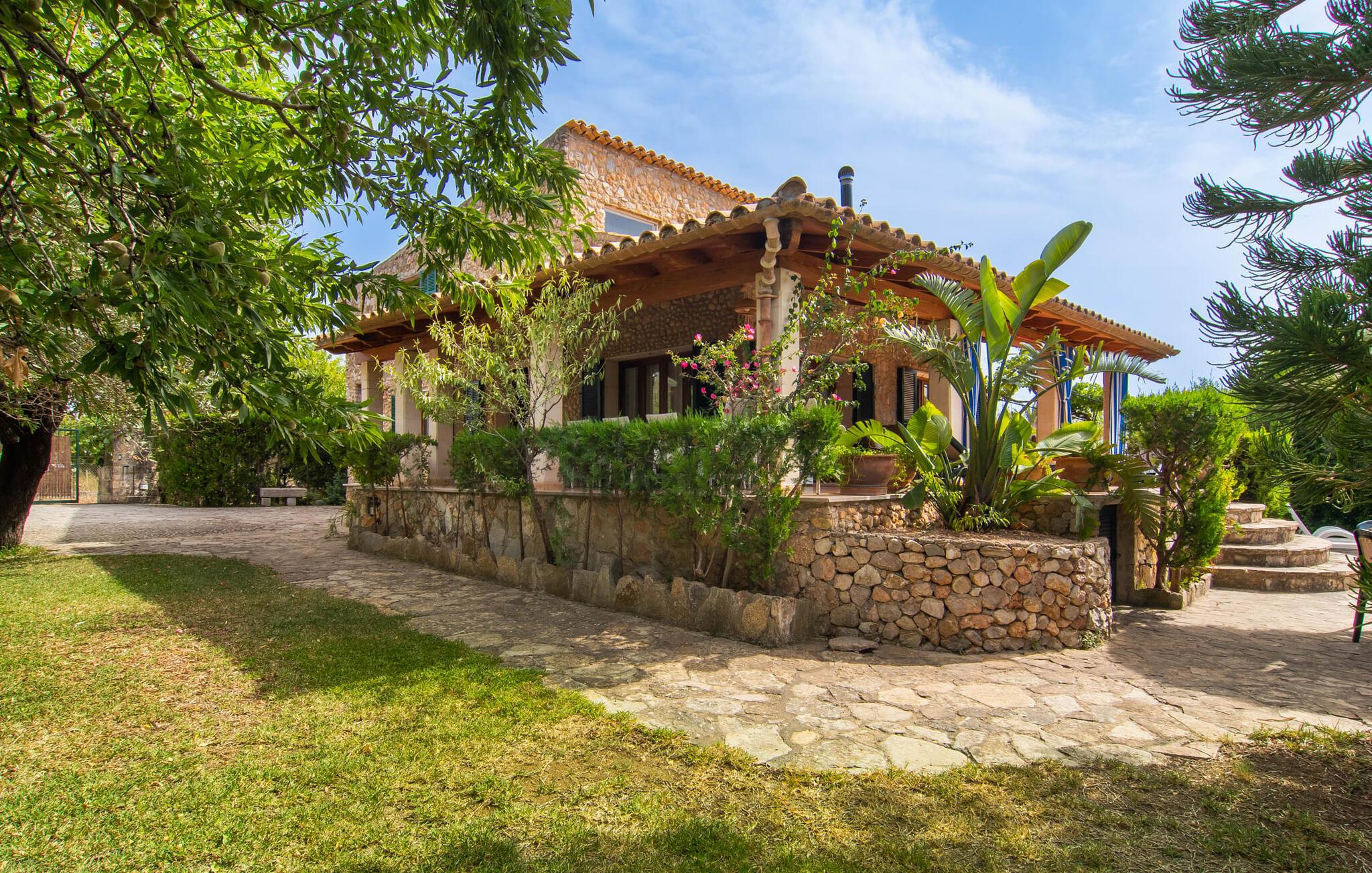 Den karismatiske villa "Son Roura" er en meget idyllisk, stor naturstensbygning, der omslutter sine besøgende med autentisk charme. Rejsen dertil er afslappet, da den attraktive feriebolig ligger i en landlig, men alligevel central beliggenhed og godt forbundet med transportnettet. Køretøjer kan parkeres på privat grund i skyggen. Et første kig på den anlagte have med dens mange grønne træer og middelhavsplanter vil helt sikkert imponere jer. Det står hurtigt klart, at I kan nyde en skøn pause her. Hjertet i komplekset er den store poolterrasse, som tilbyder alle feriegæster masser af plads til at slappe af og solbade under den blå middelhavshimmel. Hvis det bliver for varmt, er der masser af dejlige retreater med naturlig skygge, eller I kan bare hoppe i den smarte pool! Den mosaikbelagte pool varierer i dybden mellem 1 og 2 m og er desuden let tilgængelig via trapper. Det kølige vand giver en forfriskende forfriskning, og I kan finde beroligende afslapning på en af de otte liggestole. Den fantastiske udsigt, som denne ejendom tilbyder, har en særlig behagelig effekt på sjælen: bjergkæderne i Tramuntana-bjergene. Denne fest for øjet kan også beundres fra villaens smukke, overdækkede udendørs terrasse. Udover de flotte loungemøbler er der også et stort spisebord, der inviterer til afslapning og der er også et ekstra køleskab. Så kolde drikke serveres hurtigt, og I kan slappe grundigt af. Grillmesteren blandt jer vil nyde den enorme stengrill ved siden af den L-formede terrasse, mens børnene, der rejser med jer, kan spille bordtennis eller basketball. Inde i villaen vil I blive budt velkommen af en meget komfortabel stue/spisestue, designet og dekoreret med stor sans for detaljer og for det meste møbleret med traditionelle mallorcanske møbler. Pejsen udstråler varme og hygge og små elementer som det farverige halvcirkelformede glasvindue giver rummet en særlig charme. Komfortable sofaer inviterer jer til at slappe af eller læse en god bog. Et fladskærms-tv og en dvd-afspiller sørger også for underholdning. I tilknytning til opholdsområdet er et fuldt udstyret køkken, som er smukt lyst takket være to vinduer og er meget indbydende med sit hvælvede loft og subtile farvespil. En smukt designet trappe i mørkt træ fører op til et lysfyldt galleri, bag hvilket de øvrige rum på første sal er placeret. De tre soveværelser i hovedhuset er meget komfortabelt indrettede og tilbyder nok opbevaringsplads til jeres feriegarderobe. På badeværelserne er nogle af de originale fliser og nostalgisk tilbehør bevaret og kombineret med moderne elementer, så I ikke skal undvære faciliteter som regnbruser og badekar. Et af badeværelserne ligger i stueetagen og kan bruges som gæstetoilet, da det er placeret separat. Det andet badeværelse er ovenpå og er tilgængeligt fra soveværelset. I kan roligt lade pladskrævende ting som hårtørrere eller strygejern blive hjemme, da der er nok af dem i sommerhuset. I villaen "Son Roura" kan I slappe af i en typisk mallorcansk atmosfære og nyde jeres ferie på øen i fulde drag. jeres naturstensvilla er et glimrende udgangspunkt for at lære Mallorca at kende fra forskellige retninger. Den pulserende by Inca og den rolige bjerglandsby Mancor de la Vall kan nås på 5 minutter i bil. "Son Roura" ligger tæt på en tydeligt hørbar landevej, mellem disse to steder, som lover en masse variation takket være deres forskellige karakterer. Fra Mancor de la Vall, der ligger i udkanten af Tramuntana-bjergene, har I adgang til smukke vandrestier og Inca tiltrækker mange besøgende om torsdagen med sit store marked. Den livlige hovedstad Palma og lufthavnen ligger også kun 30 minutter væk. Sandstrandene i den nordøstlige kystregion er også nemme at nå takket være forbindelsen til god infrastruktur. En svømmetur til den smukke bugt Alcúdia bør absolut være en del af jeres ferieprogram! Denne smukke naturstensvilla ligger i landlige omgivelser på en grund beskyttet mod udsigt. Mallorcas tredjestørste by, Inca, ligger kun 3 km væk og byder på adskillige muligheder for hverdagsindkøb samt et fint udvalg af restauranter og barer og en meget attraktiv gågade, der indbyder til at slentre og shoppe. Blot 5 minutters kørsel væk ligger den skjulte bjerglandsby Mancor de la Vall, som er meget stille og rolig. De smukke sandstrande på den nordøstlige kyst, herunder Alcúdia-bugten, ligger omkring 30 km væk.
