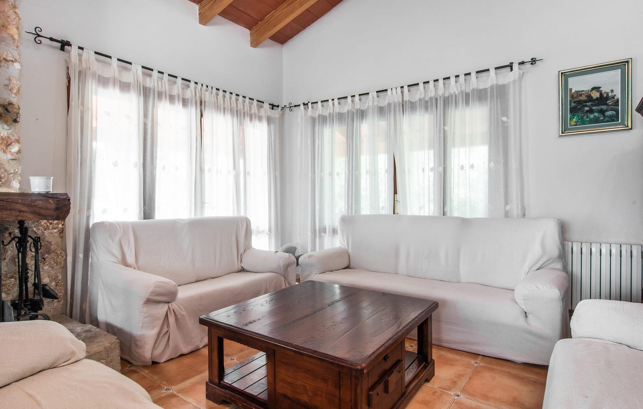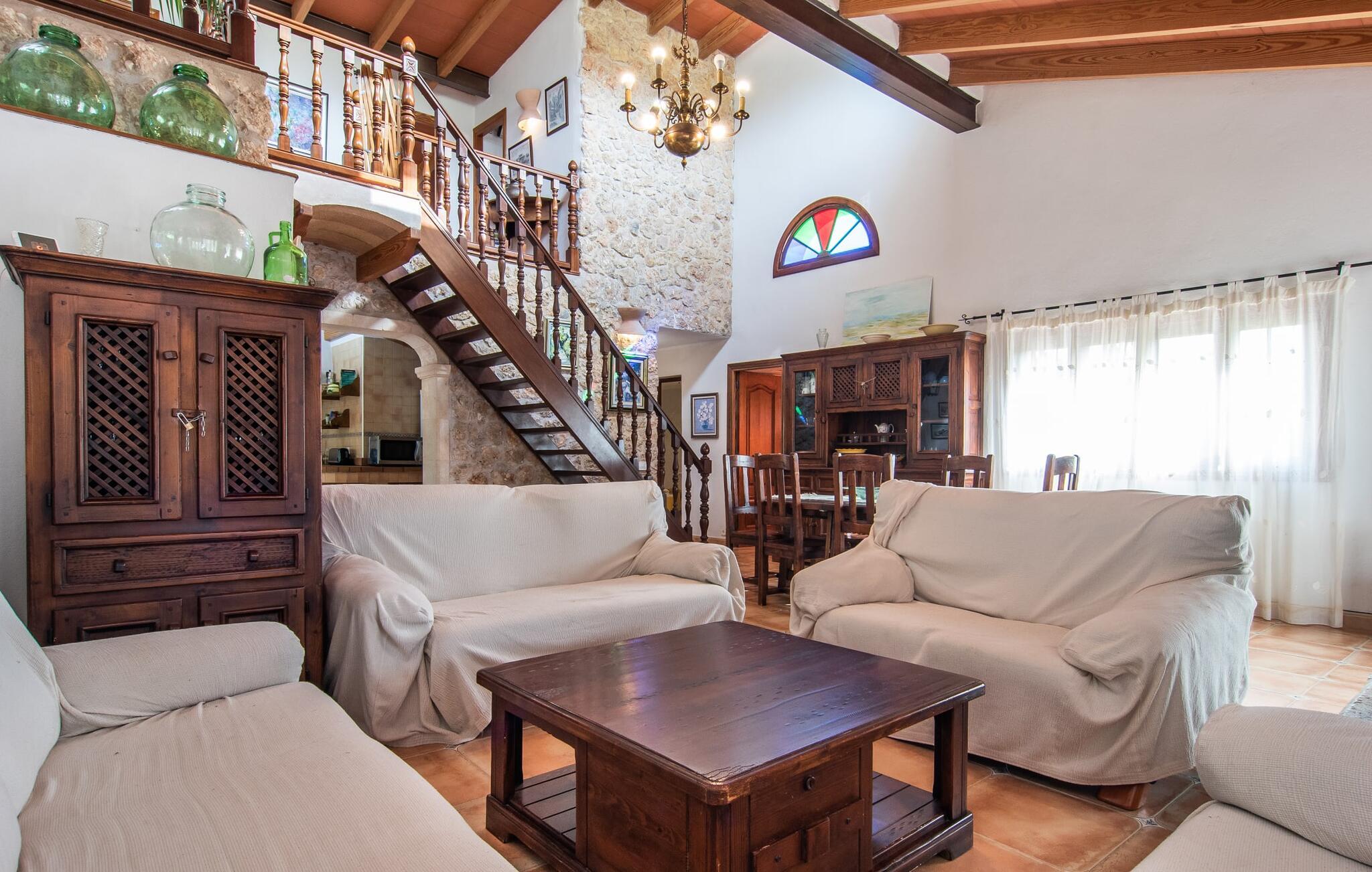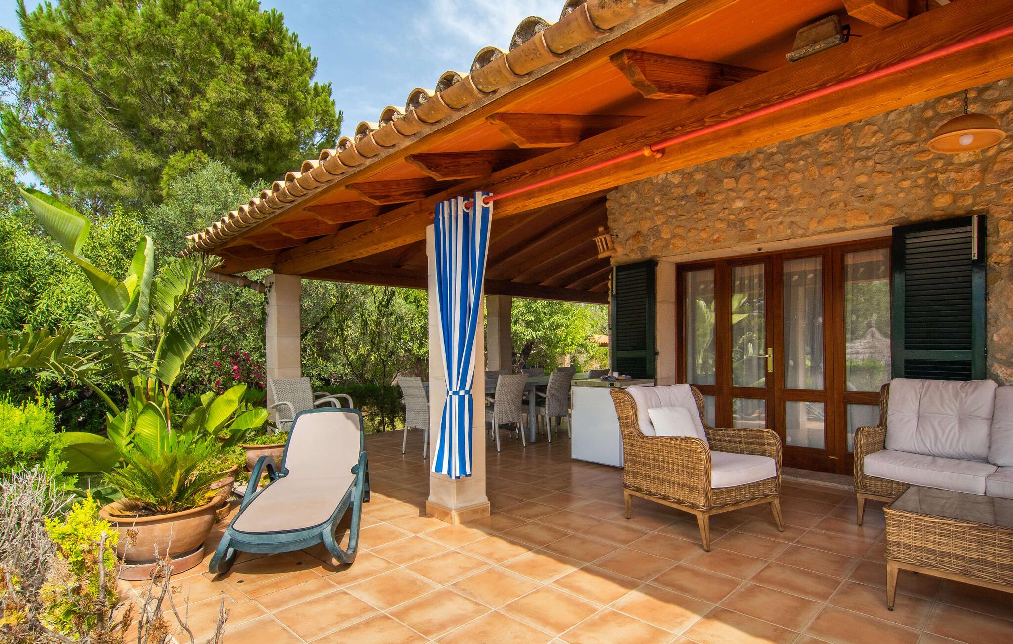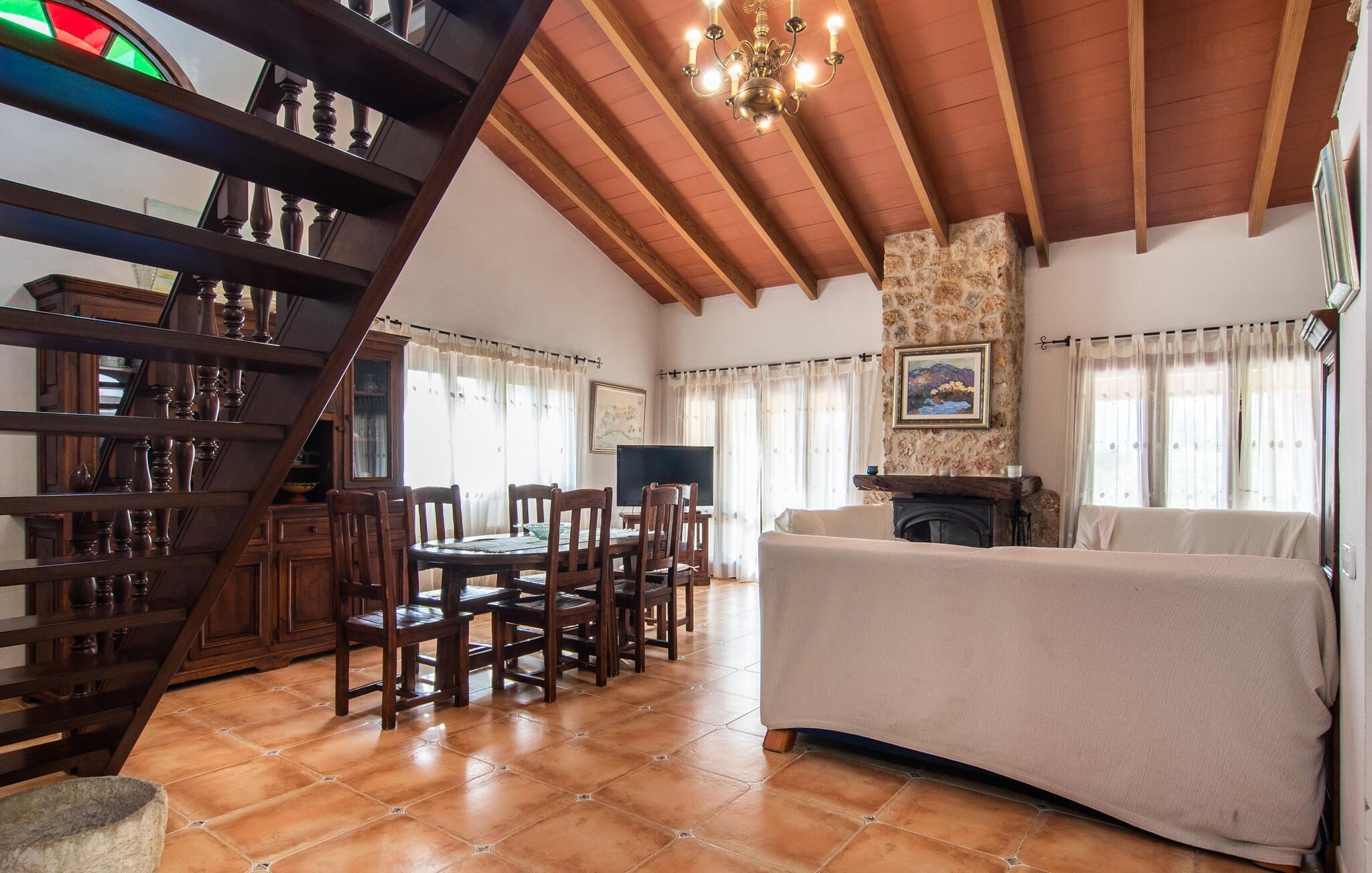 Den karismatiske villa "Son Roura" er en meget idyllisk, stor naturstensbygning, der omslutter sine besøgende med autentisk charme. Rejsen dertil er afslappet, da den attraktive feriebolig ligger i en landlig, men alligevel central beliggenhed og godt forbundet med transportnettet. Køretøjer kan parkeres på privat grund i skyggen. Et første kig på den anlagte have med dens mange grønne træer og middelhavsplanter vil helt sikkert imponere jer. Det står hurtigt klart, at I kan nyde en skøn pause her. Hjertet i komplekset er den store poolterrasse, som tilbyder alle feriegæster masser af plads til at slappe af og solbade under den blå middelhavshimmel. Hvis det bliver for varmt, er der masser af dejlige retreater med naturlig skygge, eller I kan bare hoppe i den smarte pool! Den mosaikbelagte pool varierer i dybden mellem 1 og 2 m og er desuden let tilgængelig via trapper. Det kølige vand giver en forfriskende forfriskning, og I kan finde beroligende afslapning på en af de otte liggestole. Den fantastiske udsigt, som denne ejendom tilbyder, har en særlig behagelig effekt på sjælen: bjergkæderne i Tramuntana-bjergene. Denne fest for øjet kan også beundres fra villaens smukke, overdækkede udendørs terrasse. Udover de flotte loungemøbler er der også et stort spisebord, der inviterer til afslapning og der er også et ekstra køleskab. Så kolde drikke serveres hurtigt, og I kan slappe grundigt af. Grillmesteren blandt jer vil nyde den enorme stengrill ved siden af den L-formede terrasse, mens børnene, der rejser med jer, kan spille bordtennis eller basketball. Inde i villaen vil I blive budt velkommen af en meget komfortabel stue/spisestue, designet og dekoreret med stor sans for detaljer og for det meste møbleret med traditionelle mallorcanske møbler. Pejsen udstråler varme og hygge og små elementer som det farverige halvcirkelformede glasvindue giver rummet en særlig charme. Komfortable sofaer inviterer jer til at slappe af eller læse en god bog. Et fladskærms-tv og en dvd-afspiller sørger også for underholdning. I tilknytning til opholdsområdet er et fuldt udstyret køkken, som er smukt lyst takket være to vinduer og er meget indbydende med sit hvælvede loft og subtile farvespil. En smukt designet trappe i mørkt træ fører op til et lysfyldt galleri, bag hvilket de øvrige rum på første sal er placeret. De tre soveværelser i hovedhuset er meget komfortabelt indrettede og tilbyder nok opbevaringsplads til jeres feriegarderobe. På badeværelserne er nogle af de originale fliser og nostalgisk tilbehør bevaret og kombineret med moderne elementer, så I ikke skal undvære faciliteter som regnbruser og badekar. Et af badeværelserne ligger i stueetagen og kan bruges som gæstetoilet, da det er placeret separat. Det andet badeværelse er ovenpå og er tilgængeligt fra soveværelset. I kan roligt lade pladskrævende ting som hårtørrere eller strygejern blive hjemme, da der er nok af dem i sommerhuset. I villaen "Son Roura" kan I slappe af i en typisk mallorcansk atmosfære og nyde jeres ferie på øen i fulde drag. jeres naturstensvilla er et glimrende udgangspunkt for at lære Mallorca at kende fra forskellige retninger. Den pulserende by Inca og den rolige bjerglandsby Mancor de la Vall kan nås på 5 minutter i bil. "Son Roura" ligger tæt på en tydeligt hørbar landevej, mellem disse to steder, som lover en masse variation takket være deres forskellige karakterer. Fra Mancor de la Vall, der ligger i udkanten af Tramuntana-bjergene, har I adgang til smukke vandrestier og Inca tiltrækker mange besøgende om torsdagen med sit store marked. Den livlige hovedstad Palma og lufthavnen ligger også kun 30 minutter væk. Sandstrandene i den nordøstlige kystregion er også nemme at nå takket være forbindelsen til god infrastruktur. En svømmetur til den smukke bugt Alcúdia bør absolut være en del af jeres ferieprogram! Denne smukke naturstensvilla ligger i landlige omgivelser på en grund beskyttet mod udsigt. Mallorcas tredjestørste by, Inca, ligger kun 3 km væk og byder på adskillige muligheder for hverdagsindkøb samt et fint udvalg af restauranter og barer og en meget attraktiv gågade, der indbyder til at slentre og shoppe. Blot 5 minutters kørsel væk ligger den skjulte bjerglandsby Mancor de la Vall, som er meget stille og rolig. De smukke sandstrande på den nordøstlige kyst, herunder Alcúdia-bugten, ligger omkring 30 km væk.