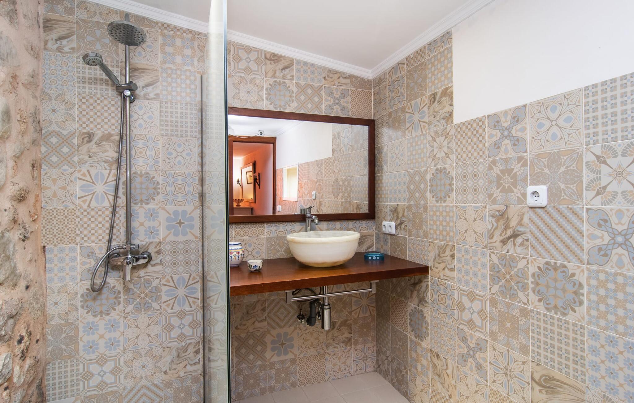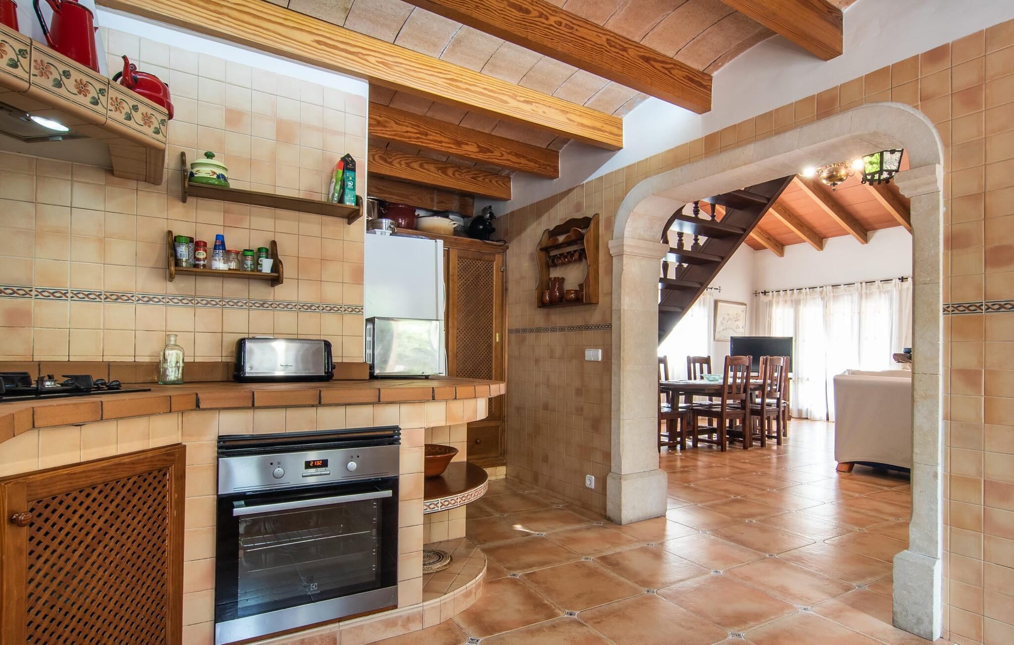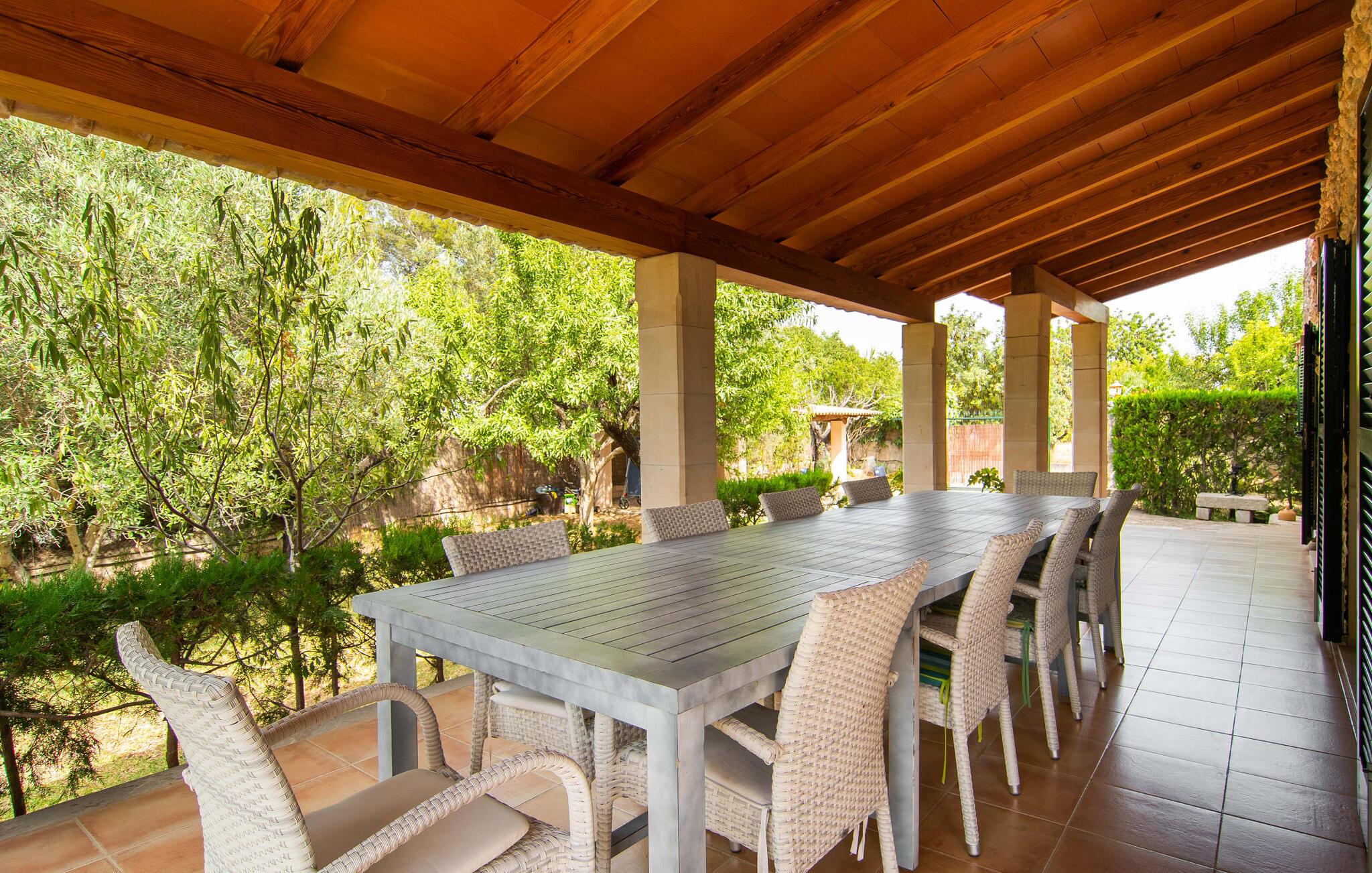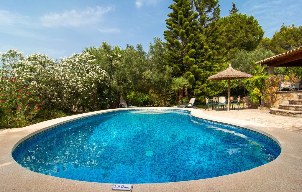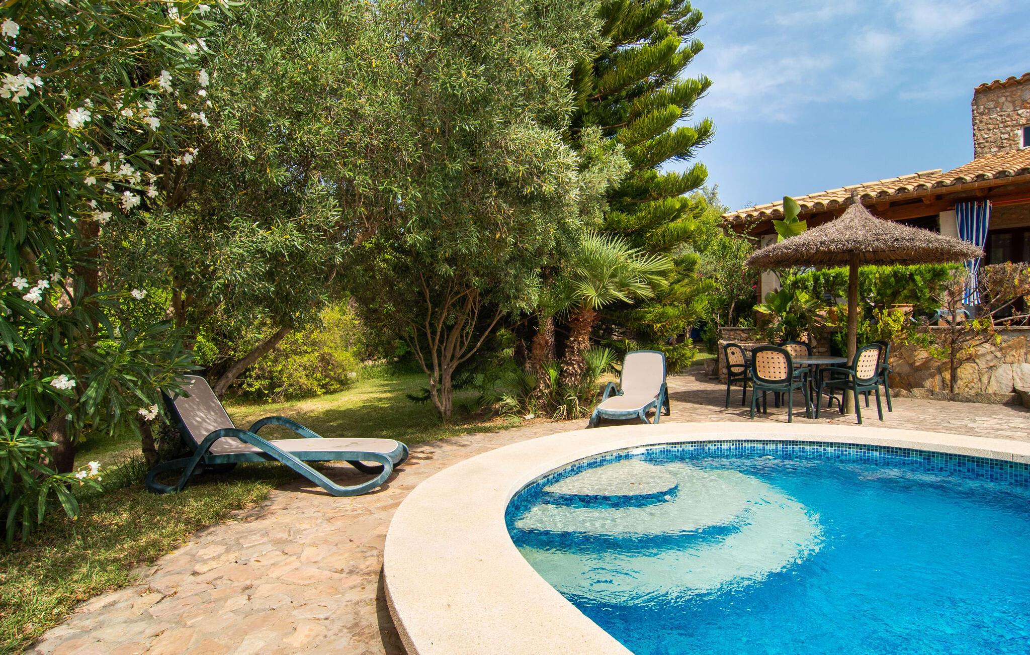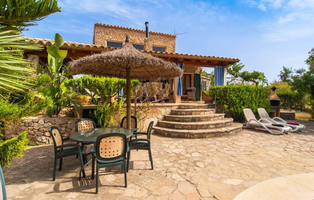 Den karismatiske villa "Son Roura" er en meget idyllisk, stor naturstensbygning, der omslutter sine besøgende med autentisk charme. Rejsen dertil er afslappet, da den attraktive feriebolig ligger i en landlig, men alligevel central beliggenhed og godt forbundet med transportnettet. Køretøjer kan parkeres på privat grund i skyggen. Et første kig på den anlagte have med dens mange grønne træer og middelhavsplanter vil helt sikkert imponere jer. Det står hurtigt klart, at I kan nyde en skøn pause her. Hjertet i komplekset er den store poolterrasse, som tilbyder alle feriegæster masser af plads til at slappe af og solbade under den blå middelhavshimmel. Hvis det bliver for varmt, er der masser af dejlige retreater med naturlig skygge, eller I kan bare hoppe i den smarte pool! Den mosaikbelagte pool varierer i dybden mellem 1 og 2 m og er desuden let tilgængelig via trapper. Det kølige vand giver en forfriskende forfriskning, og I kan finde beroligende afslapning på en af de otte liggestole. Den fantastiske udsigt, som denne ejendom tilbyder, har en særlig behagelig effekt på sjælen: bjergkæderne i Tramuntana-bjergene. Denne fest for øjet kan også beundres fra villaens smukke, overdækkede udendørs terrasse. Udover de flotte loungemøbler er der også et stort spisebord, der inviterer til afslapning og der er også et ekstra køleskab. Så kolde drikke serveres hurtigt, og I kan slappe grundigt af. Grillmesteren blandt jer vil nyde den enorme stengrill ved siden af den L-formede terrasse, mens børnene, der rejser med jer, kan spille bordtennis eller basketball. Inde i villaen vil I blive budt velkommen af en meget komfortabel stue/spisestue, designet og dekoreret med stor sans for detaljer og for det meste møbleret med traditionelle mallorcanske møbler. Pejsen udstråler varme og hygge og små elementer som det farverige halvcirkelformede glasvindue giver rummet en særlig charme. Komfortable sofaer inviterer jer til at slappe af eller læse en god bog. Et fladskærms-tv og en dvd-afspiller sørger også for underholdning. I tilknytning til opholdsområdet er et fuldt udstyret køkken, som er smukt lyst takket være to vinduer og er meget indbydende med sit hvælvede loft og subtile farvespil. En smukt designet trappe i mørkt træ fører op til et lysfyldt galleri, bag hvilket de øvrige rum på første sal er placeret. De tre soveværelser i hovedhuset er meget komfortabelt indrettede og tilbyder nok opbevaringsplads til jeres feriegarderobe. På badeværelserne er nogle af de originale fliser og nostalgisk tilbehør bevaret og kombineret med moderne elementer, så I ikke skal undvære faciliteter som regnbruser og badekar. Et af badeværelserne ligger i stueetagen og kan bruges som gæstetoilet, da det er placeret separat. Det andet badeværelse er ovenpå og er tilgængeligt fra soveværelset. I kan roligt lade pladskrævende ting som hårtørrere eller strygejern blive hjemme, da der er nok af dem i sommerhuset. I villaen "Son Roura" kan I slappe af i en typisk mallorcansk atmosfære og nyde jeres ferie på øen i fulde drag. jeres naturstensvilla er et glimrende udgangspunkt for at lære Mallorca at kende fra forskellige retninger. Den pulserende by Inca og den rolige bjerglandsby Mancor de la Vall kan nås på 5 minutter i bil. "Son Roura" ligger tæt på en tydeligt hørbar landevej, mellem disse to steder, som lover en masse variation takket være deres forskellige karakterer. Fra Mancor de la Vall, der ligger i udkanten af Tramuntana-bjergene, har I adgang til smukke vandrestier og Inca tiltrækker mange besøgende om torsdagen med sit store marked. Den livlige hovedstad Palma og lufthavnen ligger også kun 30 minutter væk. Sandstrandene i den nordøstlige kystregion er også nemme at nå takket være forbindelsen til god infrastruktur. En svømmetur til den smukke bugt Alcúdia bør absolut være en del af jeres ferieprogram! Denne smukke naturstensvilla ligger i landlige omgivelser på en grund beskyttet mod udsigt. Mallorcas tredjestørste by, Inca, ligger kun 3 km væk og byder på adskillige muligheder for hverdagsindkøb samt et fint udvalg af restauranter og barer og en meget attraktiv gågade, der indbyder til at slentre og shoppe. Blot 5 minutters kørsel væk ligger den skjulte bjerglandsby Mancor de la Vall, som er meget stille og rolig. De smukke sandstrande på den nordøstlige kyst, herunder Alcúdia-bugten, ligger omkring 30 km væk.