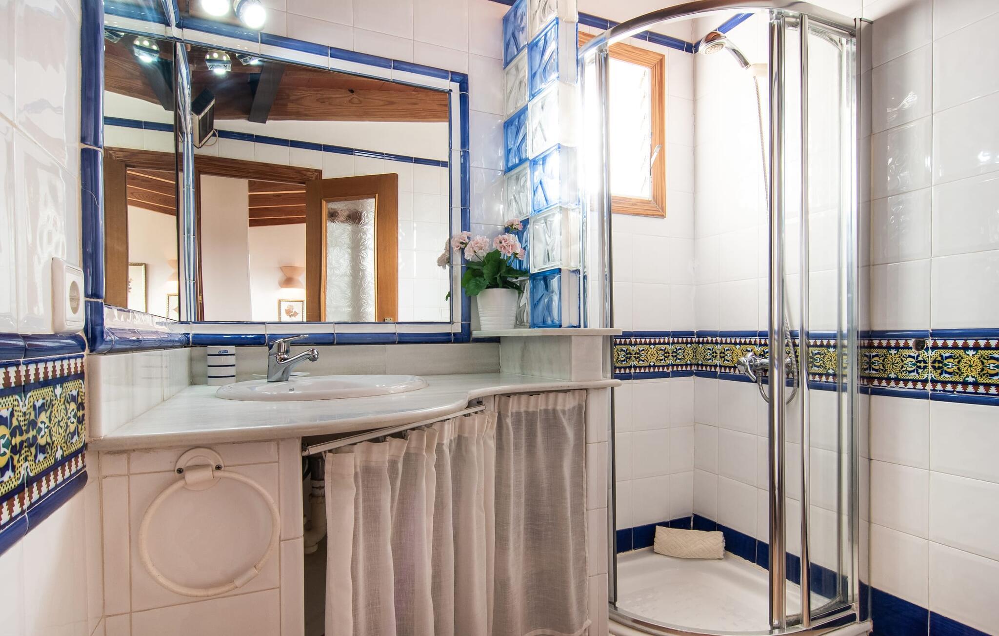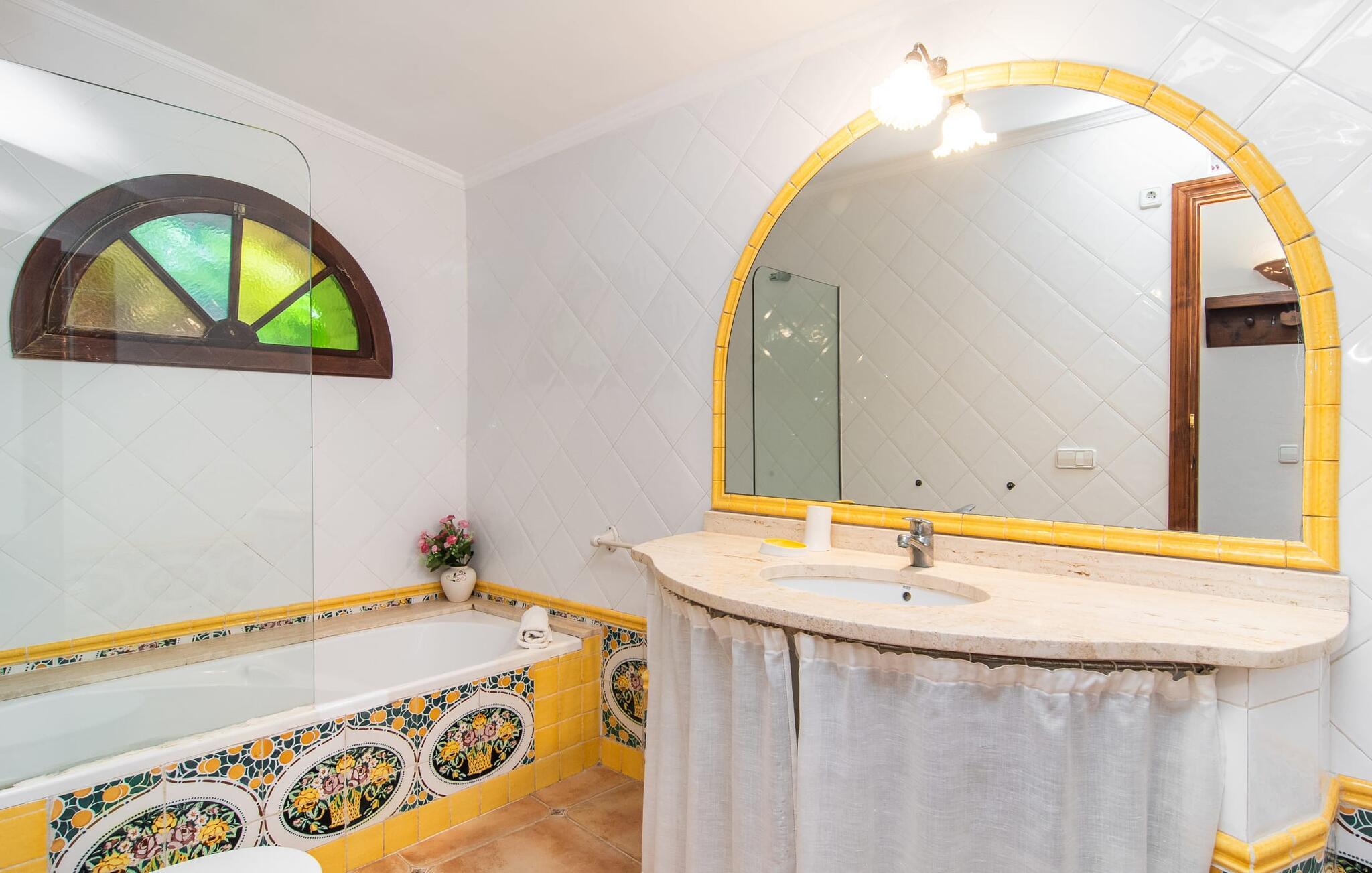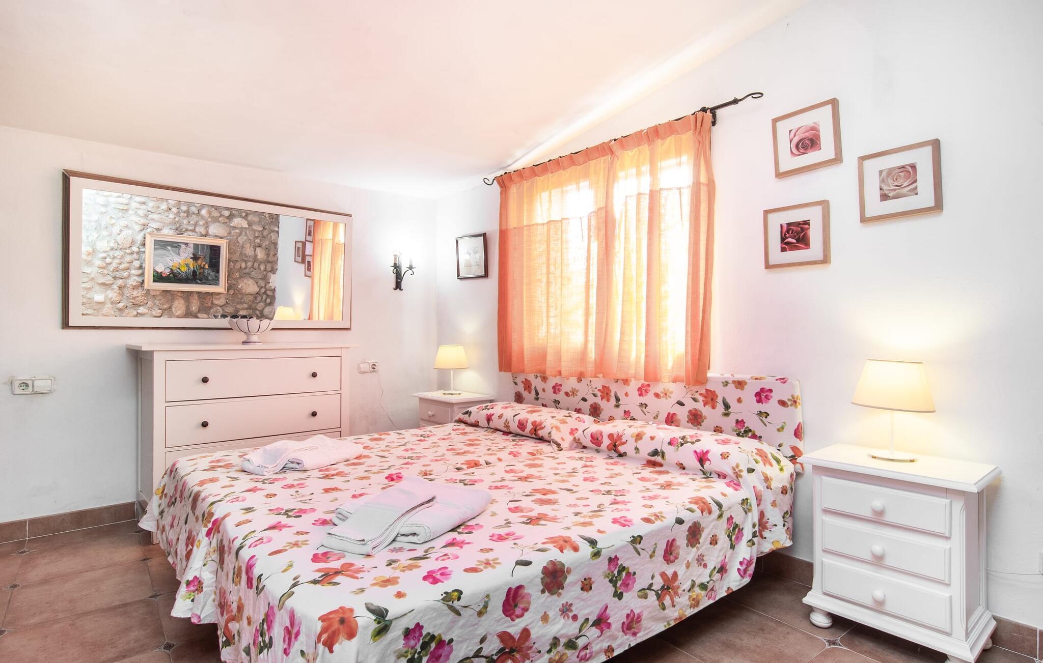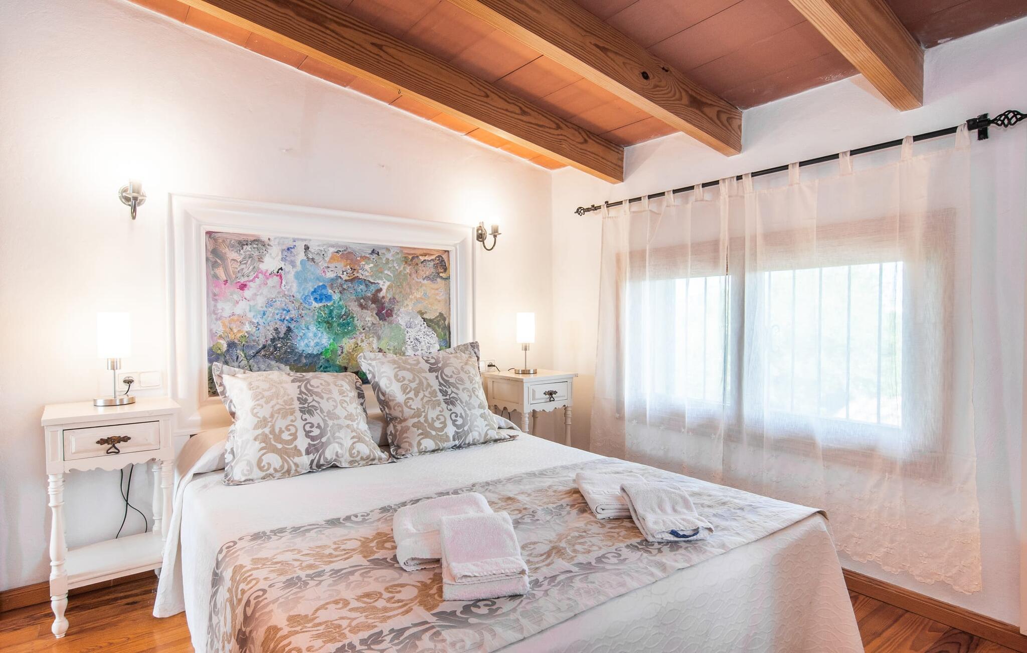 Den karismatiske villa "Son Roura" er en meget idyllisk, stor naturstensbygning, der omslutter sine besøgende med autentisk charme. Rejsen dertil er afslappet, da den attraktive feriebolig ligger i en landlig, men alligevel central beliggenhed og godt forbundet med transportnettet. Køretøjer kan parkeres på privat grund i skyggen. Et første kig på den anlagte have med dens mange grønne træer og middelhavsplanter vil helt sikkert imponere jer. Det står hurtigt klart, at I kan nyde en skøn pause her. Hjertet i komplekset er den store poolterrasse, som tilbyder alle feriegæster masser af plads til at slappe af og solbade under den blå middelhavshimmel. Hvis det bliver for varmt, er der masser af dejlige retreater med naturlig skygge, eller I kan bare hoppe i den smarte pool! Den mosaikbelagte pool varierer i dybden mellem 1 og 2 m og er desuden let tilgængelig via trapper. Det kølige vand giver en forfriskende forfriskning, og I kan finde beroligende afslapning på en af de otte liggestole. Den fantastiske udsigt, som denne ejendom tilbyder, har en særlig behagelig effekt på sjælen: bjergkæderne i Tramuntana-bjergene. Denne fest for øjet kan også beundres fra villaens smukke, overdækkede udendørs terrasse. Udover de flotte loungemøbler er der også et stort spisebord, der inviterer til afslapning og der er også et ekstra køleskab. Så kolde drikke serveres hurtigt, og I kan slappe grundigt af. Grillmesteren blandt jer vil nyde den enorme stengrill ved siden af den L-formede terrasse, mens børnene, der rejser med jer, kan spille bordtennis eller basketball. Inde i villaen vil I blive budt velkommen af en meget komfortabel stue/spisestue, designet og dekoreret med stor sans for detaljer og for det meste møbleret med traditionelle mallorcanske møbler. Pejsen udstråler varme og hygge og små elementer som det farverige halvcirkelformede glasvindue giver rummet en særlig charme. Komfortable sofaer inviterer jer til at slappe af eller læse en god bog. Et fladskærms-tv og en dvd-afspiller sørger også for underholdning. I tilknytning til opholdsområdet er et fuldt udstyret køkken, som er smukt lyst takket være to vinduer og er meget indbydende med sit hvælvede loft og subtile farvespil. En smukt designet trappe i mørkt træ fører op til et lysfyldt galleri, bag hvilket de øvrige rum på første sal er placeret. De tre soveværelser i hovedhuset er meget komfortabelt indrettede og tilbyder nok opbevaringsplads til jeres feriegarderobe. På badeværelserne er nogle af de originale fliser og nostalgisk tilbehør bevaret og kombineret med moderne elementer, så I ikke skal undvære faciliteter som regnbruser og badekar. Et af badeværelserne ligger i stueetagen og kan bruges som gæstetoilet, da det er placeret separat. Det andet badeværelse er ovenpå og er tilgængeligt fra soveværelset. I kan roligt lade pladskrævende ting som hårtørrere eller strygejern blive hjemme, da der er nok af dem i sommerhuset. I villaen "Son Roura" kan I slappe af i en typisk mallorcansk atmosfære og nyde jeres ferie på øen i fulde drag. jeres naturstensvilla er et glimrende udgangspunkt for at lære Mallorca at kende fra forskellige retninger. Den pulserende by Inca og den rolige bjerglandsby Mancor de la Vall kan nås på 5 minutter i bil. "Son Roura" ligger tæt på en tydeligt hørbar landevej, mellem disse to steder, som lover en masse variation takket være deres forskellige karakterer. Fra Mancor de la Vall, der ligger i udkanten af Tramuntana-bjergene, har I adgang til smukke vandrestier og Inca tiltrækker mange besøgende om torsdagen med sit store marked. Den livlige hovedstad Palma og lufthavnen ligger også kun 30 minutter væk. Sandstrandene i den nordøstlige kystregion er også nemme at nå takket være forbindelsen til god infrastruktur. En svømmetur til den smukke bugt Alcúdia bør absolut være en del af jeres ferieprogram! Denne smukke naturstensvilla ligger i landlige omgivelser på en grund beskyttet mod udsigt. Mallorcas tredjestørste by, Inca, ligger kun 3 km væk og byder på adskillige muligheder for hverdagsindkøb samt et fint udvalg af restauranter og barer og en meget attraktiv gågade, der indbyder til at slentre og shoppe. Blot 5 minutters kørsel væk ligger den skjulte bjerglandsby Mancor de la Vall, som er meget stille og rolig. De smukke sandstrande på den nordøstlige kyst, herunder Alcúdia-bugten, ligger omkring 30 km væk.