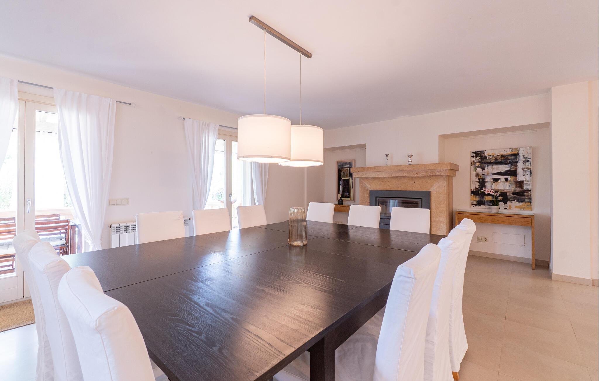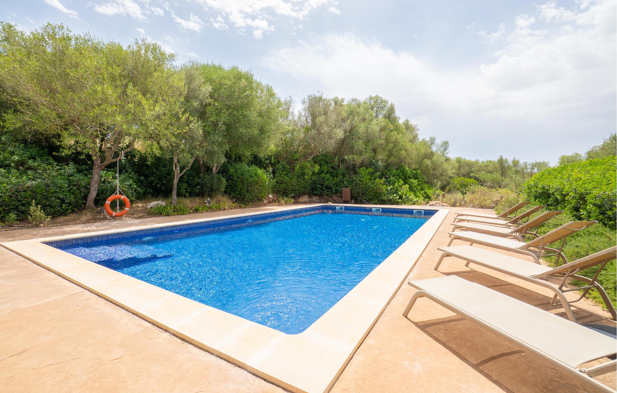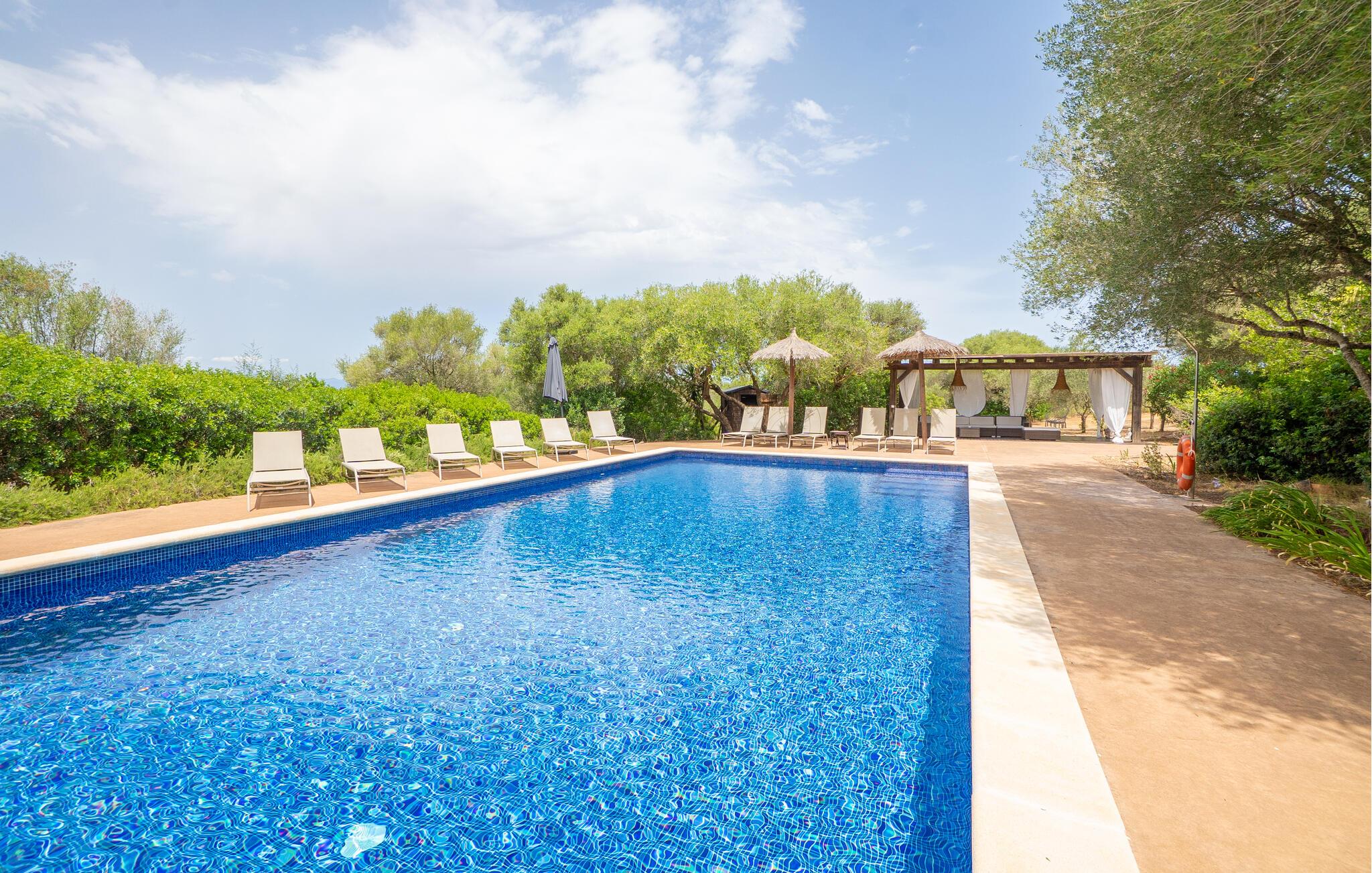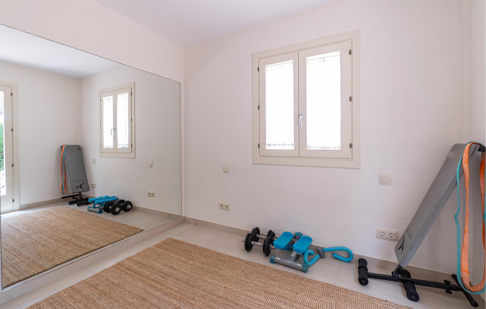 Nyd en uforglemmelig ferie med venner eller familie i dette rummelige feriehus med pool. Beliggende på en stor, idyllisk grund, der tilbyder maksimalt privatliv, byder denne komfortable mallorcanske finca jer velkommen. Denne drømmeagtige ejendom vil forkæle jer med alt, hvad der gør en ferie på denne fortryllende middelhavsø til en uforglemmelig oplevelse, og tilbyder rigelig plads til sociale sammenkomster - selv med en større gruppe, der søger fred og ro. Træd indenfor og lad jer betage af det lyse og smagfuldt indrettede interiør. I det rummelige køkken kan I tilberede kulinariske lækkerier med friske råvarer fra markedet og servere dem i en af de mange spiseområder. Efter lange måltider kan I forkæle jer selv med en afslappende siesta i jeres hyggelige soveværelse eller bruge træningsmaskinerne til en træning. Snak om svundne tider foran pejsen eller træk jer tilbage til den indbydende tv-stue for en film eller stille læsning. Det rummelige og alsidige udendørsområde er perfekt til fuldt ud at nyde middelhavsklimaet. Så snart I vågner, kan I svømme afslappende baner i den smukke, afsidesliggende pool, se solen stå op over havet, mens I nipper til en duftende kaffe på terrassen, og derefter lukke øjnene på liggestolen for at lytte til cikaderne. Server friskpresset appelsinjuice til morgenmad udenfor, og tænd op i grillen ved solnedgang for at slappe af i de lune sommernætter med vin og stearinlys. De romantiske bugter med turkisblåt vand og de lange, børnevenlige sandstrande på Mallorcas østkyst ligger kun en kort køretur fra denne oase af ro. Gå en tur gennem det farverige ugentlige marked i Artà, udforsk de romerske ruiner af Alcúdia - øens ældste by - eller forkæl jer selv med en drink med udsigt over havet i Son Serra. Prøv mallorcansk køkken i en hyggelig restaurant eller nyd en lækker paella serveret i skyggen. Glæd jer til en dejlig ferie i denne fortryllende finca.