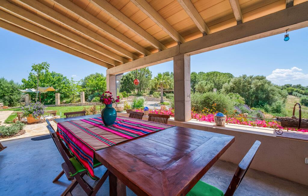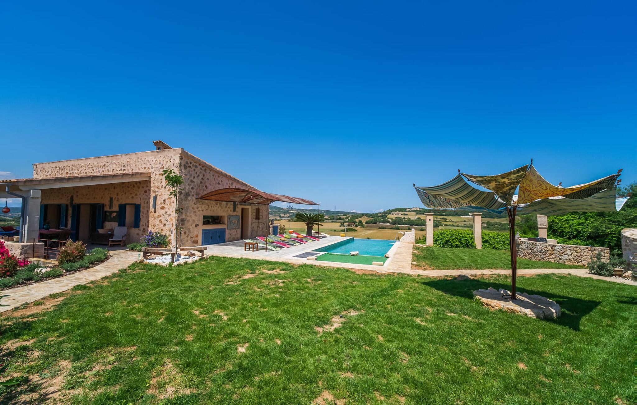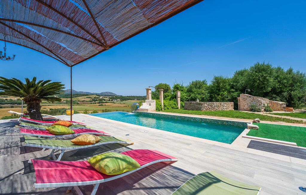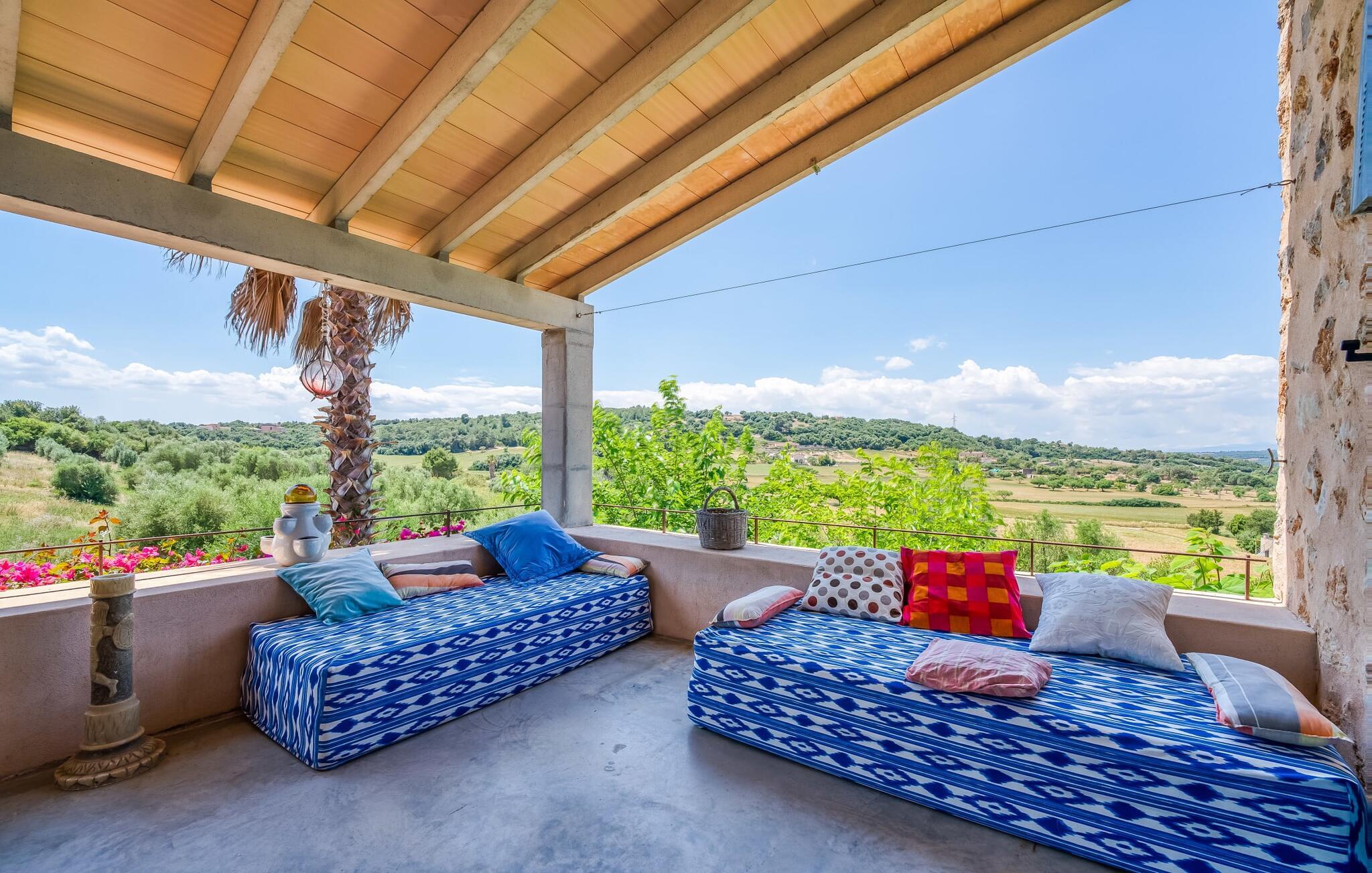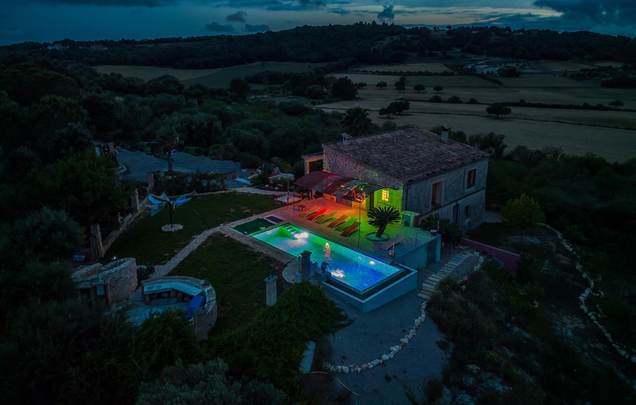 Feriehuset "Son Talent" har en sensationel beliggenhed på en bjergskråning midt i det smukke landskab på den østlige del af Mallorca. Terrasserne byder på en fantastisk udsigt over Tramuntana-bjergene. Haven er hjemsted for duftende citron-, mandarin- og appelsintræer og gemmer på hyggelige steder i skyggen af palmer, oleandere og oliventræer. Takket være en let brise inviterer den overdækkede terrasse langs huset jer til at blive hængende, mens I spiser og tage en afslappet lur i den hyggelige lounge. På den anden side af poolen er der endnu en halvcirkelformet terrasse. Den er udstyret med et udendørs køkken med grill og en smuk udendørs bruser. Poolen har et modstrømssystem og en vandfaldsbruser. Kan I forestille jer, hvordan det er at forfriske jer selv i denne oplyste pool under en imponerende stjernehimmel på varme sommernætter? Det indre af ferieboligen er lige så kærligt designet som det ydre. Den farverige, kreative udsmykning formidler livsglæde og en hjemlig følelse. Den rummelige, lyse opholdsstue med specialfremstillede hylder, en behagelig lædersofa og en imponerende pejs flyder glat ind i spisepladsen og et åbent, moderne køkken. Alle vinduer har en vidunderlig udsigt over landskabet. Fra stuen fører en trappe ned til kælderen. Der er fire individuelt indrettede soveområder. Tre af dem har hver deres udgang til haven og aircondition. To af dobbeltværelserne har eget badeværelse. De to andre deler eget badeværelse. Der er også et gæstetoilet på øverste stueplan. Huset er udstyret med varme, musikanlæg og stabilt WiFi. Feriehuset ligger på en stor kuperet grund på den østlige del af Mallorca. Manacor, 6 km væk, byder på gode indkøbsmuligheder. Forskellige sandstrande på østkysten ligger 20-25 km væk.