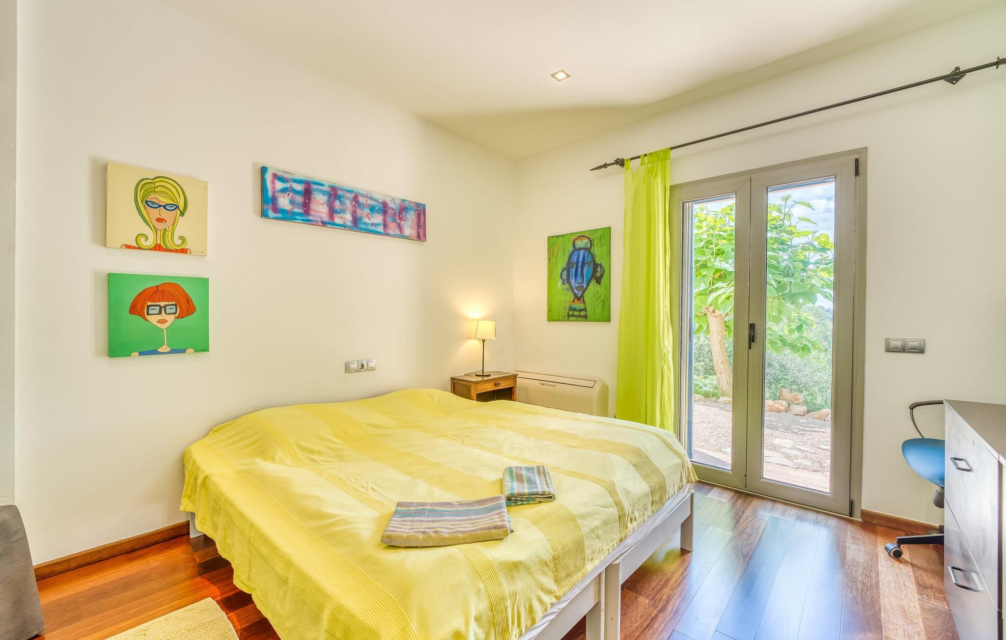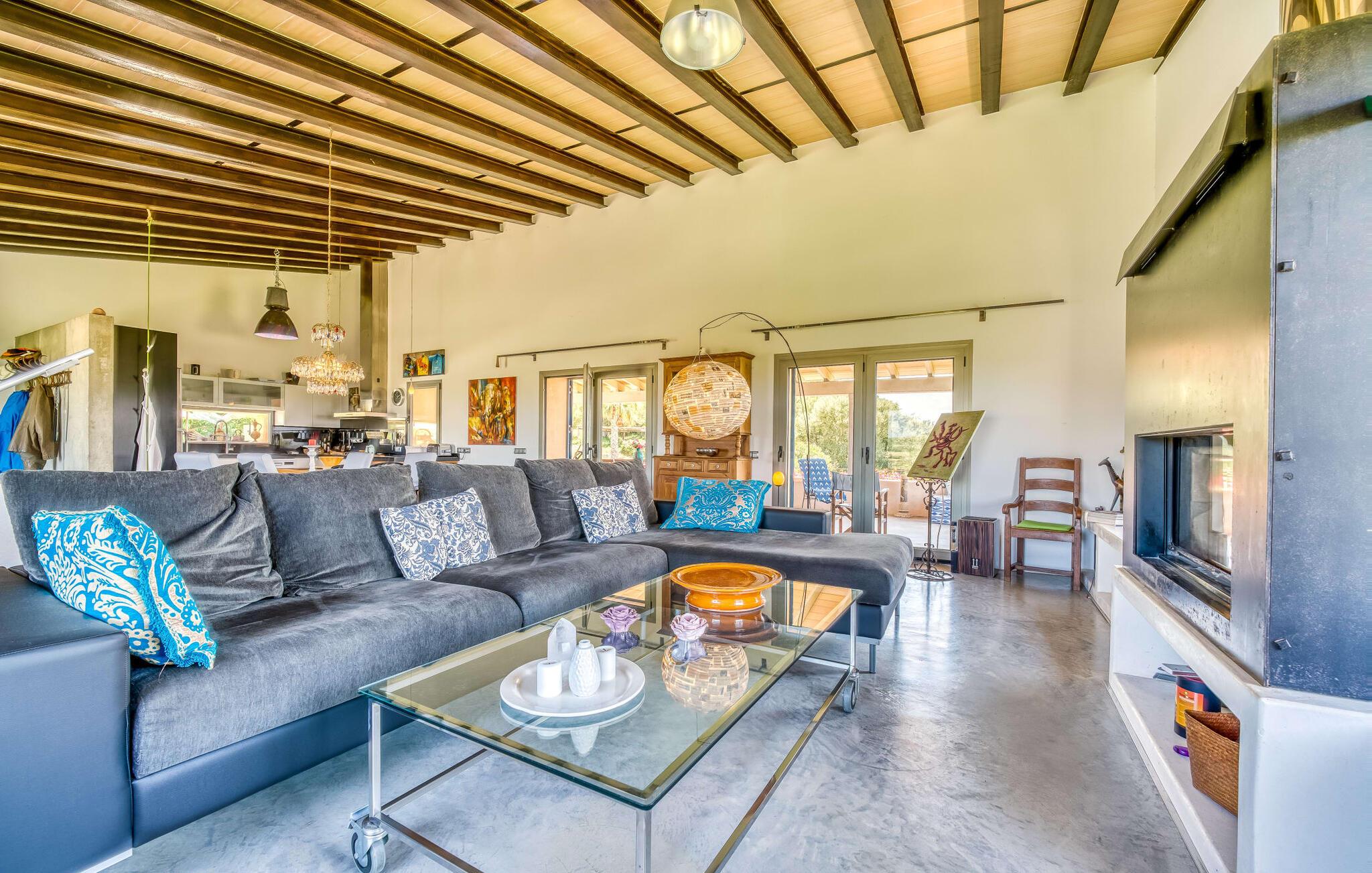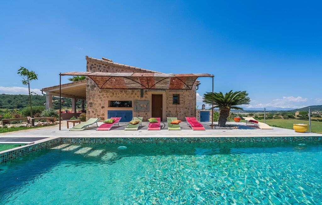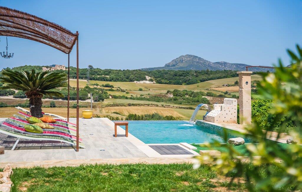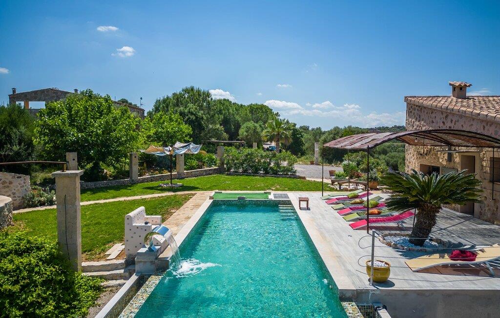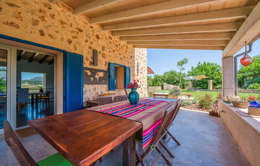 Feriehuset "Son Talent" har en sensationel beliggenhed på en bjergskråning midt i det smukke landskab på den østlige del af Mallorca. Terrasserne byder på en fantastisk udsigt over Tramuntana-bjergene. Haven er hjemsted for duftende citron-, mandarin- og appelsintræer og gemmer på hyggelige steder i skyggen af palmer, oleandere og oliventræer. Takket være en let brise inviterer den overdækkede terrasse langs huset jer til at blive hængende, mens I spiser og tage en afslappet lur i den hyggelige lounge. På den anden side af poolen er der endnu en halvcirkelformet terrasse. Den er udstyret med et udendørs køkken med grill og en smuk udendørs bruser. Poolen har et modstrømssystem og en vandfaldsbruser. Kan I forestille jer, hvordan det er at forfriske jer selv i denne oplyste pool under en imponerende stjernehimmel på varme sommernætter? Det indre af ferieboligen er lige så kærligt designet som det ydre. Den farverige, kreative udsmykning formidler livsglæde og en hjemlig følelse. Den rummelige, lyse opholdsstue med specialfremstillede hylder, en behagelig lædersofa og en imponerende pejs flyder glat ind i spisepladsen og et åbent, moderne køkken. Alle vinduer har en vidunderlig udsigt over landskabet. Fra stuen fører en trappe ned til kælderen. Der er fire individuelt indrettede soveområder. Tre af dem har hver deres udgang til haven og aircondition. To af dobbeltværelserne har eget badeværelse. De to andre deler eget badeværelse. Der er også et gæstetoilet på øverste stueplan. Huset er udstyret med varme, musikanlæg og stabilt WiFi. Feriehuset ligger på en stor kuperet grund på den østlige del af Mallorca. Manacor, 6 km væk, byder på gode indkøbsmuligheder. Forskellige sandstrande på østkysten ligger 20-25 km væk.