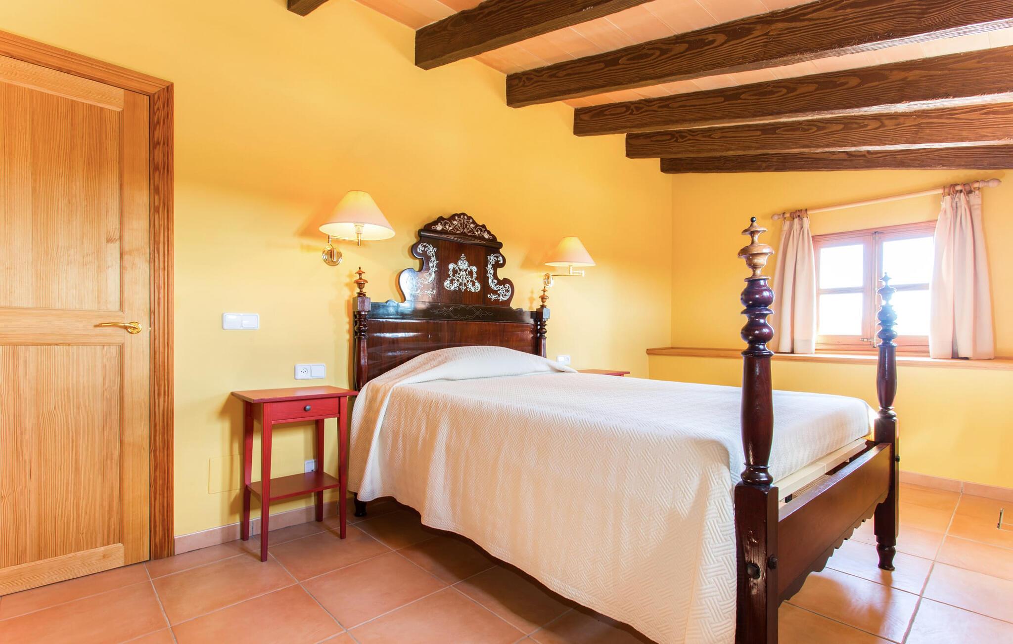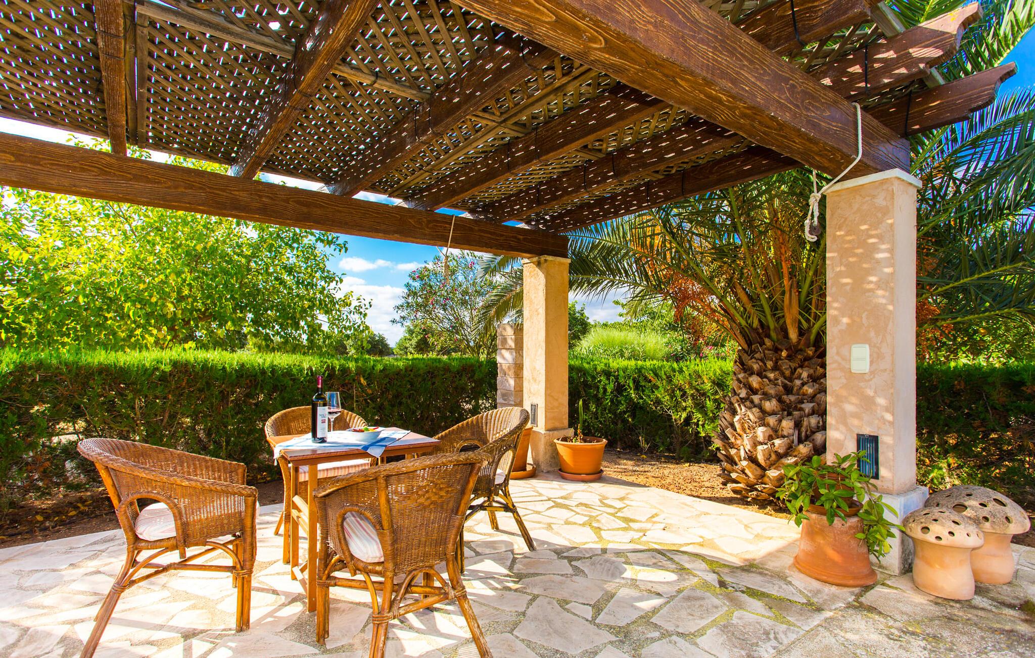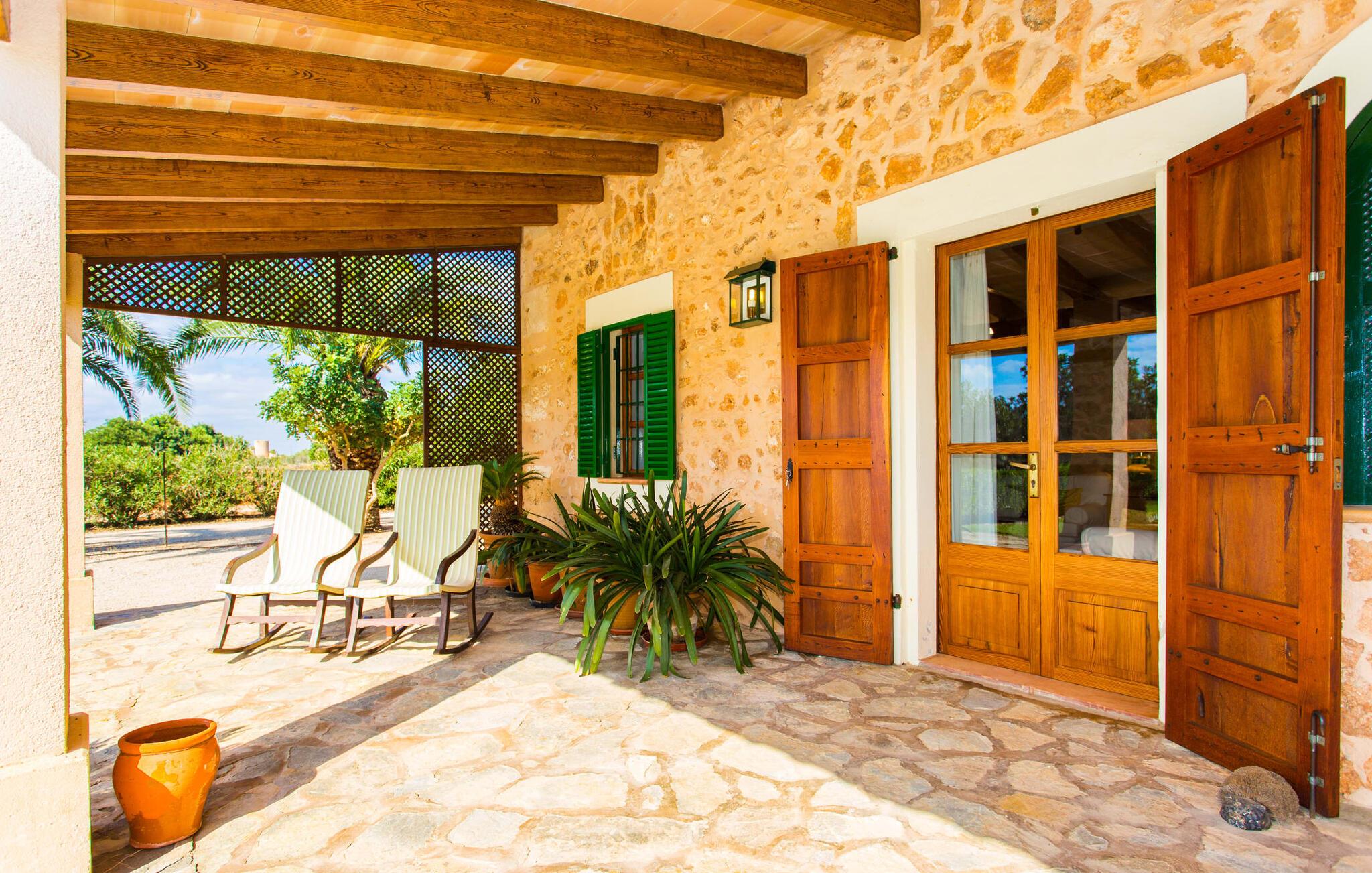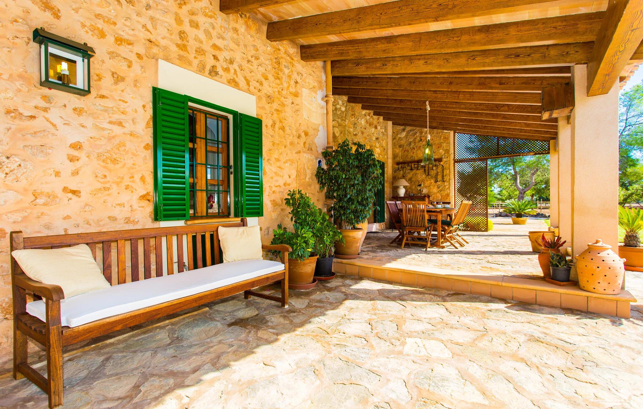Har I altid drømt om en afslappende ferie i rolige omgivelser, en landlig idyl og nem adgang til de typiske østrande? Så er villaen "Son Viquet" lige noget for jer! I kan forvente en yderst hyggelig, kærligt møbleret atmosfære og en behagelig forbindelse til bekvemt forbundne områder. Den private ejendom er beliggende i en tyndt befolket villaregion og er let tilgængelig via asfalteret vej. En stor og velholdt have byder på en stor velkomst og inviterer til at gå på opdagelse i omgivelserne. Mange palmer og andre middelhavsplanter dekorerer rummene og skaber en fortryllende atmosfære, hvor I vil nyde at tilbringe tid. En hængekøje tilføjer til den indbydende atmosfære. Der er endda et fodboldmål for unge og gamle spillere. Det 10 m store bassin, som nemt kan nås via en halvcirkelformet trappe, giver den nødvendige forfriskning på varme sommerdage: Svøm om morgenen, svøm et par længder og nyd forfriskningen, der breder sig i hele jeres krop! Glem ikke at læse en god bog og nyde timers udendørs aktivitet eller under det smukke træloft med en drink inden for rækkevidde! En stor overdækket terrasse er placeret foran huset og har et spisebord med yderligere siddepladser: dette er det rigtige sted til morgenmad, hvor I kan sidde sammen og planlægge resten af dagen med udsigt til haven og den blå himmel . Men det er også hyggeligt at sidde her om aftenen, og hvis I tænder for grillen i tide, kan I fejre en kulinarisk BBQ sidst på dagen. En rustik, hyggelig atmosfære venter jer inde i villaen: traditionelle synlige bjælker, terracotta flisegulve og naturstenselementer på væggene skaber en individuel og meget hyggelig atmosfære. Brugen af diskrete, lyse farver understreger den indbydende effekt, det samme gør de nøje udvalgte antikke møbler og den klassiske udsmykning. I stueetagen er der et rummeligt køkken med en ø og et stort spisebord, der indbyder til at lave mad og spise sammen. Det lyst indrettede værelse er fuldt udstyret med ovn, komfur, køle/fryseskab kombination, mikroovn, opvaskemaskine, elkedel og filterkaffemaskine og giver derfor et godt grundlag for selvstændig selvforsyning. Find jeres personlige yndlingssted i den hyggelige stue med et separat læsehjørne under trappen og nyd afslapningsstunderne – pejsen er ikke i brug, men skaber stadig en hjemlig atmosfære. På dette niveau er der også et badeværelse med badekar, mens der på øverste etage er tre separate soveværelser, alle med gule vægge og yderligere to rummelige badeværelser, et af dem en-suite. Til en afslappende nat er der to 1,80 x 2,00 m senge og to 0,90 m x 2,00 m senge til rådighed. Et strygejern og to hårtørrere er tilgængelige på stedet, og I behøver ikke at tage dem med jer - det sparer plads i jeres kuffert! Campos selv er en ret fredelig by, men den er meget livlig på markedsdage (torsdage og lørdage). Udover regionale landbrugsprodukter som frugt og grønt tilbydes der også andre ting som souvenirs. Havneområdet i den tidligere fiskerby Colonia de Sant Jordi (21 km) er meget indbydende, måske vil I tage et kig? Hvis I elsker en badeferie, er denne villa det rigtige sted for dig: de indbydende strande på sydøstkysten, herunder den familievenlige Es Trenc strand, er nemme at nå med en lejebil. Den rummelige villa "Son Viquet" er beliggende i landlige omgivelser på en malerisk ejendom, kun 10 minutter i bil øst for Campos. I Campos finder I barer, restauranter og butikker til jeres daglige behov. Køreturen til Mallorcas sydlige strande er ikke langt fra dette feriehus. Mallorcas livlige hovedstad Palma kan nås på omkring 40 minutter i bil.