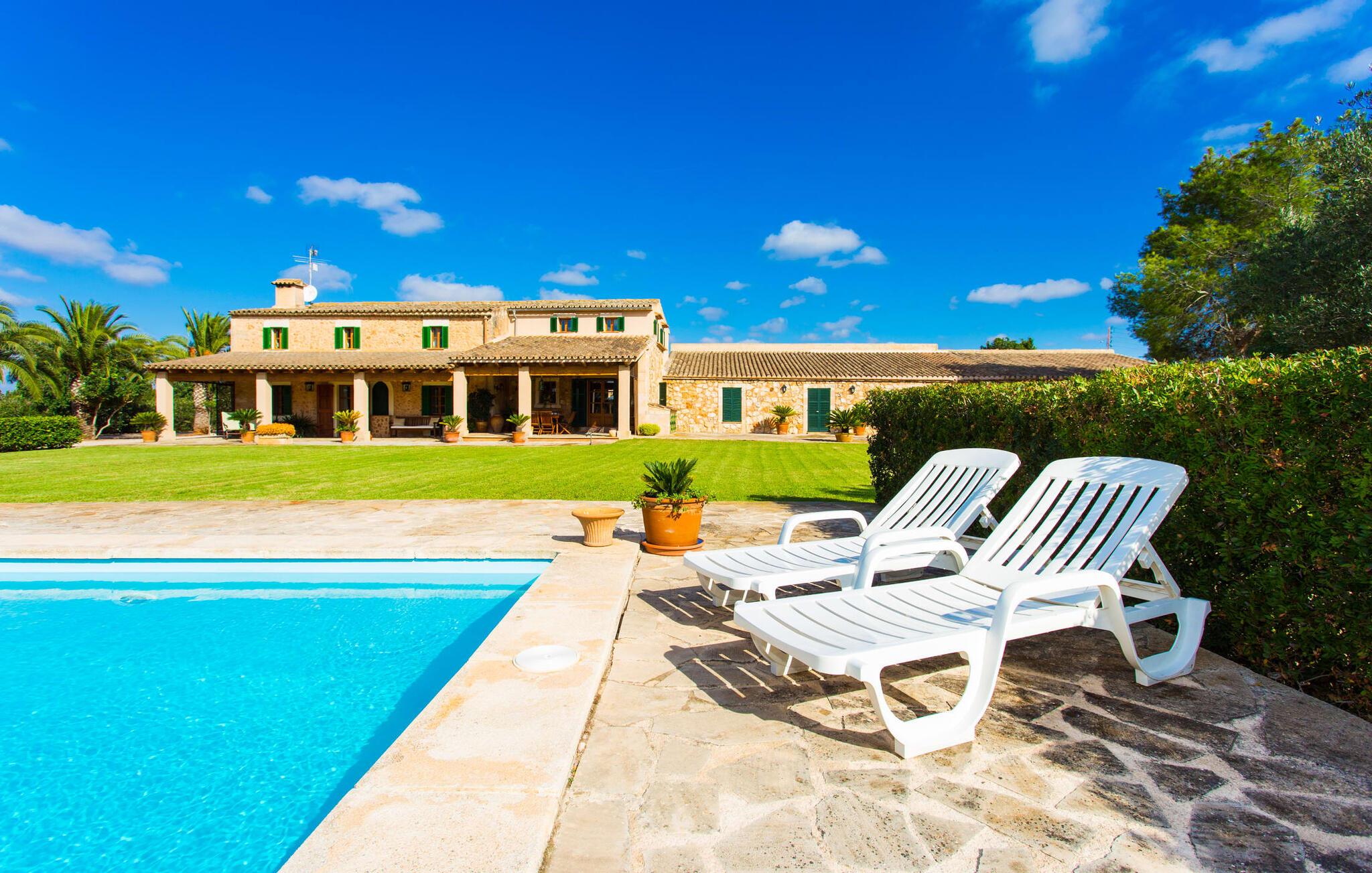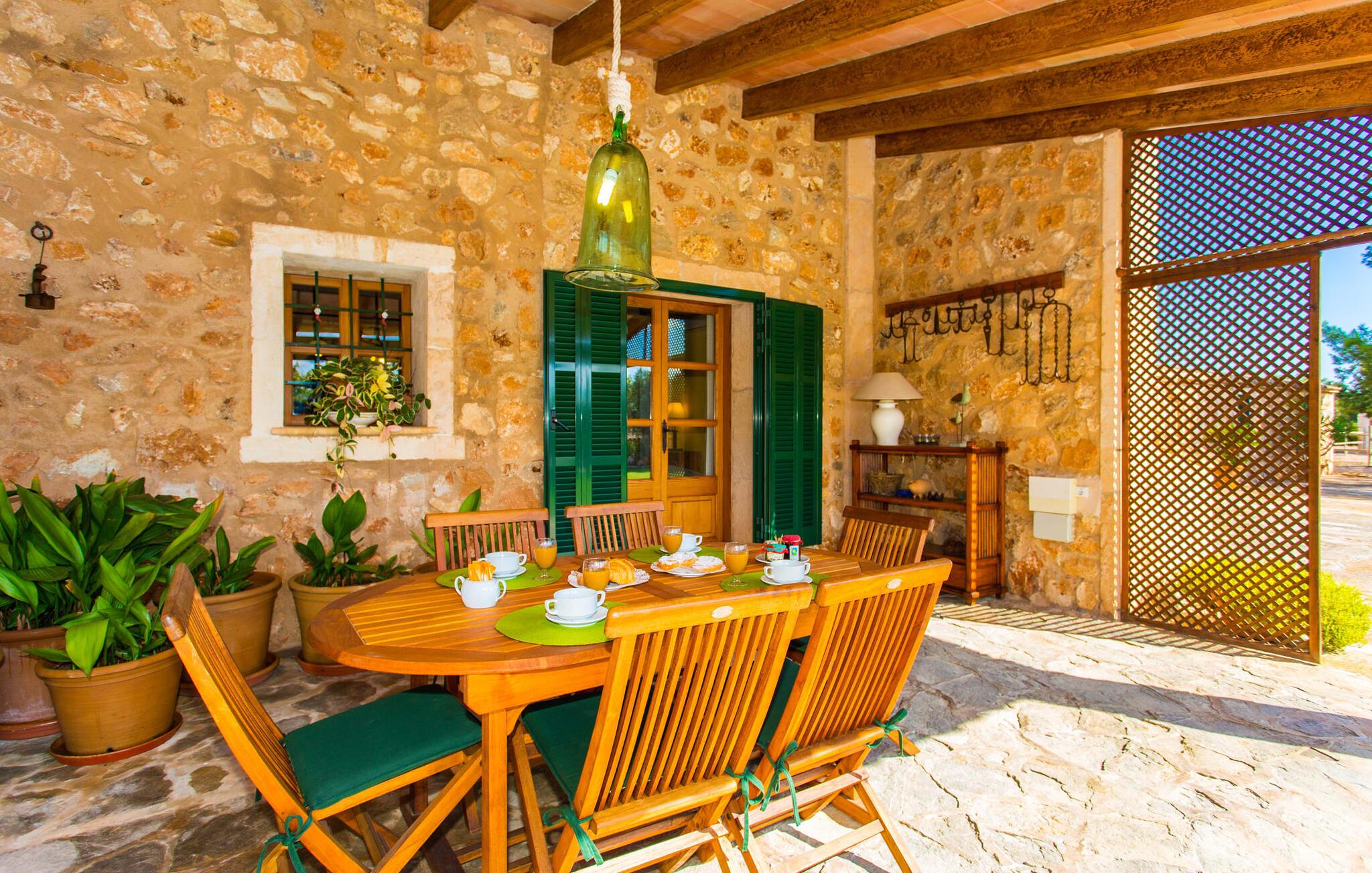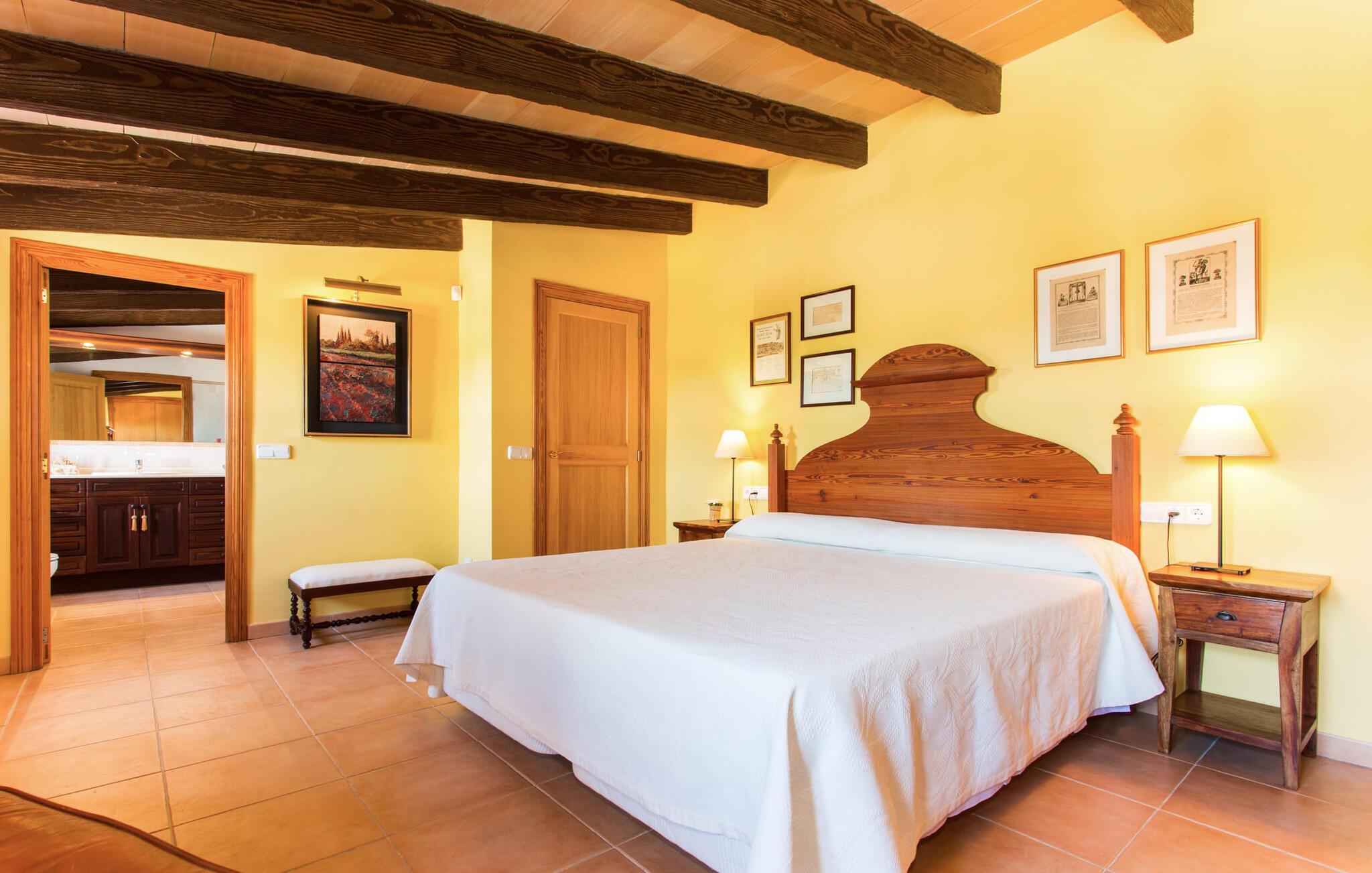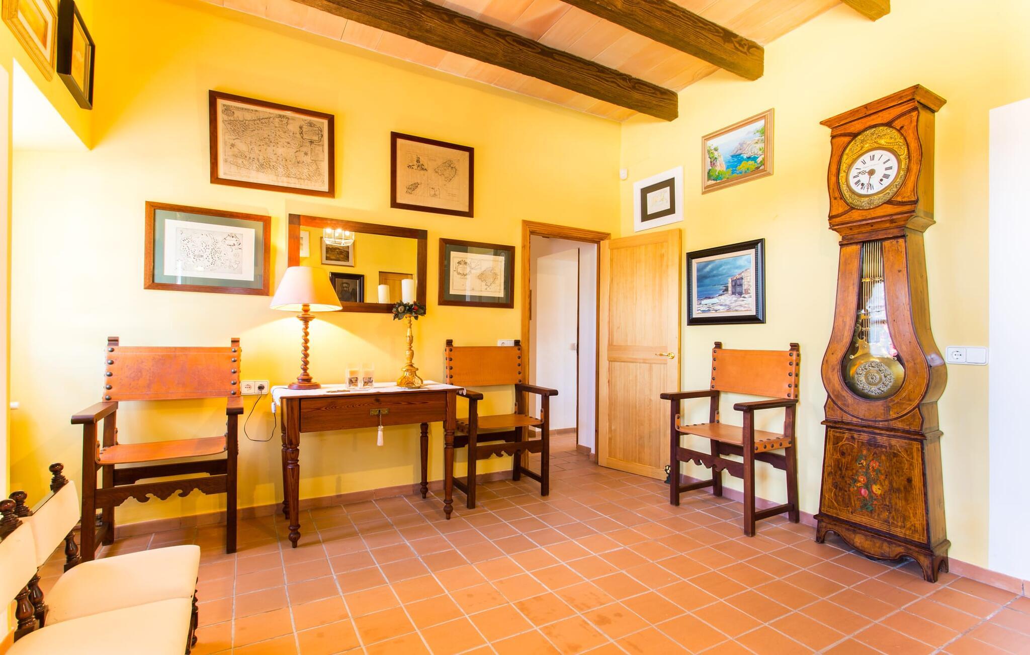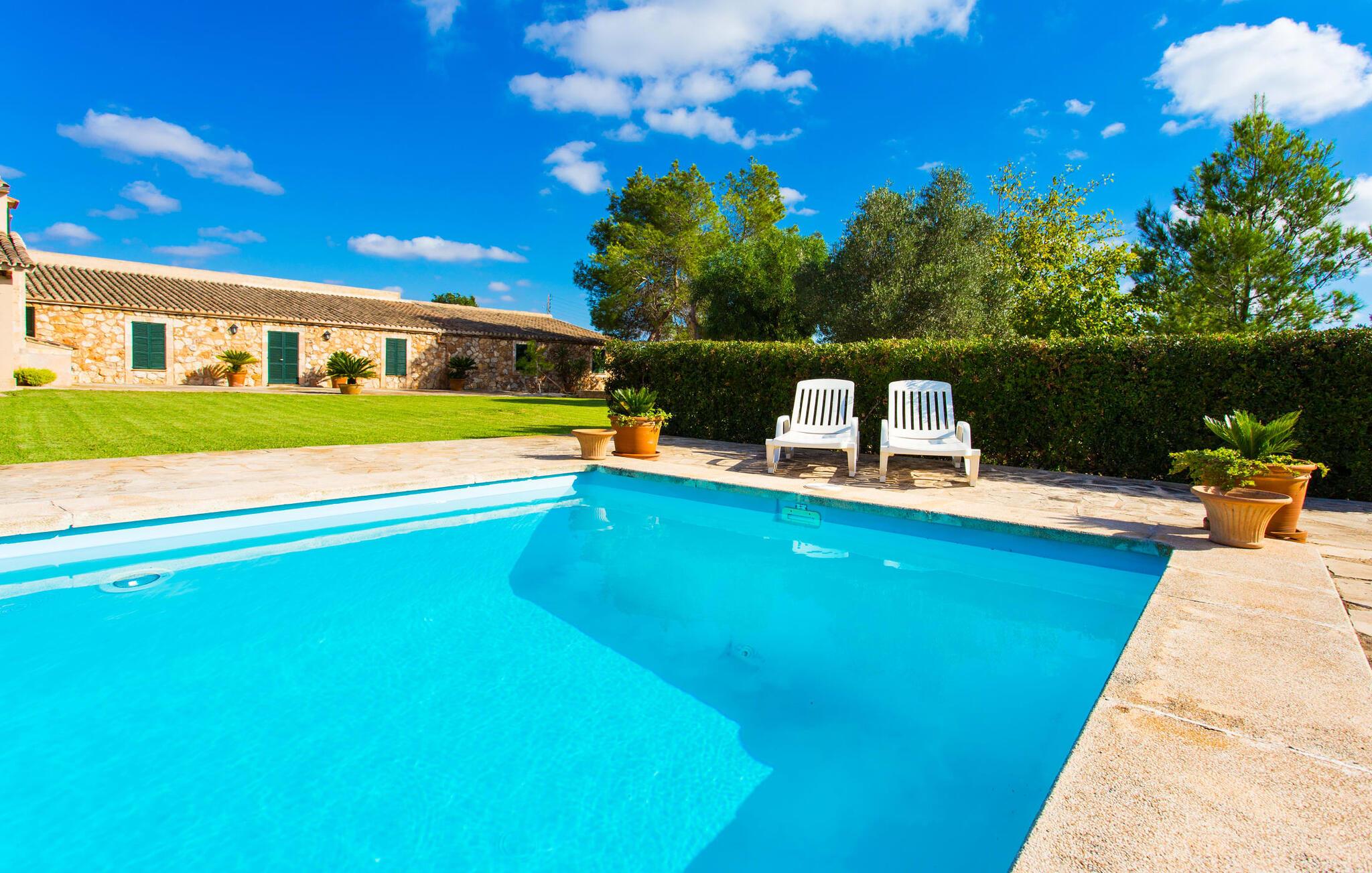 Har I altid drømt om en afslappende ferie i rolige omgivelser, en landlig idyl og nem adgang til de typiske østrande? Så er villaen "Son Viquet" lige noget for jer! I kan forvente en yderst hyggelig, kærligt møbleret atmosfære og en behagelig forbindelse til bekvemt forbundne områder. Den private ejendom er beliggende i en tyndt befolket villaregion og er let tilgængelig via asfalteret vej. En stor og velholdt have byder på en stor velkomst og inviterer til at gå på opdagelse i omgivelserne. Mange palmer og andre middelhavsplanter dekorerer rummene og skaber en fortryllende atmosfære, hvor I vil nyde at tilbringe tid. En hængekøje tilføjer til den indbydende atmosfære. Der er endda et fodboldmål for unge og gamle spillere. Det 10 m store bassin, som nemt kan nås via en halvcirkelformet trappe, giver den nødvendige forfriskning på varme sommerdage: Svøm om morgenen, svøm et par længder og nyd forfriskningen, der breder sig i hele jeres krop! Glem ikke at læse en god bog og nyde timers udendørs aktivitet eller under det smukke træloft med en drink inden for rækkevidde! En stor overdækket terrasse er placeret foran huset og har et spisebord med yderligere siddepladser: dette er det rigtige sted til morgenmad, hvor I kan sidde sammen og planlægge resten af dagen med udsigt til haven og den blå himmel . Men det er også hyggeligt at sidde her om aftenen, og hvis I tænder for grillen i tide, kan I fejre en kulinarisk BBQ sidst på dagen. En rustik, hyggelig atmosfære venter jer inde i villaen: traditionelle synlige bjælker, terracotta flisegulve og naturstenselementer på væggene skaber en individuel og meget hyggelig atmosfære. Brugen af diskrete, lyse farver understreger den indbydende effekt, det samme gør de nøje udvalgte antikke møbler og den klassiske udsmykning. I stueetagen er der et rummeligt køkken med en ø og et stort spisebord, der indbyder til at lave mad og spise sammen. Det lyst indrettede værelse er fuldt udstyret med ovn, komfur, køle/fryseskab kombination, mikroovn, opvaskemaskine, elkedel og filterkaffemaskine og giver derfor et godt grundlag for selvstændig selvforsyning. Find jeres personlige yndlingssted i den hyggelige stue med et separat læsehjørne under trappen og nyd afslapningsstunderne – pejsen er ikke i brug, men skaber stadig en hjemlig atmosfære. På dette niveau er der også et badeværelse med badekar, mens der på øverste etage er tre separate soveværelser, alle med gule vægge og yderligere to rummelige badeværelser, et af dem en-suite. Til en afslappende nat er der to 1,80 x 2,00 m senge og to 0,90 m x 2,00 m senge til rådighed. Et strygejern og to hårtørrere er tilgængelige på stedet, og I behøver ikke at tage dem med jer - det sparer plads i jeres kuffert! Campos selv er en ret fredelig by, men den er meget livlig på markedsdage (torsdage og lørdage). Udover regionale landbrugsprodukter som frugt og grønt tilbydes der også andre ting som souvenirs. Havneområdet i den tidligere fiskerby Colonia de Sant Jordi (21 km) er meget indbydende, måske vil I tage et kig? Hvis I elsker en badeferie, er denne villa det rigtige sted for dig: de indbydende strande på sydøstkysten, herunder den familievenlige Es Trenc strand, er nemme at nå med en lejebil. Den rummelige villa "Son Viquet" er beliggende i landlige omgivelser på en malerisk ejendom, kun 10 minutter i bil øst for Campos. I Campos finder I barer, restauranter og butikker til jeres daglige behov. Køreturen til Mallorcas sydlige strande er ikke langt fra dette feriehus. Mallorcas livlige hovedstad Palma kan nås på omkring 40 minutter i bil.