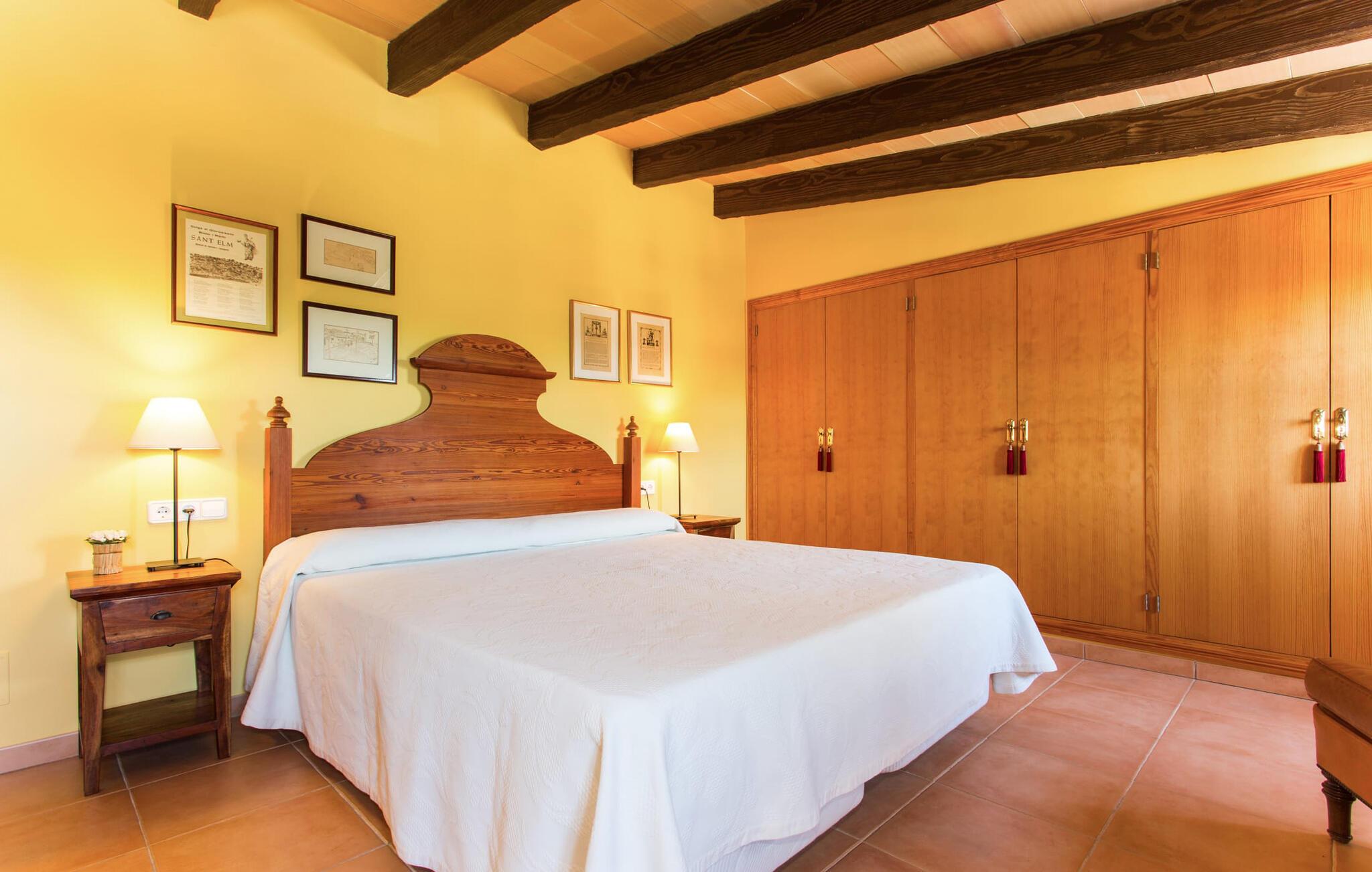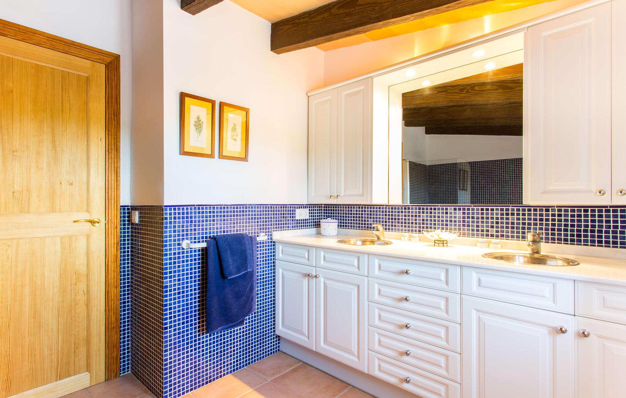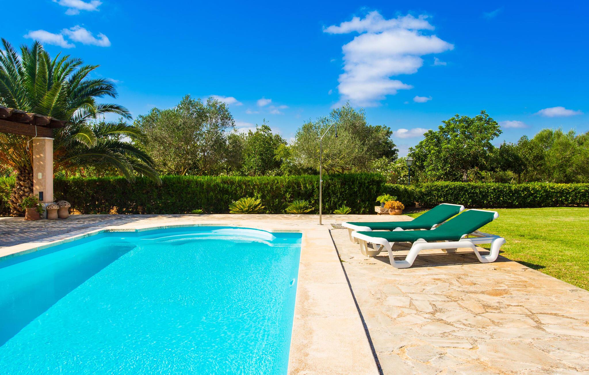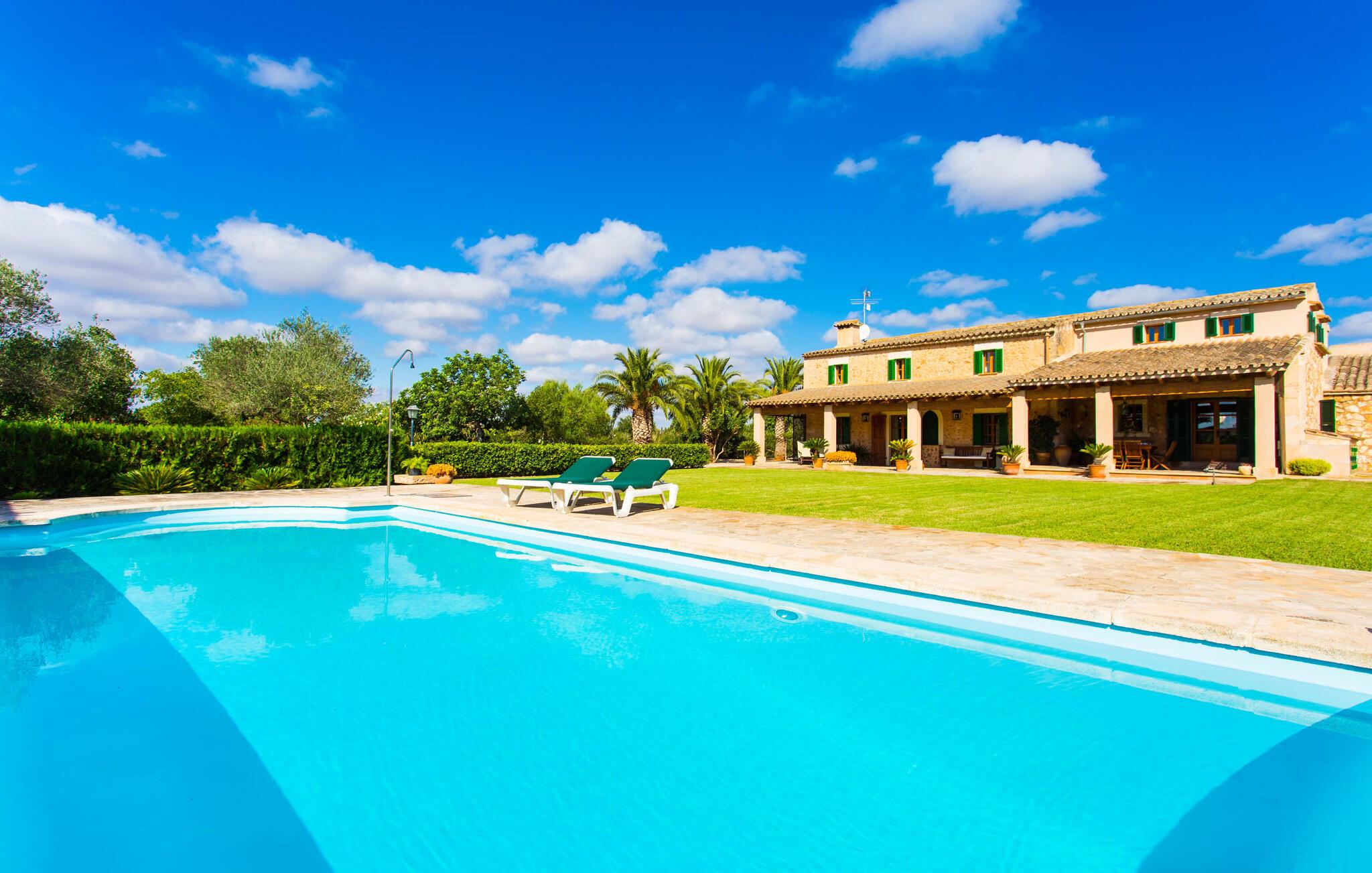 Har I altid drømt om en afslappende ferie i rolige omgivelser, en landlig idyl og nem adgang til de typiske østrande? Så er villaen "Son Viquet" lige noget for jer! I kan forvente en yderst hyggelig, kærligt møbleret atmosfære og en behagelig forbindelse til bekvemt forbundne områder. Den private ejendom er beliggende i en tyndt befolket villaregion og er let tilgængelig via asfalteret vej. En stor og velholdt have byder på en stor velkomst og inviterer til at gå på opdagelse i omgivelserne. Mange palmer og andre middelhavsplanter dekorerer rummene og skaber en fortryllende atmosfære, hvor I vil nyde at tilbringe tid. En hængekøje tilføjer til den indbydende atmosfære. Der er endda et fodboldmål for unge og gamle spillere. Det 10 m store bassin, som nemt kan nås via en halvcirkelformet trappe, giver den nødvendige forfriskning på varme sommerdage: Svøm om morgenen, svøm et par længder og nyd forfriskningen, der breder sig i hele jeres krop! Glem ikke at læse en god bog og nyde timers udendørs aktivitet eller under det smukke træloft med en drink inden for rækkevidde! En stor overdækket terrasse er placeret foran huset og har et spisebord med yderligere siddepladser: dette er det rigtige sted til morgenmad, hvor I kan sidde sammen og planlægge resten af dagen med udsigt til haven og den blå himmel . Men det er også hyggeligt at sidde her om aftenen, og hvis I tænder for grillen i tide, kan I fejre en kulinarisk BBQ sidst på dagen. En rustik, hyggelig atmosfære venter jer inde i villaen: traditionelle synlige bjælker, terracotta flisegulve og naturstenselementer på væggene skaber en individuel og meget hyggelig atmosfære. Brugen af diskrete, lyse farver understreger den indbydende effekt, det samme gør de nøje udvalgte antikke møbler og den klassiske udsmykning. I stueetagen er der et rummeligt køkken med en ø og et stort spisebord, der indbyder til at lave mad og spise sammen. Det lyst indrettede værelse er fuldt udstyret med ovn, komfur, køle/fryseskab kombination, mikroovn, opvaskemaskine, elkedel og filterkaffemaskine og giver derfor et godt grundlag for selvstændig selvforsyning. Find jeres personlige yndlingssted i den hyggelige stue med et separat læsehjørne under trappen og nyd afslapningsstunderne – pejsen er ikke i brug, men skaber stadig en hjemlig atmosfære. På dette niveau er der også et badeværelse med badekar, mens der på øverste etage er tre separate soveværelser, alle med gule vægge og yderligere to rummelige badeværelser, et af dem en-suite. Til en afslappende nat er der to 1,80 x 2,00 m senge og to 0,90 m x 2,00 m senge til rådighed. Et strygejern og to hårtørrere er tilgængelige på stedet, og I behøver ikke at tage dem med jer - det sparer plads i jeres kuffert! Campos selv er en ret fredelig by, men den er meget livlig på markedsdage (torsdage og lørdage). Udover regionale landbrugsprodukter som frugt og grønt tilbydes der også andre ting som souvenirs. Havneområdet i den tidligere fiskerby Colonia de Sant Jordi (21 km) er meget indbydende, måske vil I tage et kig? Hvis I elsker en badeferie, er denne villa det rigtige sted for dig: de indbydende strande på sydøstkysten, herunder den familievenlige Es Trenc strand, er nemme at nå med en lejebil. Den rummelige villa "Son Viquet" er beliggende i landlige omgivelser på en malerisk ejendom, kun 10 minutter i bil øst for Campos. I Campos finder I barer, restauranter og butikker til jeres daglige behov. Køreturen til Mallorcas sydlige strande er ikke langt fra dette feriehus. Mallorcas livlige hovedstad Palma kan nås på omkring 40 minutter i bil.