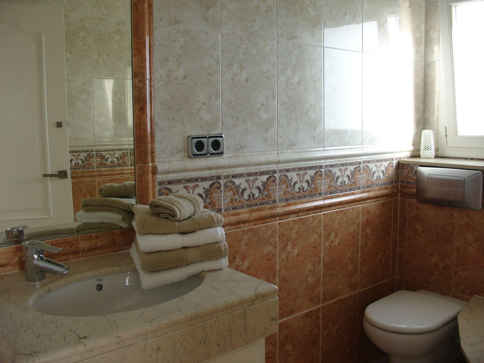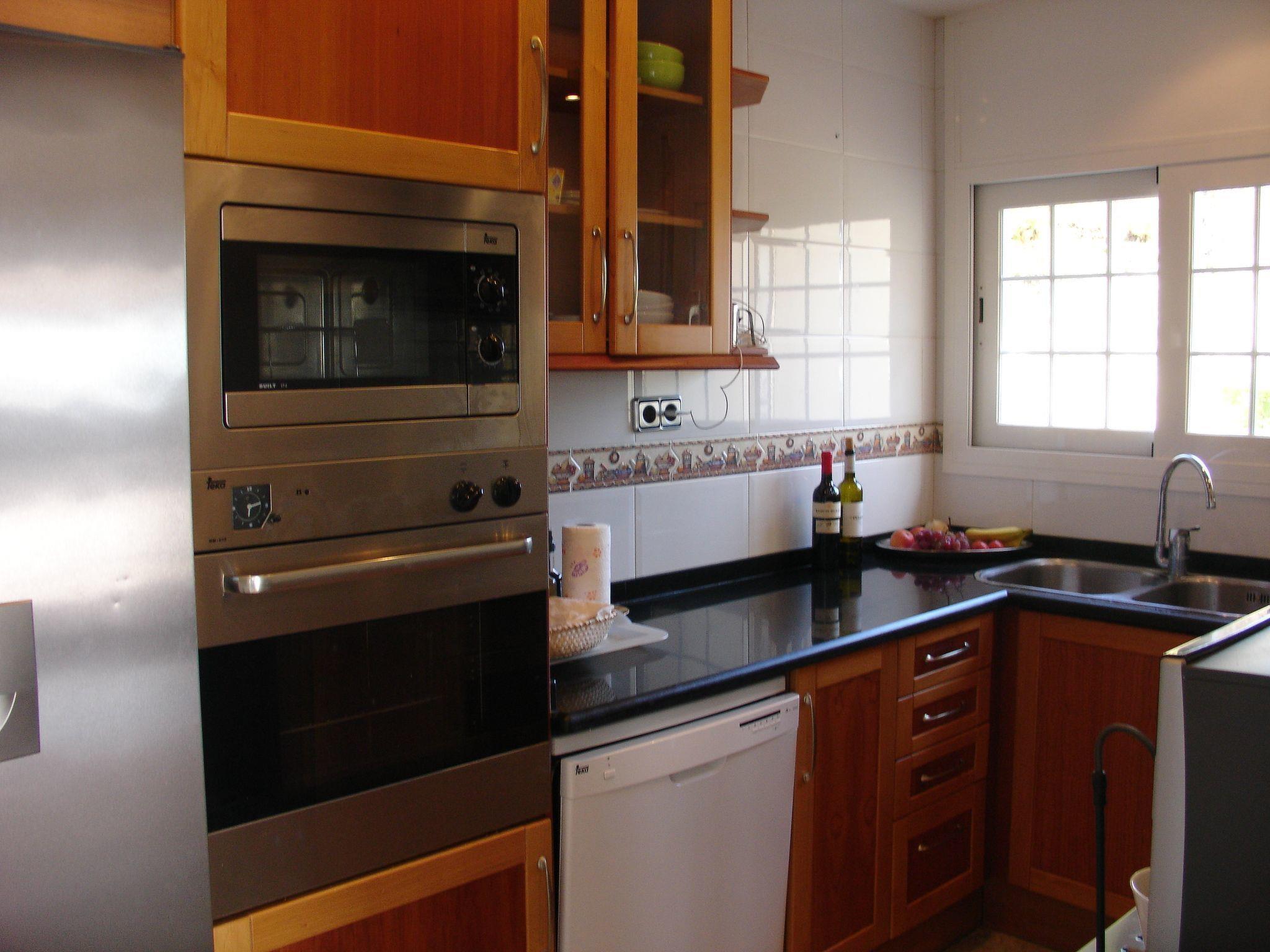 - With a living space of approx. 100 m², this accommodation offers enough space for a maximum of five people. The living/dining area has a sofa, an armchair, a satellite TV, a music system with Bluetooth reception and a dining table with seating for 5 people. The kitchen is fully equipped with an oven, a ceramic hob, a large fridge, a small freezer and a dishwasher, a microwave, a toaster, a kettle and a coffee machine, leaving nothing to be desired. In the first bedroom there is a double bed (1.80 m x 2.00 m, new), in the second bedroom a single bed (0.90 x 1.90 m) (extra bed possible on request) and the third bedroom has a king size bed (1.60 x 2.00 m) with adjoining bathroom, in which there is a whirlpool bath, (currently not to be used due to water shortage 4/2014) a toilet, a washbasin and a hairdryer. The features of the second bathroom include a shower, WC, washbasin and hairdryer. The bathrooms both have windows. Heating (only in winter) and free WiFi are available in all rooms of the house. New air conditioning units have been installed in the living room and the upper balcony bedroom. (2022). Due to the stairs, the house is not necessarily suitable for children under 7 years of age. Please enquire with us.