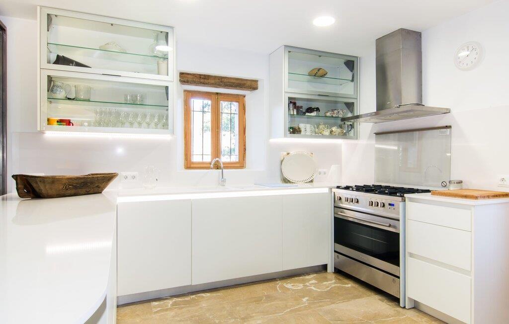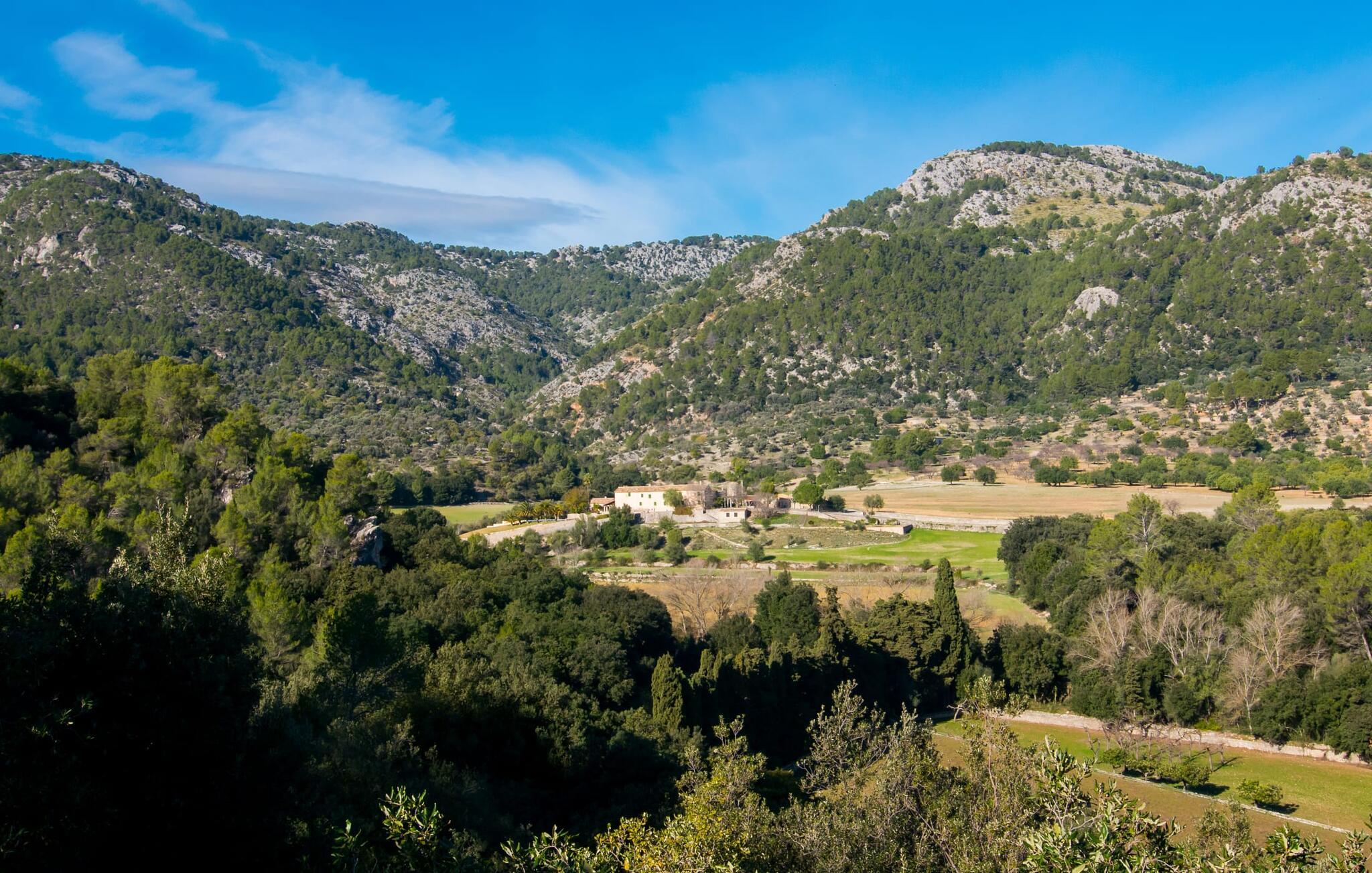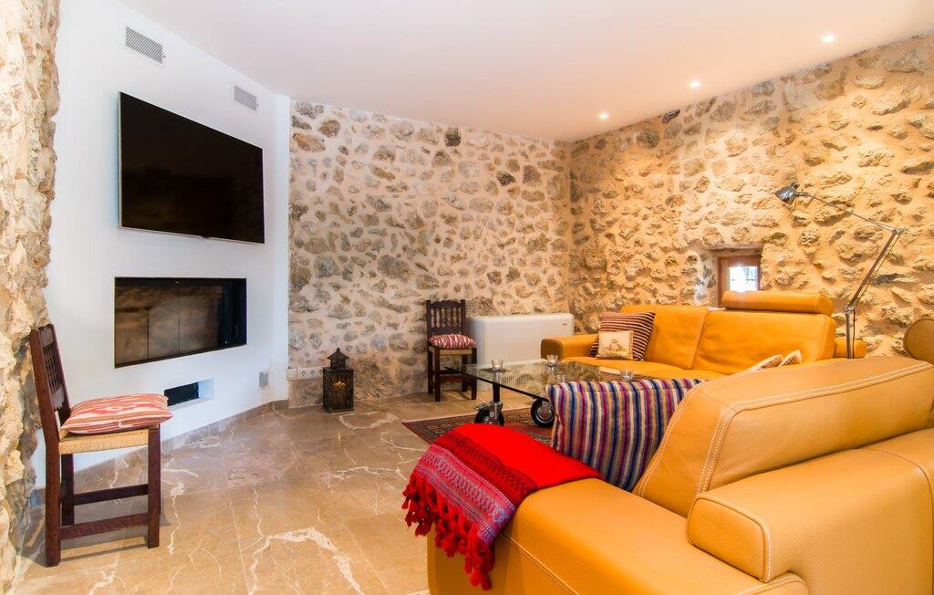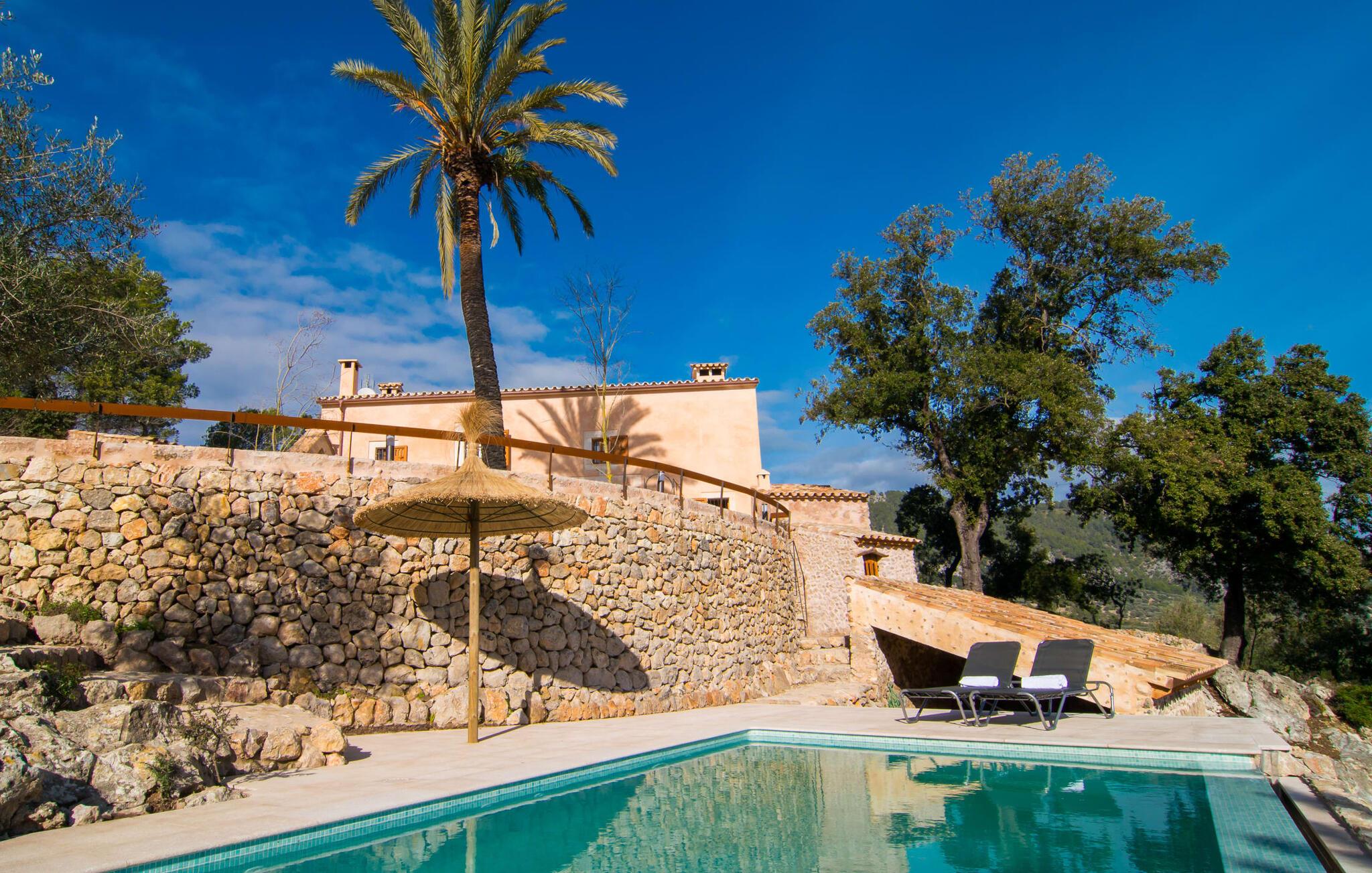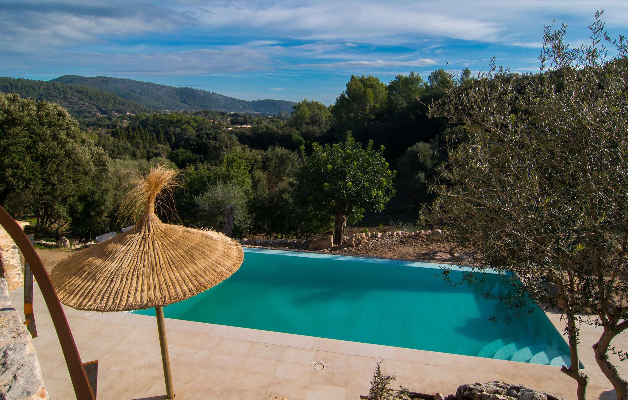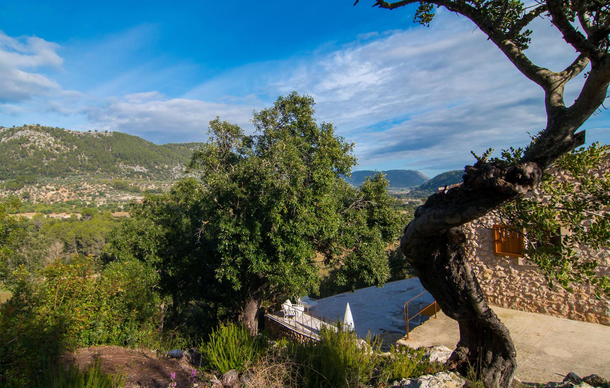 Denne ejendom efterlader gæsterne intet andet valg end at undre sig. Den unikke beliggenhed af denne ejendom samt dens førsteklasses faciliteter gør den til en af de mest eksklusive villaer i vores portefølje. Det er beliggende i den nordlige del af øen, på en 200.000 m² stor grund ved foden af de østlige Tramuntana-bjerge. Udsigten over den bakkede og grønne natur fra den afsides beliggenhed er betagende. Den utrolige infinity-pool udgør midtpunktet i udendørsområdet. Adgang er via en rustik stentrappe med en omsluttende terrasse med vidunderlig, vidstrakt udsigt. Det smelter harmonisk ind i den omgivende natur. Mellem forfriskende svømmebassiner kan I slappe af på liggestolene af hjertens lyst og måske slukke for en stund og lave ingenting - I er trods alt på ferie. En solid parasol vil beskytte jer, hvis UV-strålerne bliver for stærke. Over poolområdet er det store, gårdlignende rum foran huset, som har et majestætisk udseende takket være de høje palmer. Selve terrasseområdet er på bagsiden. Det gennemarbejdede gulvdesign og den naturlige husfacade med den originale indgang giver en unik baggrund for ægte afslapning. Her kan I nyde jeres morgenmad under en dybblå himmel om morgenen – eller afslutte en dag fuld af ferieglæde om aftenen. Indersiden af huset vil fange gæsten lige så meget som ydersiden. Den kunstfærdigt designede glasdør fører jer ind i det åbne køkken, stue og spisestue. Køkkenet imponerer med sit ultramoderne design og eksklusive indretning. Den tilstødende spiseplads byder på plads nok til en sofistikeret middag for op til 10 personer. Et hyggeligt sofahjørne bagved inviterer jer til at slappe af. Det meget store fladskærms-tv har satellitforbindelse, så I kan blive underholdt med en god film, som I lyster. Et andet rustikt opholdsområde ved den åbne pejs giver yderligere muligheder for at tilbringe en hyggelig aften med vennerne. Den vellykkede kombination af moderne og klassiske elementer samt naturstenselementer og udvalgte individuelle dekorationer skaber en fortryllende stemning i disse opholdsrum, der inviterer jer til at blive hængende. Soveværelserne er på hver deres måde små luksusoaser med individuelle og særligt æstetiske accenter. Det imponerende gulv-, væg- og loftdesign er lige så imponerende som de udvalgte møbler og den dygtige opstilling af de enkelte stykker. Næsten alle badeværelser har eget badeværelse, som alle kæmper om titlen som det smukkeste værelse i huset, mens de tilbyder de mest moderne bekvemmeligheder. Her finder I beslag af høj kvalitet i kombination med et meget moderne og ekstravagant design. Strygejern og hårtørrer fås selvfølgelig i huset, så I behøver ikke at tage dem med. Villaen "Tacaritx" tilbyder en række muligheder for udflugter i det omkringliggende område. "Convent de Santo Domingo" og "Museu Marti Vicenç" er blot to af mange populære udflugtsmål. Det mallorcanske samfund Pollença ligger omkring 18 km væk. Strandene og byen Port de Pollença ligger cirka 26 km væk. Afstanden til lufthavnen er 47 km. Den store villa "Tacaritx" er en smuk og luksuriøs ejendom, der opfylder de højeste krav. Villaens let forhøjede placering giver en uforlignelig udsigt over det omkringliggende Tramuntana-landskab. For jeres daglige indkøb skal I bare køre til Campanet. Mere omfattende shopping kan gøres i Pollença. Tag en vidunderlig aftentur og slentre langs den smukke havnefront i Port de Pollença.
