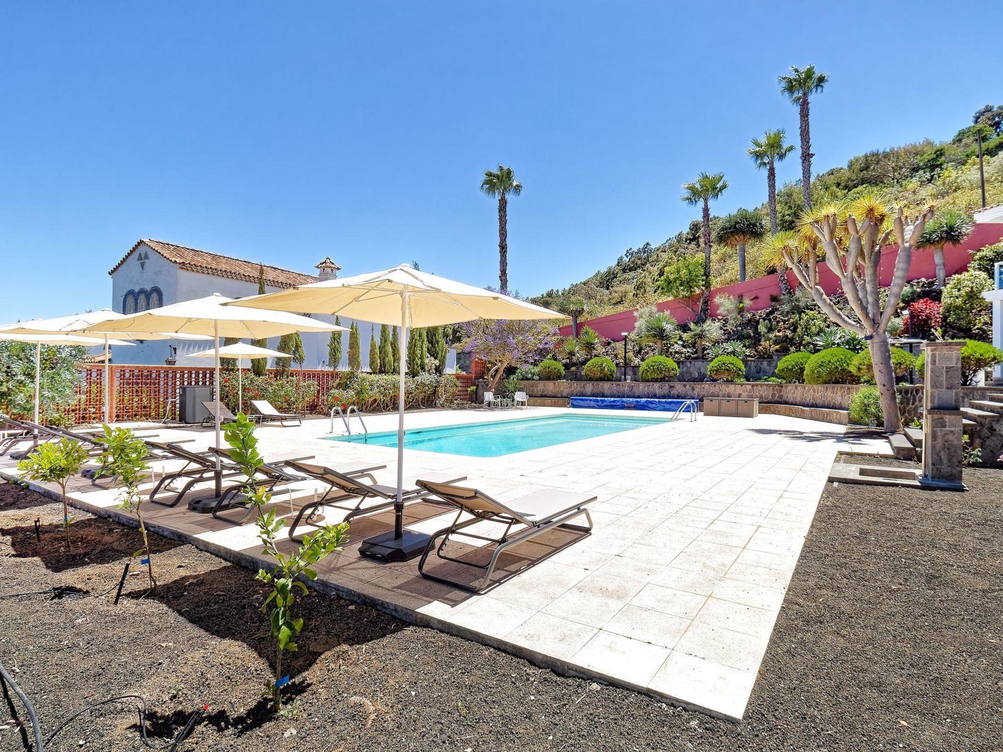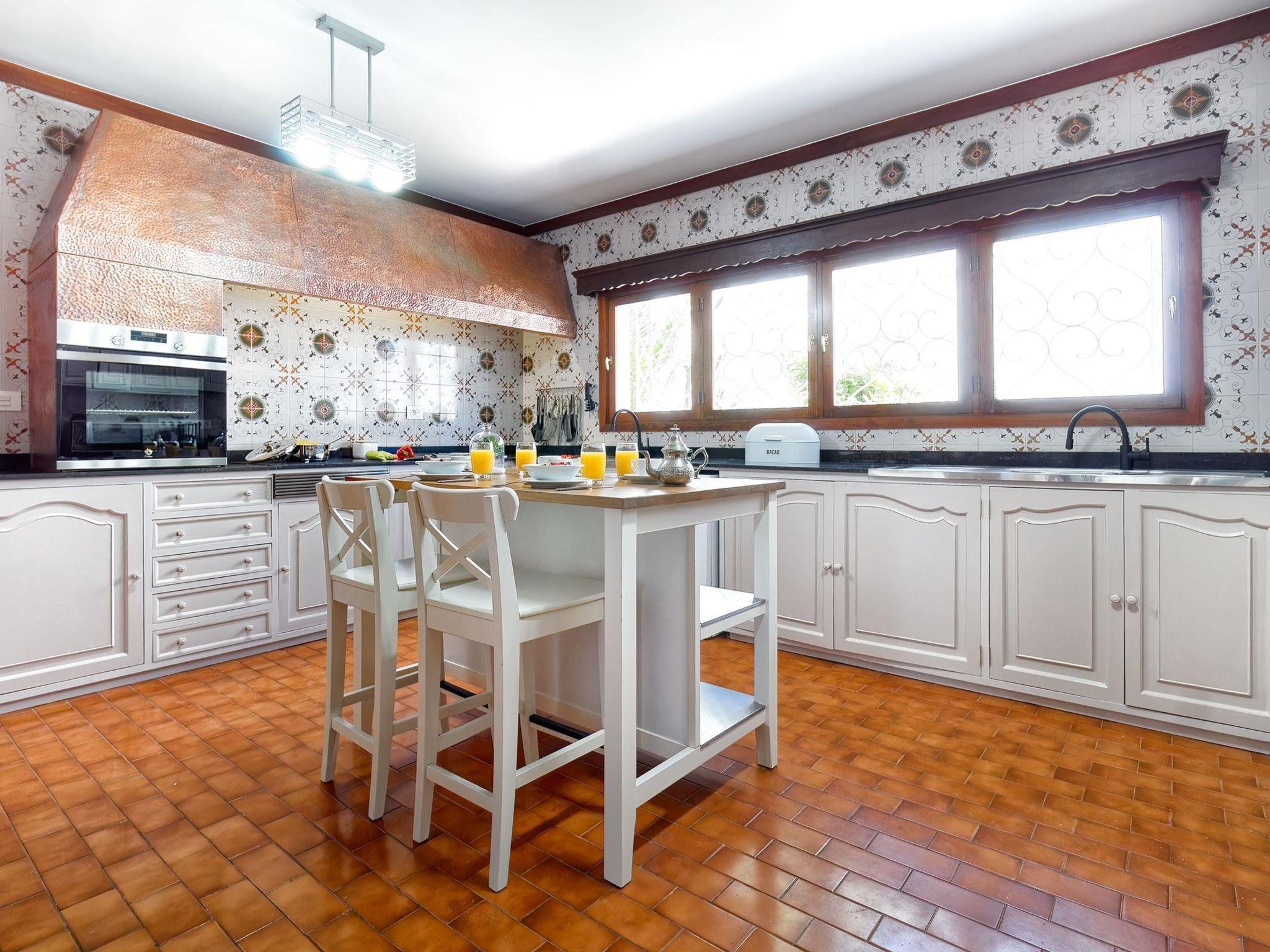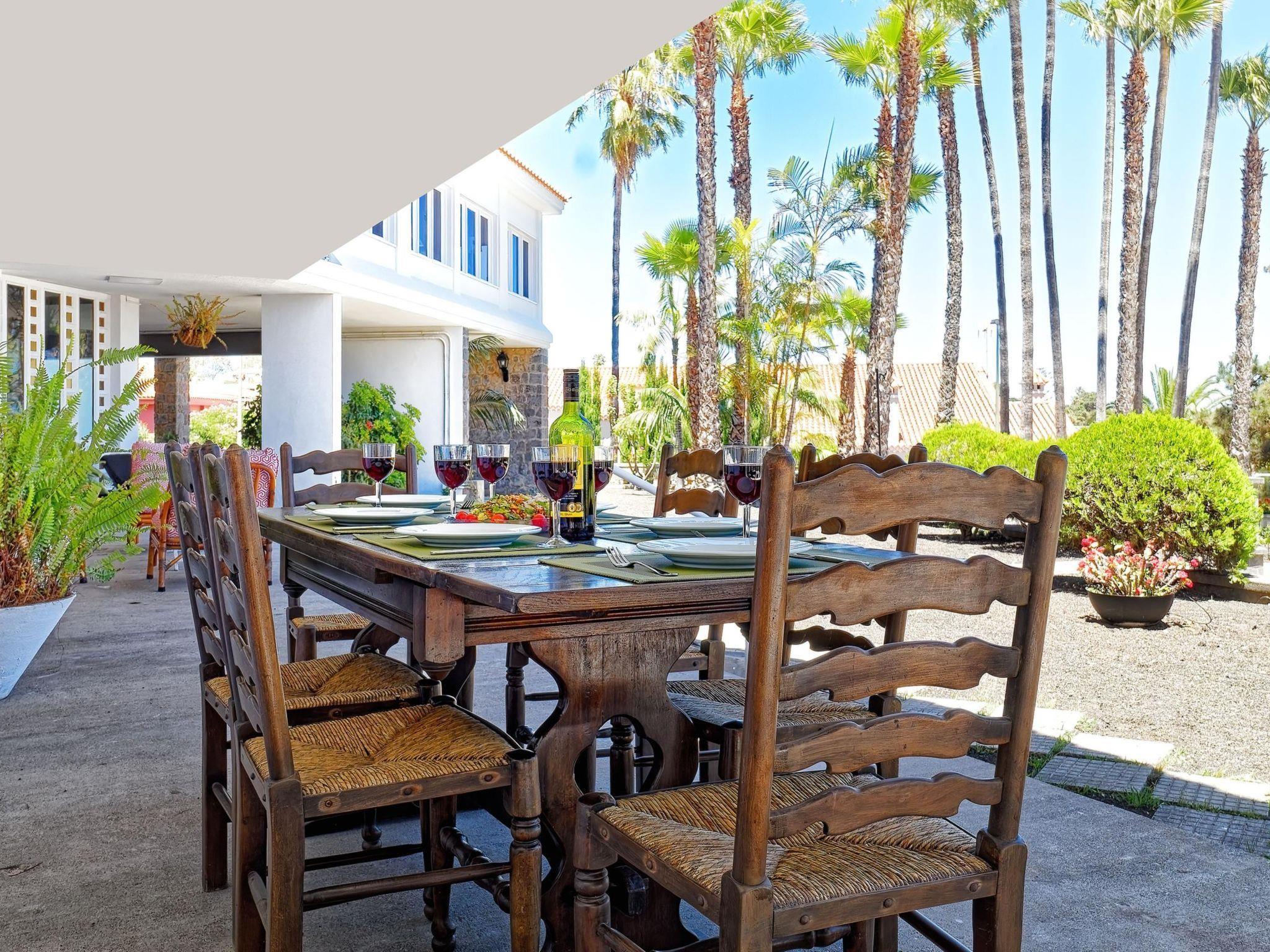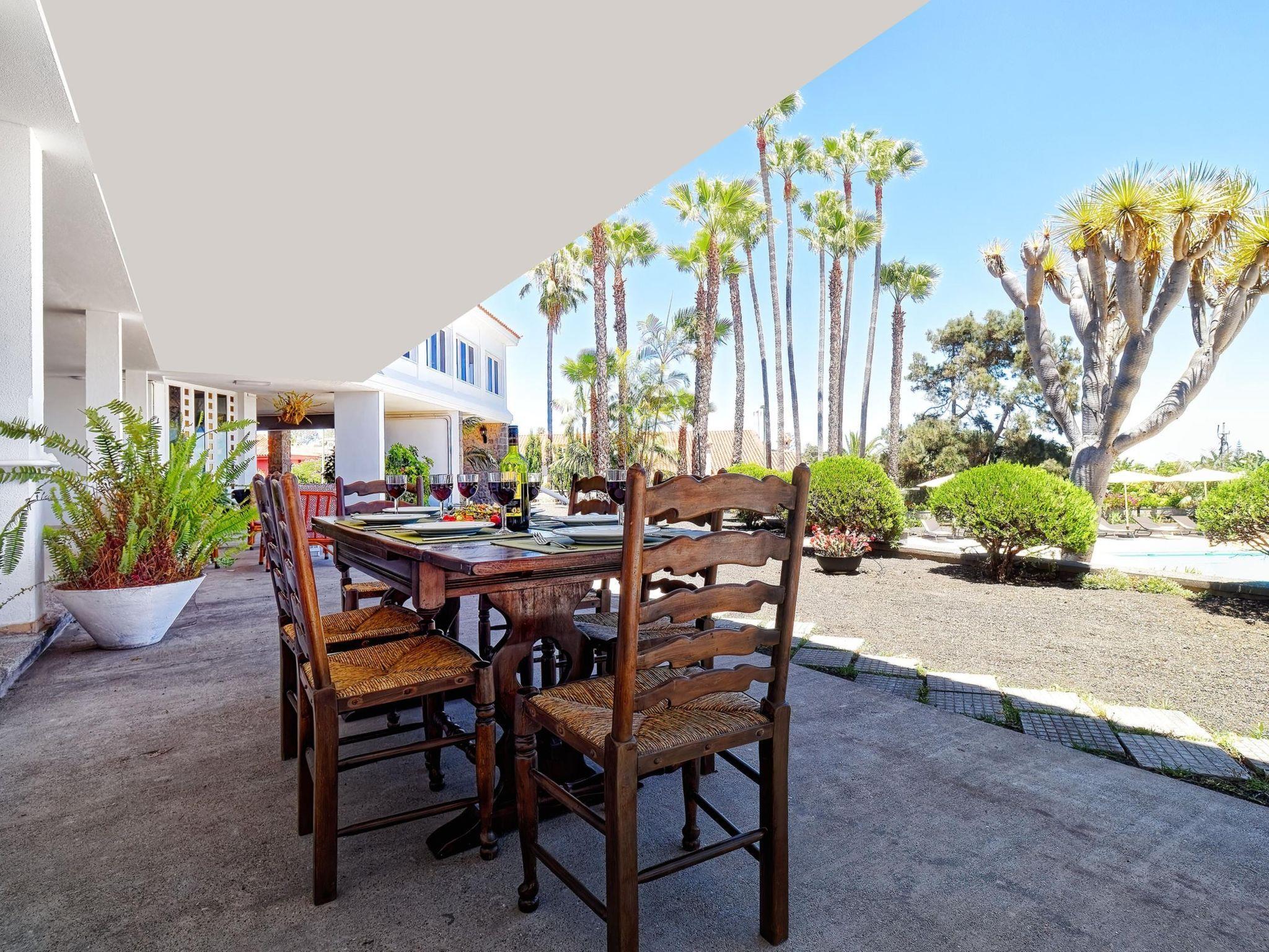 "La Ideal", 6-room house 500 m2. Rustic and antique furnishings: living/dining room with dining table, digital TV and air conditioning. Exit to the patio. 1 room with 1 french bed and bath/WC. 2 rooms, each room with 1 french bed. 2 rooms, each room with 2 beds and air conditioning. Kitchen (oven, dishwasher, 3 ceramic glass hob hotplates, toaster, kettle, microwave, freezer, electric coffee machine) with dining table. 2 showers/WC, sep. WC. Balcony, patio. Terrace furniture, balcony furniture, barbecue, deck chairs. View of the swimming pool and the garden. Facilities: washing machine, dryer, safe, iron, children's high chair, baby cot for up to 2 year olds, hair dryer. Internet (WiFi, free). Parking. Please note: non-smoking house. Maximum 1 pet/ dog allowed. 2023-T4717 // Reg. Nr.: ESFCTU0000350070007679150000000000000VV-35-1-00195689