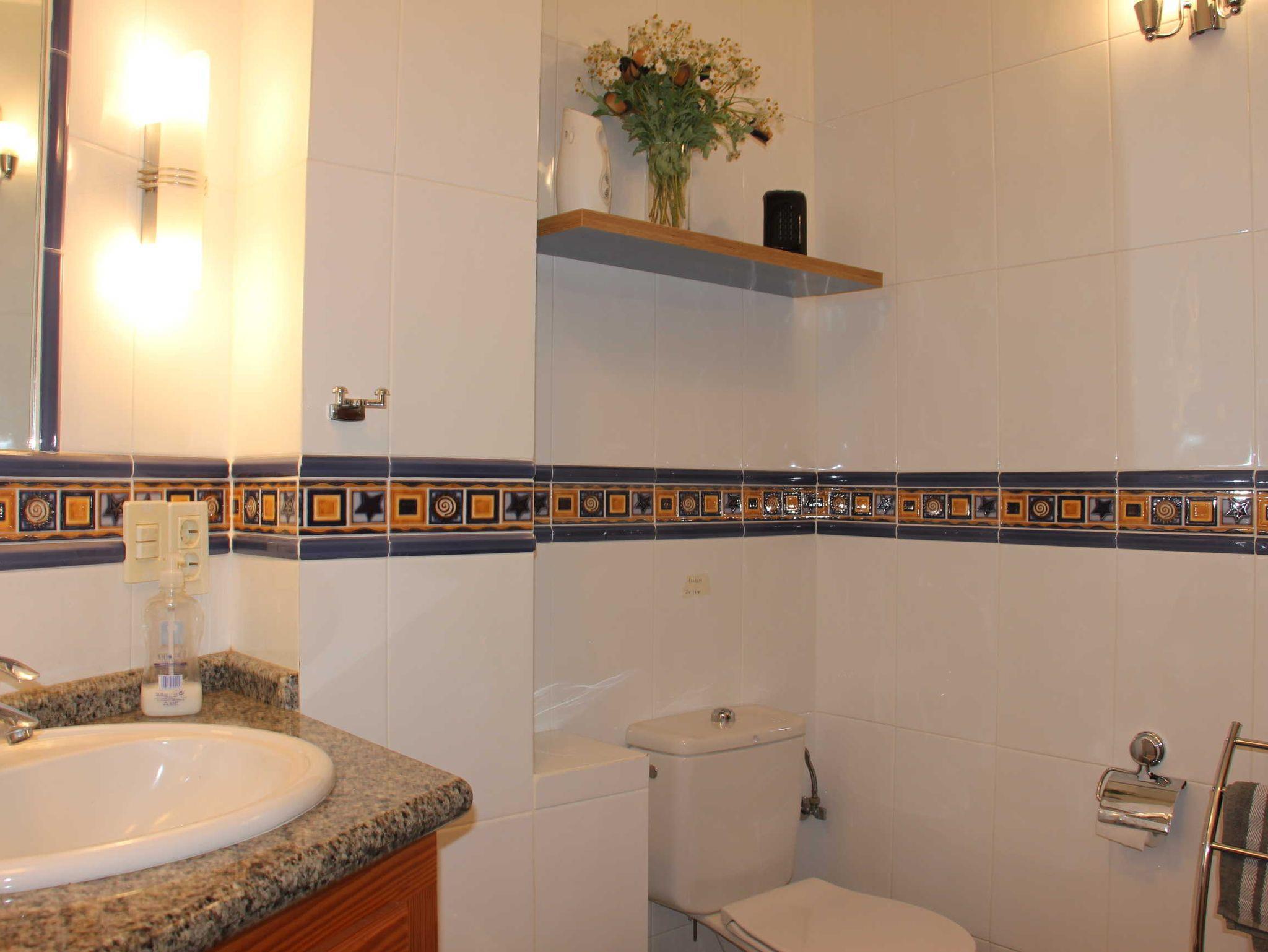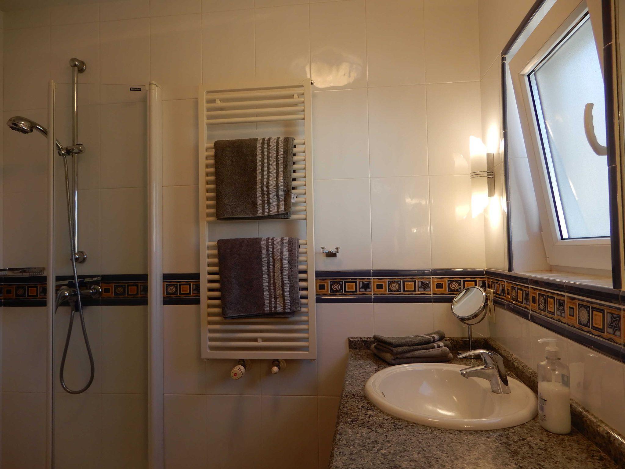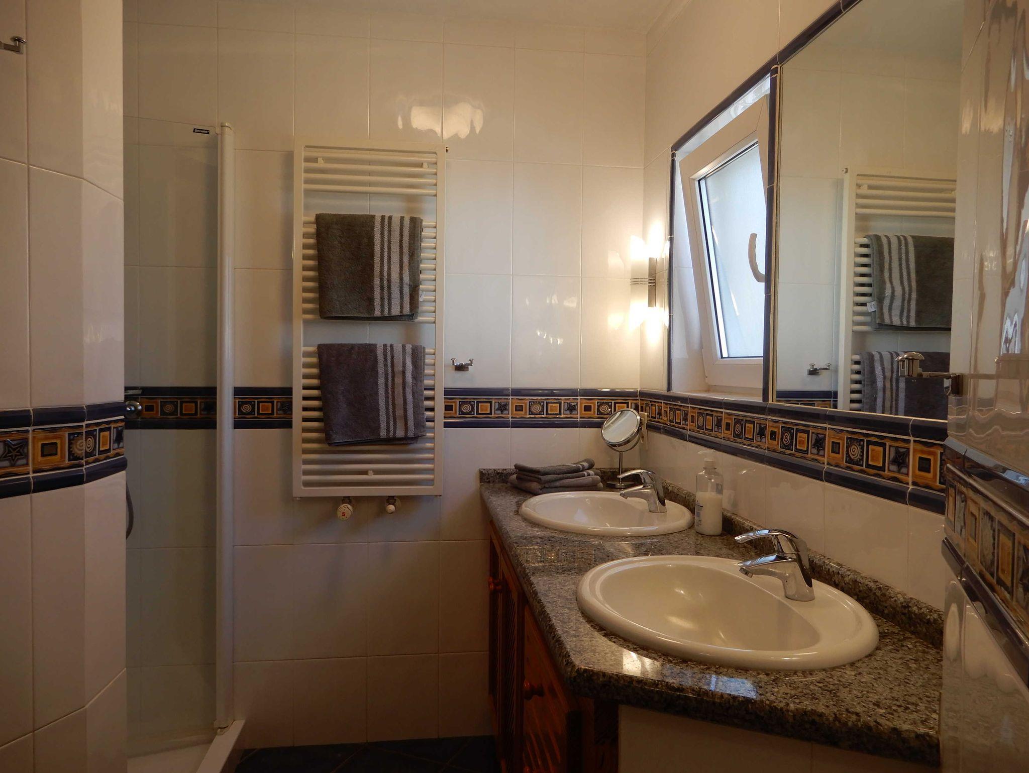 Das Bad ist mit einer Dusche, Toilette und zwei Waschtischen ausgestattet. Zusätzlich gibt es ein Gäste-WC.