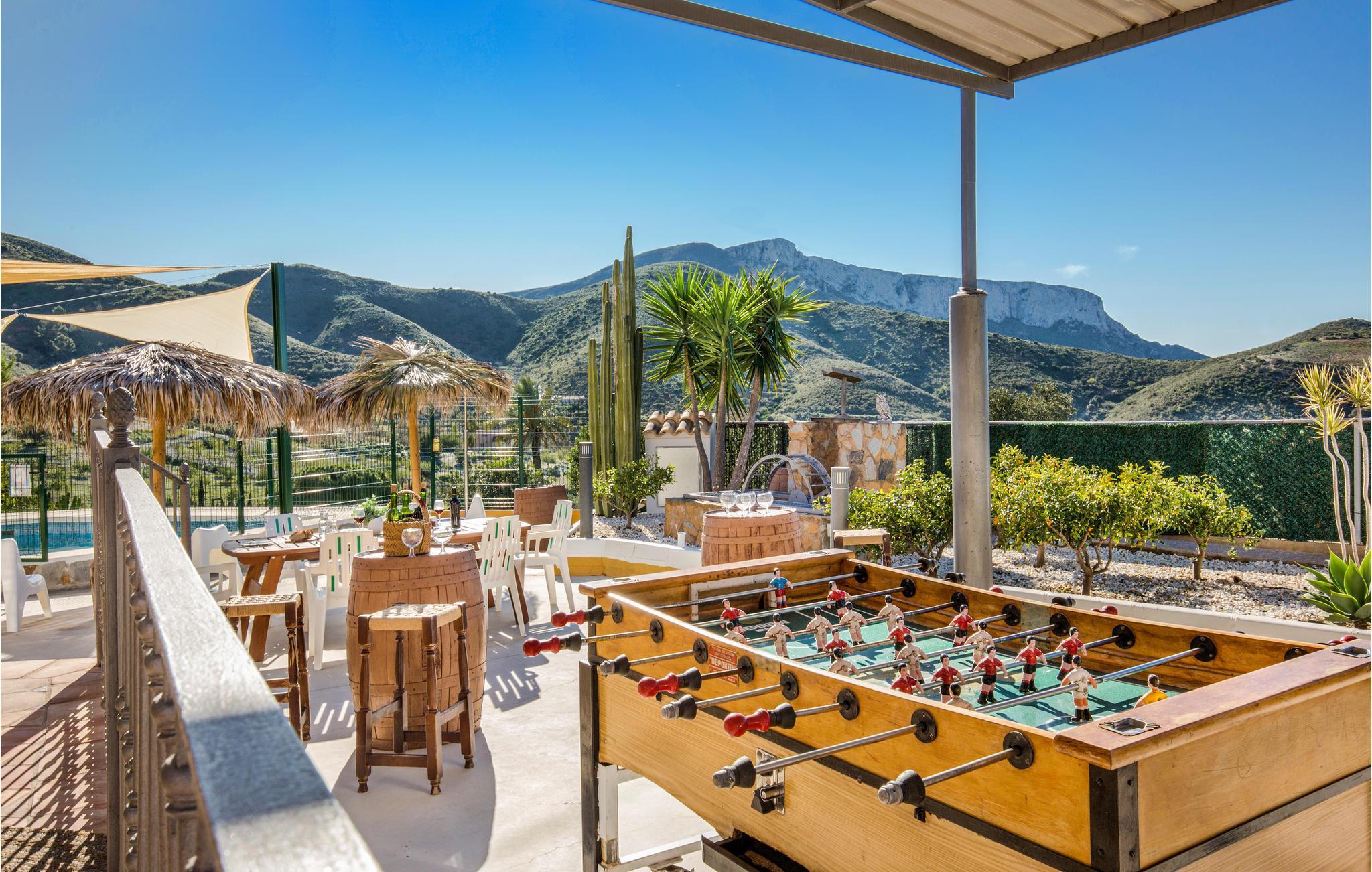 I feriehuset er der fire soveværelser, tre badeværelser, en bar, en stue i åben forbindelse med køkken og en kamin til de kølige vintermåneder. Der skal betales for brænde til kaminen.