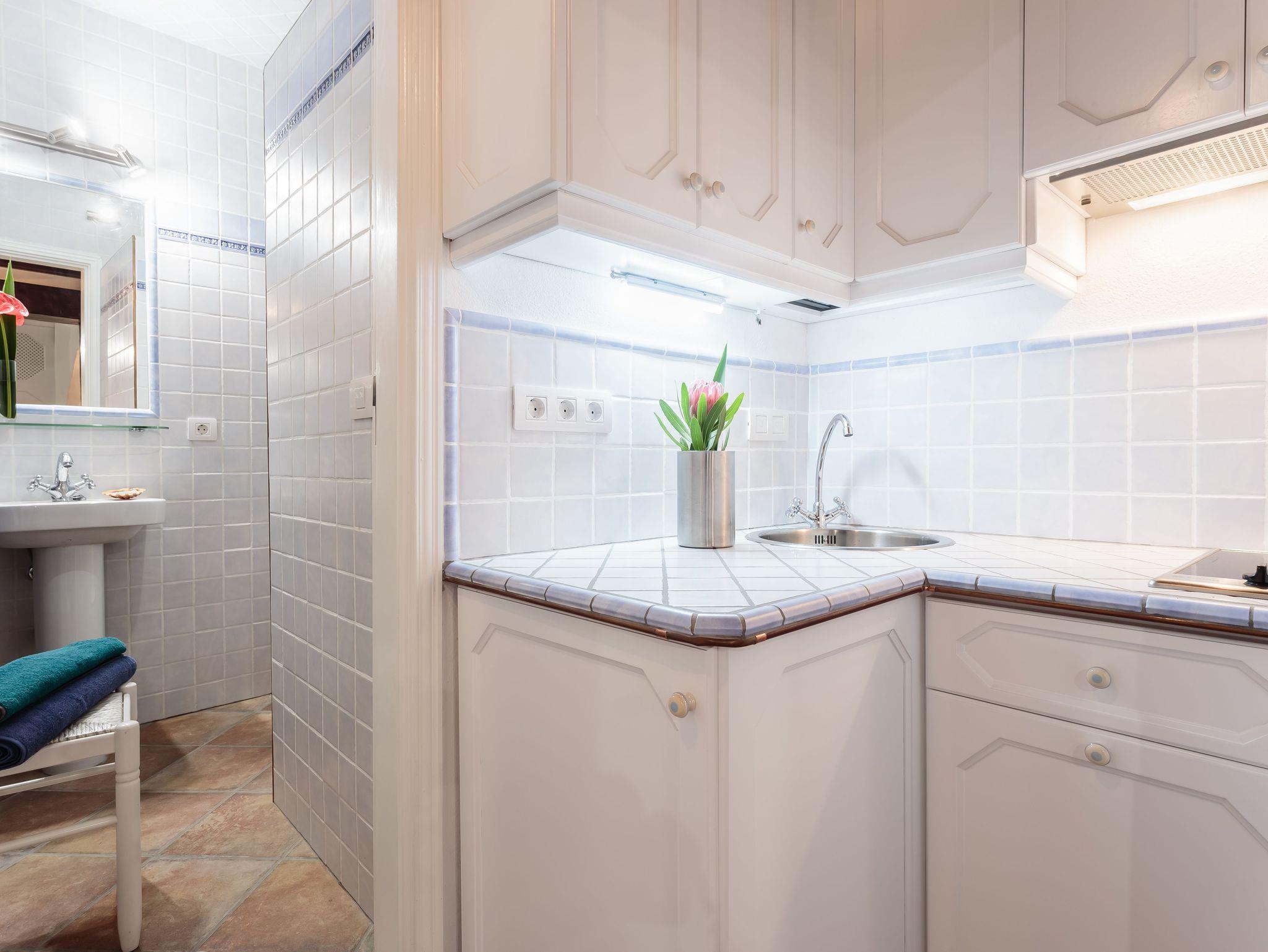 Tageslicht erhält das Studio nur durch ein kleines Fenster über der Tür, sowie Glasausschnitte in der authentischen Holzeingangstür, daher muss der Raum ergänzend meist auch tagsüber beleuchtet werden. Das Studio eignet sich am besten für Gäste, die viel Zeit im Freien verbringen möchten. Das fällt wegen der Strandnähe allerdings auch nicht schwer.