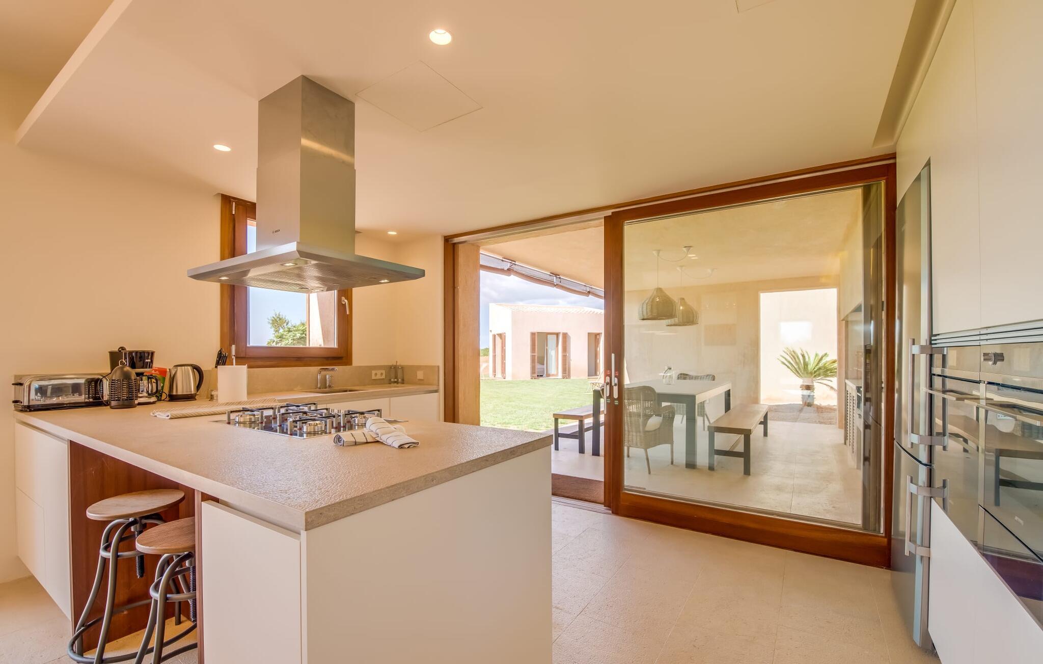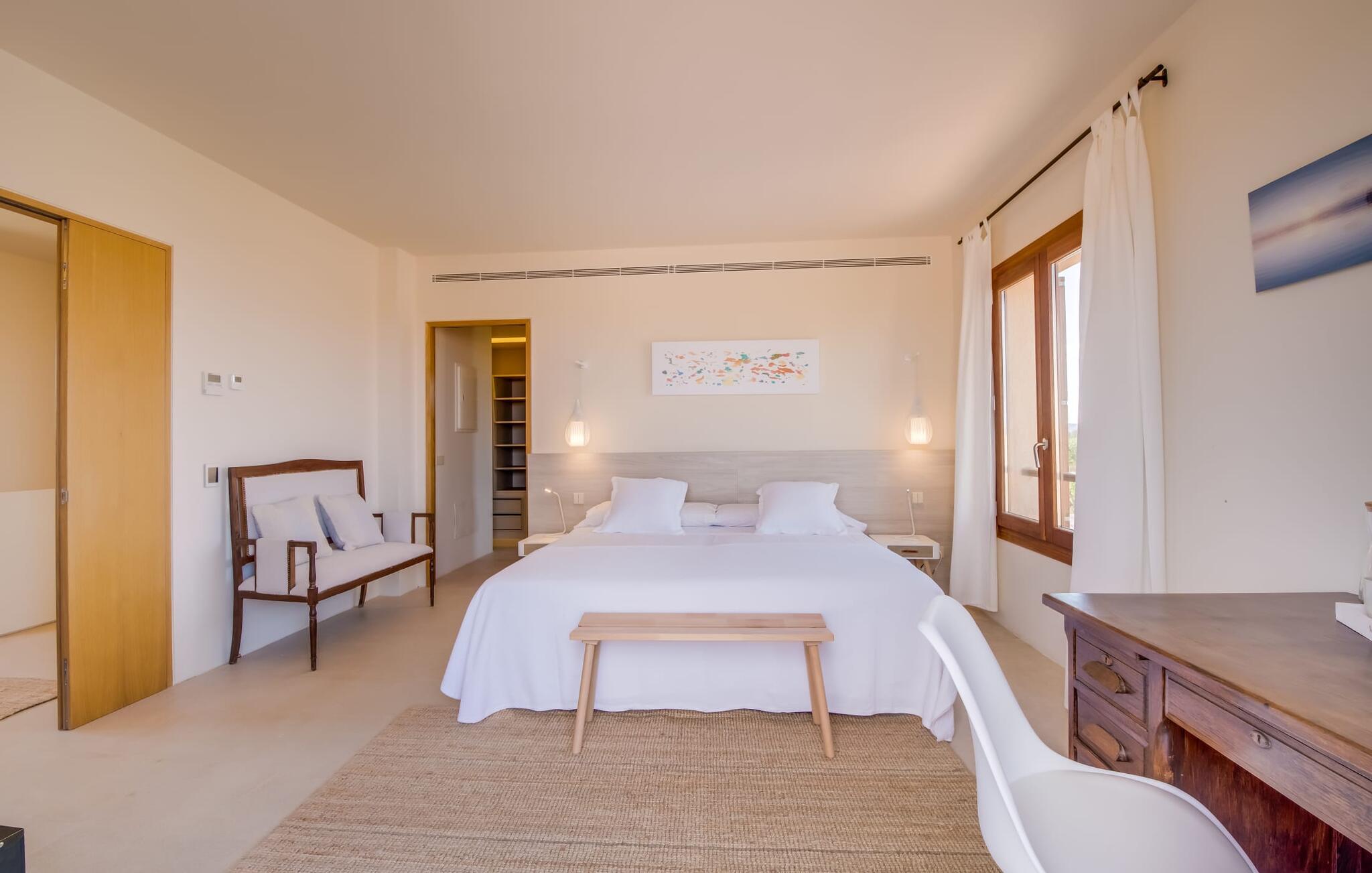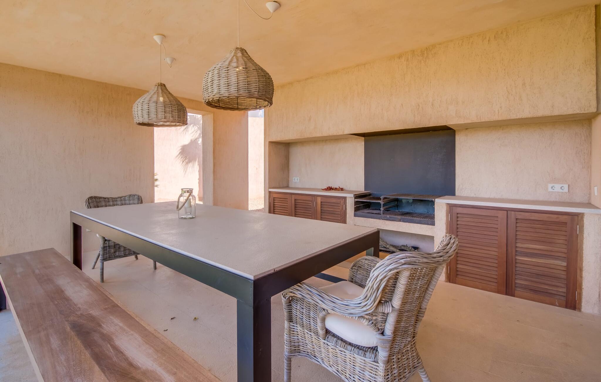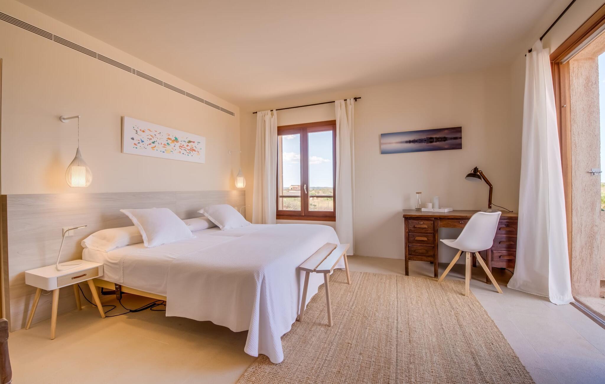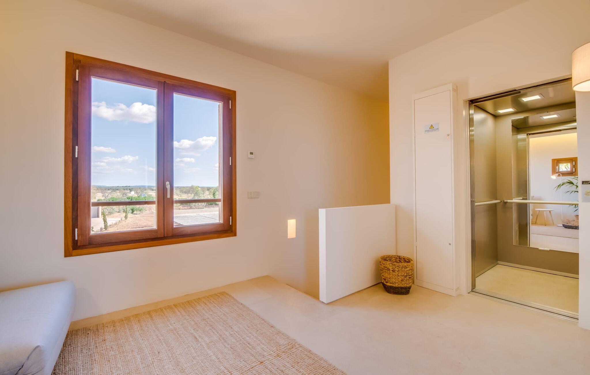 Midt mellem marker i den vidunderlige vidde af den sydlige del af øen vil I opdage den unikke villa "Thalassa d'Es Trenc". Ejendommen er opført i 2018 og imponerer med sin progressive æstetik, hvilket også afspejles i ejendommens udendørsareal. En have med græsplæner og en rummelig pool med børnevenlig dybde er omgivet af palmer. Under den overdækkede terrasse for enden af poolen kan I slappe af i komfortable siddepladser efter svømning eller vie jeres fulde opmærksomhed til solen på de indbydende liggestole. Der er en aflang veranda lige ved siden af bygningen. Morgenkaffe, morgenmad sammen på smagfulde udendørsmøbler eller hjemmelavet sangria om aftenen i den afslappede lounge – her finder I et skønt sted fuld af uhæmmet livsglæde på alle tider af døgnet. Der er terrasser foran de enkelte lejligheder og ikke at forglemme panoramaudsigten fra tagterrassen ved siden af det store soveværelse. Hvis jeres ideelle ferie involverer at lave lækre måltider med venner eller familie og også nyder at gøre det udendørs, så vil I elske den udendørs kabyss lige så meget som vi gør. Det er i bund og grund en forlængelse af det trendy og fuldt udstyrede indendørs køkken, som det har direkte adgang til. Det ser ud til, at arkitekten virkelig var opmærksom på hver detalje i dette imponerende attraktive landsted. "Form følger funktion": Denne bygning inkarnerer dette motto perfekt med sit puristiske udseende. Den lange bygnings lige linjer og rene former danner et hovedhus med en sidefløj, der rummer to separate atelierer med hver sit badeværelse. Studierne er forbundet med hovedhuset, men danner stadig selvstændige enheder med deres egne indgange, hvilket sikrer, at alle privatlivsbehov er opfyldt. Det unikke, minimalistiske interiørdesign i beroligende beige og hvide toner afspejles også i de tidløse, højkvalitetsmøbler lavet af bæredygtige materialer. Designet imponerer med sin enkle, men elegante karakter og er samtidig meget komfortabel. Sidst, men ikke mindst, har det træmøbler, en pejs og gulvvarme, hvilket gør huset til fremragende indkvartering selv i de køligere måneder af lavsæsonen. En elevator sikrer barrierefri adgang til soveværelset på øverste etage. De trendy badeværelser, som præsenterer en matchende, harmonisk lys farveskala, opfylder de samme krav og er udstyret med brusekabine. Afslapning er garanteret – ikke mindst på grund af det vidunderlige design og gennemtænkte arkitektur, der fik os til at forelske os i dette sted. Placeringen af villaen, hvis navn er en hyldest til den nærliggende drømmestrand med caribisk flair, er perfekt. Selv soldyrkere, der foretrækker at svømme nøgne, vil finde det perfekte sted i det fine sand i flere kilometer. På grund af villaens nærhed til landevejen, som indimellem er hørbar, kan I ekstremt hurtigt nå de omkringliggende indre byer og kystbyer og blive overrasket over mulighederne, lige fra turisttilbud til landlige landsbyer. Vores konklusion om "Thalassa d'Es Trenc": Mere end anbefalet og en absolut drømmeplacering, der hjælper jer med at undslippe hverdagens stress. Den nybyggede villa "Thalassa d'Es Trenc" imponerer med sin puristiske æstetik og et smukt udeområde. Det barrierefri hus ligger i den sydlige del af øen mellem Campos og kystbyen Ses Covetes, hvor I kan kombinere jeres shopping med et besøg på stranden. Denne premium ejendom skylder sit navn til sin nærhed til drømmebugten Es Trenc, som ligger omkring 4 km fra villaen. Vi anser denne bolig for tilgængelig for vores gæster med nedsat mobilitet, men vi opfordrer alle gæster til at overveje boligens egnethed baseret på deres egne krav.