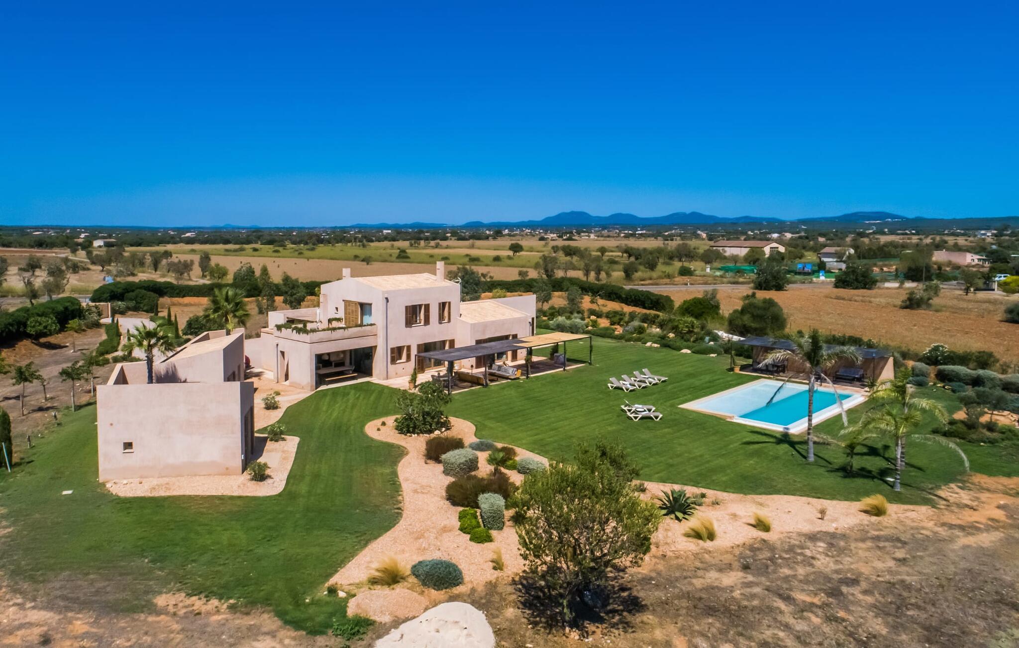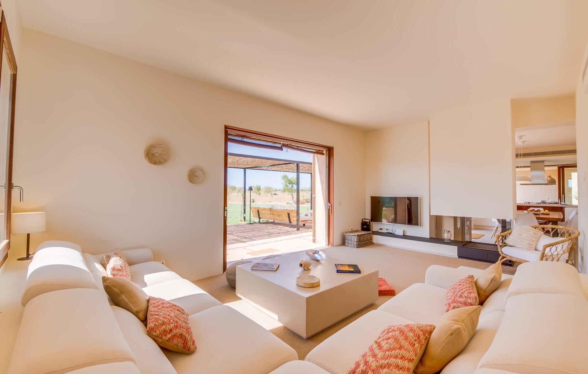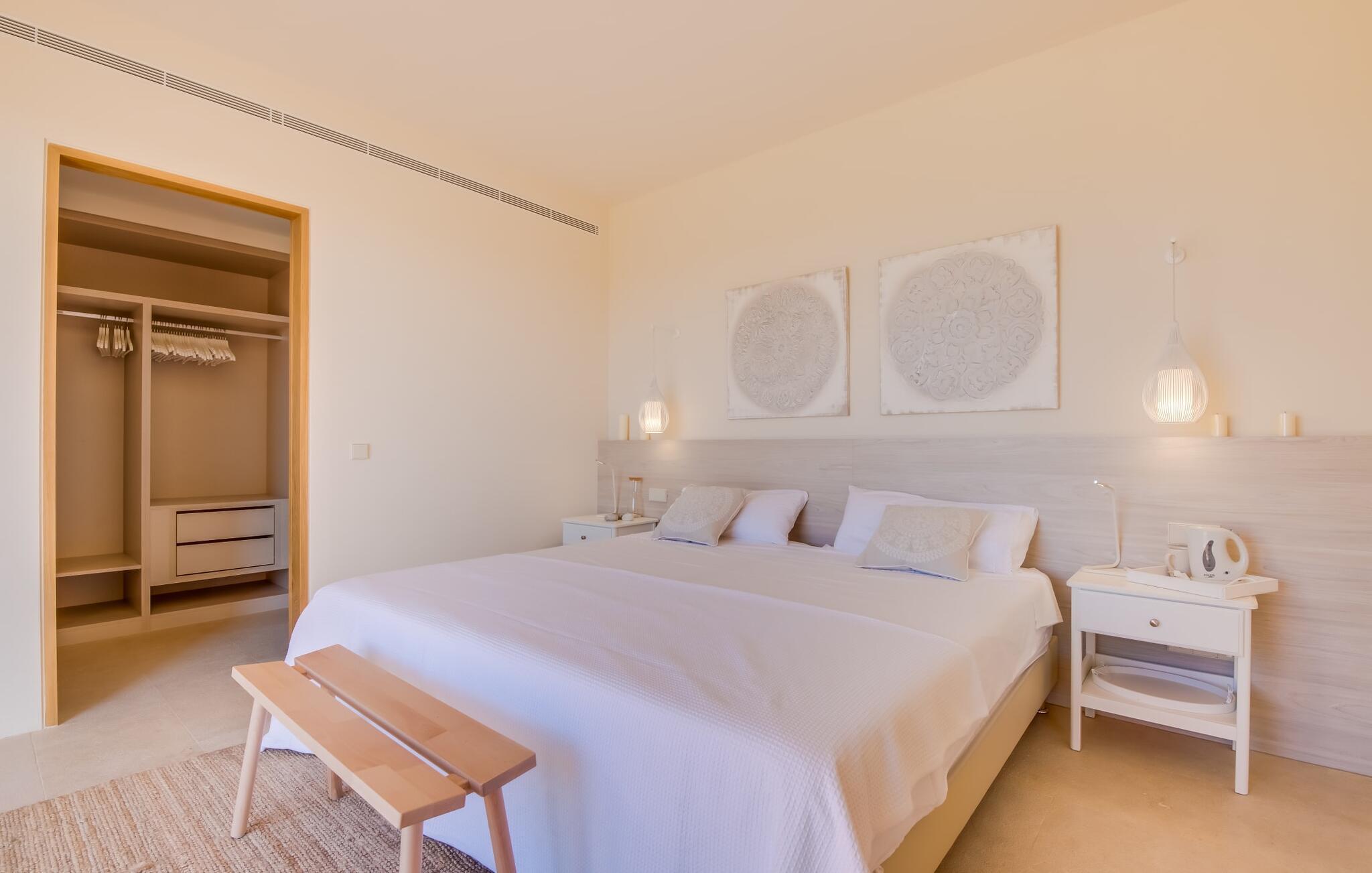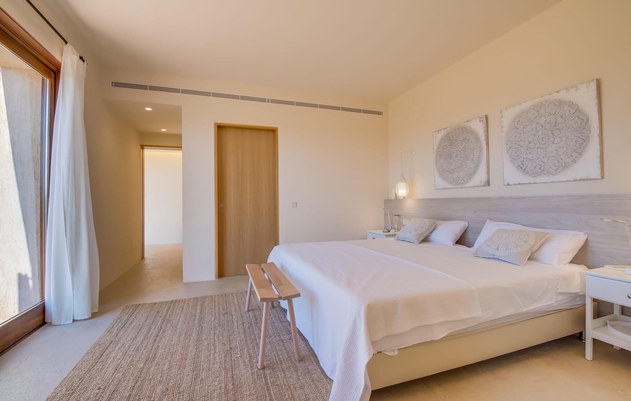 Midt mellem marker i den vidunderlige vidde af den sydlige del af øen vil I opdage den unikke villa "Thalassa d'Es Trenc". Ejendommen er opført i 2018 og imponerer med sin progressive æstetik, hvilket også afspejles i ejendommens udendørsareal. En have med græsplæner og en rummelig pool med børnevenlig dybde er omgivet af palmer. Under den overdækkede terrasse for enden af poolen kan I slappe af i komfortable siddepladser efter svømning eller vie jeres fulde opmærksomhed til solen på de indbydende liggestole. Der er en aflang veranda lige ved siden af bygningen. Morgenkaffe, morgenmad sammen på smagfulde udendørsmøbler eller hjemmelavet sangria om aftenen i den afslappede lounge – her finder I et skønt sted fuld af uhæmmet livsglæde på alle tider af døgnet. Der er terrasser foran de enkelte lejligheder og ikke at forglemme panoramaudsigten fra tagterrassen ved siden af det store soveværelse. Hvis jeres ideelle ferie involverer at lave lækre måltider med venner eller familie og også nyder at gøre det udendørs, så vil I elske den udendørs kabyss lige så meget som vi gør. Det er i bund og grund en forlængelse af det trendy og fuldt udstyrede indendørs køkken, som det har direkte adgang til. Det ser ud til, at arkitekten virkelig var opmærksom på hver detalje i dette imponerende attraktive landsted. "Form følger funktion": Denne bygning inkarnerer dette motto perfekt med sit puristiske udseende. Den lange bygnings lige linjer og rene former danner et hovedhus med en sidefløj, der rummer to separate atelierer med hver sit badeværelse. Studierne er forbundet med hovedhuset, men danner stadig selvstændige enheder med deres egne indgange, hvilket sikrer, at alle privatlivsbehov er opfyldt. Det unikke, minimalistiske interiørdesign i beroligende beige og hvide toner afspejles også i de tidløse, højkvalitetsmøbler lavet af bæredygtige materialer. Designet imponerer med sin enkle, men elegante karakter og er samtidig meget komfortabel. Sidst, men ikke mindst, har det træmøbler, en pejs og gulvvarme, hvilket gør huset til fremragende indkvartering selv i de køligere måneder af lavsæsonen. En elevator sikrer barrierefri adgang til soveværelset på øverste etage. De trendy badeværelser, som præsenterer en matchende, harmonisk lys farveskala, opfylder de samme krav og er udstyret med brusekabine. Afslapning er garanteret – ikke mindst på grund af det vidunderlige design og gennemtænkte arkitektur, der fik os til at forelske os i dette sted. Placeringen af villaen, hvis navn er en hyldest til den nærliggende drømmestrand med caribisk flair, er perfekt. Selv soldyrkere, der foretrækker at svømme nøgne, vil finde det perfekte sted i det fine sand i flere kilometer. På grund af villaens nærhed til landevejen, som indimellem er hørbar, kan I ekstremt hurtigt nå de omkringliggende indre byer og kystbyer og blive overrasket over mulighederne, lige fra turisttilbud til landlige landsbyer. Vores konklusion om "Thalassa d'Es Trenc": Mere end anbefalet og en absolut drømmeplacering, der hjælper jer med at undslippe hverdagens stress. Den nybyggede villa "Thalassa d'Es Trenc" imponerer med sin puristiske æstetik og et smukt udeområde. Det barrierefri hus ligger i den sydlige del af øen mellem Campos og kystbyen Ses Covetes, hvor I kan kombinere jeres shopping med et besøg på stranden. Denne premium ejendom skylder sit navn til sin nærhed til drømmebugten Es Trenc, som ligger omkring 4 km fra villaen. Vi anser denne bolig for tilgængelig for vores gæster med nedsat mobilitet, men vi opfordrer alle gæster til at overveje boligens egnethed baseret på deres egne krav.