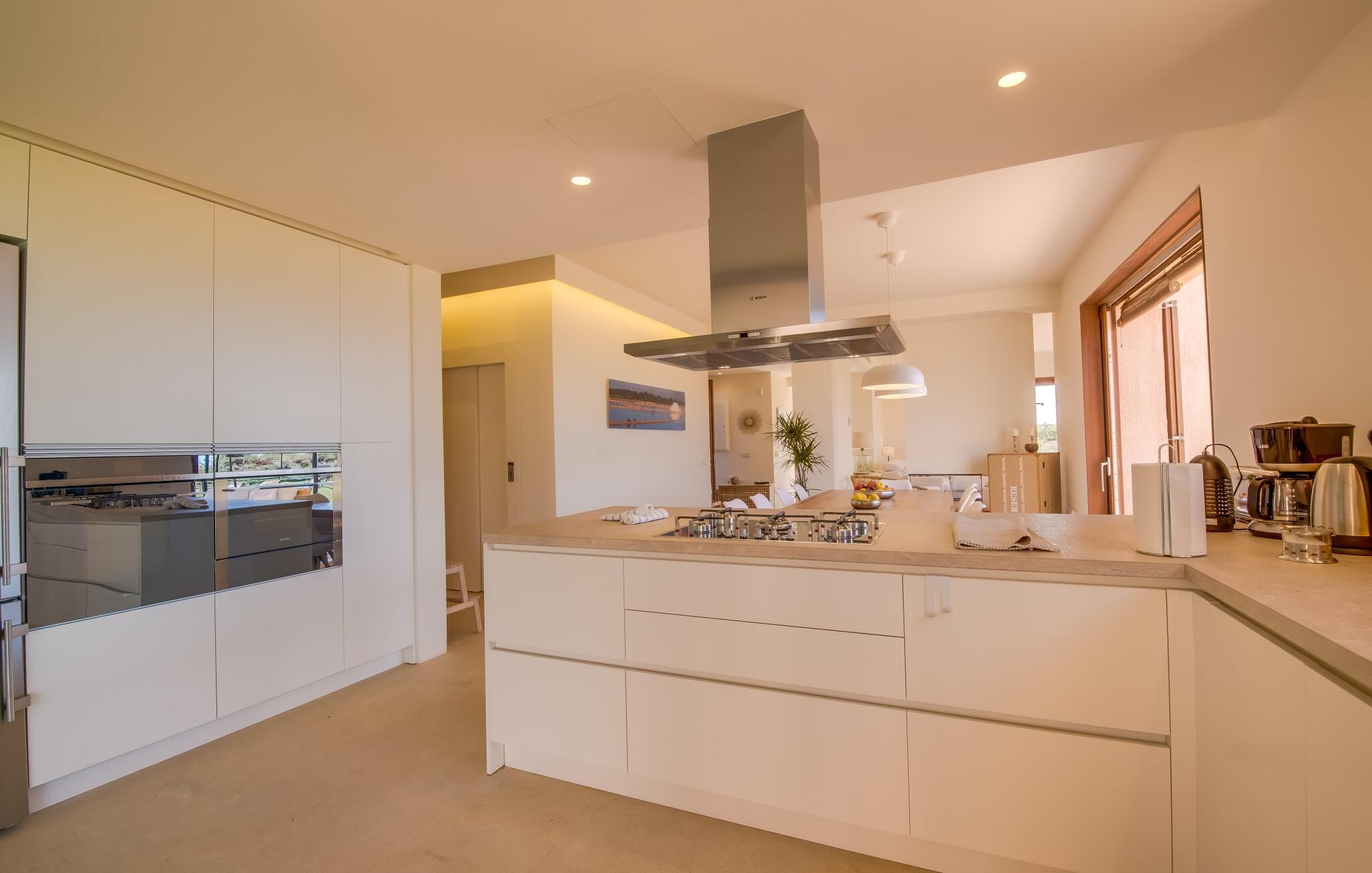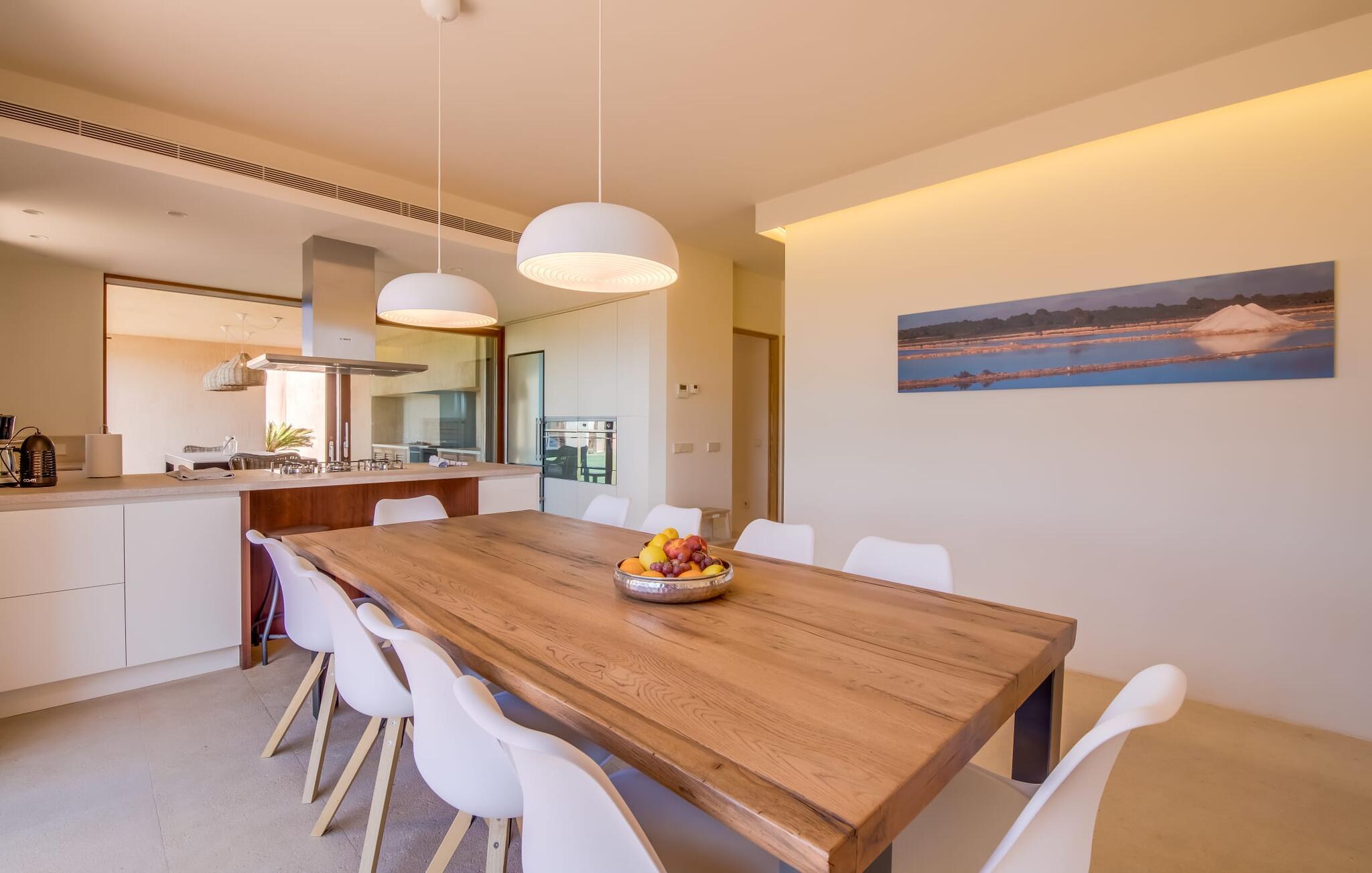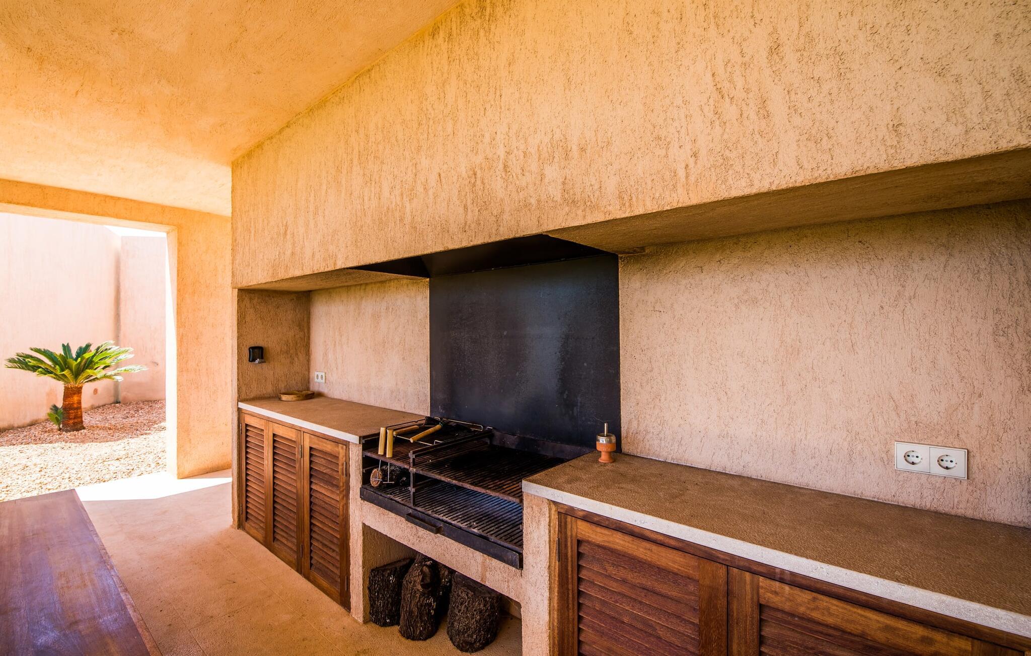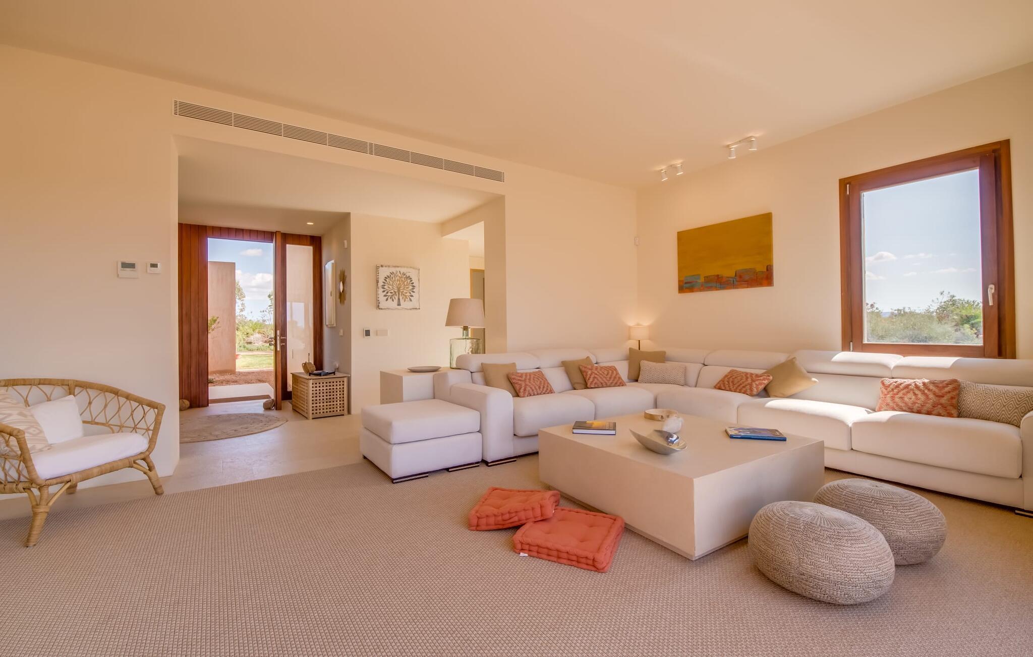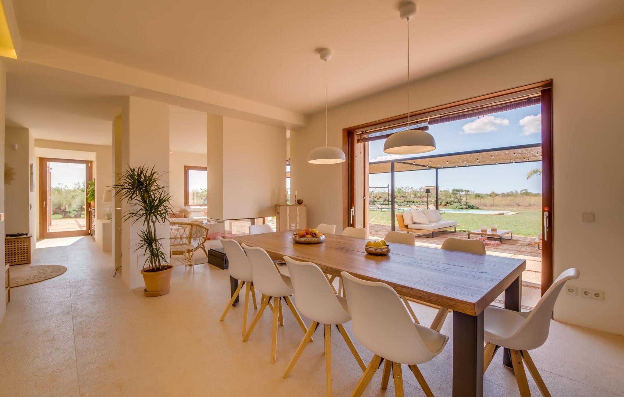 Midt mellem marker i den vidunderlige vidde af den sydlige del af øen vil I opdage den unikke villa "Thalassa d'Es Trenc". Ejendommen er opført i 2018 og imponerer med sin progressive æstetik, hvilket også afspejles i ejendommens udendørsareal. En have med græsplæner og en rummelig pool med børnevenlig dybde er omgivet af palmer. Under den overdækkede terrasse for enden af poolen kan I slappe af i komfortable siddepladser efter svømning eller vie jeres fulde opmærksomhed til solen på de indbydende liggestole. Der er en aflang veranda lige ved siden af bygningen. Morgenkaffe, morgenmad sammen på smagfulde udendørsmøbler eller hjemmelavet sangria om aftenen i den afslappede lounge – her finder I et skønt sted fuld af uhæmmet livsglæde på alle tider af døgnet. Der er terrasser foran de enkelte lejligheder og ikke at forglemme panoramaudsigten fra tagterrassen ved siden af det store soveværelse. Hvis jeres ideelle ferie involverer at lave lækre måltider med venner eller familie og også nyder at gøre det udendørs, så vil I elske den udendørs kabyss lige så meget som vi gør. Det er i bund og grund en forlængelse af det trendy og fuldt udstyrede indendørs køkken, som det har direkte adgang til. Det ser ud til, at arkitekten virkelig var opmærksom på hver detalje i dette imponerende attraktive landsted. "Form følger funktion": Denne bygning inkarnerer dette motto perfekt med sit puristiske udseende. Den lange bygnings lige linjer og rene former danner et hovedhus med en sidefløj, der rummer to separate atelierer med hver sit badeværelse. Studierne er forbundet med hovedhuset, men danner stadig selvstændige enheder med deres egne indgange, hvilket sikrer, at alle privatlivsbehov er opfyldt. Det unikke, minimalistiske interiørdesign i beroligende beige og hvide toner afspejles også i de tidløse, højkvalitetsmøbler lavet af bæredygtige materialer. Designet imponerer med sin enkle, men elegante karakter og er samtidig meget komfortabel. Sidst, men ikke mindst, har det træmøbler, en pejs og gulvvarme, hvilket gør huset til fremragende indkvartering selv i de køligere måneder af lavsæsonen. En elevator sikrer barrierefri adgang til soveværelset på øverste etage. De trendy badeværelser, som præsenterer en matchende, harmonisk lys farveskala, opfylder de samme krav og er udstyret med brusekabine. Afslapning er garanteret – ikke mindst på grund af det vidunderlige design og gennemtænkte arkitektur, der fik os til at forelske os i dette sted. Placeringen af villaen, hvis navn er en hyldest til den nærliggende drømmestrand med caribisk flair, er perfekt. Selv soldyrkere, der foretrækker at svømme nøgne, vil finde det perfekte sted i det fine sand i flere kilometer. På grund af villaens nærhed til landevejen, som indimellem er hørbar, kan I ekstremt hurtigt nå de omkringliggende indre byer og kystbyer og blive overrasket over mulighederne, lige fra turisttilbud til landlige landsbyer. Vores konklusion om "Thalassa d'Es Trenc": Mere end anbefalet og en absolut drømmeplacering, der hjælper jer med at undslippe hverdagens stress. Den nybyggede villa "Thalassa d'Es Trenc" imponerer med sin puristiske æstetik og et smukt udeområde. Det barrierefri hus ligger i den sydlige del af øen mellem Campos og kystbyen Ses Covetes, hvor I kan kombinere jeres shopping med et besøg på stranden. Denne premium ejendom skylder sit navn til sin nærhed til drømmebugten Es Trenc, som ligger omkring 4 km fra villaen. Vi anser denne bolig for tilgængelig for vores gæster med nedsat mobilitet, men vi opfordrer alle gæster til at overveje boligens egnethed baseret på deres egne krav.