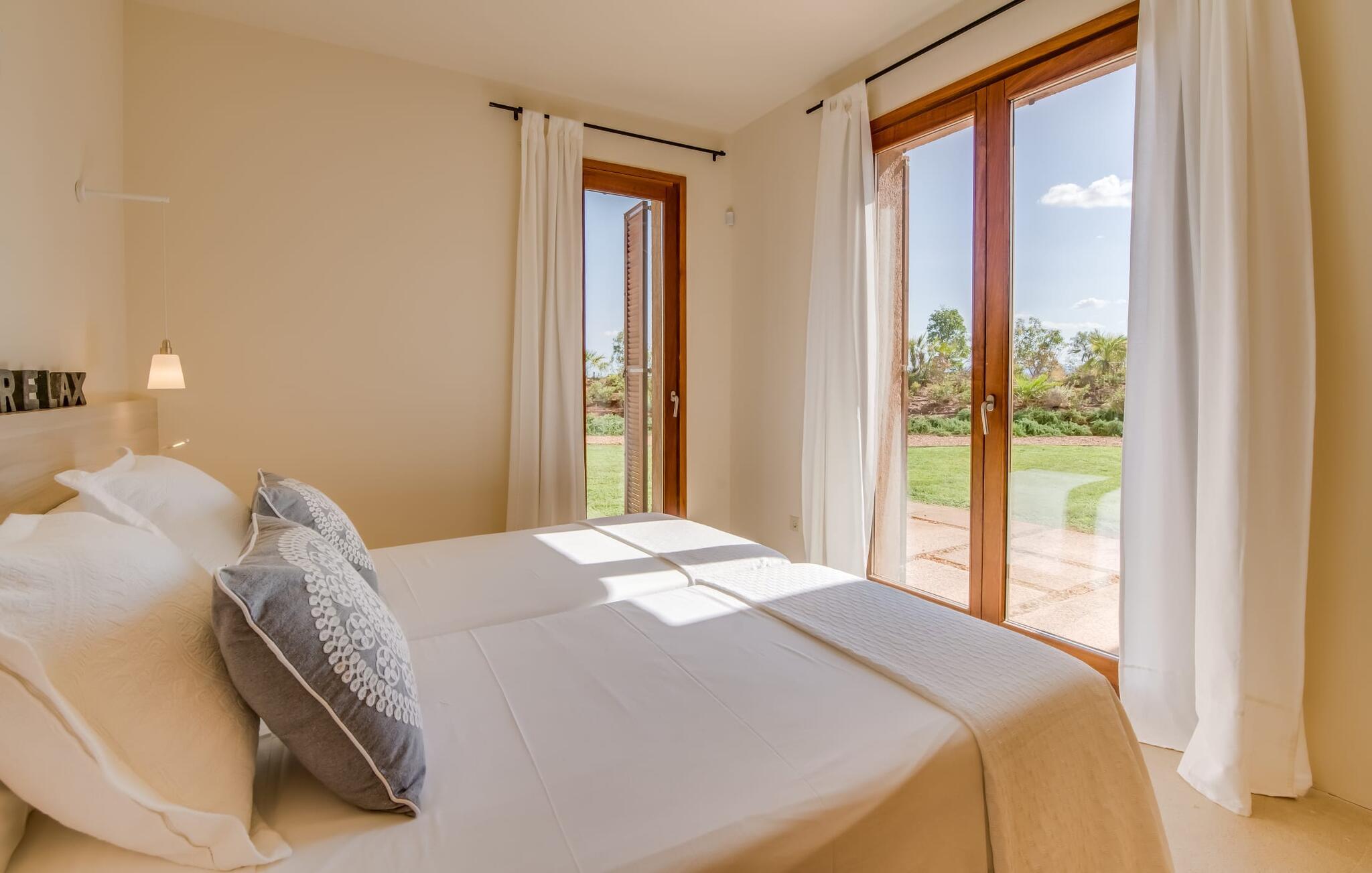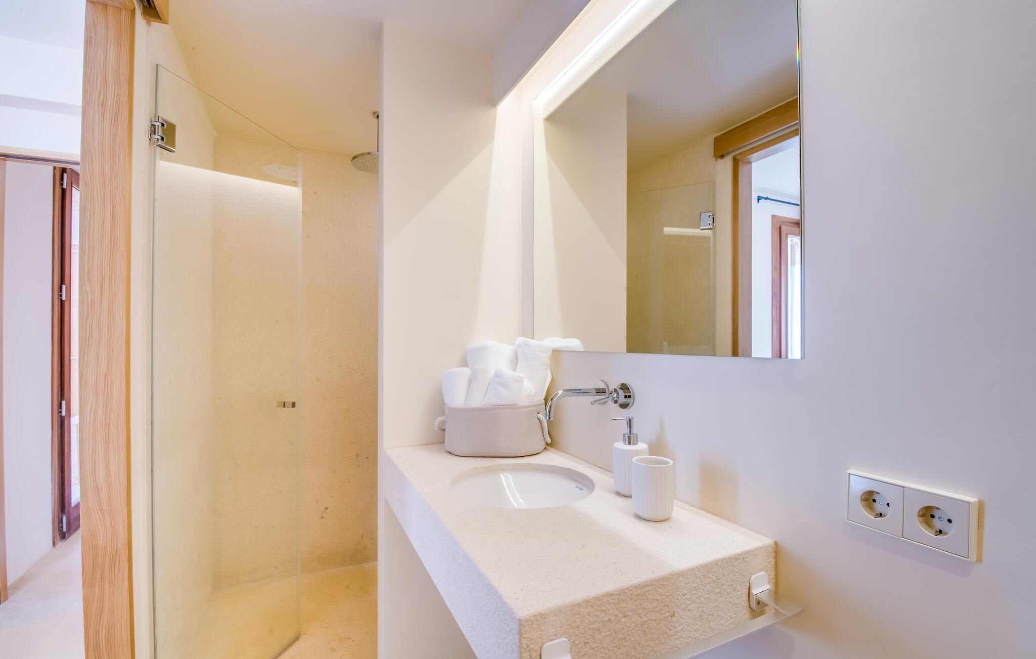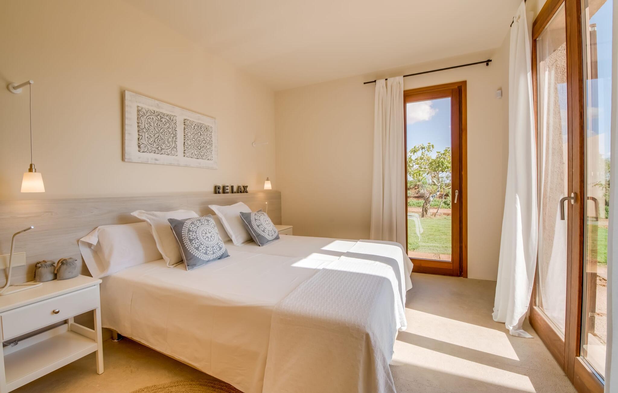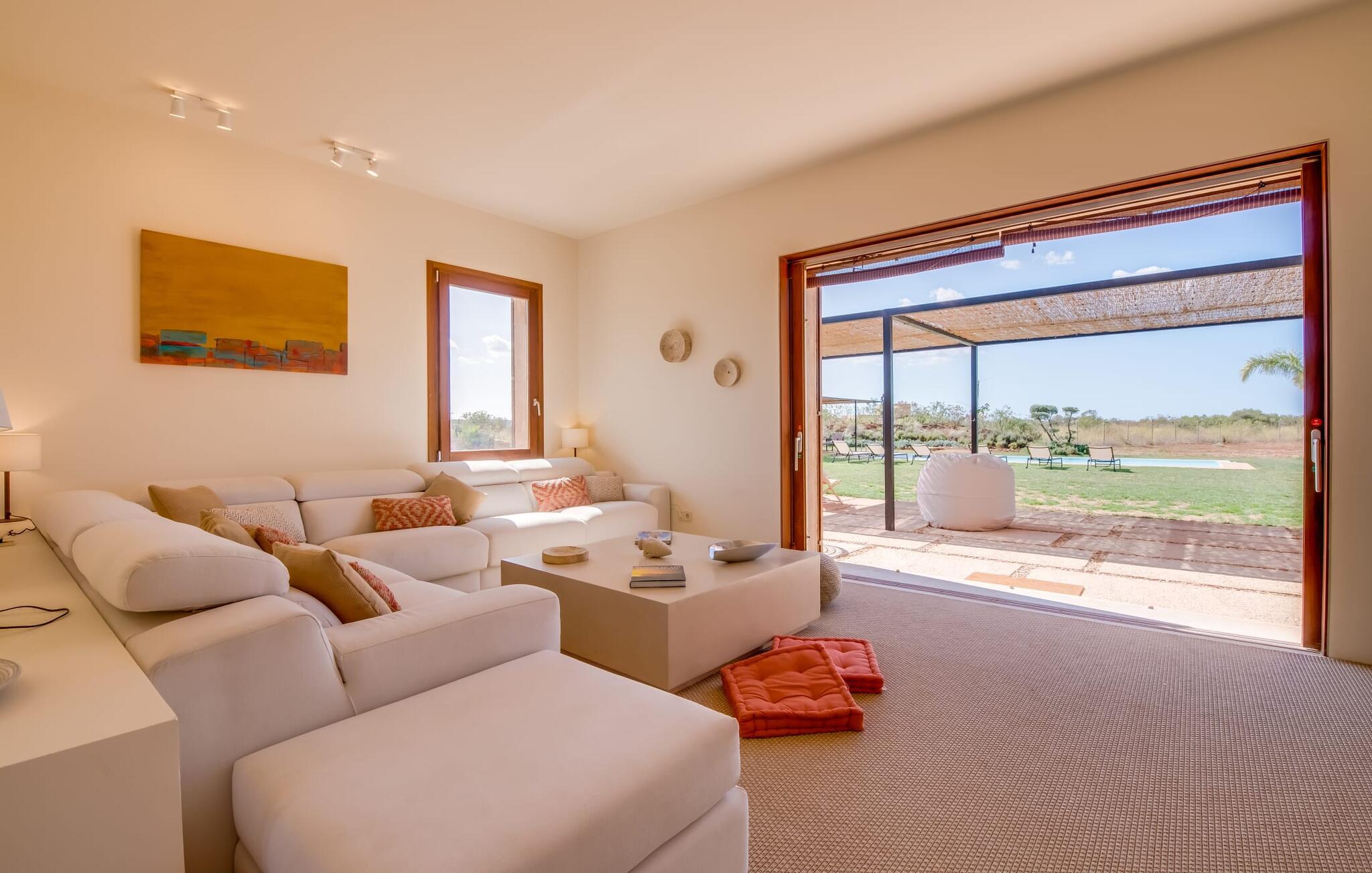 Midt mellem marker i den vidunderlige vidde af den sydlige del af øen vil I opdage den unikke villa "Thalassa d'Es Trenc". Ejendommen er opført i 2018 og imponerer med sin progressive æstetik, hvilket også afspejles i ejendommens udendørsareal. En have med græsplæner og en rummelig pool med børnevenlig dybde er omgivet af palmer. Under den overdækkede terrasse for enden af poolen kan I slappe af i komfortable siddepladser efter svømning eller vie jeres fulde opmærksomhed til solen på de indbydende liggestole. Der er en aflang veranda lige ved siden af bygningen. Morgenkaffe, morgenmad sammen på smagfulde udendørsmøbler eller hjemmelavet sangria om aftenen i den afslappede lounge – her finder I et skønt sted fuld af uhæmmet livsglæde på alle tider af døgnet. Der er terrasser foran de enkelte lejligheder og ikke at forglemme panoramaudsigten fra tagterrassen ved siden af det store soveværelse. Hvis jeres ideelle ferie involverer at lave lækre måltider med venner eller familie og også nyder at gøre det udendørs, så vil I elske den udendørs kabyss lige så meget som vi gør. Det er i bund og grund en forlængelse af det trendy og fuldt udstyrede indendørs køkken, som det har direkte adgang til. Det ser ud til, at arkitekten virkelig var opmærksom på hver detalje i dette imponerende attraktive landsted. "Form følger funktion": Denne bygning inkarnerer dette motto perfekt med sit puristiske udseende. Den lange bygnings lige linjer og rene former danner et hovedhus med en sidefløj, der rummer to separate atelierer med hver sit badeværelse. Studierne er forbundet med hovedhuset, men danner stadig selvstændige enheder med deres egne indgange, hvilket sikrer, at alle privatlivsbehov er opfyldt. Det unikke, minimalistiske interiørdesign i beroligende beige og hvide toner afspejles også i de tidløse, højkvalitetsmøbler lavet af bæredygtige materialer. Designet imponerer med sin enkle, men elegante karakter og er samtidig meget komfortabel. Sidst, men ikke mindst, har det træmøbler, en pejs og gulvvarme, hvilket gør huset til fremragende indkvartering selv i de køligere måneder af lavsæsonen. En elevator sikrer barrierefri adgang til soveværelset på øverste etage. De trendy badeværelser, som præsenterer en matchende, harmonisk lys farveskala, opfylder de samme krav og er udstyret med brusekabine. Afslapning er garanteret – ikke mindst på grund af det vidunderlige design og gennemtænkte arkitektur, der fik os til at forelske os i dette sted. Placeringen af villaen, hvis navn er en hyldest til den nærliggende drømmestrand med caribisk flair, er perfekt. Selv soldyrkere, der foretrækker at svømme nøgne, vil finde det perfekte sted i det fine sand i flere kilometer. På grund af villaens nærhed til landevejen, som indimellem er hørbar, kan I ekstremt hurtigt nå de omkringliggende indre byer og kystbyer og blive overrasket over mulighederne, lige fra turisttilbud til landlige landsbyer. Vores konklusion om "Thalassa d'Es Trenc": Mere end anbefalet og en absolut drømmeplacering, der hjælper jer med at undslippe hverdagens stress. Den nybyggede villa "Thalassa d'Es Trenc" imponerer med sin puristiske æstetik og et smukt udeområde. Det barrierefri hus ligger i den sydlige del af øen mellem Campos og kystbyen Ses Covetes, hvor I kan kombinere jeres shopping med et besøg på stranden. Denne premium ejendom skylder sit navn til sin nærhed til drømmebugten Es Trenc, som ligger omkring 4 km fra villaen. Vi anser denne bolig for tilgængelig for vores gæster med nedsat mobilitet, men vi opfordrer alle gæster til at overveje boligens egnethed baseret på deres egne krav.