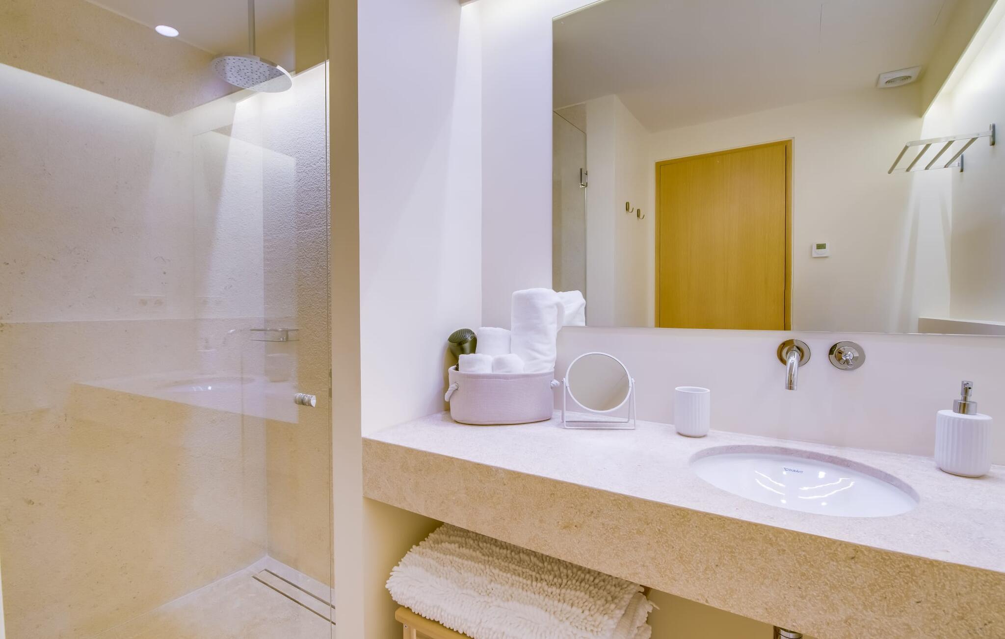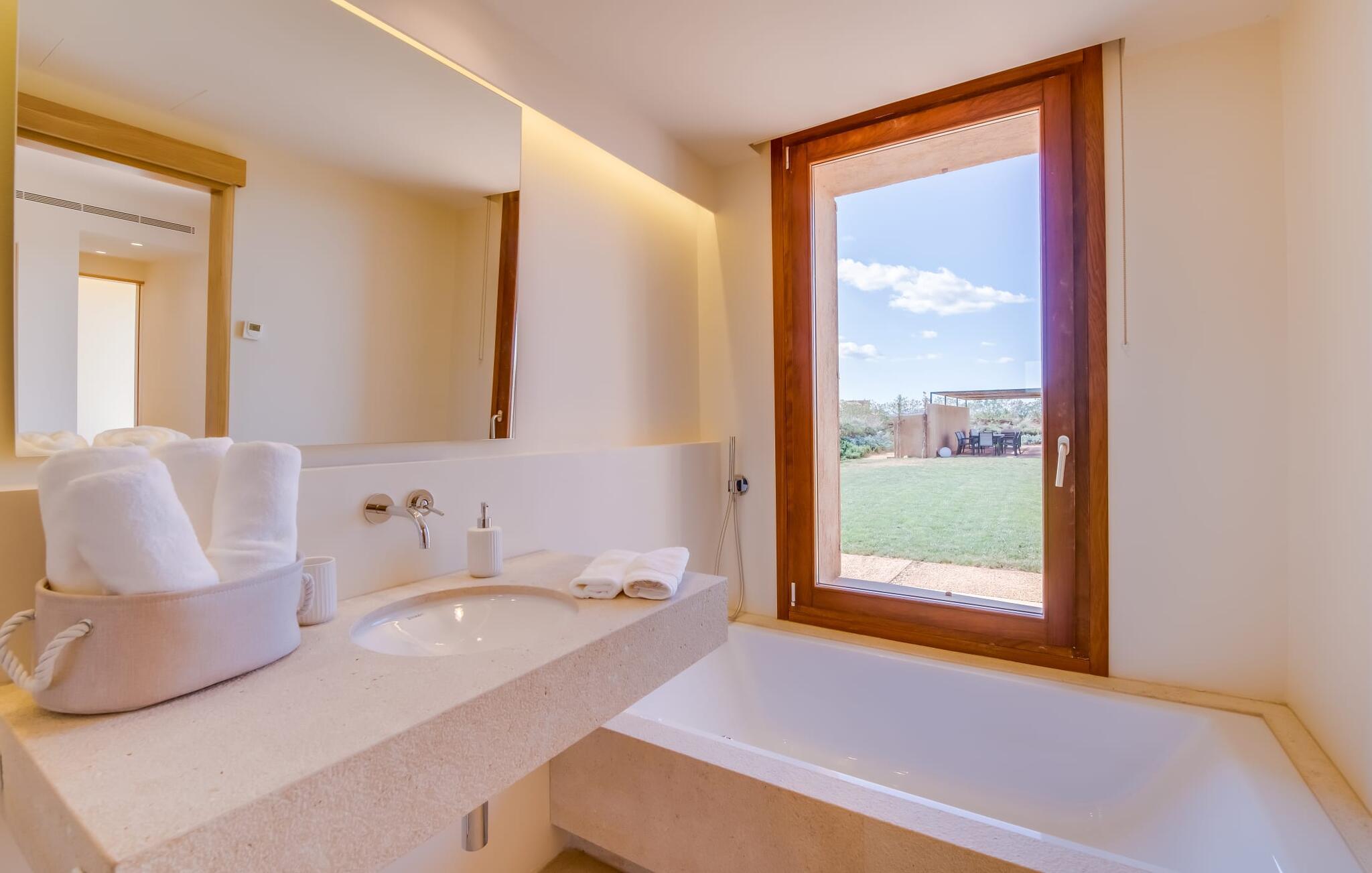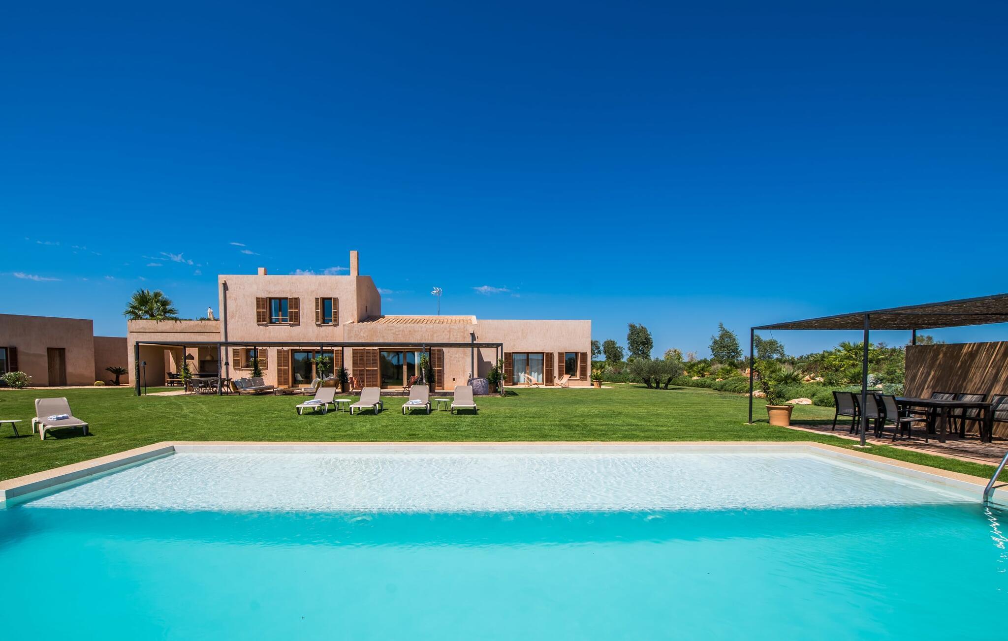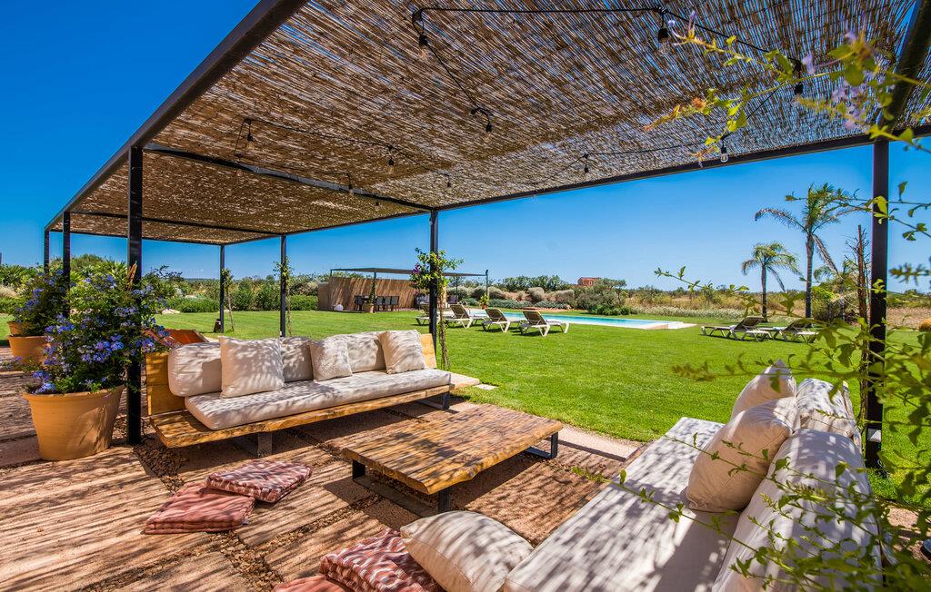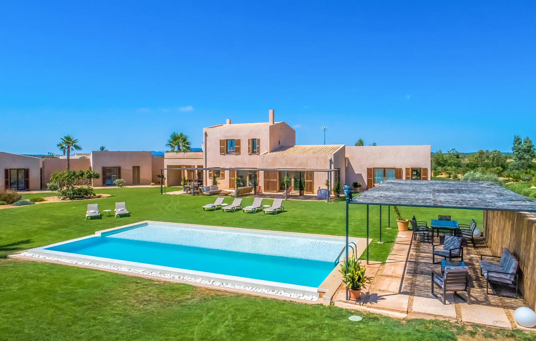 Midt mellem marker i den vidunderlige vidde af den sydlige del af øen vil I opdage den unikke villa "Thalassa d'Es Trenc". Ejendommen er opført i 2018 og imponerer med sin progressive æstetik, hvilket også afspejles i ejendommens udendørsareal. En have med græsplæner og en rummelig pool med børnevenlig dybde er omgivet af palmer. Under den overdækkede terrasse for enden af poolen kan I slappe af i komfortable siddepladser efter svømning eller vie jeres fulde opmærksomhed til solen på de indbydende liggestole. Der er en aflang veranda lige ved siden af bygningen. Morgenkaffe, morgenmad sammen på smagfulde udendørsmøbler eller hjemmelavet sangria om aftenen i den afslappede lounge – her finder I et skønt sted fuld af uhæmmet livsglæde på alle tider af døgnet. Der er terrasser foran de enkelte lejligheder og ikke at forglemme panoramaudsigten fra tagterrassen ved siden af det store soveværelse. Hvis jeres ideelle ferie involverer at lave lækre måltider med venner eller familie og også nyder at gøre det udendørs, så vil I elske den udendørs kabyss lige så meget som vi gør. Det er i bund og grund en forlængelse af det trendy og fuldt udstyrede indendørs køkken, som det har direkte adgang til. Det ser ud til, at arkitekten virkelig var opmærksom på hver detalje i dette imponerende attraktive landsted. "Form følger funktion": Denne bygning inkarnerer dette motto perfekt med sit puristiske udseende. Den lange bygnings lige linjer og rene former danner et hovedhus med en sidefløj, der rummer to separate atelierer med hver sit badeværelse. Studierne er forbundet med hovedhuset, men danner stadig selvstændige enheder med deres egne indgange, hvilket sikrer, at alle privatlivsbehov er opfyldt. Det unikke, minimalistiske interiørdesign i beroligende beige og hvide toner afspejles også i de tidløse, højkvalitetsmøbler lavet af bæredygtige materialer. Designet imponerer med sin enkle, men elegante karakter og er samtidig meget komfortabel. Sidst, men ikke mindst, har det træmøbler, en pejs og gulvvarme, hvilket gør huset til fremragende indkvartering selv i de køligere måneder af lavsæsonen. En elevator sikrer barrierefri adgang til soveværelset på øverste etage. De trendy badeværelser, som præsenterer en matchende, harmonisk lys farveskala, opfylder de samme krav og er udstyret med brusekabine. Afslapning er garanteret – ikke mindst på grund af det vidunderlige design og gennemtænkte arkitektur, der fik os til at forelske os i dette sted. Placeringen af villaen, hvis navn er en hyldest til den nærliggende drømmestrand med caribisk flair, er perfekt. Selv soldyrkere, der foretrækker at svømme nøgne, vil finde det perfekte sted i det fine sand i flere kilometer. På grund af villaens nærhed til landevejen, som indimellem er hørbar, kan I ekstremt hurtigt nå de omkringliggende indre byer og kystbyer og blive overrasket over mulighederne, lige fra turisttilbud til landlige landsbyer. Vores konklusion om "Thalassa d'Es Trenc": Mere end anbefalet og en absolut drømmeplacering, der hjælper jer med at undslippe hverdagens stress. Den nybyggede villa "Thalassa d'Es Trenc" imponerer med sin puristiske æstetik og et smukt udeområde. Det barrierefri hus ligger i den sydlige del af øen mellem Campos og kystbyen Ses Covetes, hvor I kan kombinere jeres shopping med et besøg på stranden. Denne premium ejendom skylder sit navn til sin nærhed til drømmebugten Es Trenc, som ligger omkring 4 km fra villaen. Vi anser denne bolig for tilgængelig for vores gæster med nedsat mobilitet, men vi opfordrer alle gæster til at overveje boligens egnethed baseret på deres egne krav.