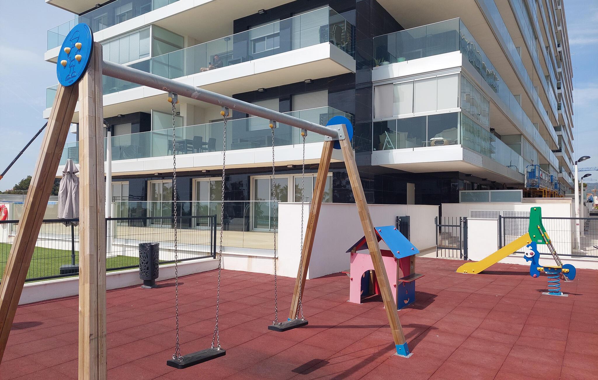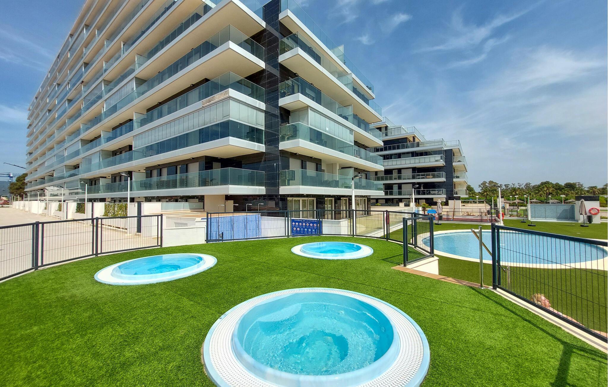 Nyd solrige dage i denne moderne ferielejlighed med havudsigt, fælles pool og spabad nær stranden.