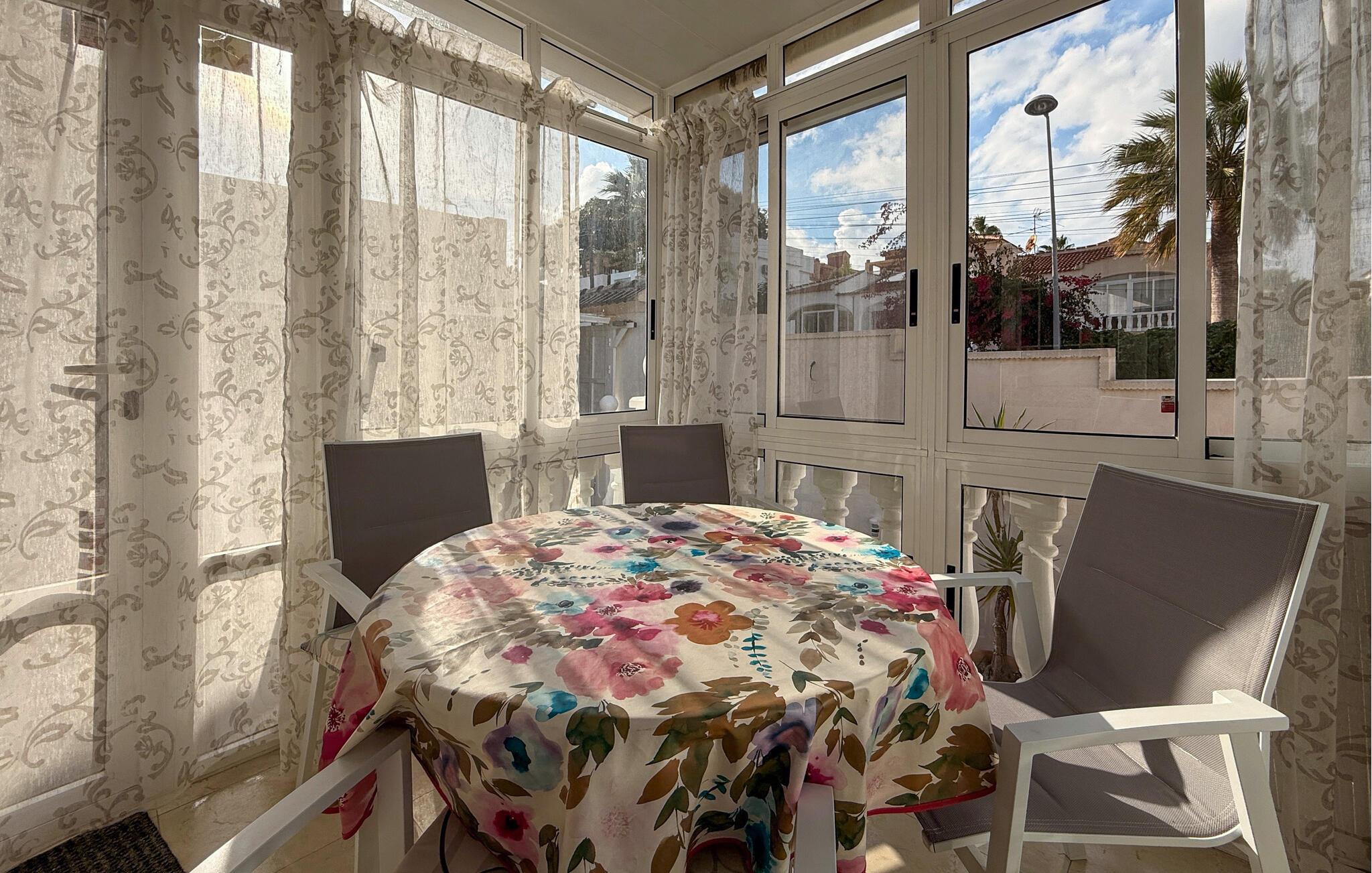 Jeres feriehus byder på de bedste rammer for afslappende dage under den spanske sol. Start morgenen med en dejlig morgenmad, og glæd jer til afslapning og hyggelige aktiviteter. Hyg jer i den dejlige opholdsstue. Læn jer tilbage, leg med børnene, eller nyd et måltid sammen ved spisebordet. Brug også den lukkede terrasse til fælles måltider eller en forfriskende drink om aftenen.