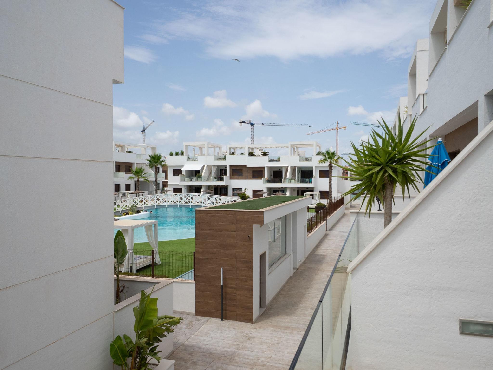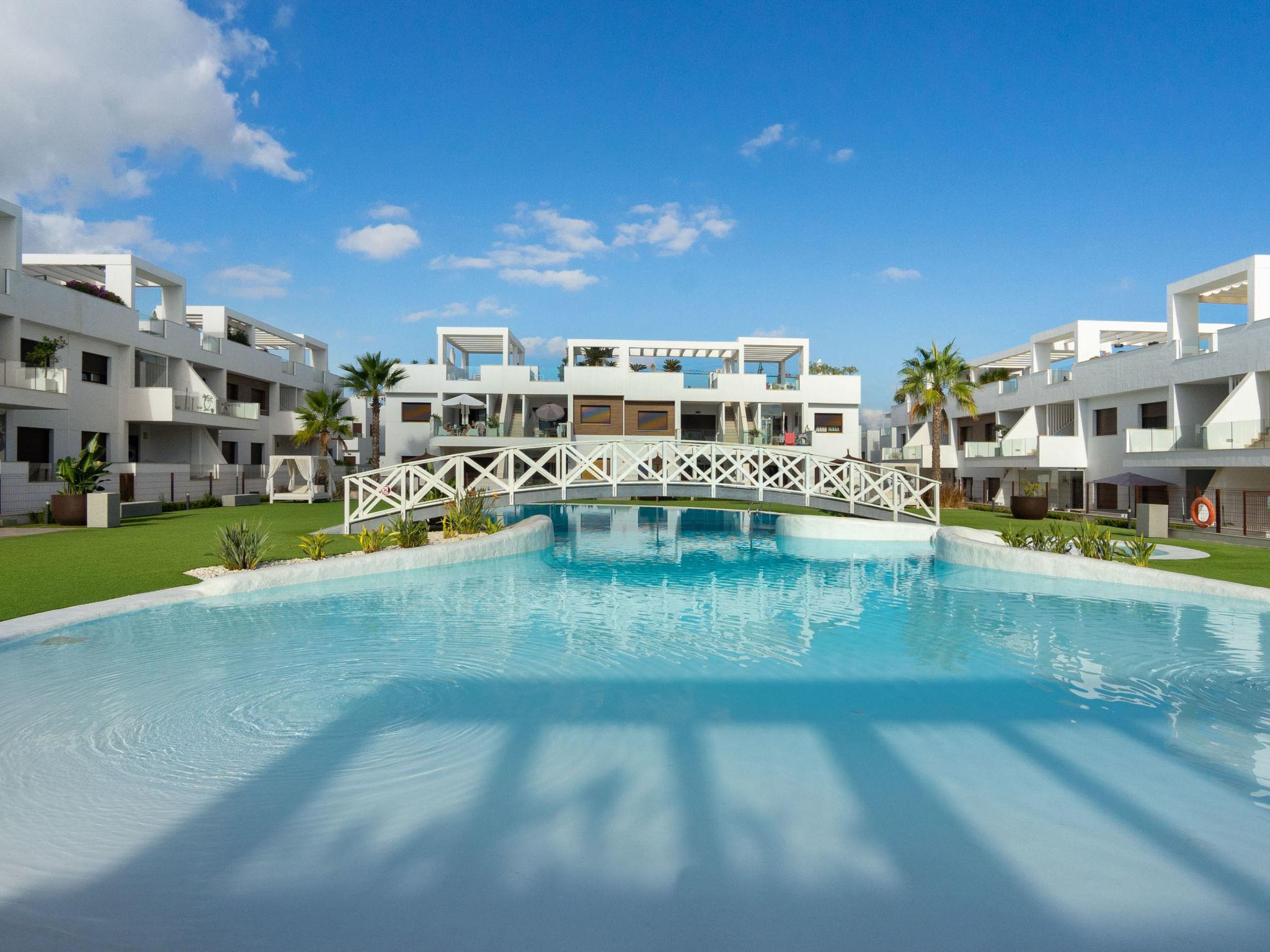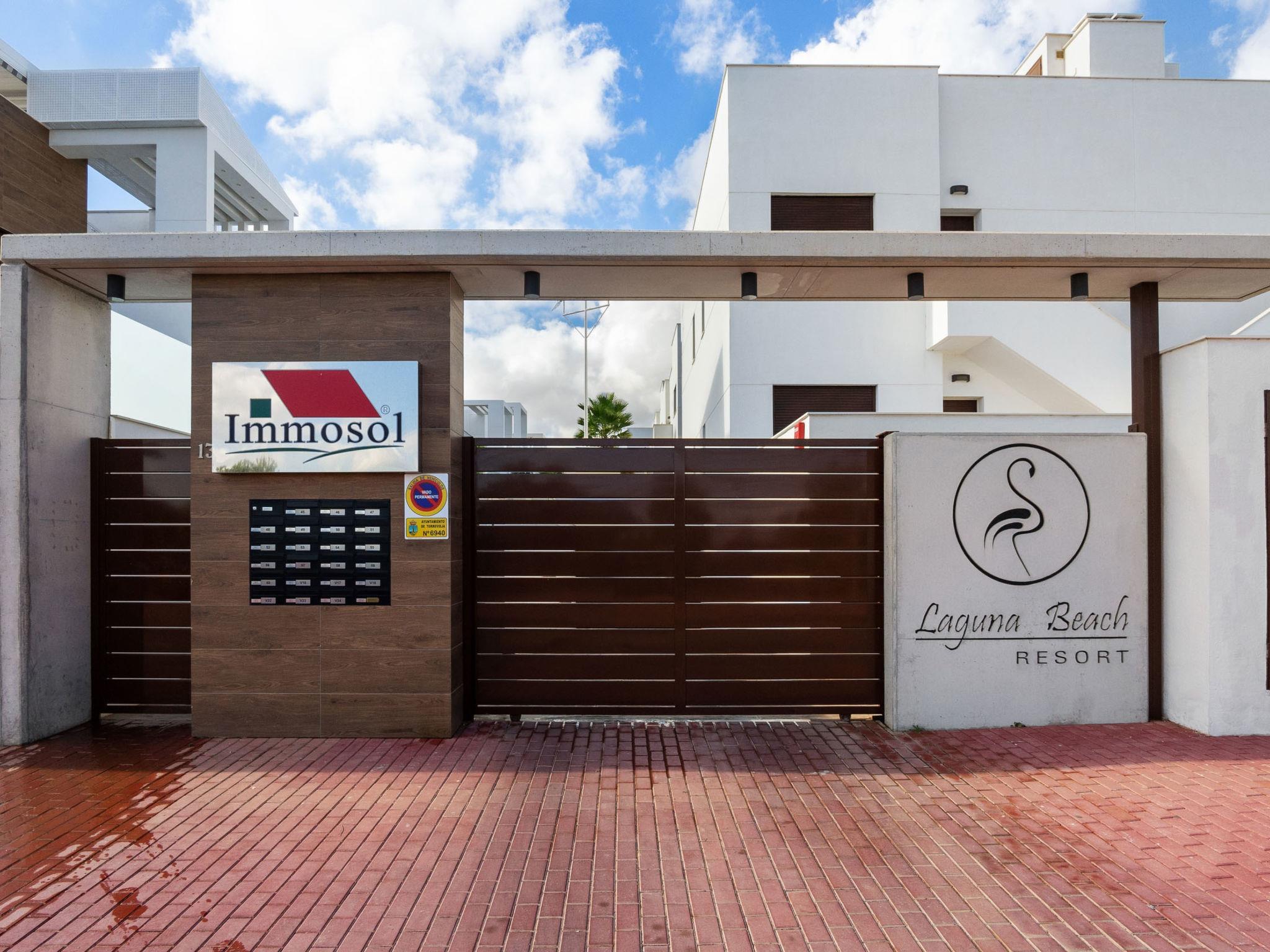 Modern, beautiful residence "Laguna Beach Resort", 2 storeys. 7 km from the centre of Torrevieja, 5 km from the centre of Punta Prima, 4 km from the sea, 4 km from the beach. For shared use: property (fenced), swimming pool (32 x 14 m, seasonal availability: 01.Jan. - 31.Dec.). Children's pool, outdoor shower. In the house: roof terrace. Grocery, supermarket 700 m, restaurant 850 m, bar 700 m, bus stop 750 m, sandy beach "Playa Punta Prima" 6 km. Sports harbour 6 km, marina 6 km, golf course (12 hole) 5 km.