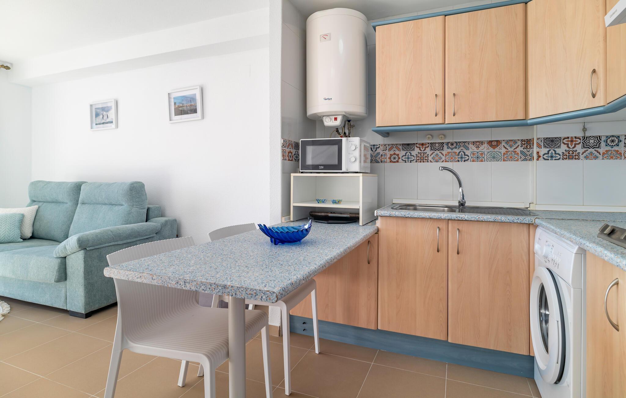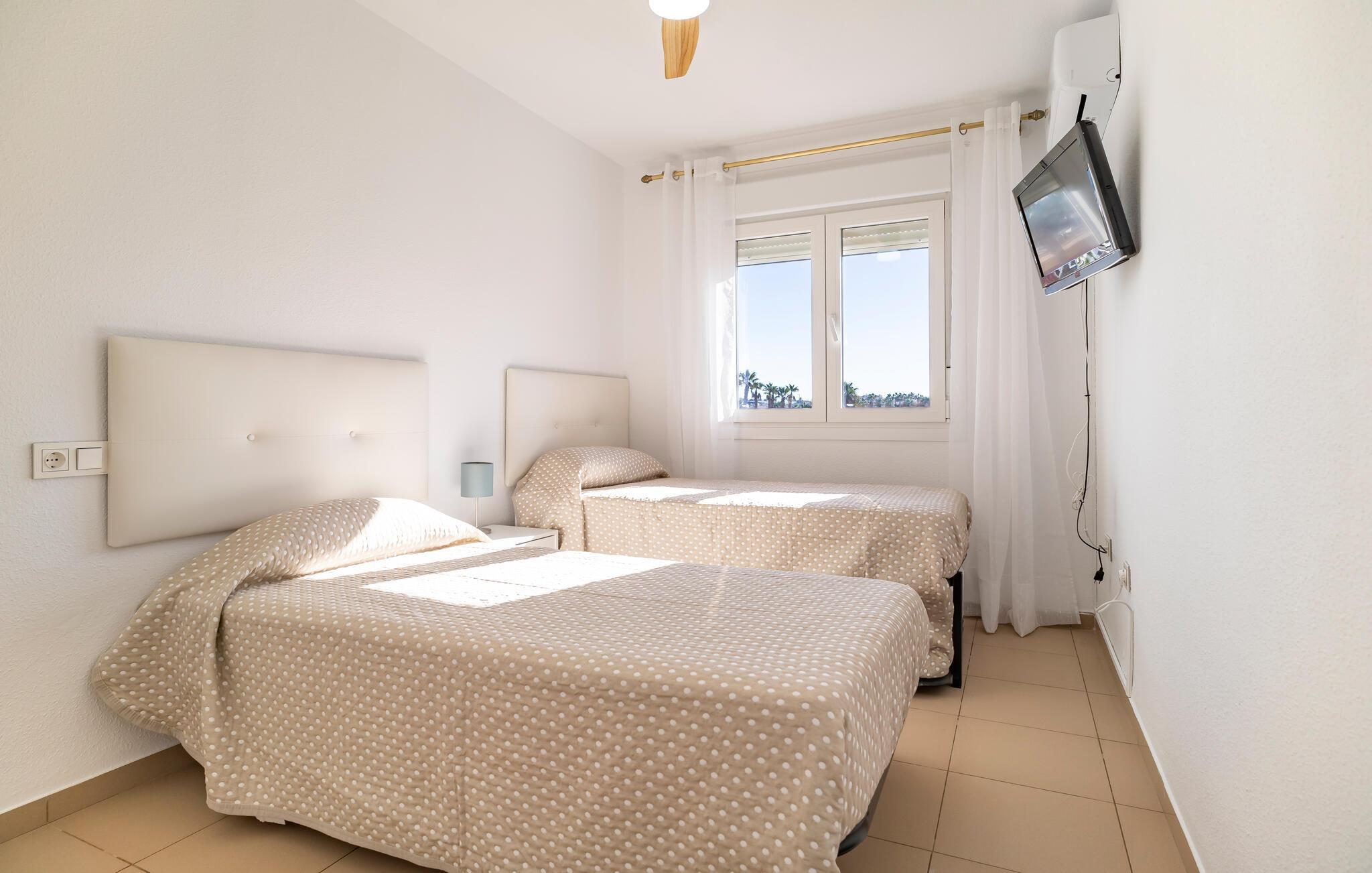 Denne stilfuldt og moderne indrettede ferielejlighed giver jer en komfortabel base til afslappende feriedage ved kysten. Den lyse og åbne indretning skaber en behagelig atmosfære, der hurtigt får jer til at føle jer hjemme. Nyd udsigten fra balkonen over de omkringliggende omgivelser, og lad den friske havluft give jer fornyet energi. Efter en dag på den nærliggende sandstrand kan I tage en opfriskende dukkert i en af de fælles pools – et perfekt setup for en afslappet strandferie.