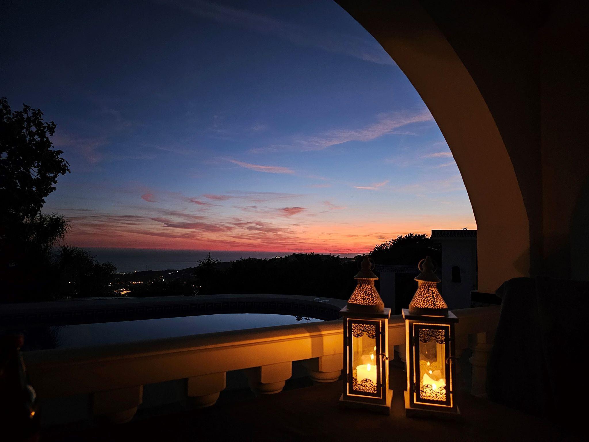 • Auf der geräumigen, überdachten Terrasse (ca. 30 qm) ist ein Esstisch und eine Lounge Sitzgruppe. Von hier genießen Sie einen wunderbaren Ausblick über den Pool und Torrox Pueblo bis zum Meer.