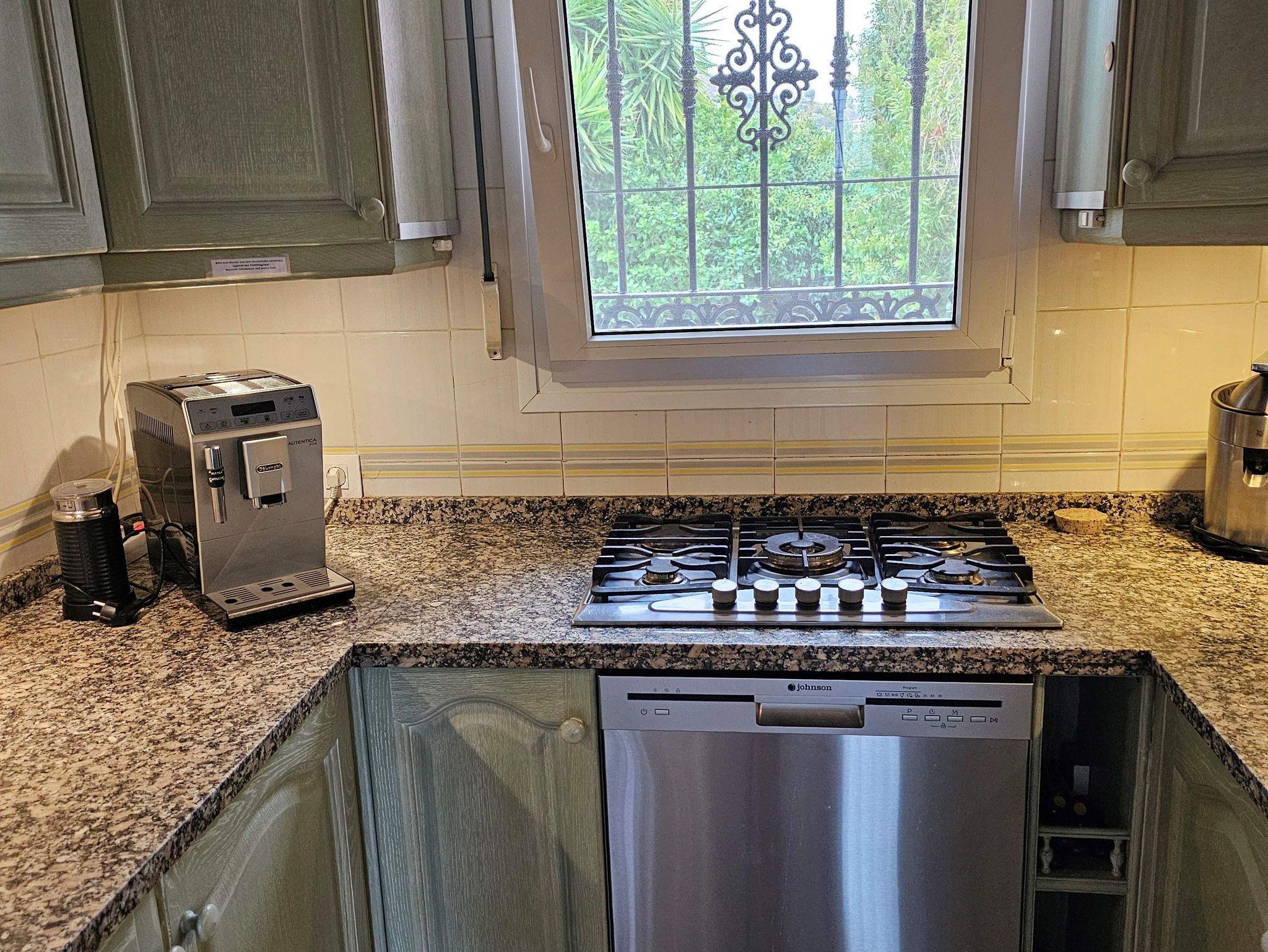 Spülmaschine, 5-flammiger Gasherd, große Kühl-/Gefrierkombination mit Eiswürfelspender, Backofen, Mikrowelle, Espresso-Vollautomat, elektr. Orangenpresse, Toaster, Wasserkocher, Mixer, hochwertige Messer, sehr viel Auswahl an Geschirr und Gläsern.