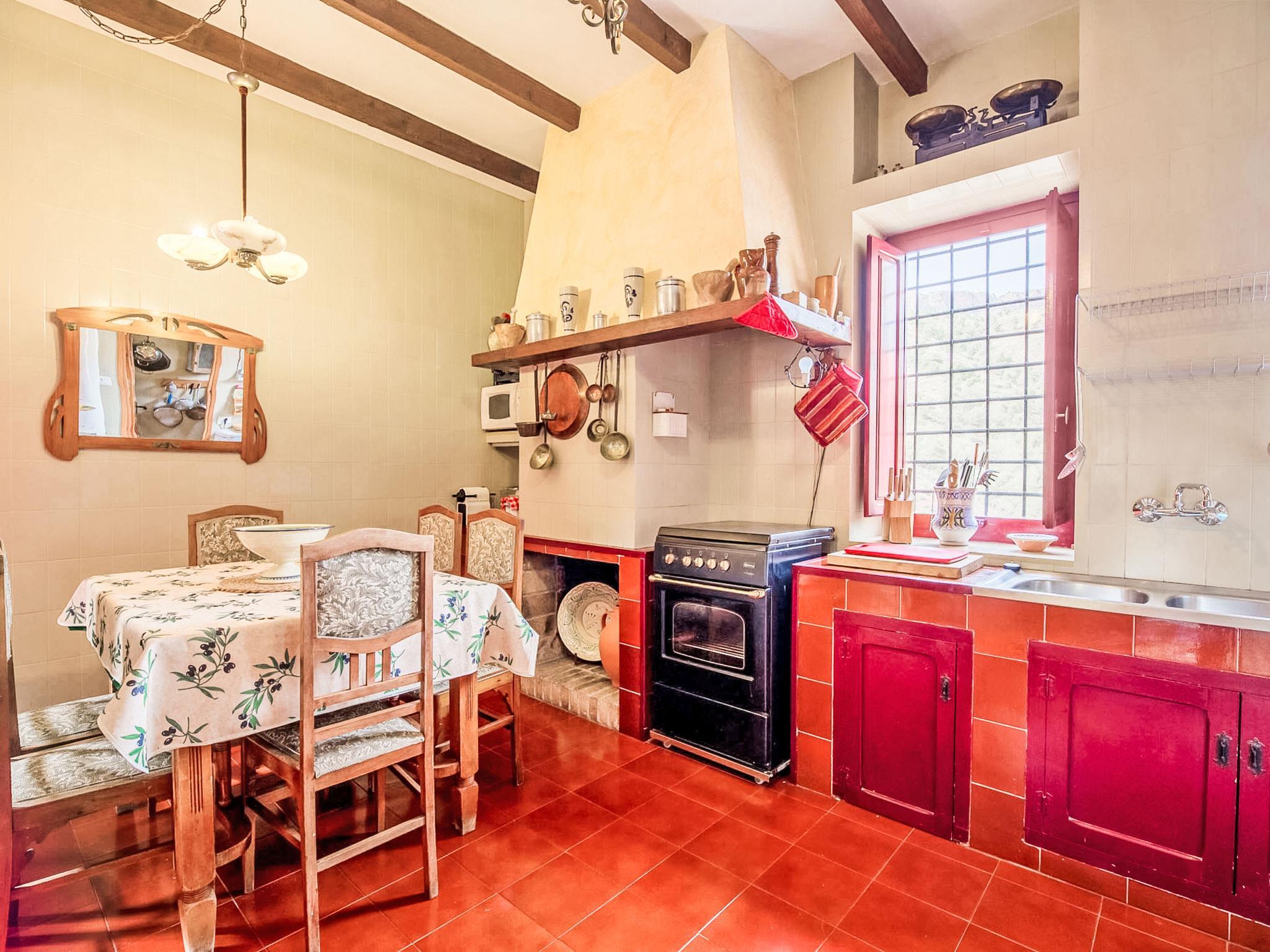 "De la Cruz", 5-room house 145 m2. Rustic furnishings: living/dining room with open-hearth fireplace, satellite TV, international TV channels, radio and DVD. Exit to the swimming pool. 2 rooms, each room with 1 french bed. 1 room with 1 bed (105 cm, length 190 cm). 1 room with 2 beds (105 cm, length 190 cm). Kitchen (4 hot plates, oven, dishwasher, microwave, freezer) with dining table, open-hearth fireplace. Bath/bidet/WC, sep. WC. Electric heating. Patio. Barbecue, deck chairs (6). View of the mountains. Facilities: washing machine, baby cot for up to 2 year olds. Internet (WiFi, free). Please note: TV only ES, EN, FR. 6 electric radiators. AR.MU.601 // Reg. Nr.: ESFCTU0000300340008878430000000000000000000AR/MU/6012