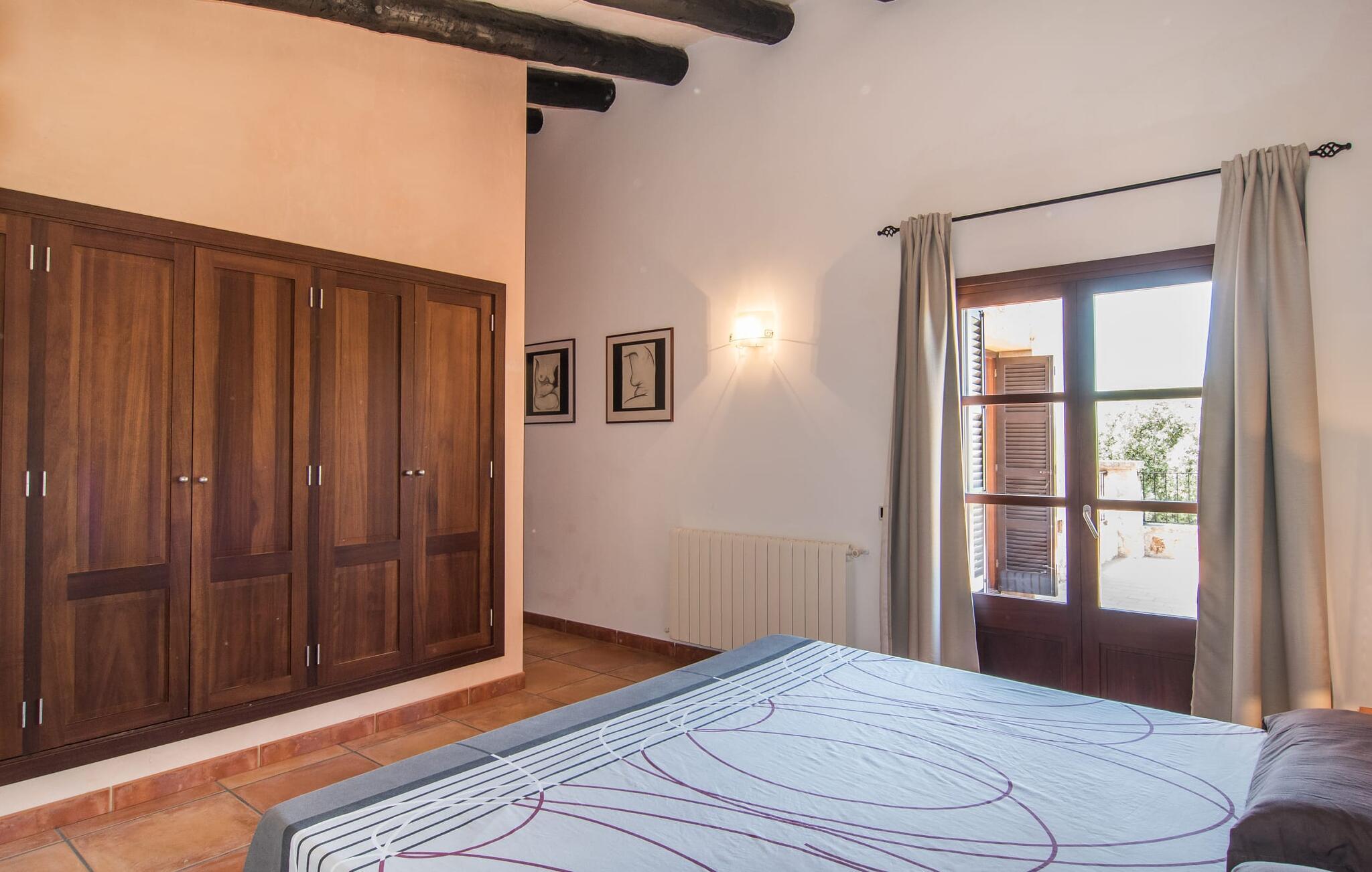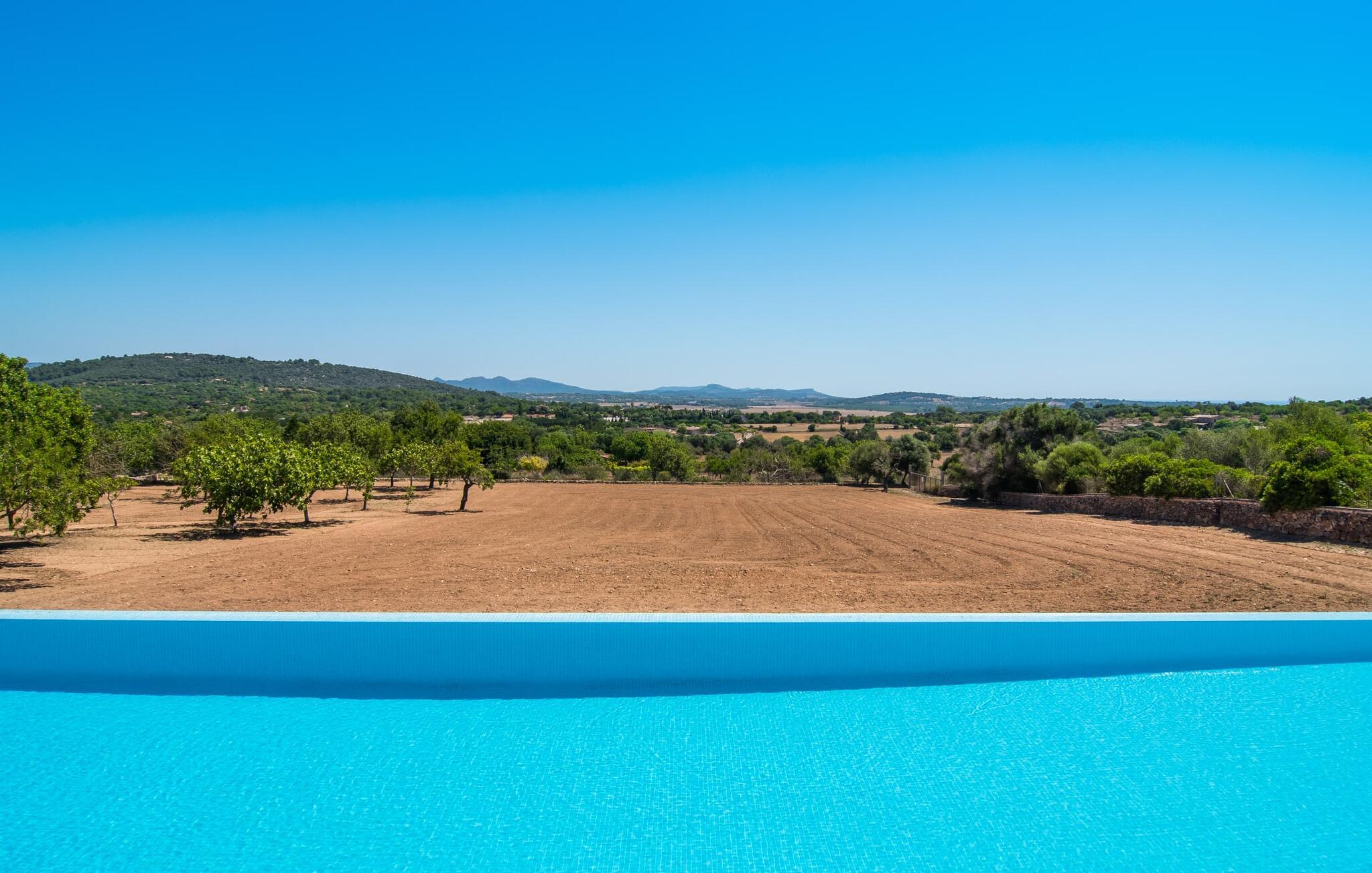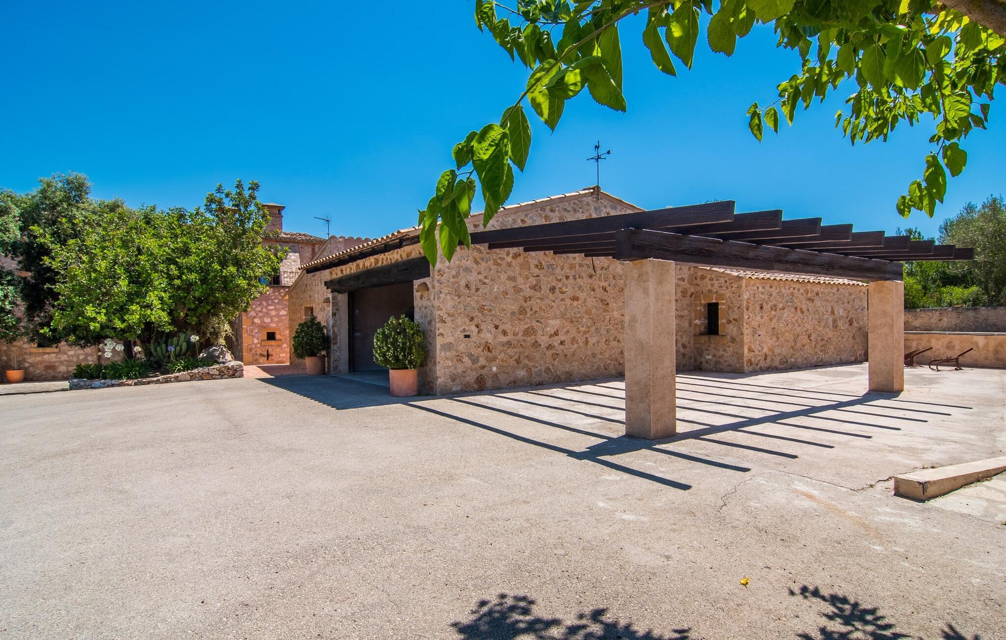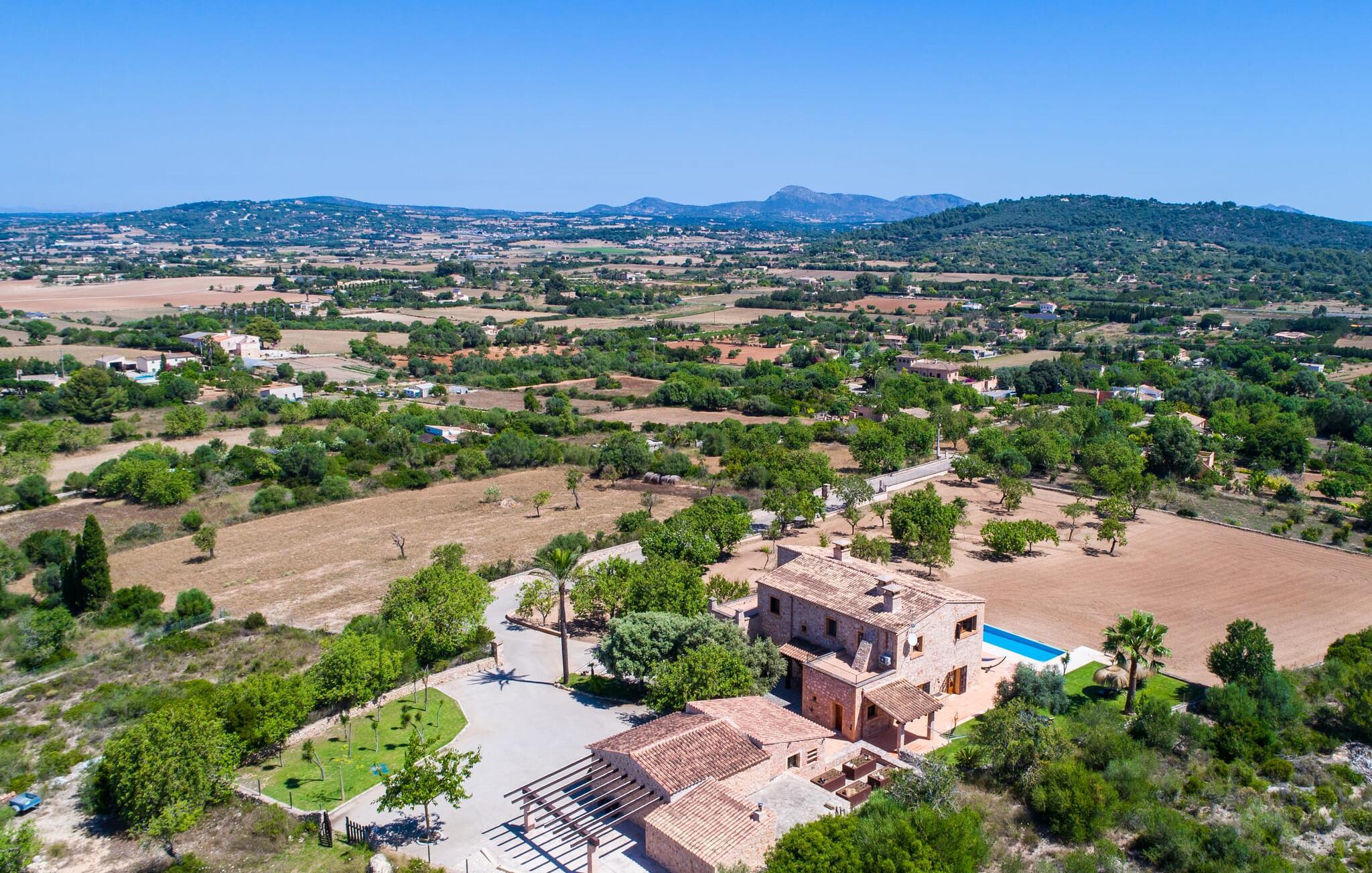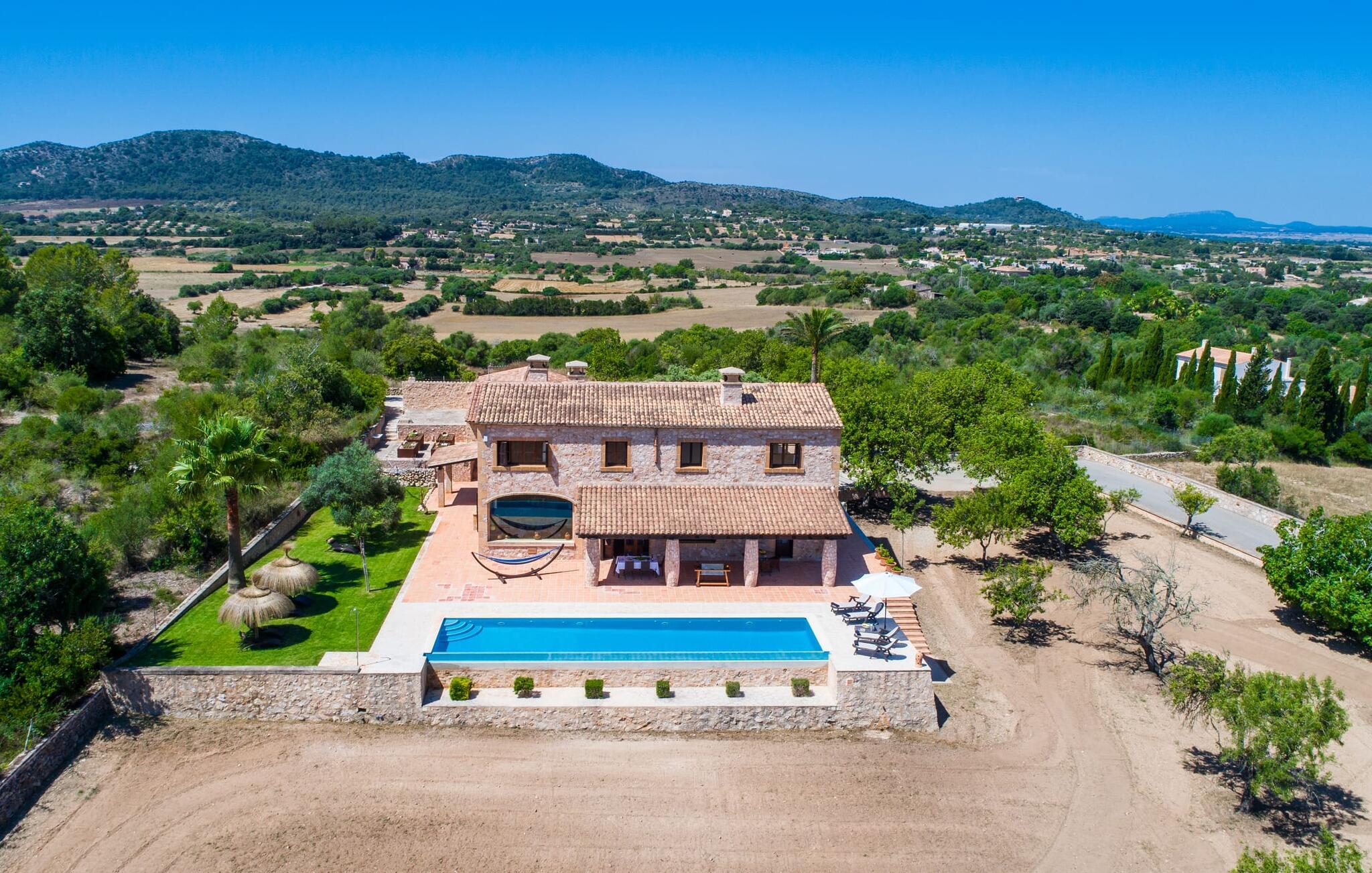 Den smukke finca "Turonet", beliggende på østsiden af øen, tilbyder jer det perfekte hjem til en ferie med venner eller familie. Det ligger på en 16.000 m² stor grund med en smuk have ved siden af huset. Med næsten 400 m² byder dette imponerende hus på plads til op til 10 personer. Både den bekvemme beliggenhed og den rolige beliggenhed gør denne ejendom til det perfekte udgangspunkt for en afslappende og om ønsket afvekslende ferie. Der er en stor, delvist overdækket terrasse foran huset, som giver tiltrængt skygge om sommeren. Foran den er der en utrolig 15 m pool, der indbyder til at spille mange omgange i den. Den har en behagelig trinindgang. Det er sensationelt at iagttage uendelighedseffekten, der breder sig fra kulissen til landskabet, der ligger for jeres fødder. Da udsynet herfra ikke er spærret af et hegn, mur eller andre genstande, er følelsen af frihed virkelig imponerende. Der er komfortable liggestole på poolterrassen til at slappe af i den lyse middelhavssol. Børn vil helt sikkert have det sjovt med at lege og løbe rundt på de smukke græsplæner på siden af huset. Her kaster palmerne en naturlig skygge på alle tider af døgnet. Gæsterne sætter pris på de delvise nicher og kærligt beplantede terrassearealer omkring huset. Skulle nogen nogensinde føle behov for at trække sig tilbage, vil der ikke være nogen problemer med at finde et hyggeligt sted. Så snart I træder ind i bygningen, vil I ved første øjekast bemærke indretningen af høj kvalitet. I stuen er der to yderst behagelige sofaer og et satellit-tv. På køligere aftener kan I endda slappe af ved pejsen og varmen fra en ild. Den rustikke naturstensvæg foran i denne stue understreger dygtigt den eksklusive atmosfære. Udvalgte dekorationer og de runde loftsbjælker bidrager også til dette. Det generøst store og meget moderne køkken byder på et rundt spisebord, et rustfrit stål køleskab med fryser, en praktisk ø-enhed og en opvaskemaskine. Der er også en lille disk at sidde på. Værelserne med aircondition er rummelige, udstyret med møbler af høj kvalitet og har et meget elegant design. Fraværet af irriterende rod giver disse rum en lys og elegant atmosfære. Soveværelsets højkvalitetsdesign kommer også til sin ret på badeværelserne. Disse er kendetegnet ved en meget individuel, generøs og bestemt altid original, til tider farverig stil. Manacors centrum ligger kun 10 minutter væk i bil. Besøger I Porto Cristo, som kun ligger 10 km væk, anbefaler vi en gåtur langs promenaden ved siden af havnen og en smagsprøve på den baleariske livsstil. Det populære Calas de Mallorca, øens smukkeste strande, er nemt at nå fra villaen. Rafa Nadal Academy ligger kun 8 minutter væk. Efter en anstrengende dag fuld af aktiviteter kan I nyde lidt fred og ro om aftenen, svømme et par strækninger og måske afslutte aftenen med en kulinarisk grill. Komfort med et fremragende pris-ydelsesforhold venter jer i villaen "Turonet". Villa "Turonet" er et usædvanligt luksuriøst feriehus i landlige omgivelser ved siden af Manacor. Panoramaudsigten, som I kan nyde herfra, er simpelthen fantastisk. Den bekvemme beliggenhed gør, at hverdagens indkøb kan klares hurtigt. Der er et ugentligt marked i Manacor hver mandag. De smukke sandstrande på østkysten, Calas de Mallorca, er let tilgængelige med bil.