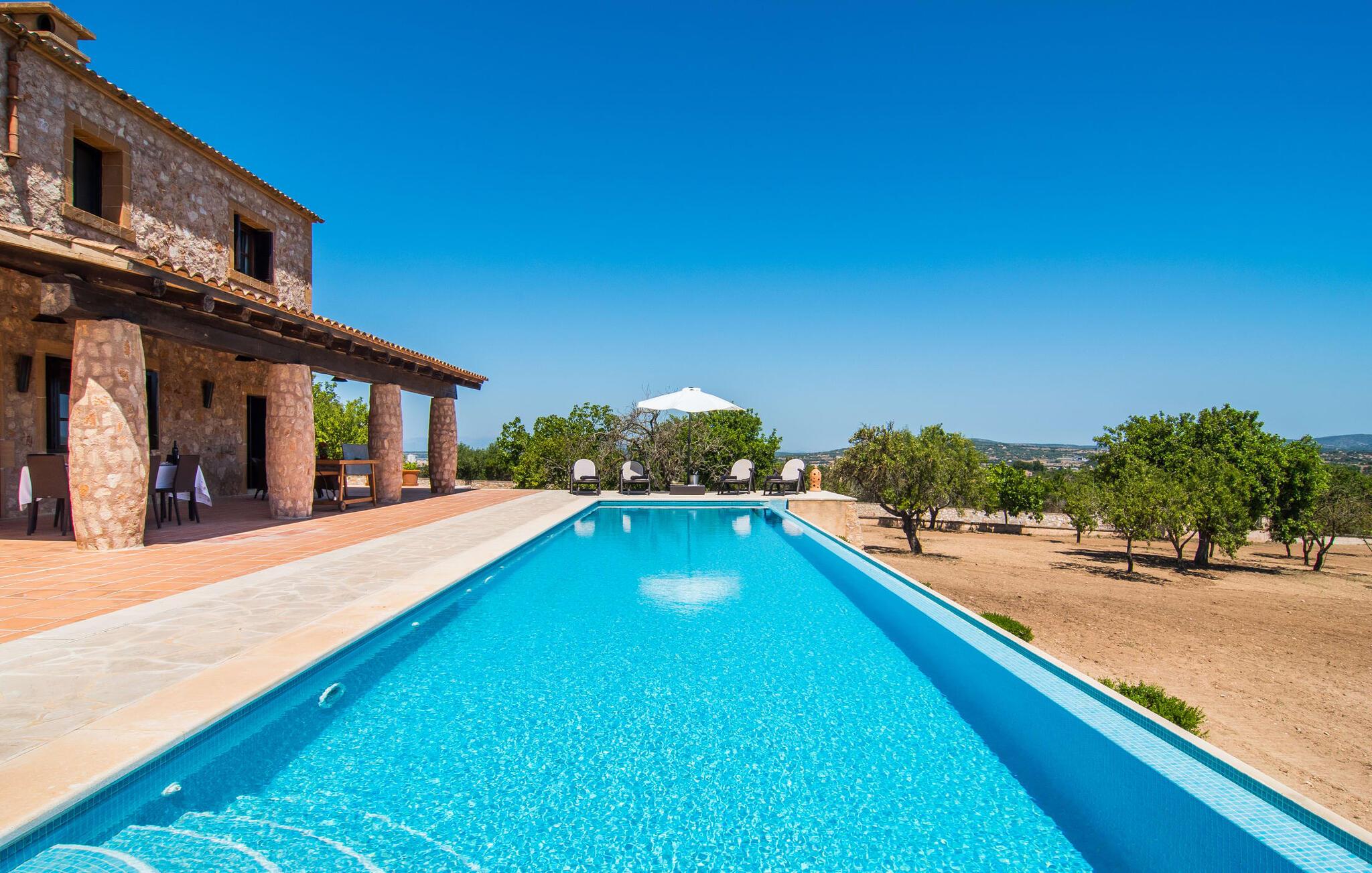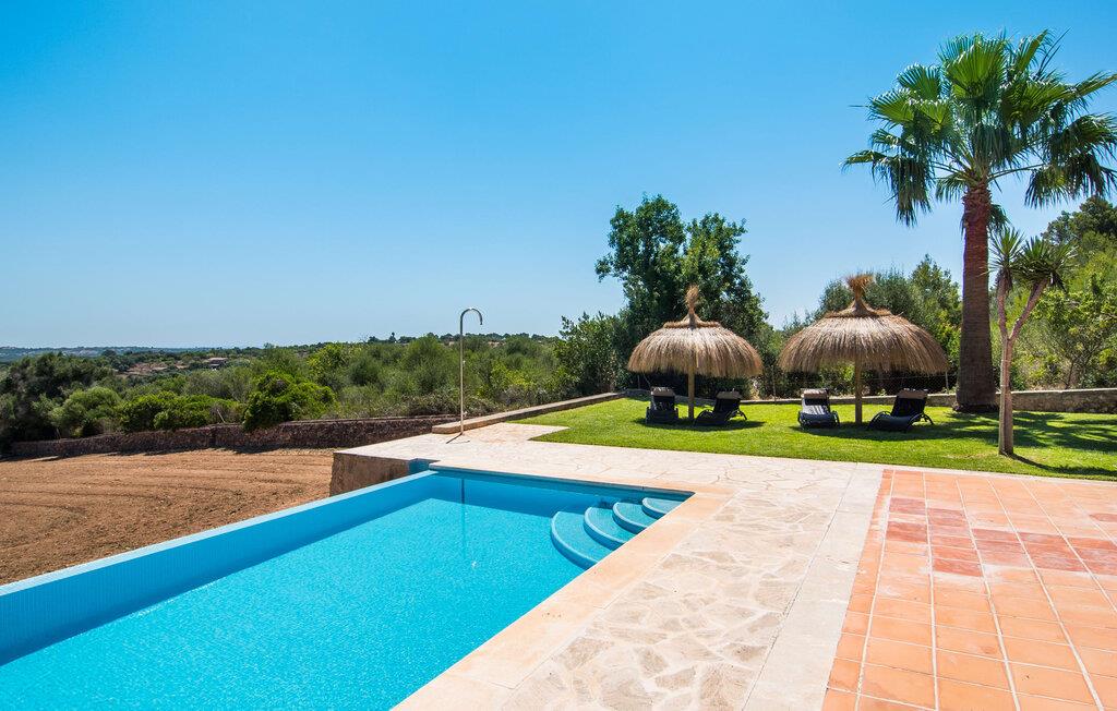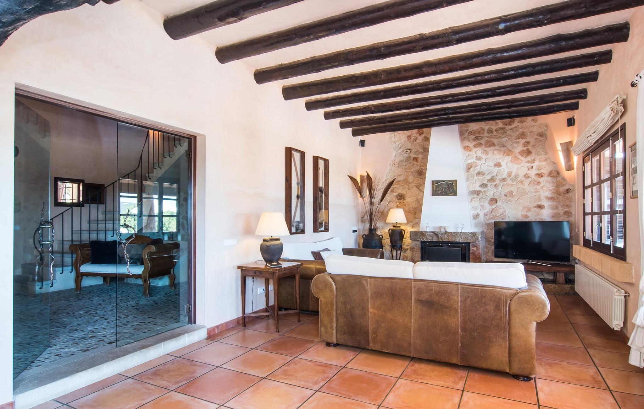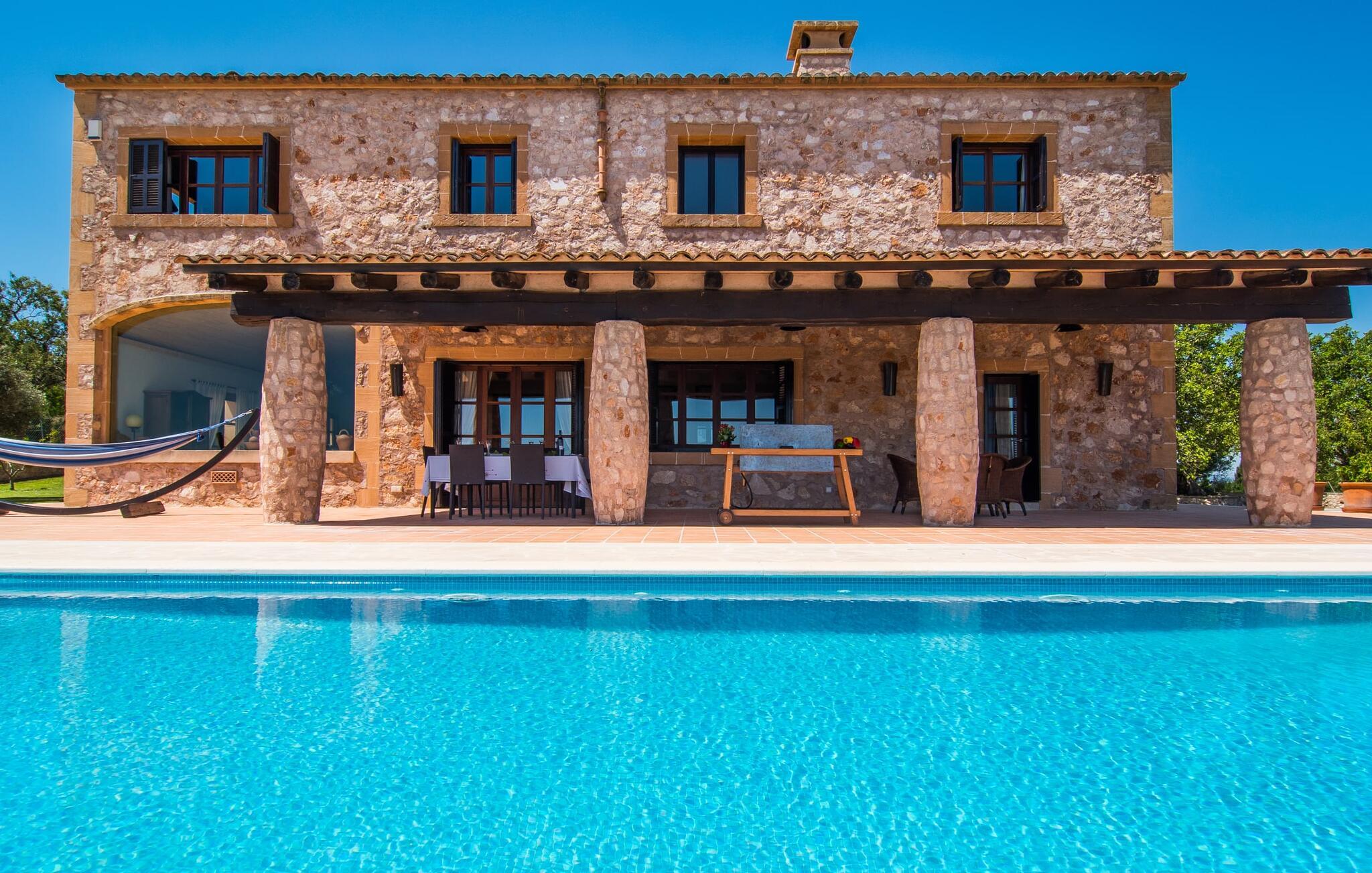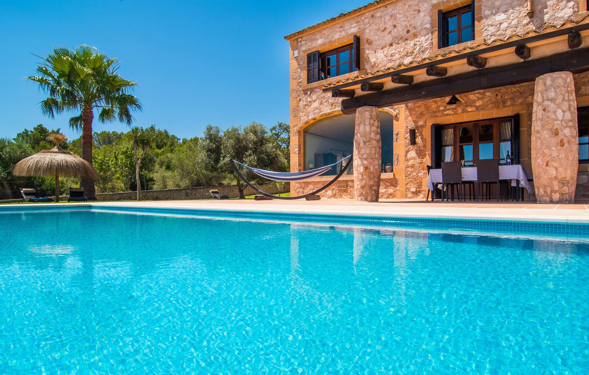 Den smukke finca "Turonet", beliggende på østsiden af øen, tilbyder jer det perfekte hjem til en ferie med venner eller familie. Det ligger på en 16.000 m² stor grund med en smuk have ved siden af huset. Med næsten 400 m² byder dette imponerende hus på plads til op til 10 personer. Både den bekvemme beliggenhed og den rolige beliggenhed gør denne ejendom til det perfekte udgangspunkt for en afslappende og om ønsket afvekslende ferie. Der er en stor, delvist overdækket terrasse foran huset, som giver tiltrængt skygge om sommeren. Foran den er der en utrolig 15 m pool, der indbyder til at spille mange omgange i den. Den har en behagelig trinindgang. Det er sensationelt at iagttage uendelighedseffekten, der breder sig fra kulissen til landskabet, der ligger for jeres fødder. Da udsynet herfra ikke er spærret af et hegn, mur eller andre genstande, er følelsen af frihed virkelig imponerende. Der er komfortable liggestole på poolterrassen til at slappe af i den lyse middelhavssol. Børn vil helt sikkert have det sjovt med at lege og løbe rundt på de smukke græsplæner på siden af huset. Her kaster palmerne en naturlig skygge på alle tider af døgnet. Gæsterne sætter pris på de delvise nicher og kærligt beplantede terrassearealer omkring huset. Skulle nogen nogensinde føle behov for at trække sig tilbage, vil der ikke være nogen problemer med at finde et hyggeligt sted. Så snart I træder ind i bygningen, vil I ved første øjekast bemærke indretningen af høj kvalitet. I stuen er der to yderst behagelige sofaer og et satellit-tv. På køligere aftener kan I endda slappe af ved pejsen og varmen fra en ild. Den rustikke naturstensvæg foran i denne stue understreger dygtigt den eksklusive atmosfære. Udvalgte dekorationer og de runde loftsbjælker bidrager også til dette. Det generøst store og meget moderne køkken byder på et rundt spisebord, et rustfrit stål køleskab med fryser, en praktisk ø-enhed og en opvaskemaskine. Der er også en lille disk at sidde på. Værelserne med aircondition er rummelige, udstyret med møbler af høj kvalitet og har et meget elegant design. Fraværet af irriterende rod giver disse rum en lys og elegant atmosfære. Soveværelsets højkvalitetsdesign kommer også til sin ret på badeværelserne. Disse er kendetegnet ved en meget individuel, generøs og bestemt altid original, til tider farverig stil. Manacors centrum ligger kun 10 minutter væk i bil. Besøger I Porto Cristo, som kun ligger 10 km væk, anbefaler vi en gåtur langs promenaden ved siden af havnen og en smagsprøve på den baleariske livsstil. Det populære Calas de Mallorca, øens smukkeste strande, er nemt at nå fra villaen. Rafa Nadal Academy ligger kun 8 minutter væk. Efter en anstrengende dag fuld af aktiviteter kan I nyde lidt fred og ro om aftenen, svømme et par strækninger og måske afslutte aftenen med en kulinarisk grill. Komfort med et fremragende pris-ydelsesforhold venter jer i villaen "Turonet". Villa "Turonet" er et usædvanligt luksuriøst feriehus i landlige omgivelser ved siden af Manacor. Panoramaudsigten, som I kan nyde herfra, er simpelthen fantastisk. Den bekvemme beliggenhed gør, at hverdagens indkøb kan klares hurtigt. Der er et ugentligt marked i Manacor hver mandag. De smukke sandstrande på østkysten, Calas de Mallorca, er let tilgængelige med bil.
