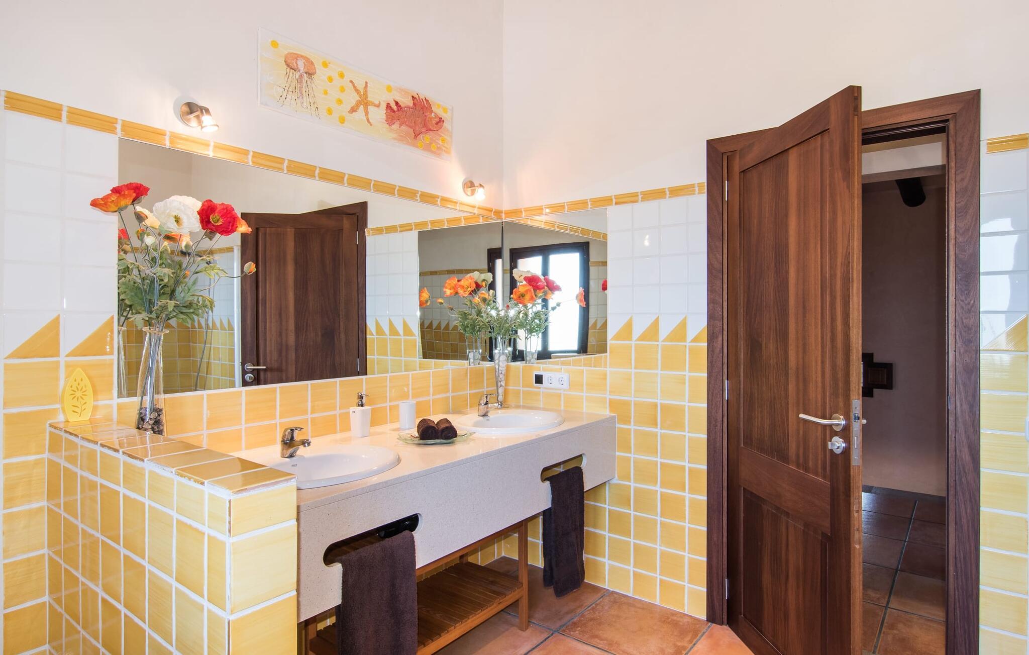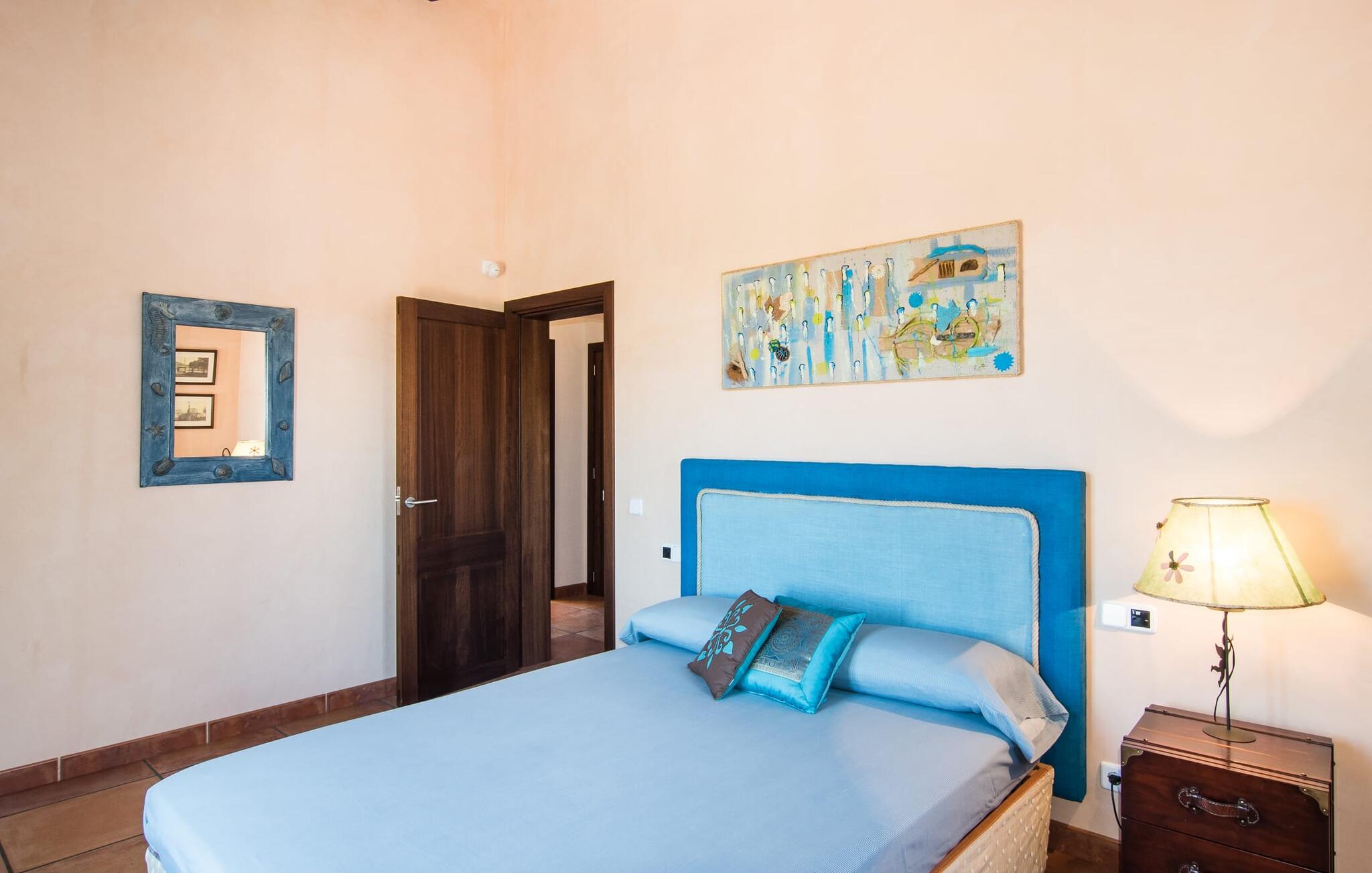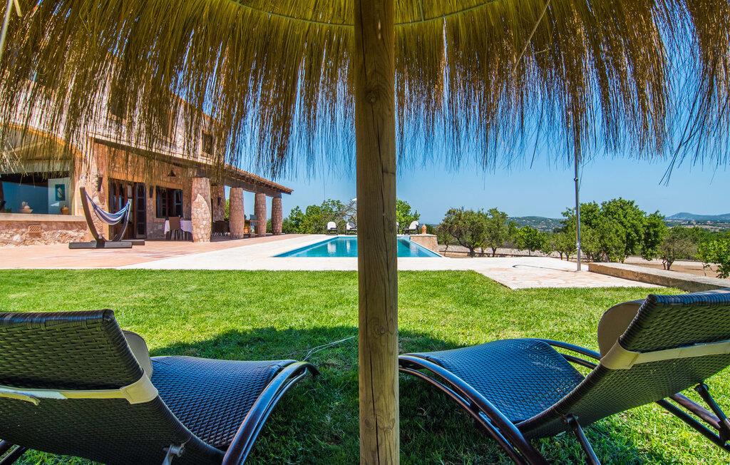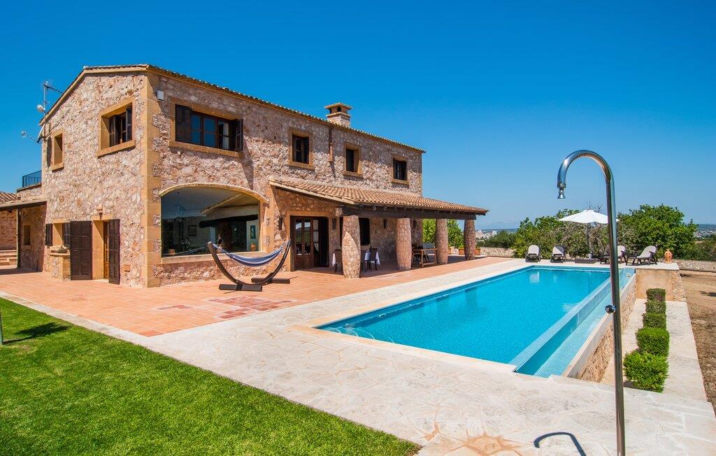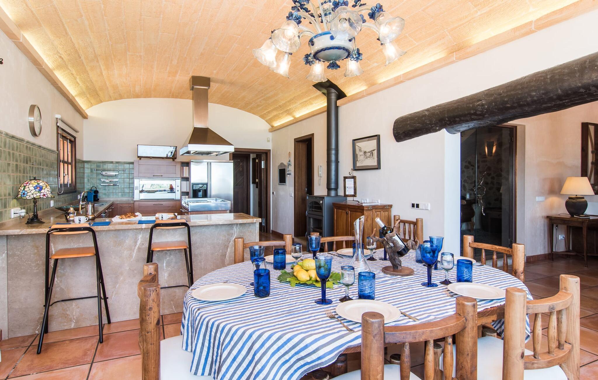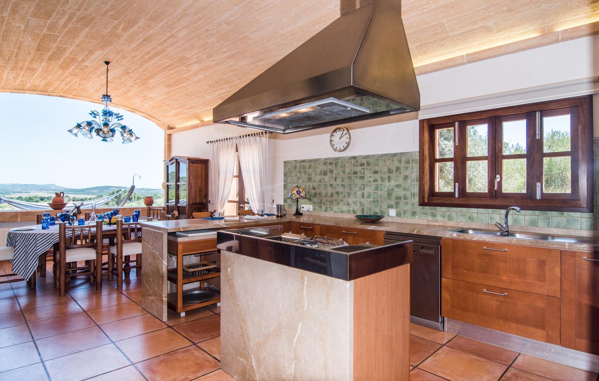 Den smukke finca "Turonet", beliggende på østsiden af øen, tilbyder jer det perfekte hjem til en ferie med venner eller familie. Det ligger på en 16.000 m² stor grund med en smuk have ved siden af huset. Med næsten 400 m² byder dette imponerende hus på plads til op til 10 personer. Både den bekvemme beliggenhed og den rolige beliggenhed gør denne ejendom til det perfekte udgangspunkt for en afslappende og om ønsket afvekslende ferie. Der er en stor, delvist overdækket terrasse foran huset, som giver tiltrængt skygge om sommeren. Foran den er der en utrolig 15 m pool, der indbyder til at spille mange omgange i den. Den har en behagelig trinindgang. Det er sensationelt at iagttage uendelighedseffekten, der breder sig fra kulissen til landskabet, der ligger for jeres fødder. Da udsynet herfra ikke er spærret af et hegn, mur eller andre genstande, er følelsen af frihed virkelig imponerende. Der er komfortable liggestole på poolterrassen til at slappe af i den lyse middelhavssol. Børn vil helt sikkert have det sjovt med at lege og løbe rundt på de smukke græsplæner på siden af huset. Her kaster palmerne en naturlig skygge på alle tider af døgnet. Gæsterne sætter pris på de delvise nicher og kærligt beplantede terrassearealer omkring huset. Skulle nogen nogensinde føle behov for at trække sig tilbage, vil der ikke være nogen problemer med at finde et hyggeligt sted. Så snart I træder ind i bygningen, vil I ved første øjekast bemærke indretningen af høj kvalitet. I stuen er der to yderst behagelige sofaer og et satellit-tv. På køligere aftener kan I endda slappe af ved pejsen og varmen fra en ild. Den rustikke naturstensvæg foran i denne stue understreger dygtigt den eksklusive atmosfære. Udvalgte dekorationer og de runde loftsbjælker bidrager også til dette. Det generøst store og meget moderne køkken byder på et rundt spisebord, et rustfrit stål køleskab med fryser, en praktisk ø-enhed og en opvaskemaskine. Der er også en lille disk at sidde på. Værelserne med aircondition er rummelige, udstyret med møbler af høj kvalitet og har et meget elegant design. Fraværet af irriterende rod giver disse rum en lys og elegant atmosfære. Soveværelsets højkvalitetsdesign kommer også til sin ret på badeværelserne. Disse er kendetegnet ved en meget individuel, generøs og bestemt altid original, til tider farverig stil. Manacors centrum ligger kun 10 minutter væk i bil. Besøger I Porto Cristo, som kun ligger 10 km væk, anbefaler vi en gåtur langs promenaden ved siden af havnen og en smagsprøve på den baleariske livsstil. Det populære Calas de Mallorca, øens smukkeste strande, er nemt at nå fra villaen. Rafa Nadal Academy ligger kun 8 minutter væk. Efter en anstrengende dag fuld af aktiviteter kan I nyde lidt fred og ro om aftenen, svømme et par strækninger og måske afslutte aftenen med en kulinarisk grill. Komfort med et fremragende pris-ydelsesforhold venter jer i villaen "Turonet". Villa "Turonet" er et usædvanligt luksuriøst feriehus i landlige omgivelser ved siden af Manacor. Panoramaudsigten, som I kan nyde herfra, er simpelthen fantastisk. Den bekvemme beliggenhed gør, at hverdagens indkøb kan klares hurtigt. Der er et ugentligt marked i Manacor hver mandag. De smukke sandstrande på østkysten, Calas de Mallorca, er let tilgængelige med bil.