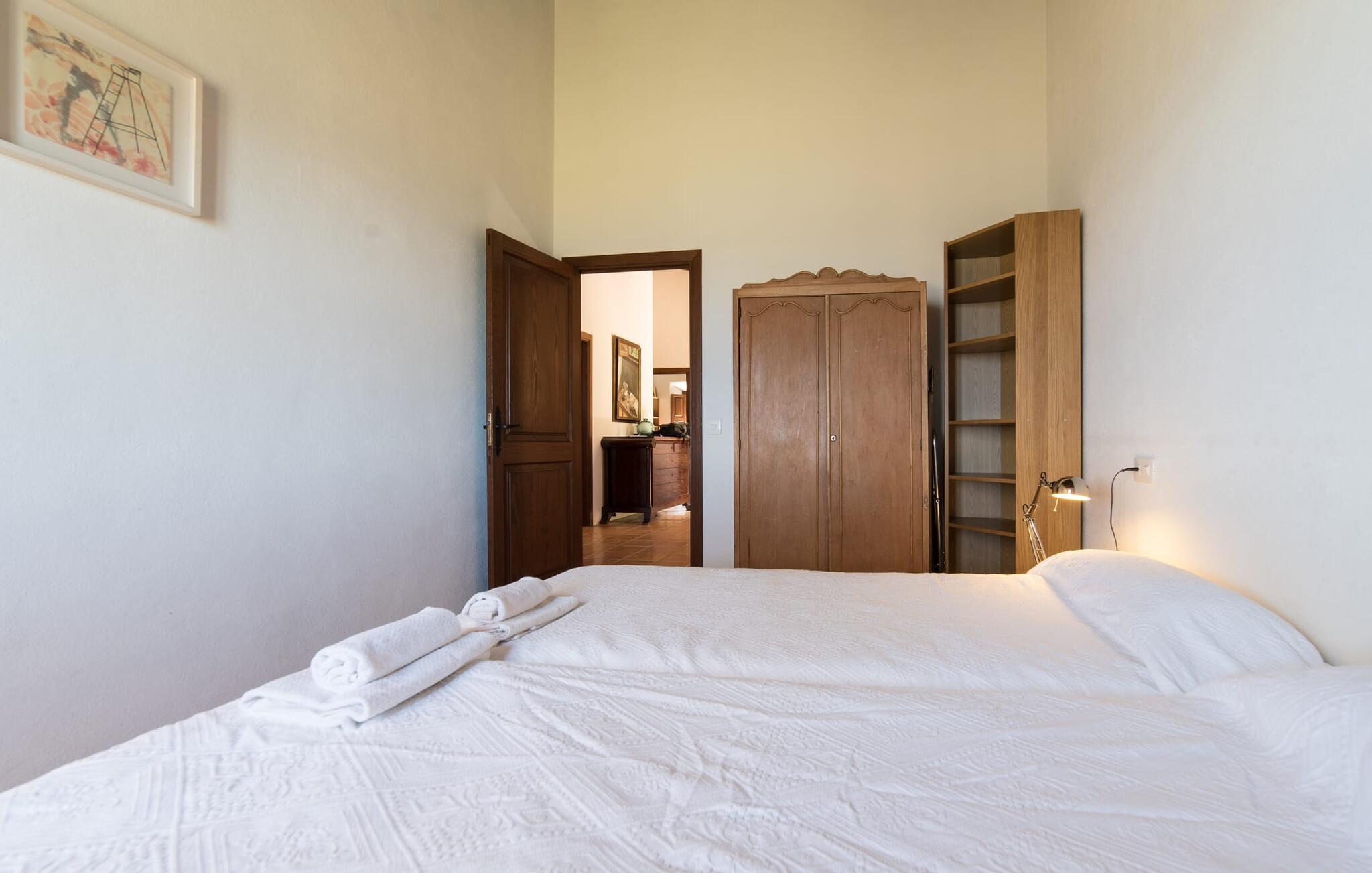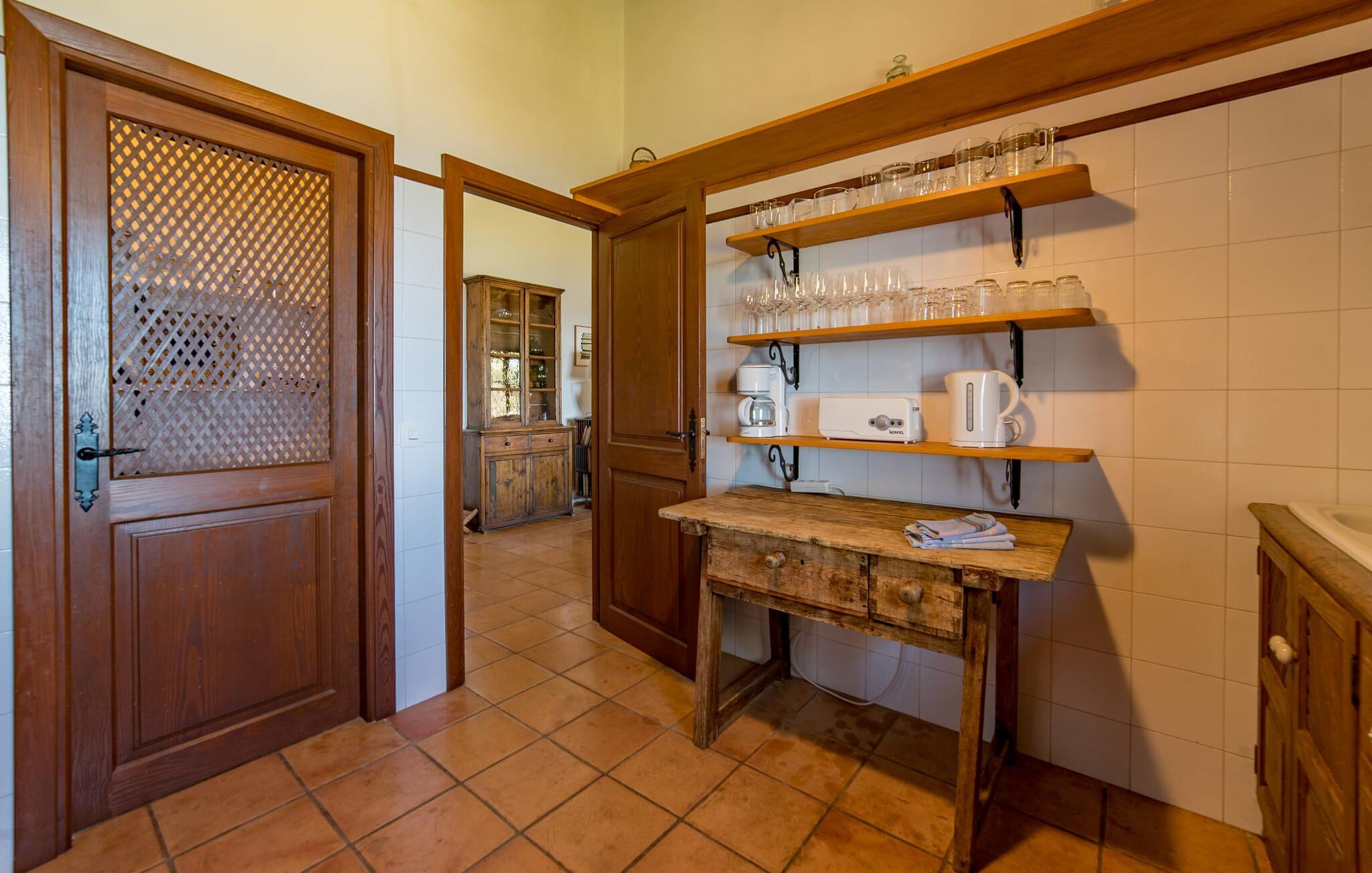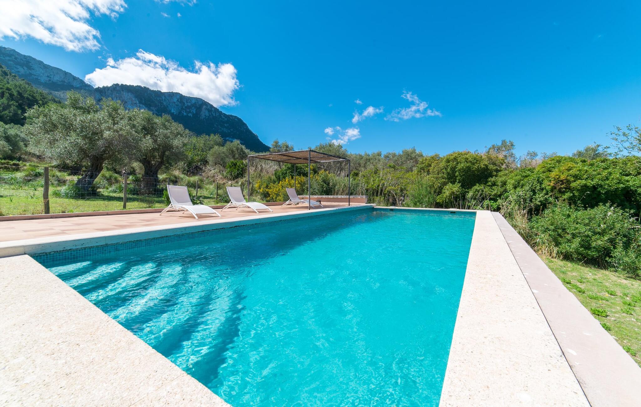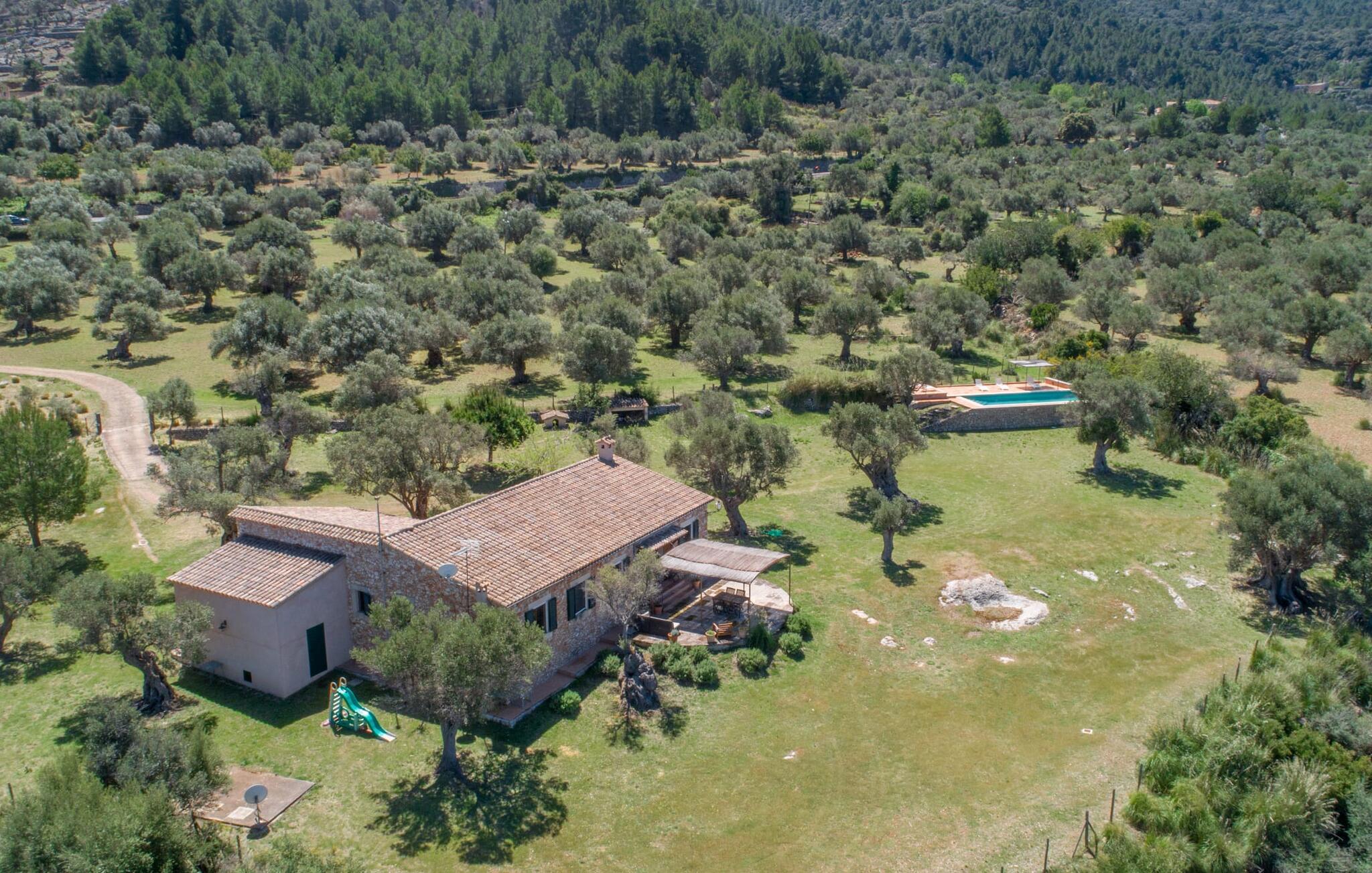 Når I træder ind på Villa Vidals grund, vil I straks fornemme den autentiske atmosfære, der omgiver denne ejendom. Gamle oliventræer hviler op ad huset, som delvist er bygget med natursten, og formidler straks en hyggelig atmosfære. Den rustikke karakter bekræftes, når I går gennem den labyrintlignende villa. Forskellige delvist overdækkede terrasseområder lægger op til at slappe af og nyde den storslåede udsigt. Der er også forskellige komfortable siddepladser og et solidt spisebord, hvor I også kan nyde morgenmaden under åben himmel, hvis I ønsker det. nogle få skridt fra huset, let hævet, ligger en rektangulær pool med en tilstødende, delvist overdækket, flisebelagt terrasse med liggestole. Herfra kan jeres blik feje langt ud over det dybblå hav - eller i en anden retning, til de omkringliggende, imponerende, stort set skovklædte bjerge. Da det ikke er muligt at se ejendommen udefra, kan I bevæge jer helt uforstyrret rundt og nyde den smukkeste tid på året, som I finder det passende.