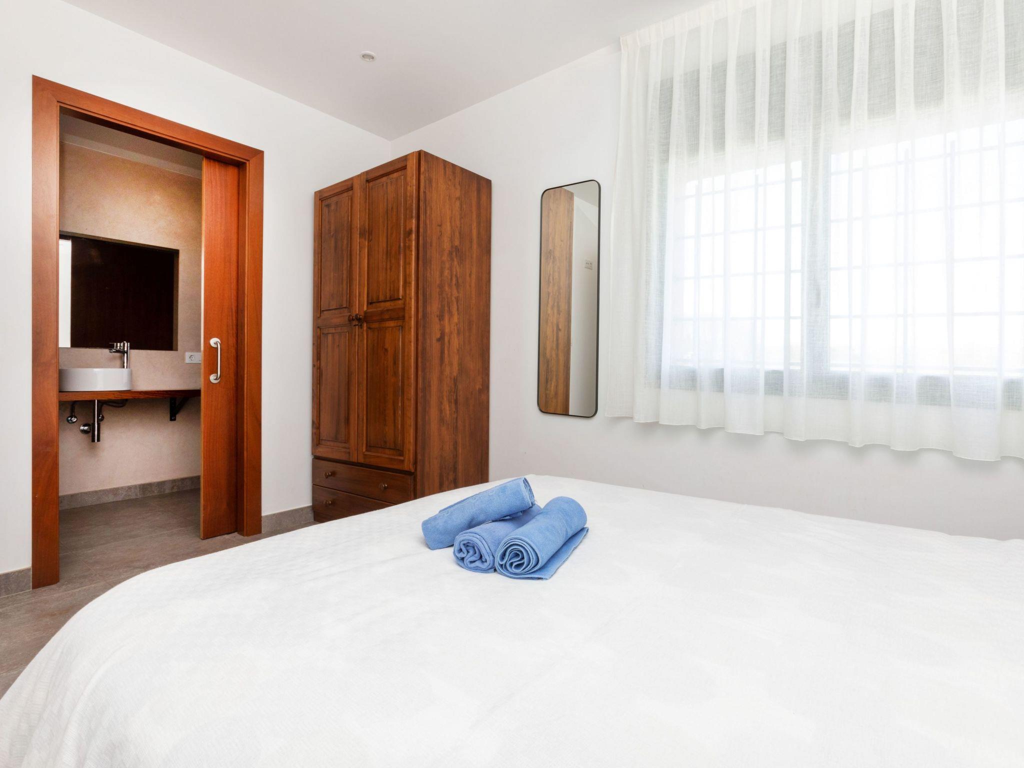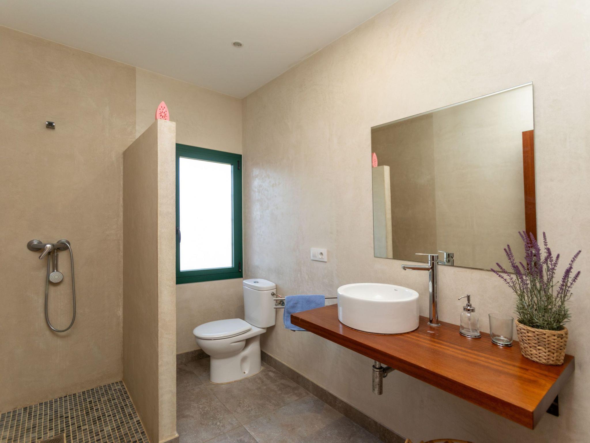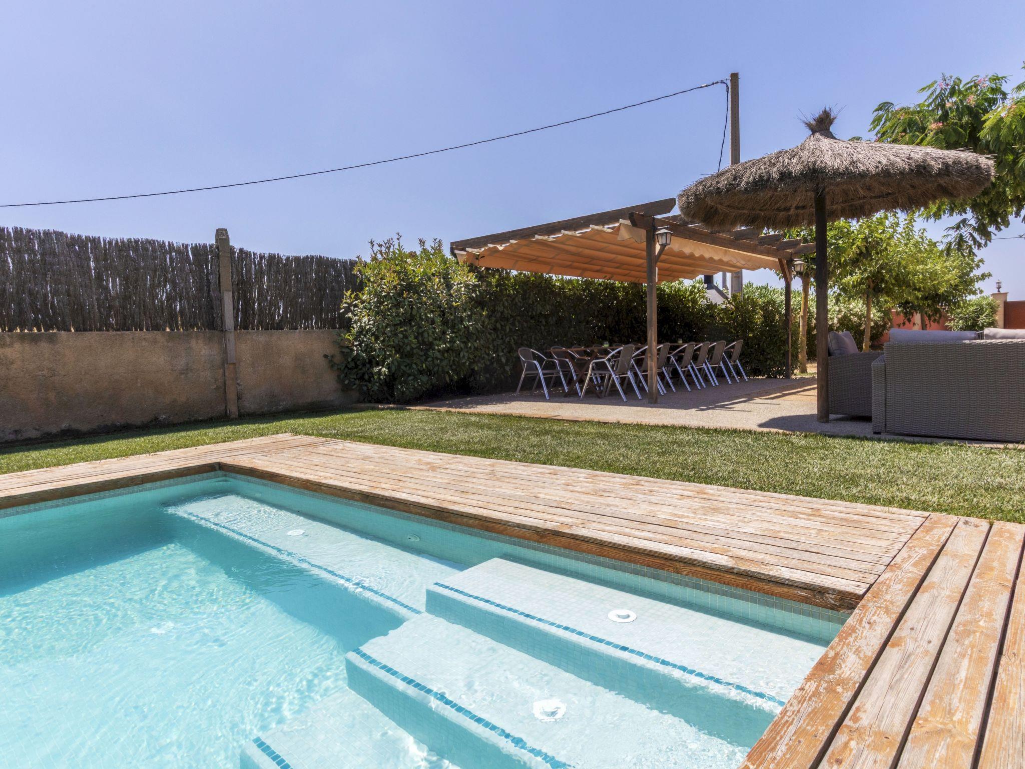 "Can Borni", 8-room farmhouse 252 m2. Spacious, comfortable and cosy furnishings: living/dining room with open-hearth fireplace, dining table and digital TV. Exit to the patio, to the swimming pool. Kitchen (oven, dishwasher, 4 ceramic glass hob hotplates, toaster, kettle, microwave, freezer, electric coffee machine). Shower/WC, sep. WC. Electric heating, forced-air heating. On the lower ground floor: gallery with digital TV. 4 double bedrooms, each room with 1 french bed (150 cm, length 190 cm), shower/WC. 1 room with 3 beds (90 cm, length 190 cm). 1 double bedroom with 1 french bed (150 cm, length 190 cm). 1 room with 1 bed (90 cm, length 190 cm), 1 french bed (150 cm, length 190 cm). Shower/WC. Terrace furniture, barbecue, deck chairs, covered balcony. View of the mountains and the resort. Facilities: washing machine, iron, children's high chair, baby cot for up to 2 year olds, hair dryer. Internet (WiFi, free). Parking (fenced 5 cars) at the house. Please note: maximum 2 small pets/ dogs allowed. TV only ES. HUTG-029159 // Reg. Nr.: ESFCTU00001701800080424500000000000000000HUTG-0291597