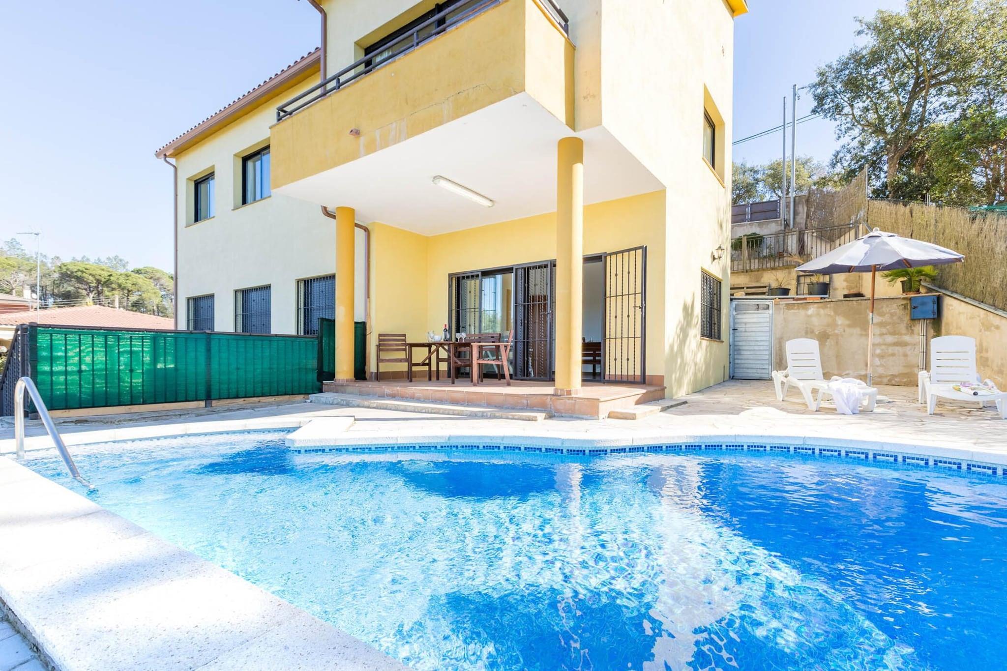 Denne komfortable villa tilbyder et fredeligt tilflugtssted kun 9 km fra de pulserende strande i Lloret de Mar, beliggende i et roligt område, der er ideelt for familier. Villaen har plads til 8 gæster og har 4 rummelige soveværelser, herunder to værelser med dobbeltsenge og to værelser med to enkeltsenge. Stuen er hyggelig og udstyret med et tv, perfekt til at slappe af efter en dag med udforskning. Det fuldt udstyrede køkken indeholder køleskab, fryser, mikroovn, ovn, keramisk kogeplade, opvaskemaskine og vaskemaskine, som giver alt hvad du behøver for et behageligt ophold. Der er gratis trådløs internetadgang overalt på ejendommen. Udenfor har villaen en privat swimmingpool, en stor terrasse med udsigt over bjergene og en indbygget grill, der skaber et perfekt sted til udendørs spisning og afslapning. Ejendommen tilbyder også en udendørs parkeringsplads for din bekvemmelighed. Det omkringliggende område er fredeligt og tilbyder privatliv og en rolig atmosfære. Kæledyr er tilladt efter forudgående anmodning mod et ekstra gebyr. Villaen er designet udelukkende til familier, med en politik, der ikke accepterer grupper af unge under 35 år. Villaens beliggenhed giver mulighed for nem adgang til lokale faciliteter, med et supermarked kun 1,5 km væk. De berømte strande i Lloret de Mar er kun en kort køretur væk, og tilbyder en række aktiviteter og attraktioner. For familier med små børn er valgfri barnesenge og høje stole tilgængelige mod et ekstra gebyr. Sengetøj og håndklæder leveres mod et ekstra gebyr, hvilket sikrer et bekvemt og problemfrit ophold for alle gæster.