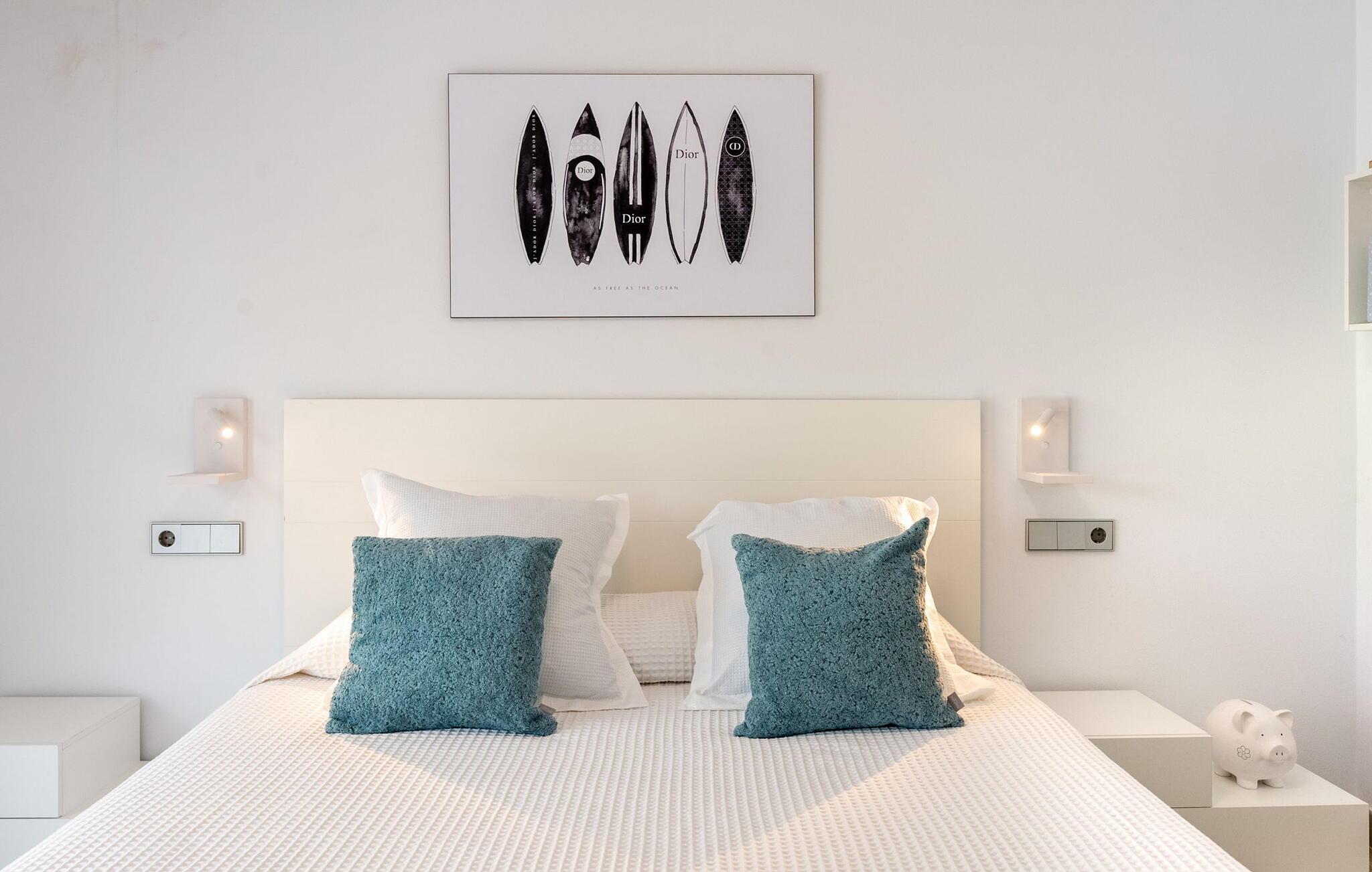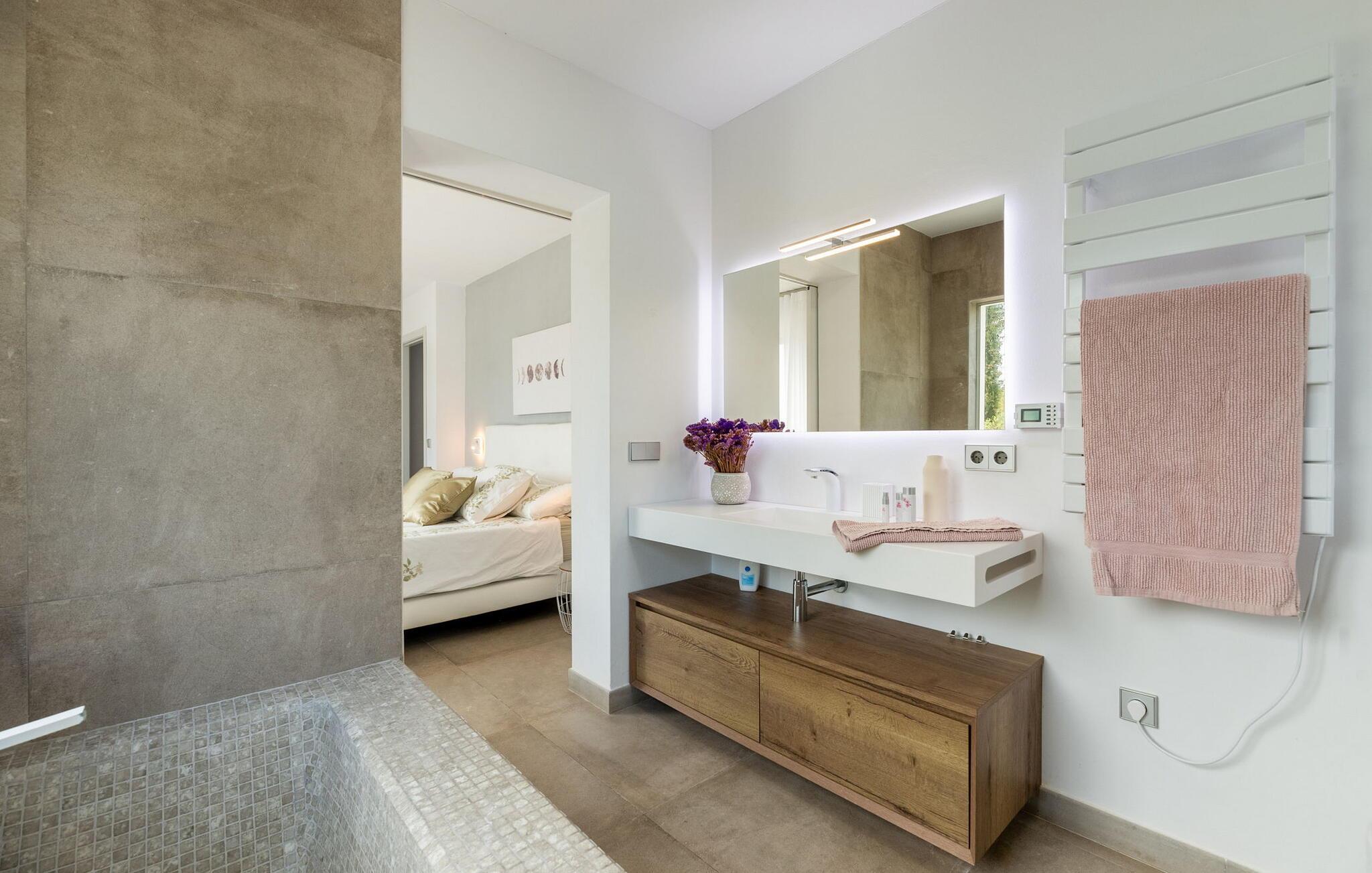Smukt hus i et meget roligt område omgivet af landskab i den østlige del af øen. Det er tæt på Ibizas golfbane og familiestranden Cala Llonga, som byder på et bredt udvalg af restauranter. Dette er et Fincallorca feriehus. Huset er fordelt på en etage og har: Stor stue med TV og bord med plads til 8 personer og adgang til poolområdet, fuldt udstyret separat køkken med udgang til haven, toilet, soveværelse med en-suite badeværelse med badekar med udsigt over haven fra badekarret. Der er et soveværelse med en dobbeltseng og et privat badeværelse med bruser, et soveværelse med en dobbeltseng (der er to 0,90 m senge, de kan skilles ad) og et privat badeværelse med bruser. Villaen har en stor have med pool, en balinesisk seng til to og sækkestole. Terrassen har en udendørs spiseplads og en kulgrill. Minimum ophold 7 nætter fra lørdag til lørdag. Grundlæggende midtuge rengøring er inkluderet i prisen.