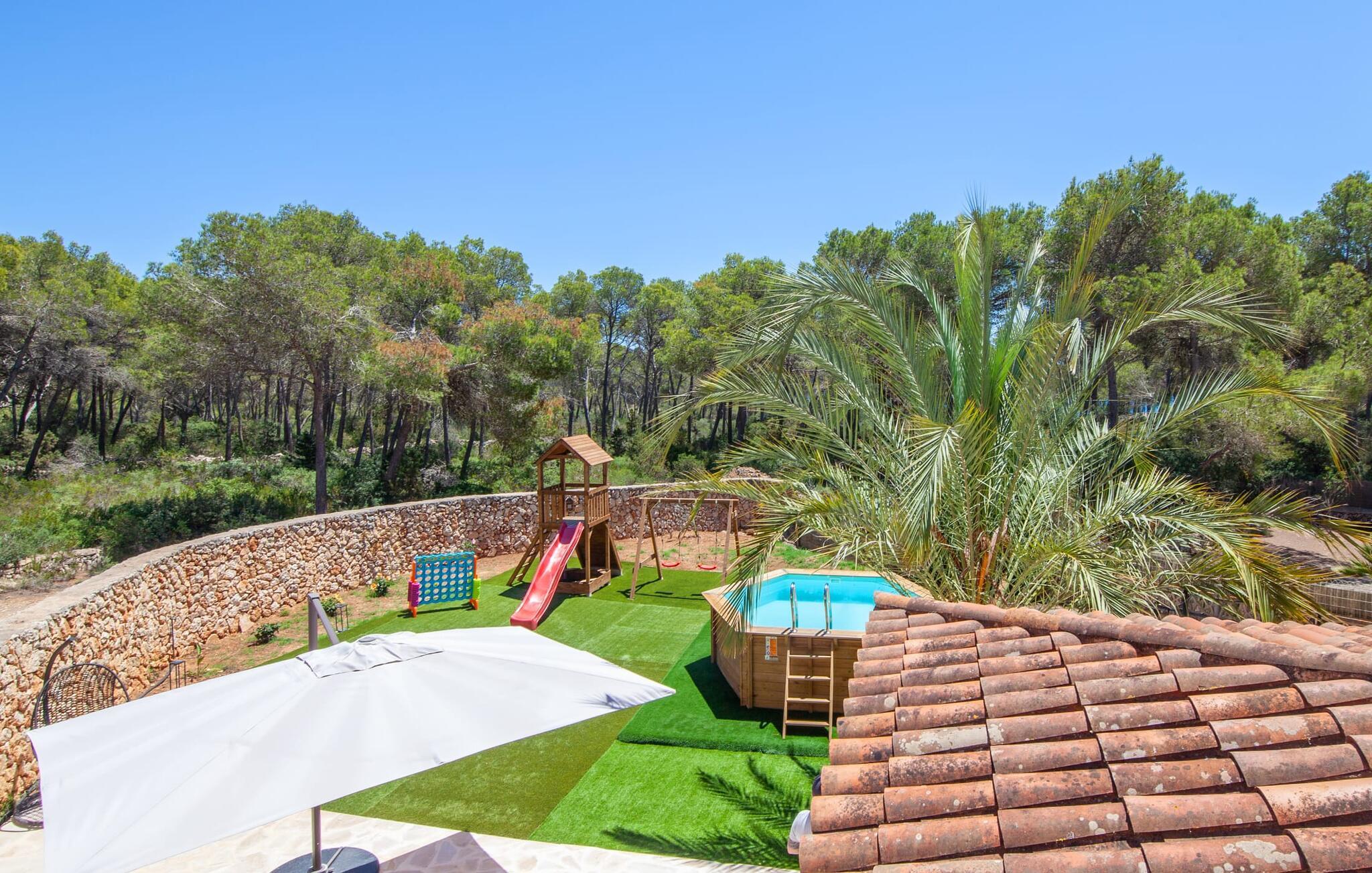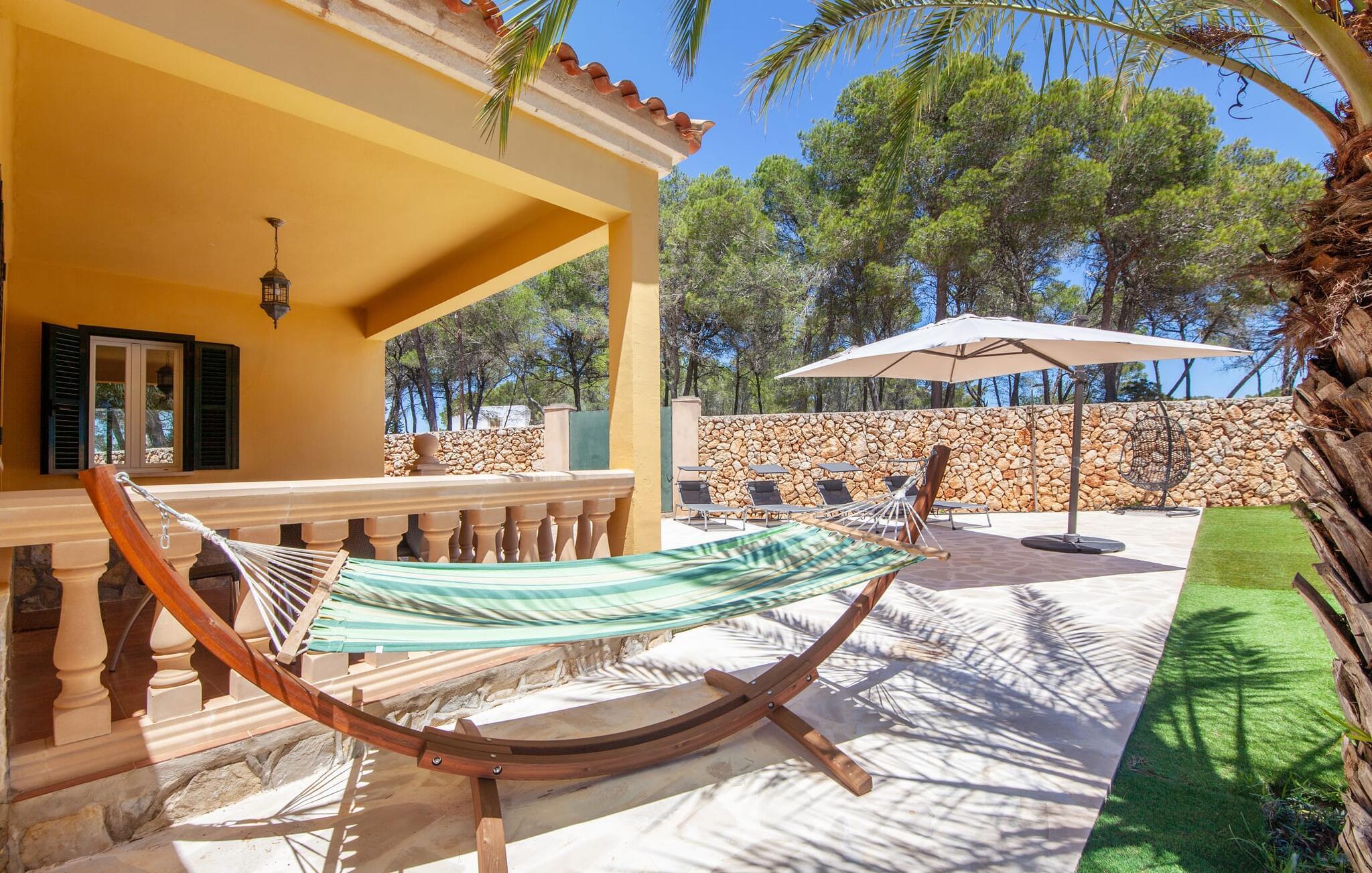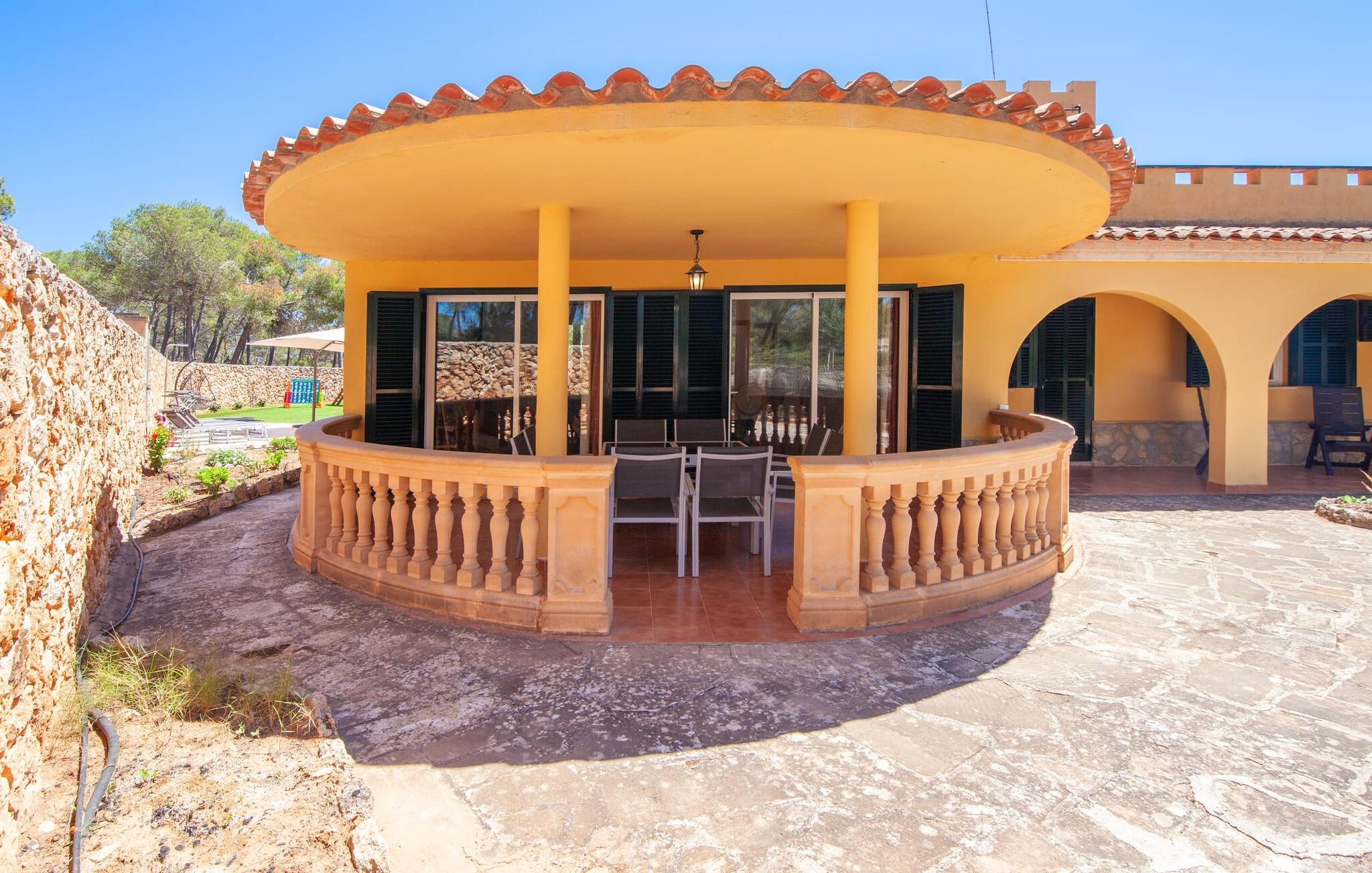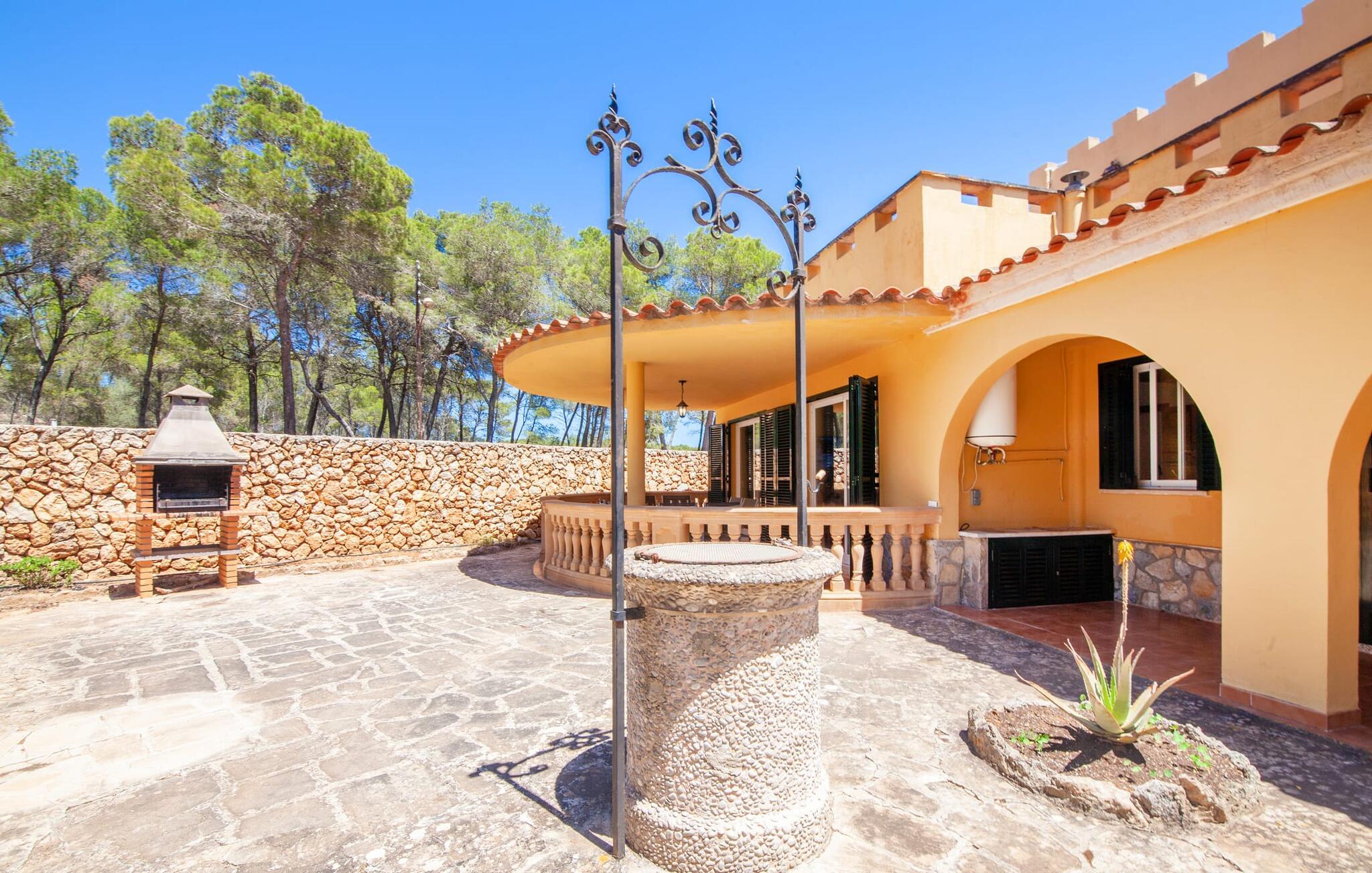 Elsker I natur og strande? Er jeres yndlingspool det åbne hav? Så led ikke længere, for med Villa “del Mar” har I fundet jeres ideelle sommerhus. Placeringen af fincaen midt i Parc natural de Mondragó er simpelthen uvurderlig. Smukke vandrestier gennem parken begynder lige uden for dørene til fincaen. Det er kun få meter til postkortstranden Cala Mondragó. I bugten omgivet af fyrreskove kan I tilbringe en dejlig dag på stranden med alle bekvemmeligheder. Der er restauranter og strandbarer samt brusere, toiletter, parasoller og liggestole. Cala Mondragó er den midterste af de tre strande i naturparken. Den nærliggende bugt S'Amarador kan nemt nås til fods via en kyststi og Calo des Borgit gennem fyrreskoven. Uanset hvilken bugt I vælger, vil I være en af de første til at besøge om morgenen og en af de sidste til at besøge om aftenen. I kan undgå stress og jag på klassisk vis med en siesta på jeres fincas smukke haveterrasse. Her finder I komfortable liggestole og en stor parasol. I kan også nyde jeres måltider sammen i fred og ro i skyggen af den overdækkede, halvcirkelformede terrasse. Afhængigt af vindretningen kan aftenunderholdningen på et hotelkompleks på Cala Barca høres. Børneunderholdningen der kan perfekt integreres i jeres eget familieprogram om aftenen. På varme sommeraftener frister de nu øde bugter igen. En svømmetur i måneskin i havet eller en flaske vin på stranden er romantiske muligheder. Villaen har fire soveværelser og er velegnet til op til otte personer og to babyer. I stueetagen er der en stor stue og spisestue, det åbne køkken, to soveværelser med hver to enkeltsenge, et soveværelse med en dobbeltseng og to badeværelser. Et andet soveværelse med dobbeltseng med enkeltsenge og et badeværelse er ovenpå. Herfra har I også udgang til en rummelig tagterrasse, perfekt til solbadning. Alle værelser er lyst malede og funktionelt indrettede. I stuen kan I slappe af på to komfortable sofaer eller slappe af i en af de komfortable gyngestole og læse jeres feriebog. Et stort fladskærms-tv på væggen sørger for, at intet står i vejen for afslappede filmaftener. I de køligere årstider kan I gøre jer hyggelig og varm ved hjælp af pejsen. Køkkenet er fuldt udstyret med køle-fryseskab, komfur, ovn, mikroovn, opvaskemaskine, kaffemaskine og brødrister og byder også på masser af opbevaringsplads. Badeværelserne er funktionelle og moderne. I behøver ikke at medbringe en hårtørrer, da der er to til jeres rådighed. Vælger I Villa del Mar, bør I være strand- og naturelsker. I kan finde masser af både i naturreservatet og lige uden for døren. De smukke bugter Cala Mondragó og Calo des Borgit kan nås på få minutter til fods gennem fyrreskoven. Det er næppe længere til S'Amarador-stranden via en kyststi. Herfra fører stien rundt om Cape Punta de ses Gatoves til den lille klippebugt Caló d'en Perdiu og videre til Cape es Blanquer. Den farverige kulisse i fiskerlandsbyen Cala Figuera er heller ikke langt væk. Sidst på eftermiddagen er ankomst og losning af fiskerbådene et helt særligt højdepunkt. Den nærliggende by Santanyí er også farverig om onsdagen og lørdagen, mens i Cala d'Or (7 km) er de klassiske hvide og flade, kubiske former i den ibizaanske arkitektoniske stil fremherskende. Villa del Mar er omgivet af fyrreskove og ligger i det smukke landskab i Parc natural de Mondragó. De tre bugter Cala Mondragó, S'Amarador og Calo des Borgit ligger alle inden for få minutters gang og er blandt de smukkeste strande på øen. Cala d'Or ligger kun 7 km væk, hvor I vil finde adskillige butikker, supermarkeder, gode restauranter og barer. Aircondition i ejendommen er inkluderet i prisen, men dets brug er begrænset til 22:00 til 06:00.