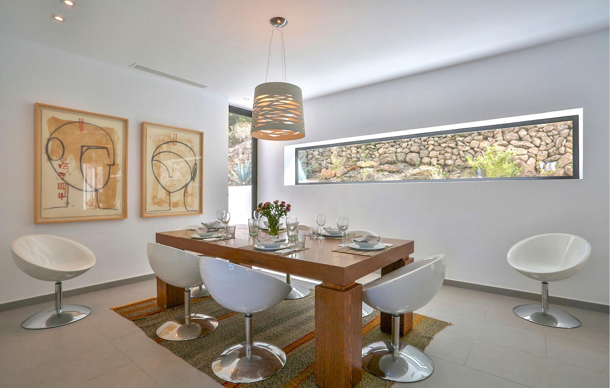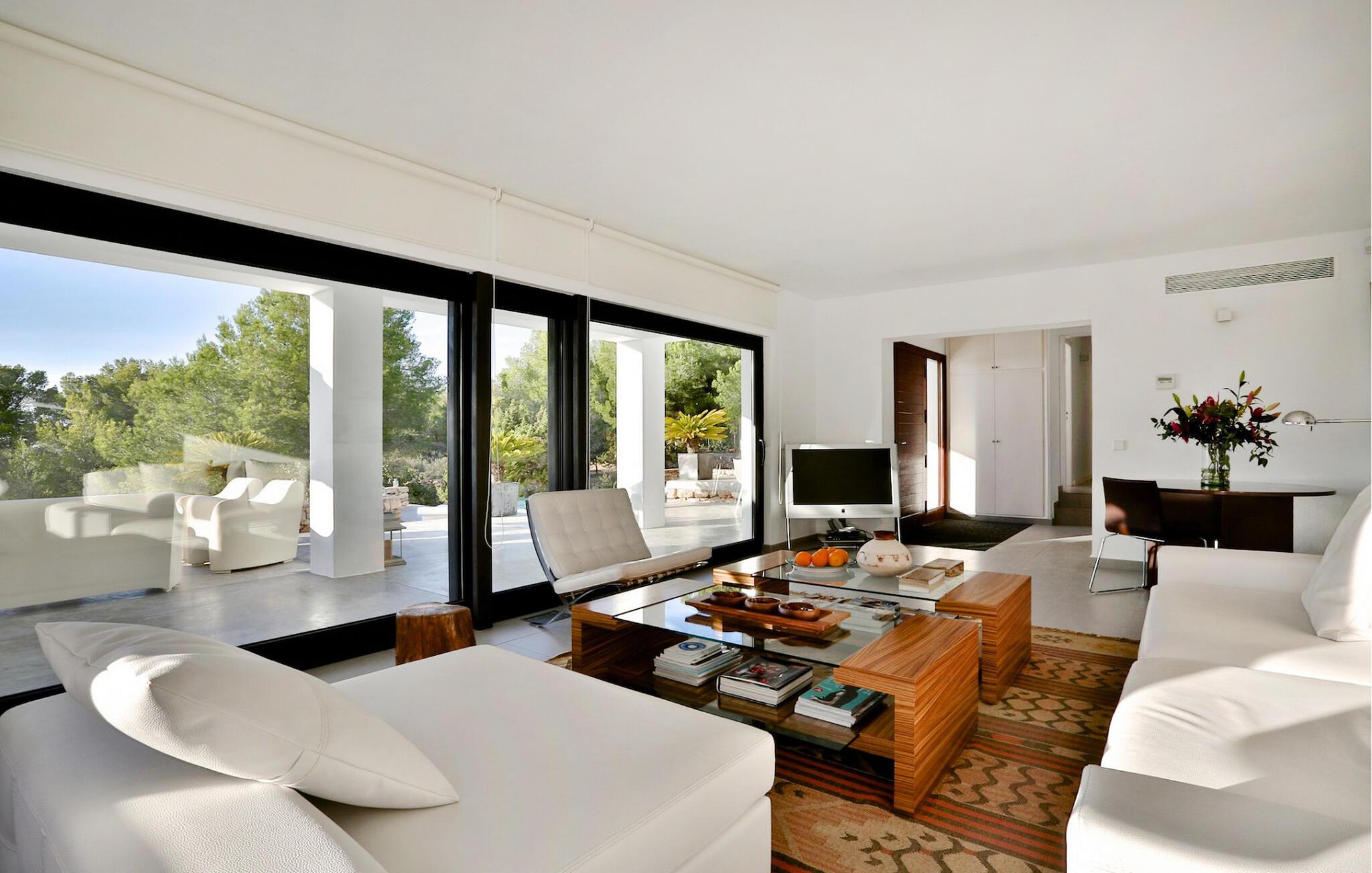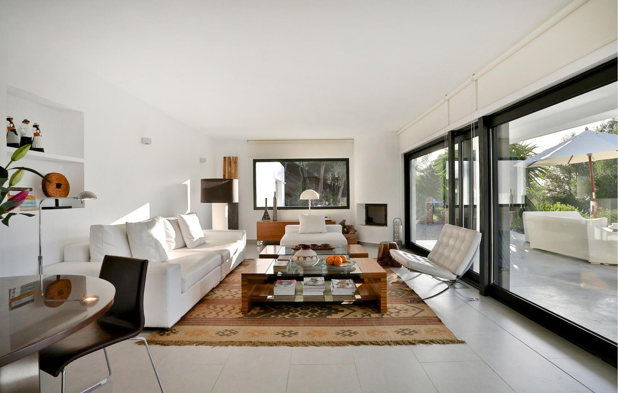 Denne storslåede villa er fordelt på 2 etager og byder på en storslået udsigt over havet, solnedgangen og bugten Cala Tarida, på Ibizas maleriske vestkyst. Dette er et Fincallorca feriehus. Omgivet af en grund på 5000m2, har denne 300m2 bygget villa 3 soveværelser med dobbeltsenge (1,80 x 2m eller 2x2m) og et med 2 enkeltsenge, alle velindrettede, rummelige og lyse med store indbyggede skabe. Der er i alt 4 badeværelser, 3 med bruser og 1 med badekar. Et af dobbeltværelserne har separat indgang fra terrassen og en-suite badeværelse med bruser, hvilket gør det ideelt for alle i gruppen, der ønsker lidt mere plads og privatliv. Stuen har moderne faciliteter såsom satellit-tv, hjemmebiograf og WiFi og tilbyder direkte adgang til terrassen. Køkkenet er fuldt udstyret til nutidens livsstil, med vaskemaskine, tørretumbler, køleskab og opvaskemaskine, for at nævne nogle af de mange faciliteter. Denne villa har aircondition og centralvarme. Den er udstyret med solpaneler. Udenfor finder vi en smuk infinity-pool med saltvand, der måler 10m x 6m. Der er markiser til at skabe skyggefulde områder og en udendørs spiseplads under en romantisk pergola. Der er en grill og endda et chill out område til at slappe af efter jeres måltid. Baggrunden af fyrreskove og en betagende udsigt over Middelhavet gør denne villa til et perfekt sted at nyde de varme aftener i autentisk Ibiza-stil. Priserne inkluderer komplet rengøring hver 7. nat med skift af sengelinned og håndklæder. Daglig rengøring (3 timer) undtagen søndage, med håndklædeskift i løbet af ugen. GRILLEN KAN IKKE ANVENDES I JULI OG AUGUST.