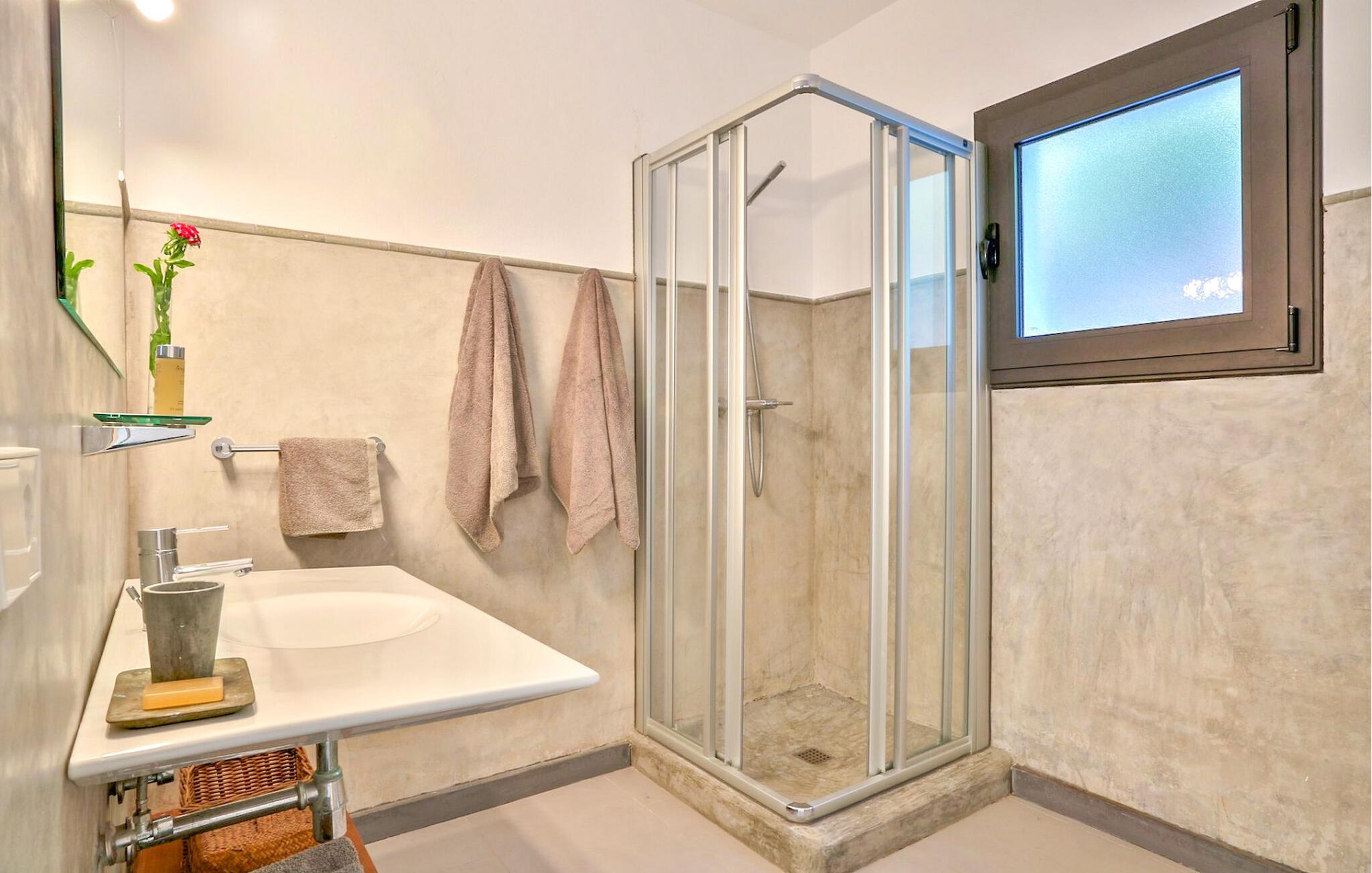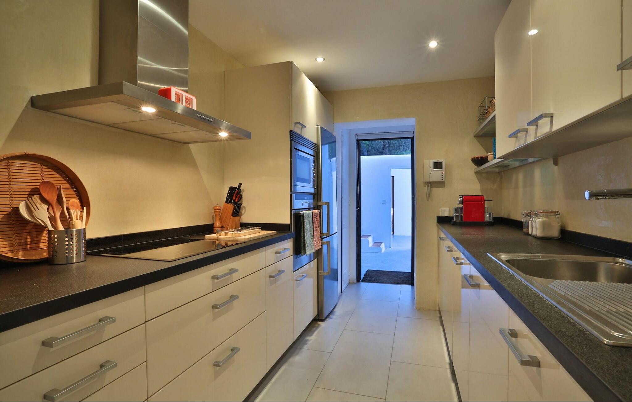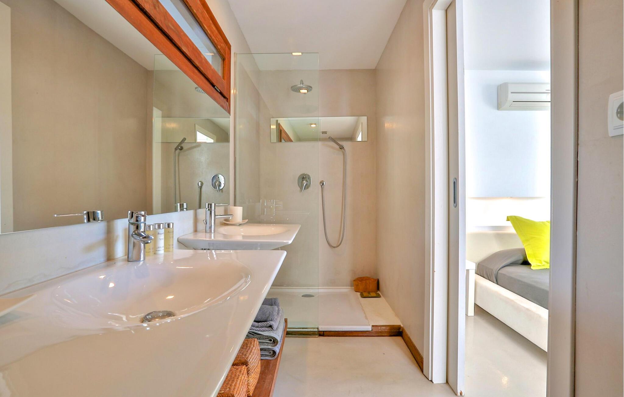 Denne storslåede villa er fordelt på 2 etager og byder på en storslået udsigt over havet, solnedgangen og bugten Cala Tarida, på Ibizas maleriske vestkyst. Dette er et Fincallorca feriehus. Omgivet af en grund på 5000m2, har denne 300m2 bygget villa 3 soveværelser med dobbeltsenge (1,80 x 2m eller 2x2m) og et med 2 enkeltsenge, alle velindrettede, rummelige og lyse med store indbyggede skabe. Der er i alt 4 badeværelser, 3 med bruser og 1 med badekar. Et af dobbeltværelserne har separat indgang fra terrassen og en-suite badeværelse med bruser, hvilket gør det ideelt for alle i gruppen, der ønsker lidt mere plads og privatliv. Stuen har moderne faciliteter såsom satellit-tv, hjemmebiograf og WiFi og tilbyder direkte adgang til terrassen. Køkkenet er fuldt udstyret til nutidens livsstil, med vaskemaskine, tørretumbler, køleskab og opvaskemaskine, for at nævne nogle af de mange faciliteter. Denne villa har aircondition og centralvarme. Den er udstyret med solpaneler. Udenfor finder vi en smuk infinity-pool med saltvand, der måler 10m x 6m. Der er markiser til at skabe skyggefulde områder og en udendørs spiseplads under en romantisk pergola. Der er en grill og endda et chill out område til at slappe af efter jeres måltid. Baggrunden af fyrreskove og en betagende udsigt over Middelhavet gør denne villa til et perfekt sted at nyde de varme aftener i autentisk Ibiza-stil. Priserne inkluderer komplet rengøring hver 7. nat med skift af sengelinned og håndklæder. Daglig rengøring (3 timer) undtagen søndage, med håndklædeskift i løbet af ugen. GRILLEN KAN IKKE ANVENDES I JULI OG AUGUST.