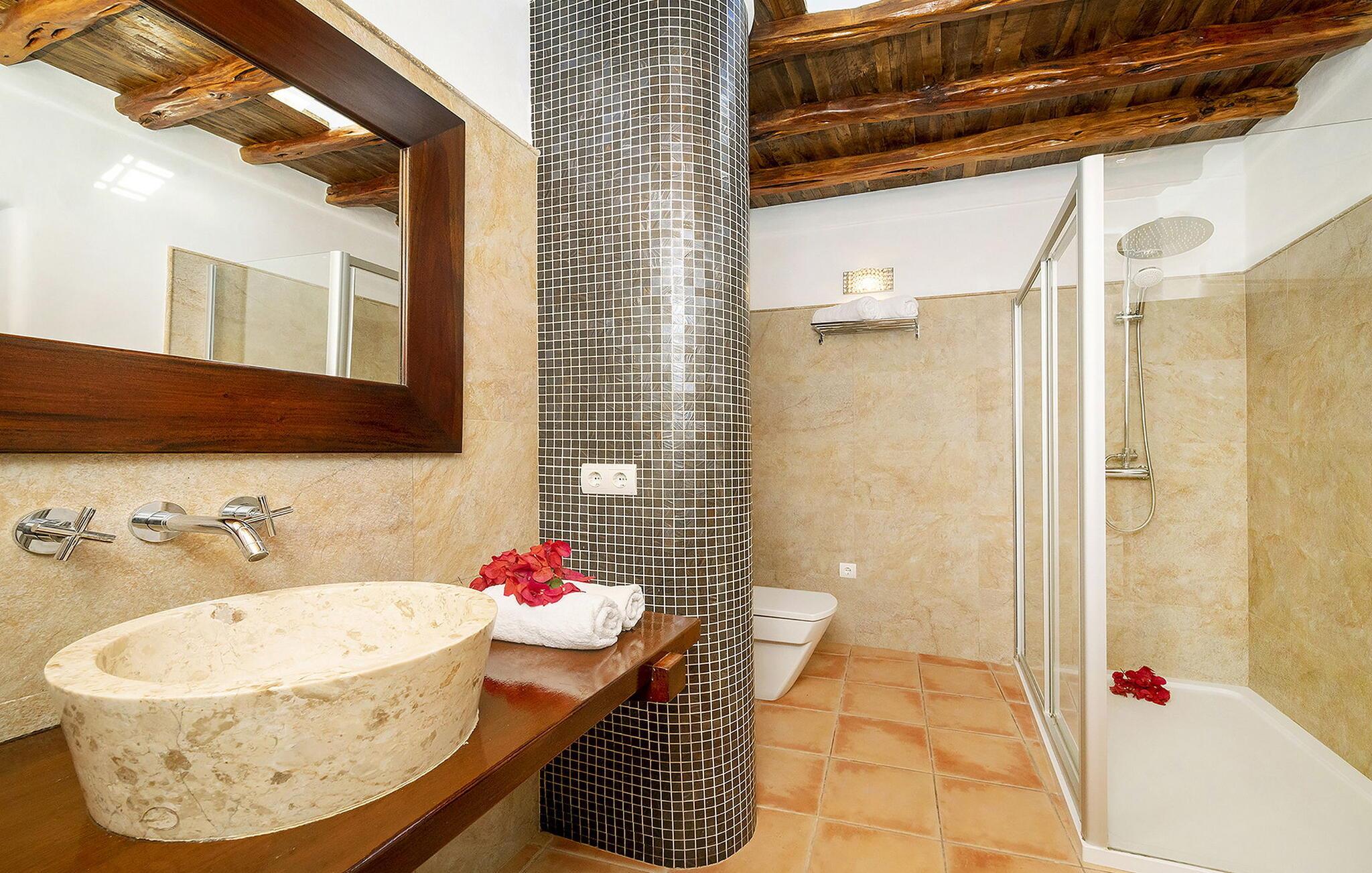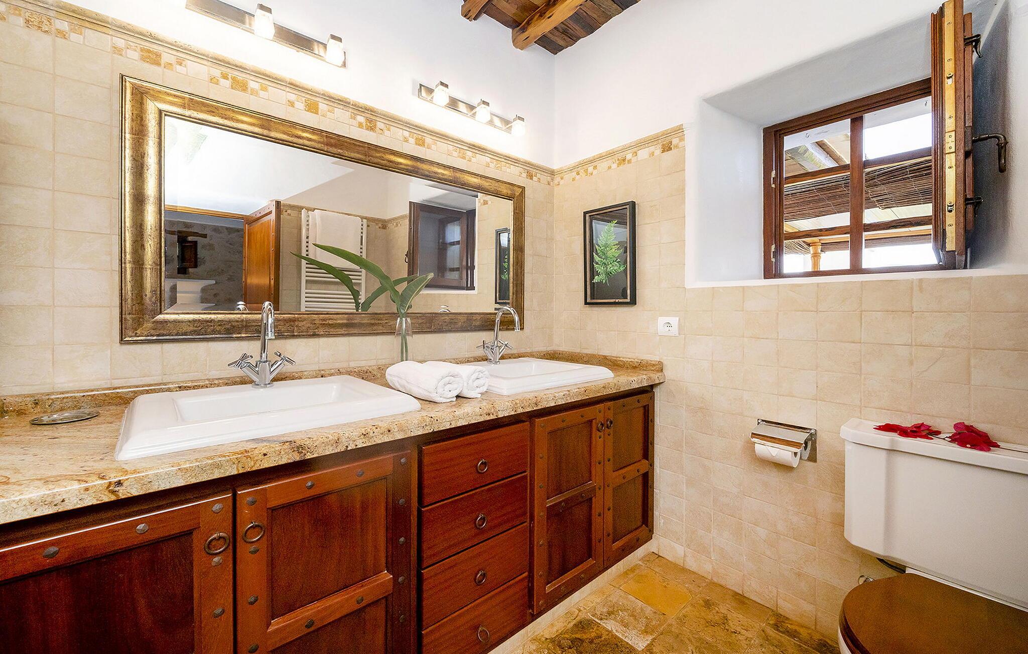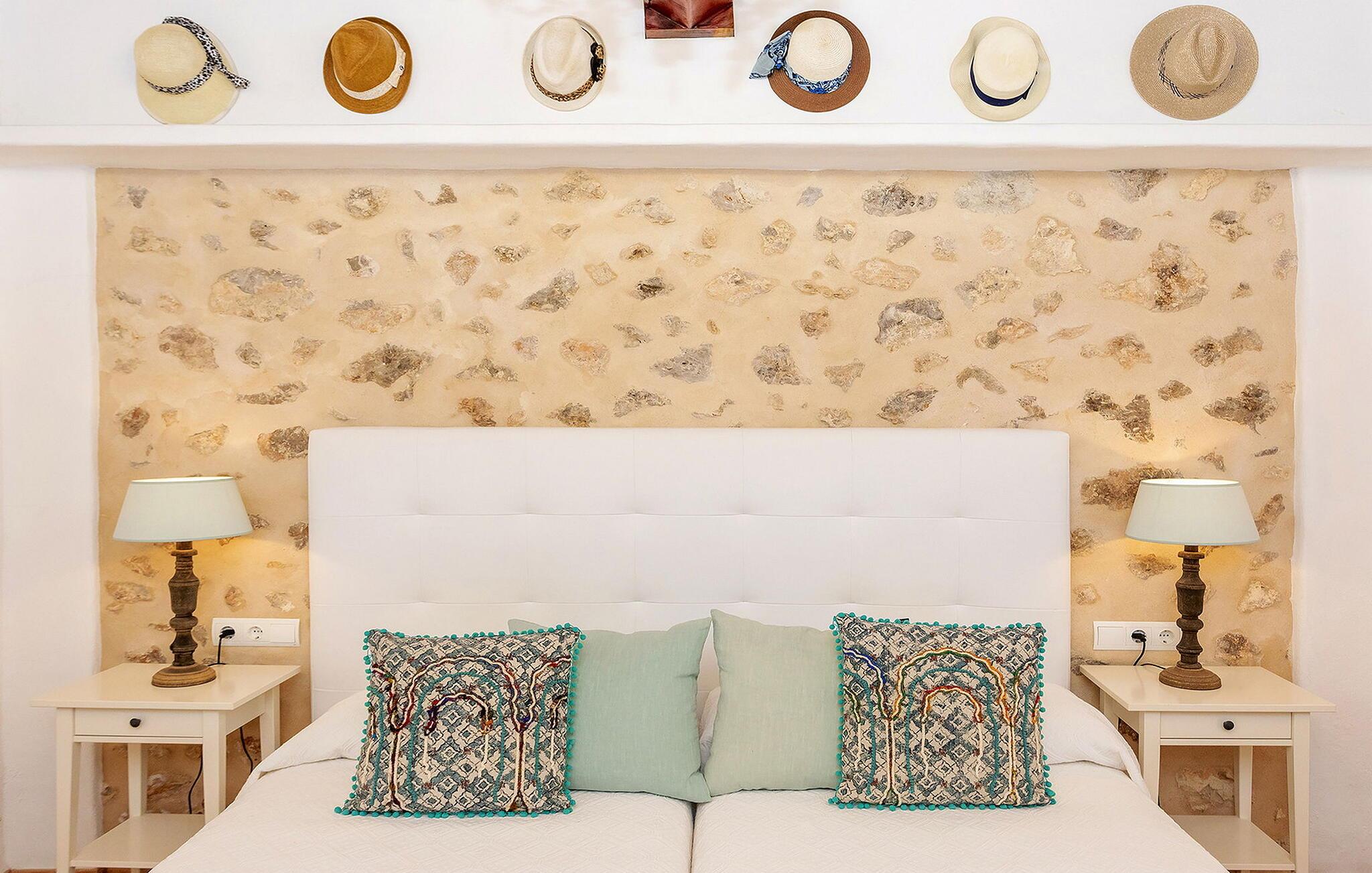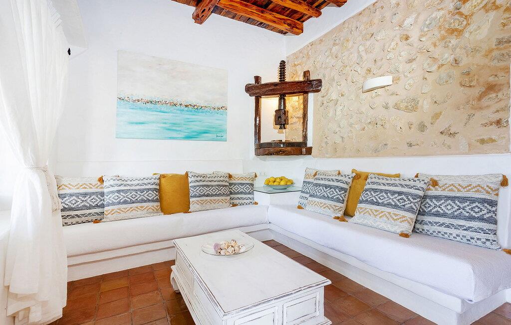 Smuk villa i Morna-dalen, ved siden af San Lorenzo og over Santa Eulalia. Hvis I leder efter god værdi for pengene med en stor gruppe, så er dette jeres hus. Dette er et Fincallorca feriehus. Ejendommen er gammel, men virkelig udstyret med alle bekvemmeligheder. Huset er familieejet, og I kan se, at ejeren elsker huset. Hvert år bliver huset renoveret og forbedret. Denne familie ejer også Sitges og Morna Valley, som ligger i nærheden. Men huset forbliver traditionelt og ibizask uden at gå på kompromis med komforten. Atzaro er rundt om hjørnet, og strande såsom Aguas Blancas og Es Figueral ligger 15 minutters kørsel derfra. For at nå huset skal man køre op ad en smal vejstrækning (store varebiler er ikke tilrådeligt, selvom det er muligt, hvis man er god til at køre). Når I er på toppen, kommer I ind i bygningen gennem en elektrisk port. I bliver straks mødt af den betagende udsigt. Der er en swimmingpool med loungestole i træ med hynder, der er et udekøkken (som er større end køkkenet indenfor!) og et spisebord med skygge. Og selvfølgelig en stor swimmingpool og en grill. Husets indre er ordentligt afsluttet. Hvert af de 6 soveværelser har eget badeværelse, og nogle har himmelsenge. Der er også aircondition i hvert værelse. Derudover er der WiFi i køkkenet (på grund af de tykke mure er dette ikke tilgængeligt alle steder), der er et husalarmsystem, to barnesenge og to skabe. Rengøring: fuldføres hver 7. dag.