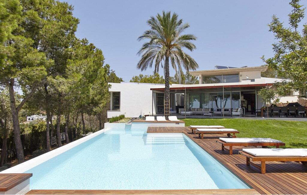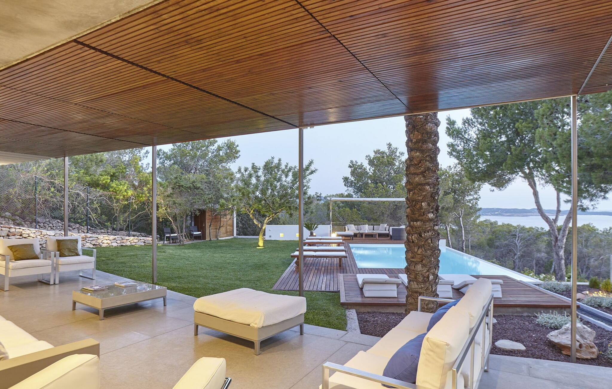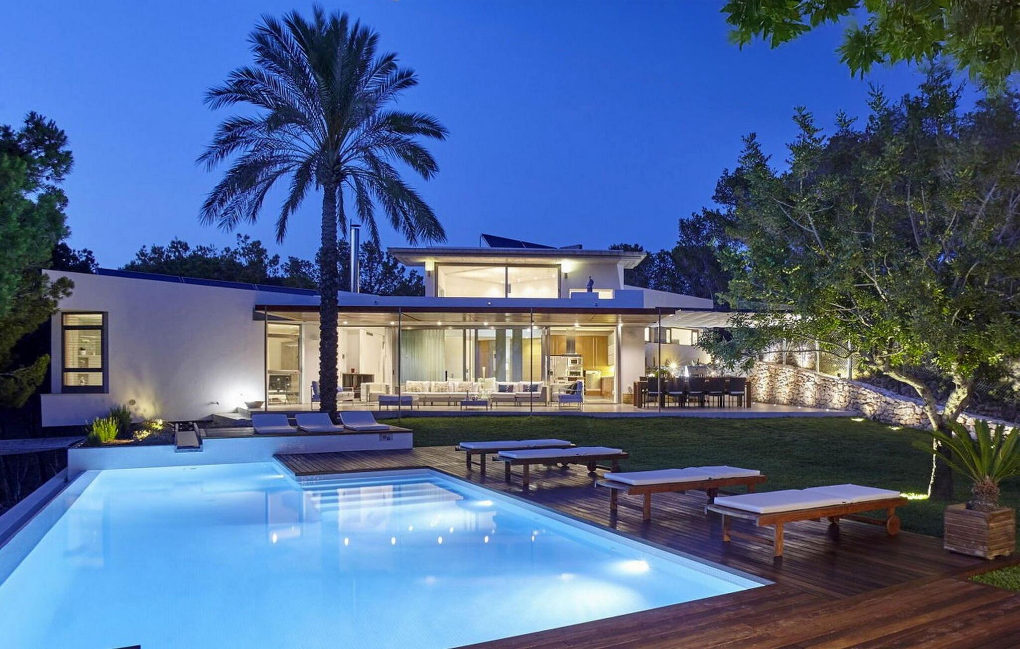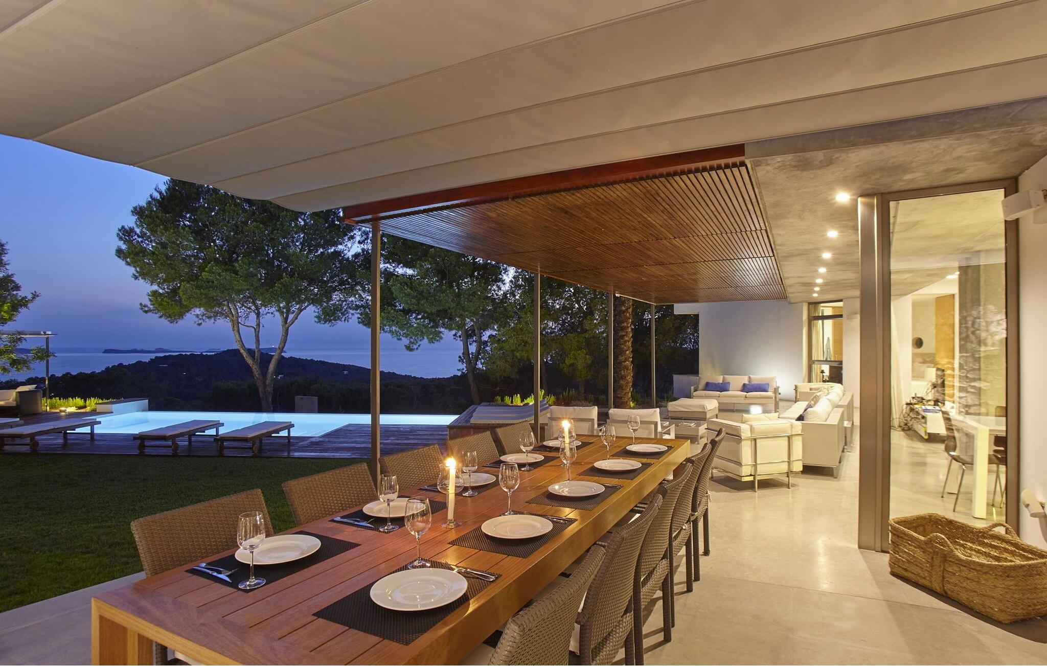 Minimalistisk villa med 5 soveværelser beliggende på en bakke, ikke langt fra den smukke Cala Salada-strand, med fantastisk udsigt over havet og solnedgangen fra haven.