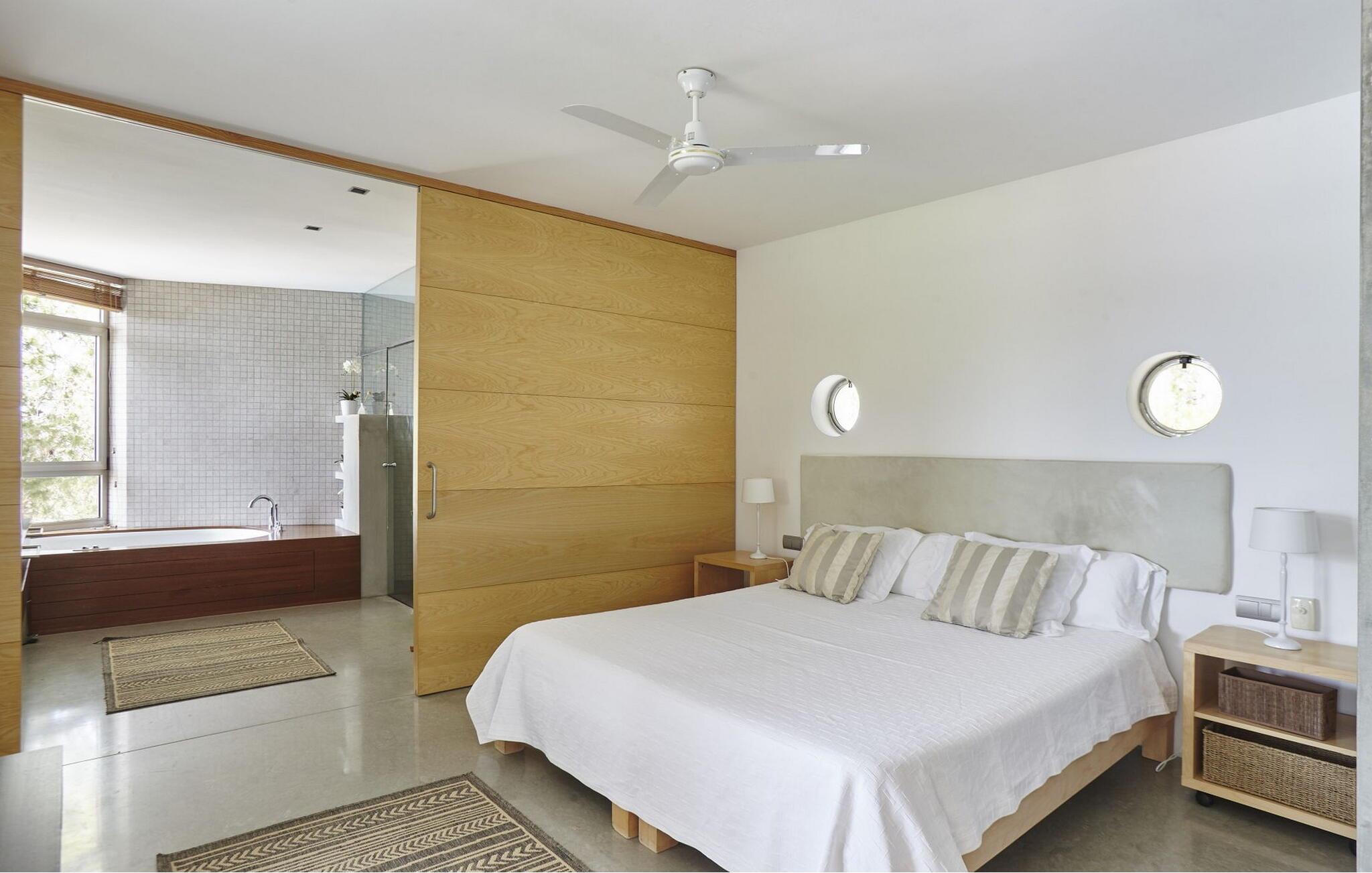 Soveværelset har en 1,8 x 2 m seng med eget badeværelse med hydromassage-badekar og separat bruser samt et påklædningsværelse med pengeskab.