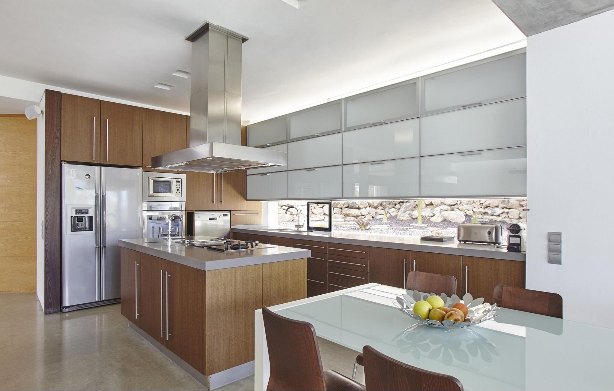 Hovedhuset har en stor åben stue med et fuldt udstyret køkken og spiseplads. Dette område inkluderer også et gæstetoilet og et vaskerum med strygejern, vaskemaskine og tørretumbler.