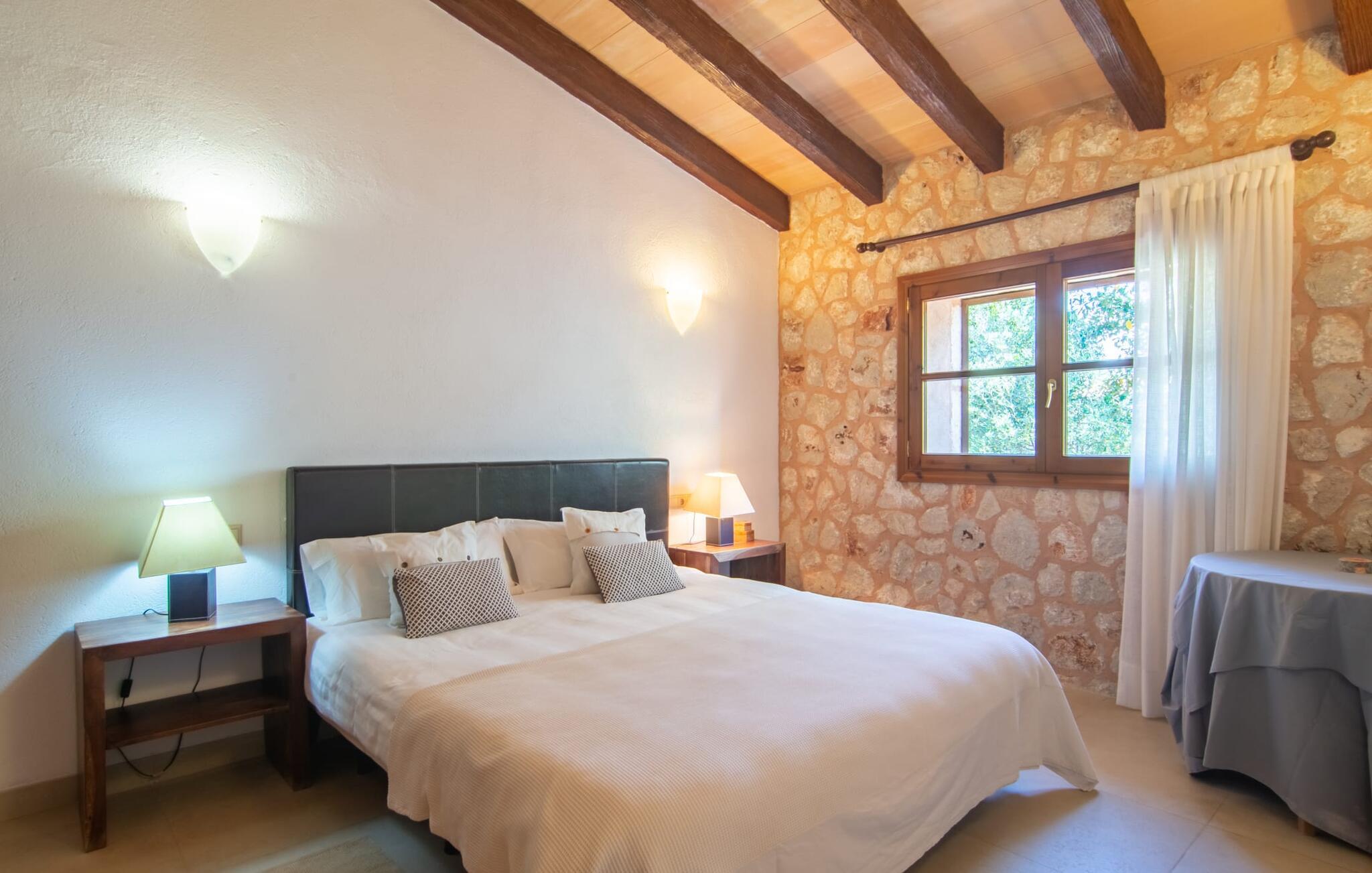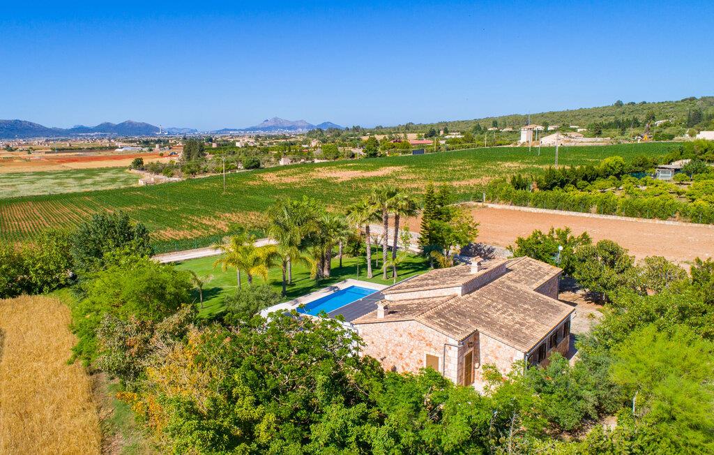 Livet på landet er ikke nødvendigvis fuld af afsavn – tværtimod: Drømmer I om en villaferie tæt på naturen i en rolig, men ikke isoleret beliggenhed med alle bekvemmelighederne i et moderne sommerhus, så er "Vinroma" det perfekte valg for jer ! Naturstenshuset i 1 plan ligger på en smukt anlagt, kærligt anlagt ejendom og byder på en vidunderlig udsigt over de omkringliggende marker og bjerge i det fjerne. Bag huset er der ikke kun en overdækket terrasse med spisebord, stole og komfortable havemøbler, men også en stor, lavvandet pool med integreret spabad og et behageligt lydende stilfuldt vandfald. Her kan I virkelig forkæle jer selv i fuldstændig privatliv og efter en forfriskende svømmetur i det kølige vand nyde en velfortjent siesta på en af de indbydende liggestole. Når I kigger søvnigt over jeres solbriller, kan I kun se de imponerende, høje palmer plantet langs poolens lange side - en drøm! Og det samme gælder indretningen: Kom og føl jer godt er feriemantraet her. Interiøret er gennemgående designet i en lys, frisk og klassisk stil. Hvide og creme vægge veksler med rustikke naturstensvægge, suppleret af smukke mørkebrune træbjælker på lofterne. Et særligt højdepunkt ved den yderst velholdte villa er konstruktionen i et plan. Ingen skal gå op ad trapper her – hvilket kan være en kæmpe lettelse, især med børn, men også for alle andre. I den åbne og rummelige spise- og opholdsstue kan I enten sidde ved det enkle, moderne træbord med smarte stole og nyde et afslappet måltid sammen eller sætte jer ned i de elegante læderlænestole eller den tilhørende sofa og nyde en krimi-thriller på tv med en glas vin. I kan også sidde ved det stilrene glasbord med delvist gennemsigtige stole i køkkenet, som er udstyret med højkvalitets hvidevarer og et stort køleskab. Og når I er træt, kan I bare trække jer tilbage til et af de tre stilfulde dobbeltværelser, hvoraf det ene har eget badeværelse. Beboerne i de to andre soveværelser deler endnu et rummeligt badeværelse. jeres villa "Vinroma" er omgivet af smukke landskaber, der er typiske for den nordlige del af øen. Den ligger midt i den såkaldte "grøntsagskurv" på Mallorca, i en særlig grøn, frugtbar slette. Nyd et par afslappende gåture på opdagelse eller en cykeltur gennem naturen, som altid inkluderer den vidunderlige udsigt over bjergene i det fjerne. Bymidten i Muro er også let tilgængelig til fods - så I har adskillige indkøbsmuligheder, restauranter og caféer lige uden for døren. Muro er blevet skånet for masseturisme og er en rustik lille mallorcansk by i ordets bedste betydning, med smalle gader, smukke sandstenshuse og et museum, der er værd at se, Museo Museu Etnologico de Muro. Her kan I lære en masse om livet på landet på øen gennem århundreder og beundre udstillinger lige fra kunsthåndværk til musikinstrumenter. Foretrækker I at tage til stranden, skal I blot køre cirka 11 km til Alcúdia-bugten, hvor I finder en fin, hvid sandstrand og grønne klitter. Et smukt etplanshus, omgivet af en velholdt have med grøn græsplæne, duftende blomster og en stor pool, indlejret i et fantastisk middelhavslandskab: Dette er villaen "Vinroma" nær Muro på det nordlige Mallorca. Her kan I nyde jeres familieferie i fred - men I kan også gå til byen kun 0,6 km væk, prøve de lokale restauranter og shoppe. Og den nærmeste strand ligger kun omkring 11 km væk og kan hurtigt nås med lejebil.