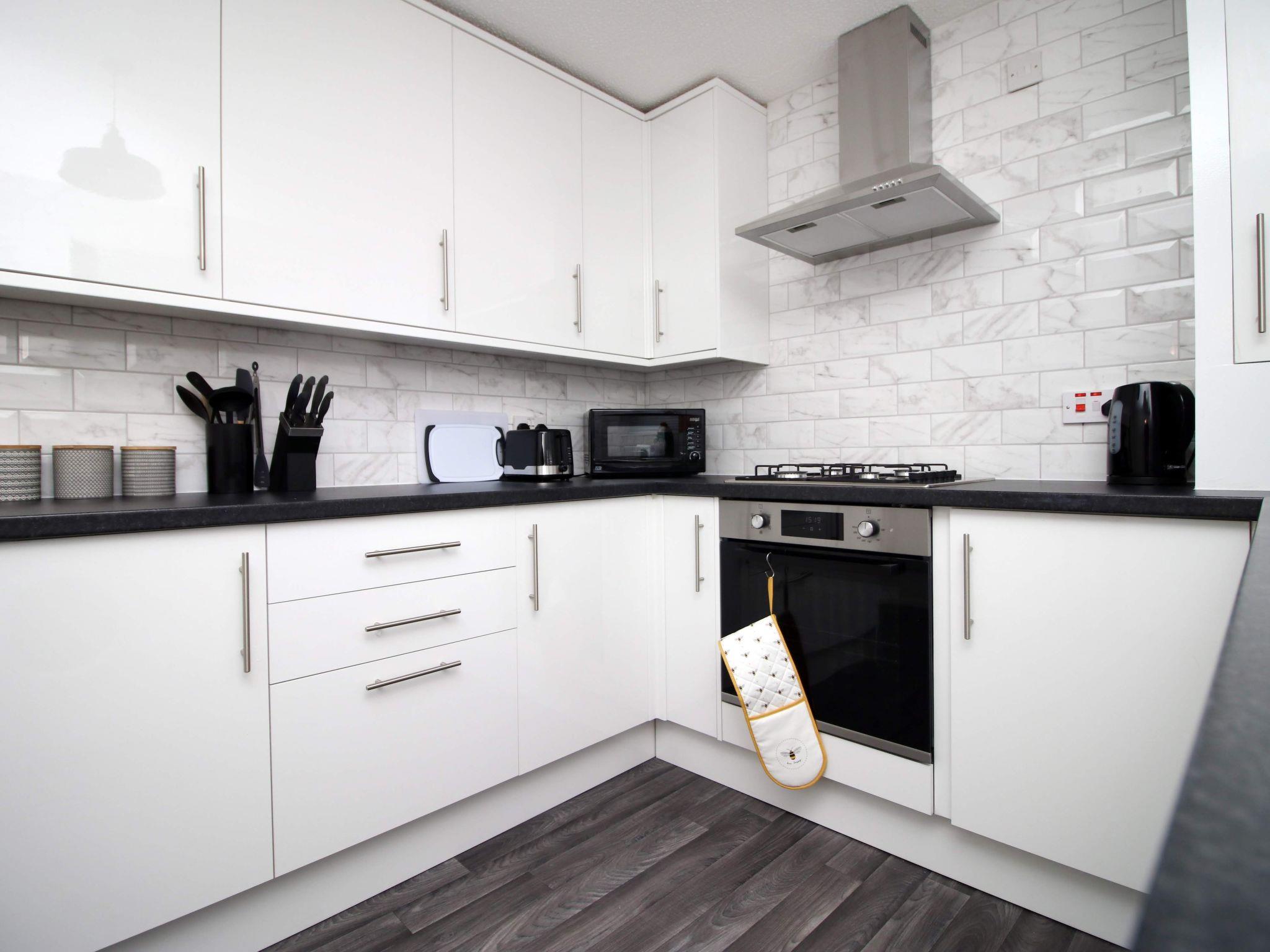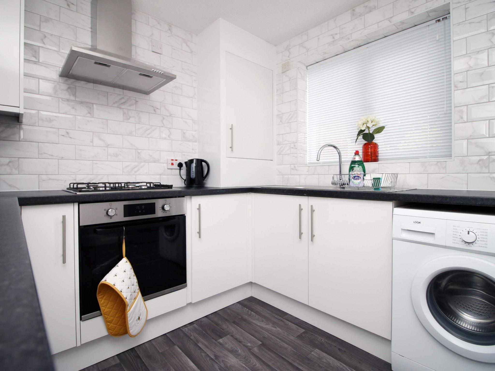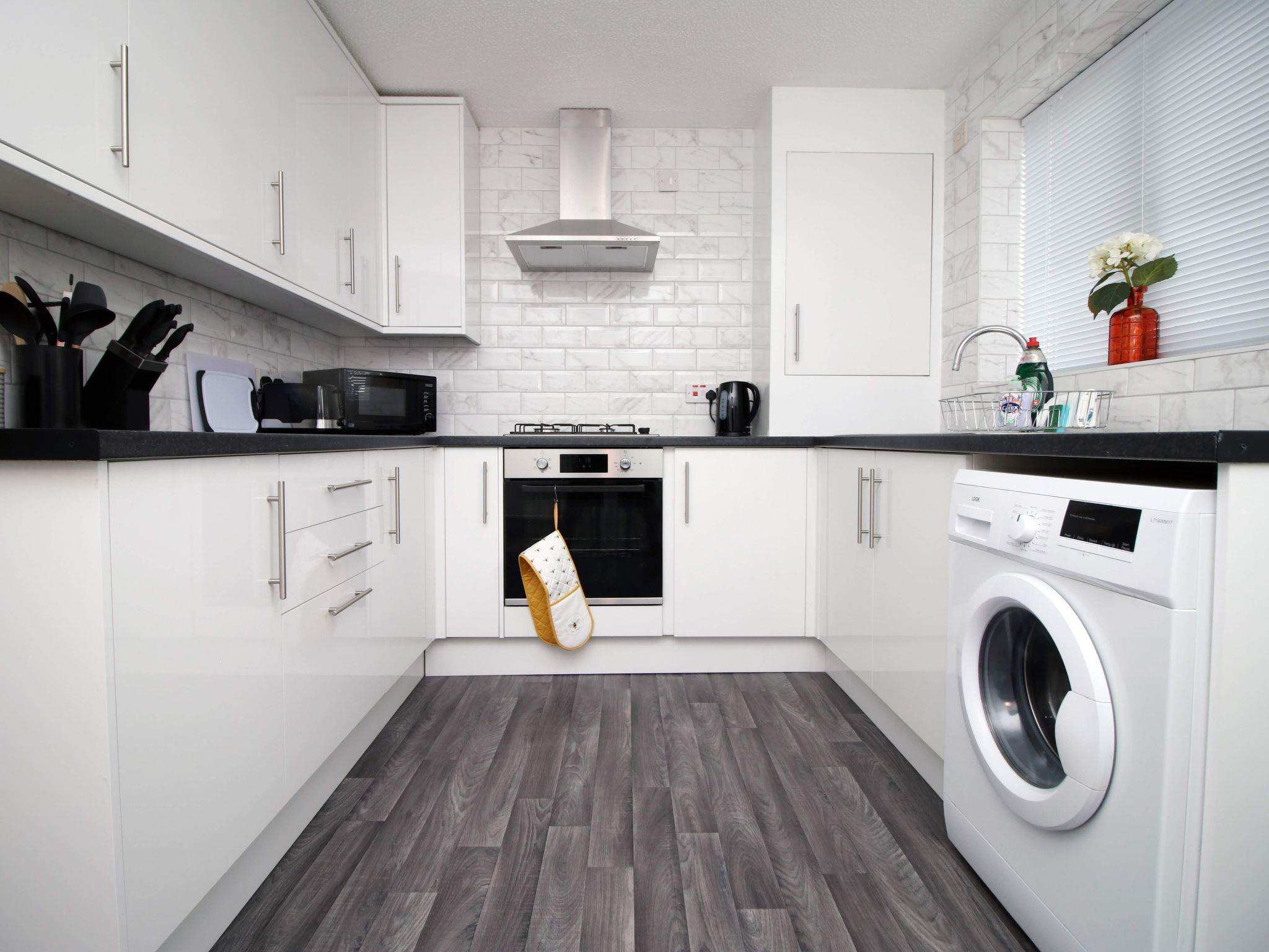 Inside, the house is fully equipped to meet all your needs. The open plan dining and living room on the main floor is thoughtfully designed for both relaxation and entertainment. A bench-style dining table complements the space, perfect for enjoying home-cooked meals prepared in the new kitchen, while the adjacent comfortable seating area is ideal for unwinding and watching your favourite films on the Smart TV. The inclusion of a washing machine addresses all your laundry needs during your stay.