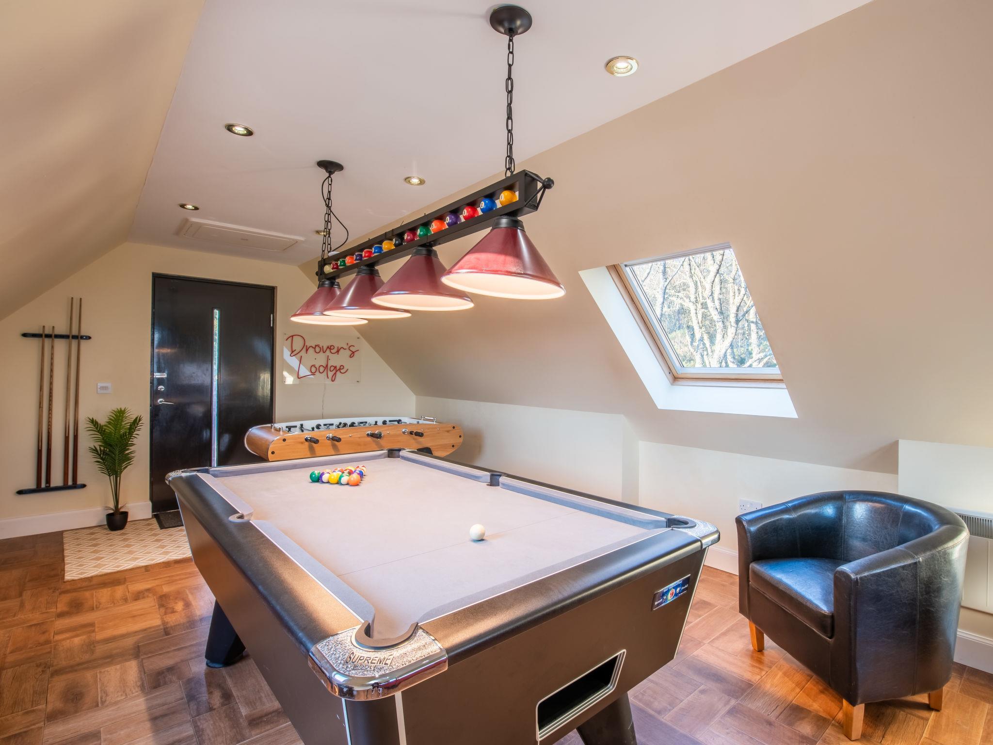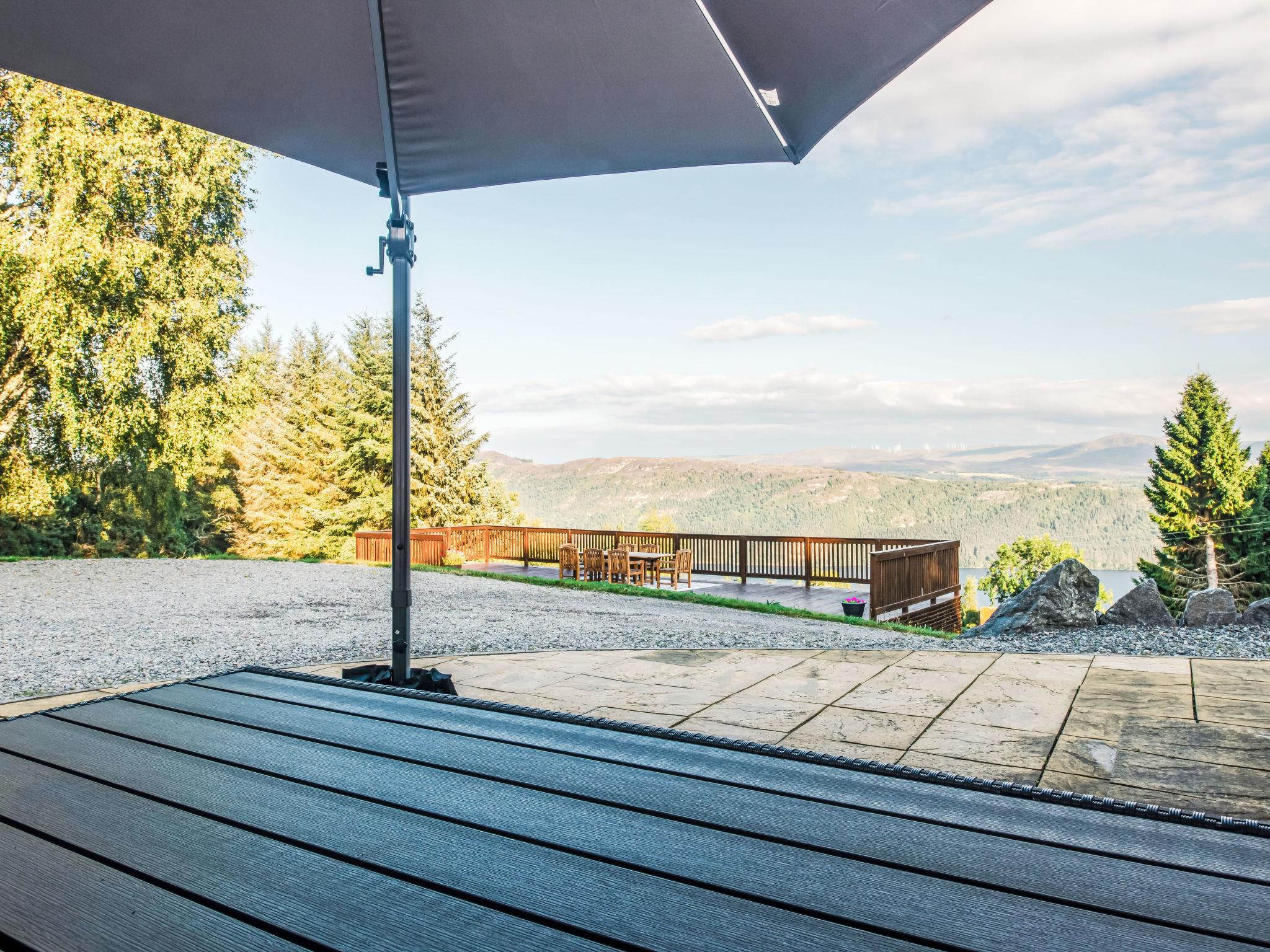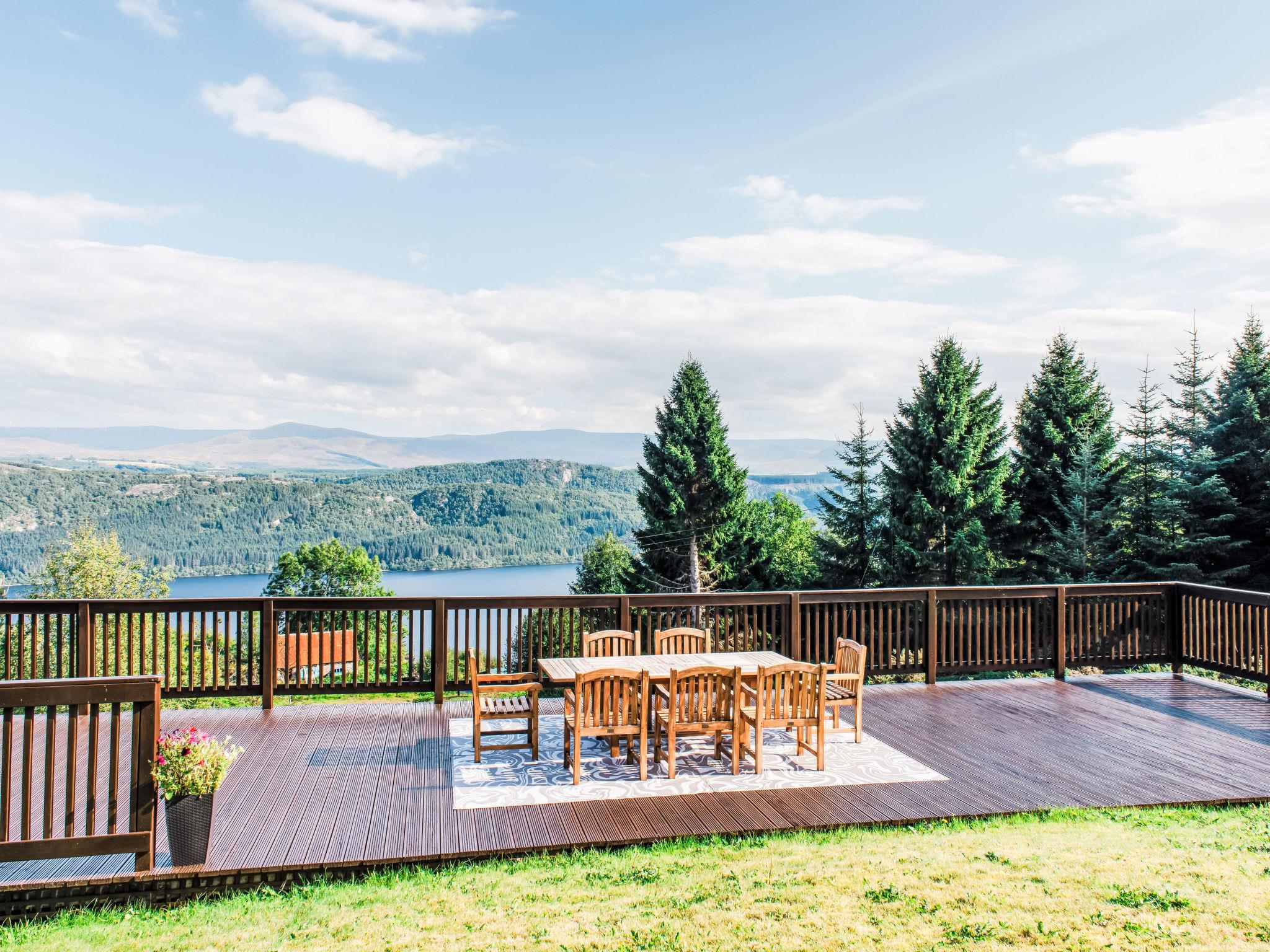 "Drover's Lodge", 6-room villa 228 m2 on 2 levels. Spacious and bright, modern and tasteful furnishings: open living/dining room with dining table and wood-burning stove. Exit to the garden, to the terrace, to the patio. Lounge with TV (flat screen). Exit to the garden. 1 double bedroom with bath/shower/WC. Kitchen (oven, dishwasher, Gas stove, 5 gas rings, toaster, kettle, microwave, freezer). Sep. WC. Upper floor: 1 double bedroom with bath/shower/WC. 2 double bedrooms, each room with shower/WC. Oil heating. Wooden floors. Large terrace, large patio, large garden, lawn. Terrace furniture, balcony furniture. Very beautiful view of the lake and the countryside. Facilities: washing machine, dryer, hair dryer, logs (extra). Internet (WiFi, free). Parking at the house. Please note: not suitable for children under 11 years. Non-smoking house. TV only EN. Smoke alarm, fire extinguisher. Games room above the garage with pool table TV with Xbox, two consoles, Xbox kinect, 30 games and multiple DVD's with seating and WC below. Please note:- Garage not for use of guests.