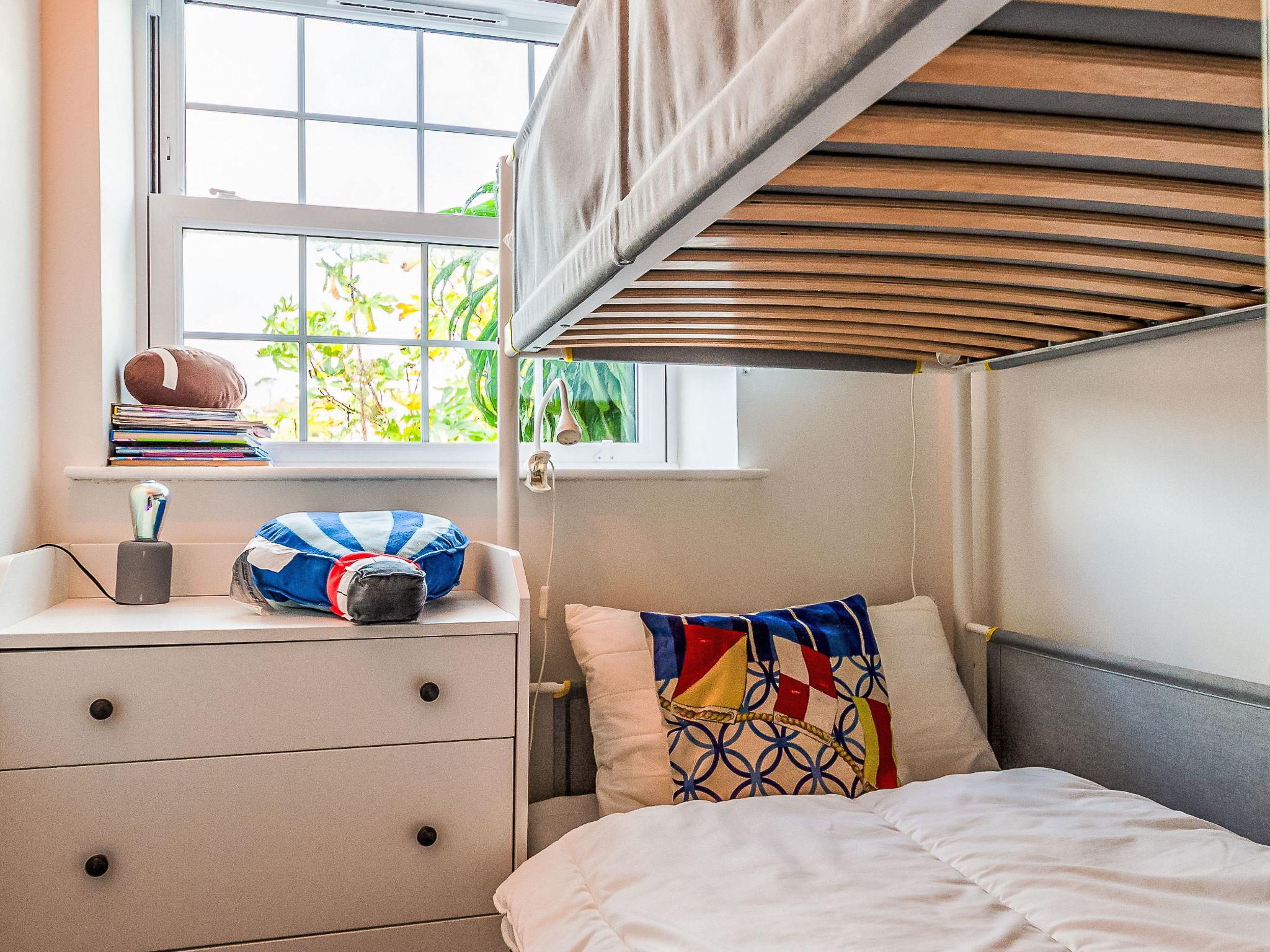 "Shanty Cottage", 4-room cottage. Object suitable for 4 adults + 2 children. Modern and stylish furnishings: living room with TV (flat screen). (oven, 4 ceramic glass hob hotplates, toaster, kettle) with dining table. Shower/WC. Upper floor: 1 double bedroom with 1 double bed and shower/WC. 1 double bedroom with 1 double bed. 1 room with 1 x 2 bunk beds (90 cm, length 190 cm). Small patio. Facilities: washing machine, dryer. Internet (WiFi, free). Please note: maximum 2 pets/ dogs allowed. Smoke alarm. Please note: bedroom 2 can be made up as a twin or a double, please specify prior to arrival.