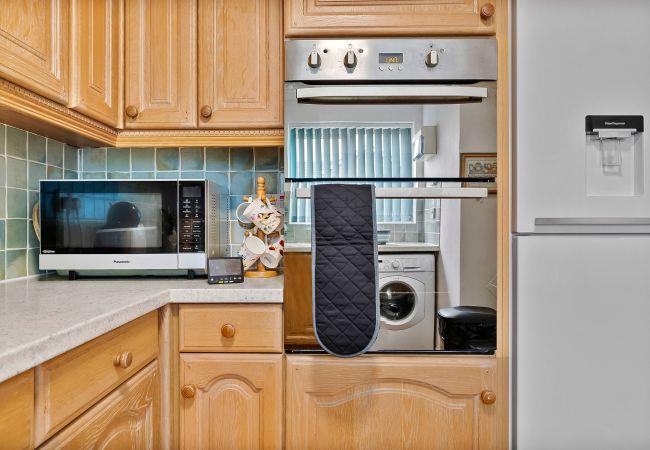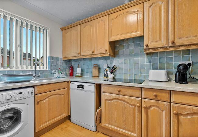 The spacious living and dining area is filled with natural light and offers a welcoming atmosphere for relaxation. The dining table is set beside large windows, making it the perfect spot for both quiet evenings and shared meals. If you are wishing to use the double sofa bed in the living room during your stay, please let us know at the time of booking. A fully equipped kitchen ensures you have everything you need for your stay, whether you're preparing a quick breakfast or cooking a full dinner. All essential appliances and cookware are provided, making self-catering easy and enjoyable.