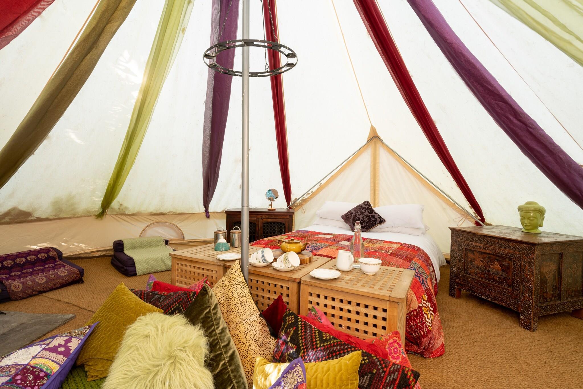 Beliggende i en magisk skovlysning på grænsen til Hampshire og Berkshire nær Newbury, tilbyder disse charmerende bælg en fredelig flugt for par og familier. Bælgerne sover 2 voksne i en dobbeltseng og 2 børn i Z-udklappelige senge, hvilket giver en perfekt base til at udforske eller slappe af. Gæsterne kan nyde fuld adgang til skoven, hvor børn kan bygge lejre, lege på dækgyngen og samle nedfaldent træ til bålpladser. Det rummelige klokketelt på seks meter er lyst og luftigt med dobbelt døråbning, dekoreret i beduinstil med puder og tæpper. Den har en dobbeltseng, sammenklappelige Z-senge, privat nærliggende toilet, bruser og håndvask, plus et udendørs pyntet siddeområde med alt sengetøj, håndklæder og køkkenredskaber. Beliggende i en afsondret skovlysning med hemmelige passager og træskulpturer byder stedet på en magisk atmosfære. Det er off-grid, uden elektricitet - selvom telefoner kan oplades i ejernes hus, hvis det er nødvendigt. Indenfor er der en indendørs brændeovn, gaskomfur, grill, service, bestik og vand på flaske. Den nærliggende landsby Woolton Hill har butikker, pubber, et postkontor og et månedligt marked. Nærliggende attraktioner omfatter Highclere Castle (Downton Abbey), The Chase naturreservat, Newbury Racecourse og kanalbådsture. Naturskønne vandre- og cykelstier omgiver stedet, hvilket giver masser af udendørs aktiviteter. Bemærk venligst tilstedeværelsen af ??fritgående fugle og hunde, der kan nærme sig. Gæster bør medbringe deres eget træ, kul og fyrfadslys. Webstedet fremmer udendørsliv med private badeværelser, udendørs siddepladser og bålpladser, hvilket tilskynder børn til at omfavne campingstemningen. For større grupper er yderligere klokketelte tilgængelige, med grupperabat ved forespørgsel.